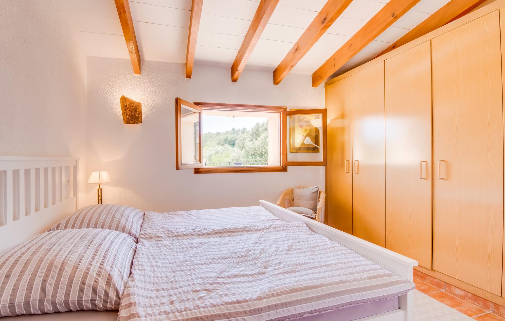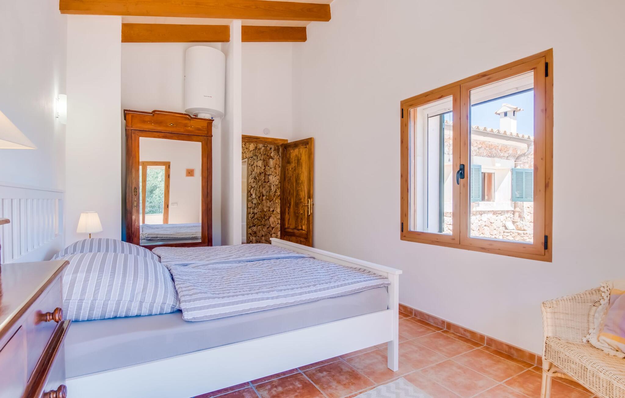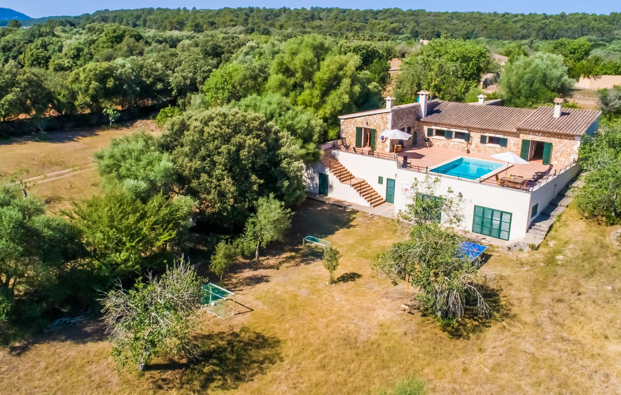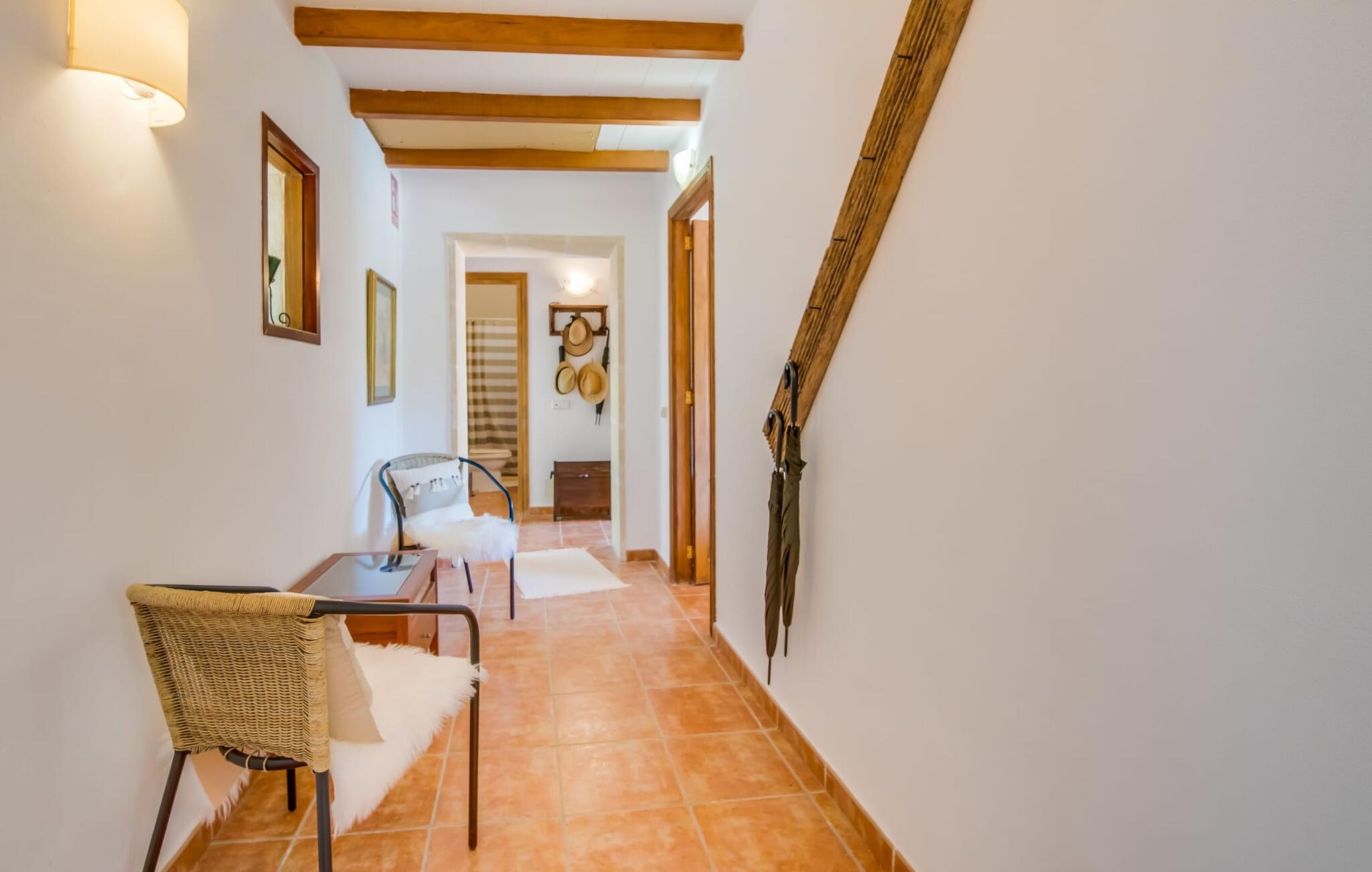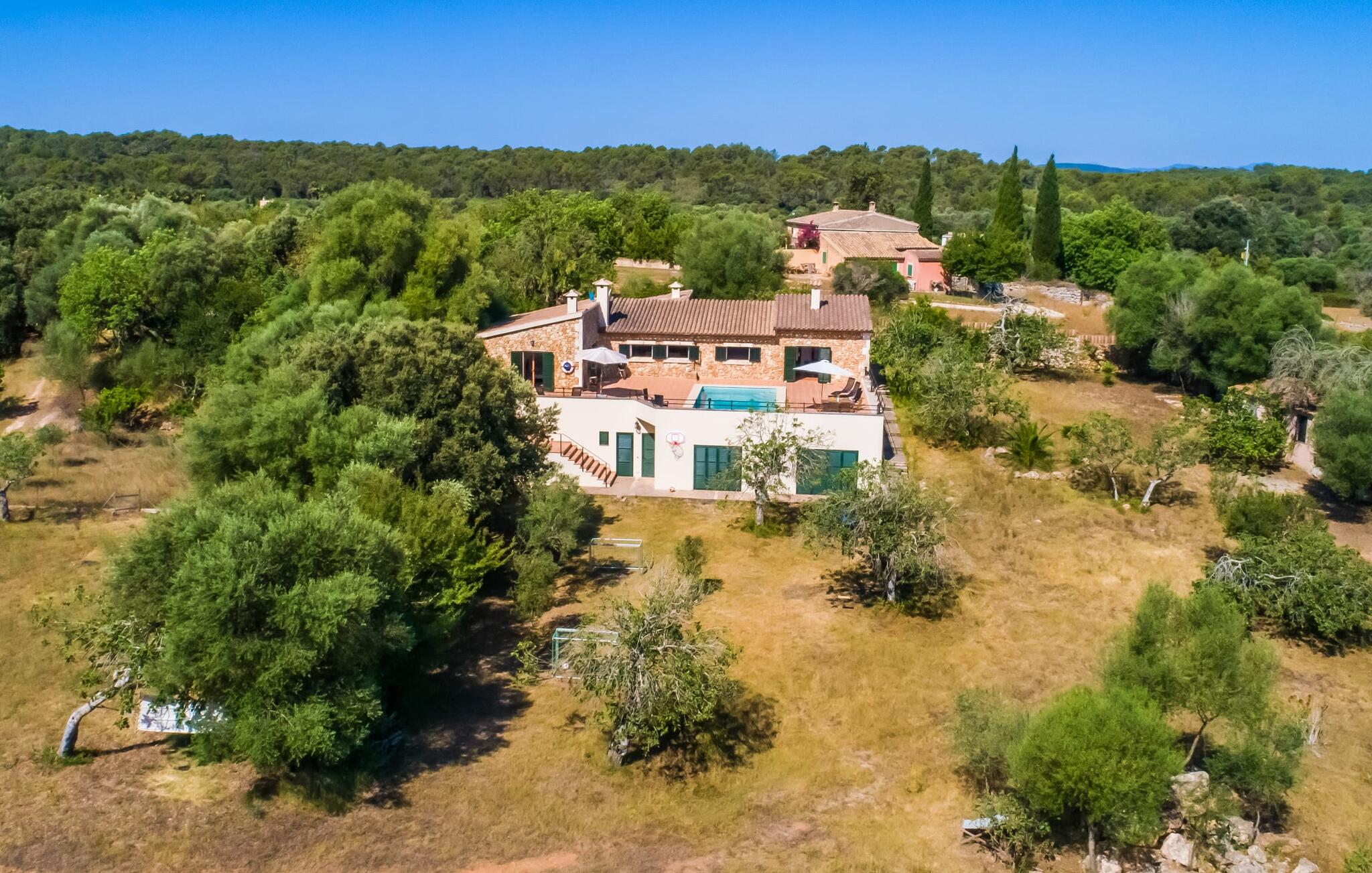 Het vakantiehuis Can Baldo, genesteld op een lichte helling, biedt een betoverend toevluchtsoord in het hart van Mallorca. Het belangrijkste woongedeelte heeft een betoverende natuurstenen gevel en biedt een adembenemend uitzicht op het omliggende landschap van pijnbomen en velden.