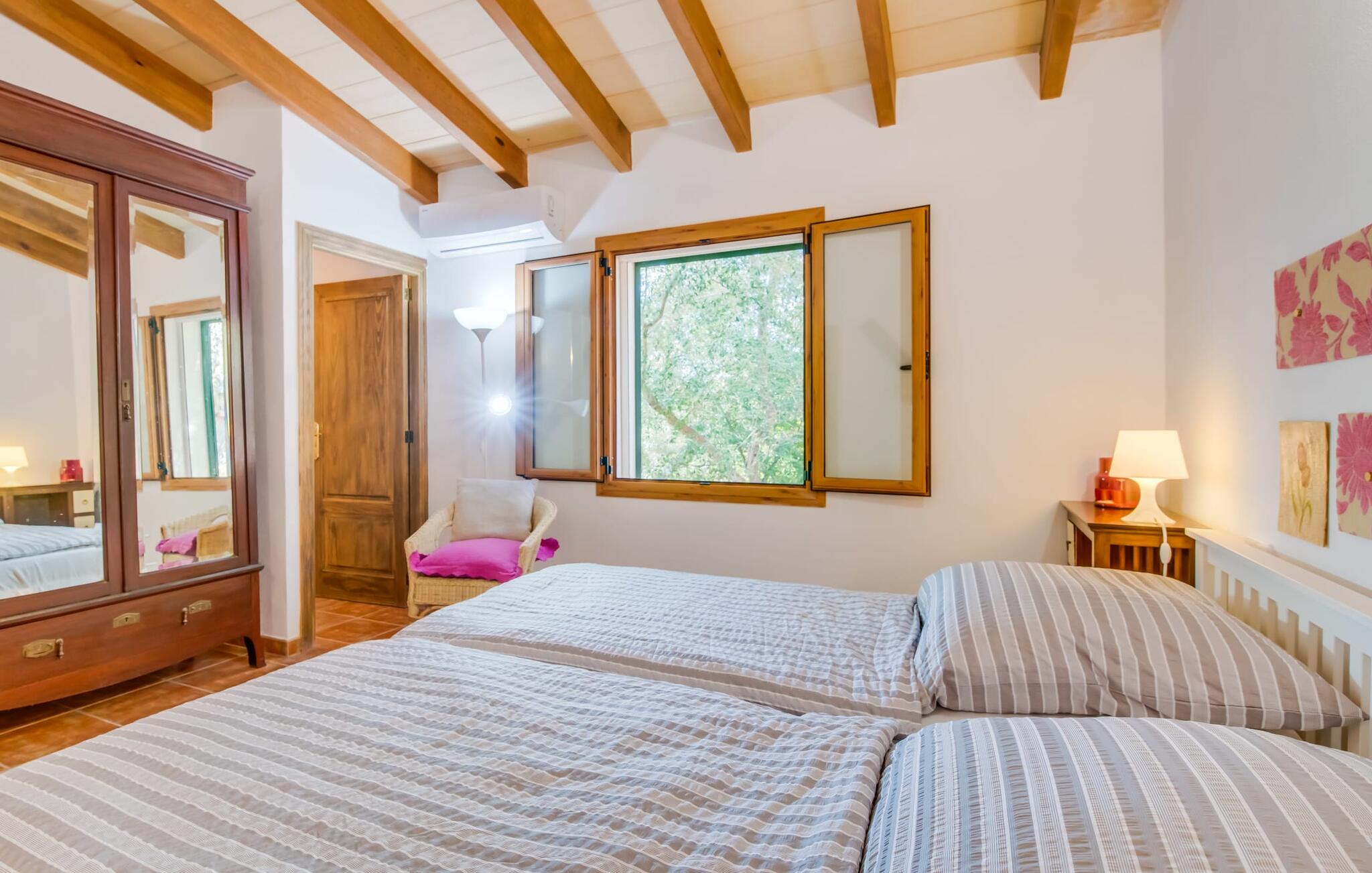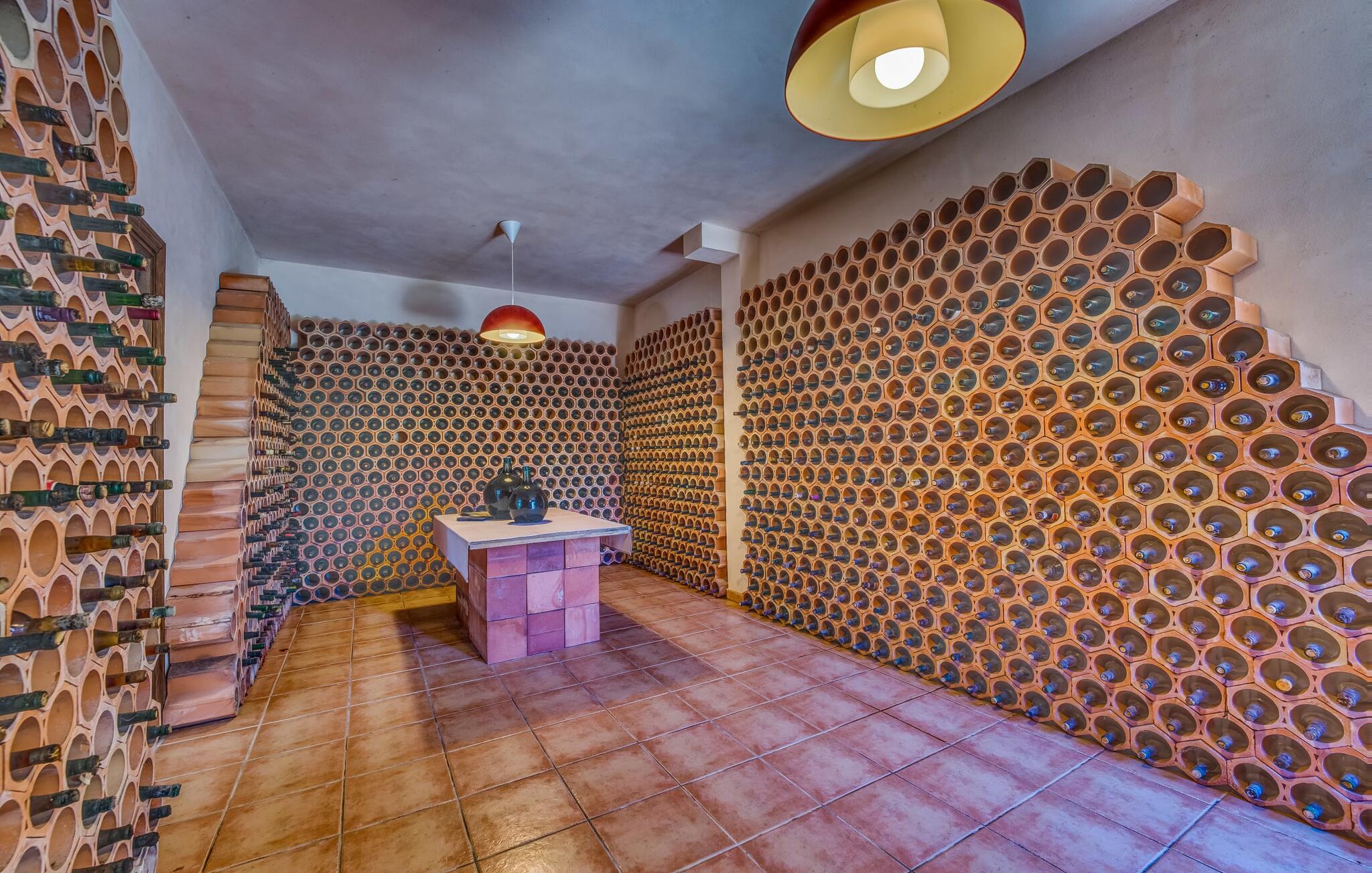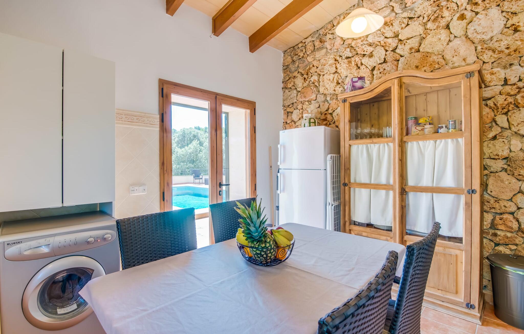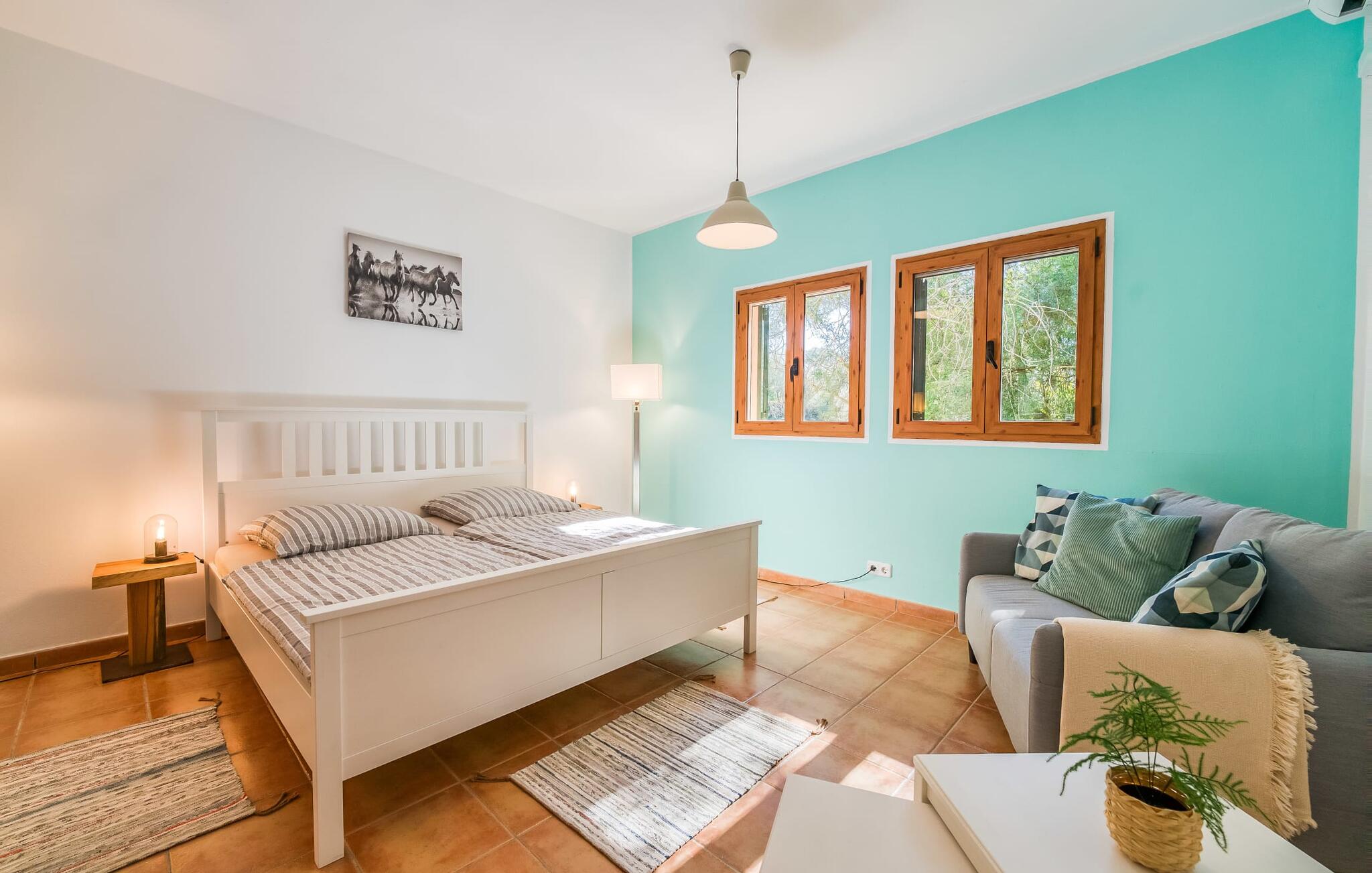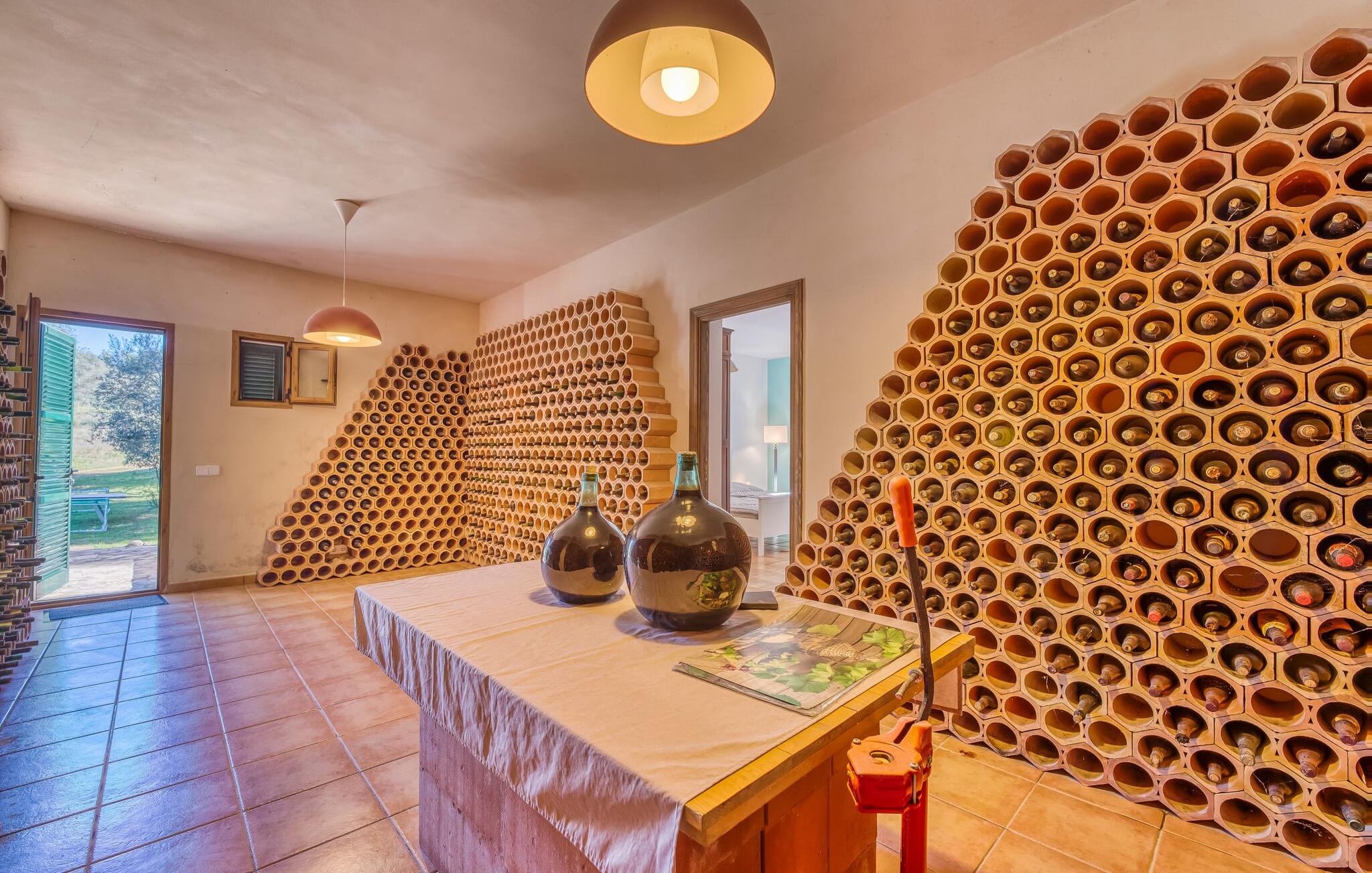 Het vakantiehuis Can Baldo, genesteld op een lichte helling, biedt een betoverend toevluchtsoord in het hart van Mallorca. Het belangrijkste woongedeelte heeft een betoverende natuurstenen gevel en biedt een adembenemend uitzicht op het omliggende landschap van pijnbomen en velden.