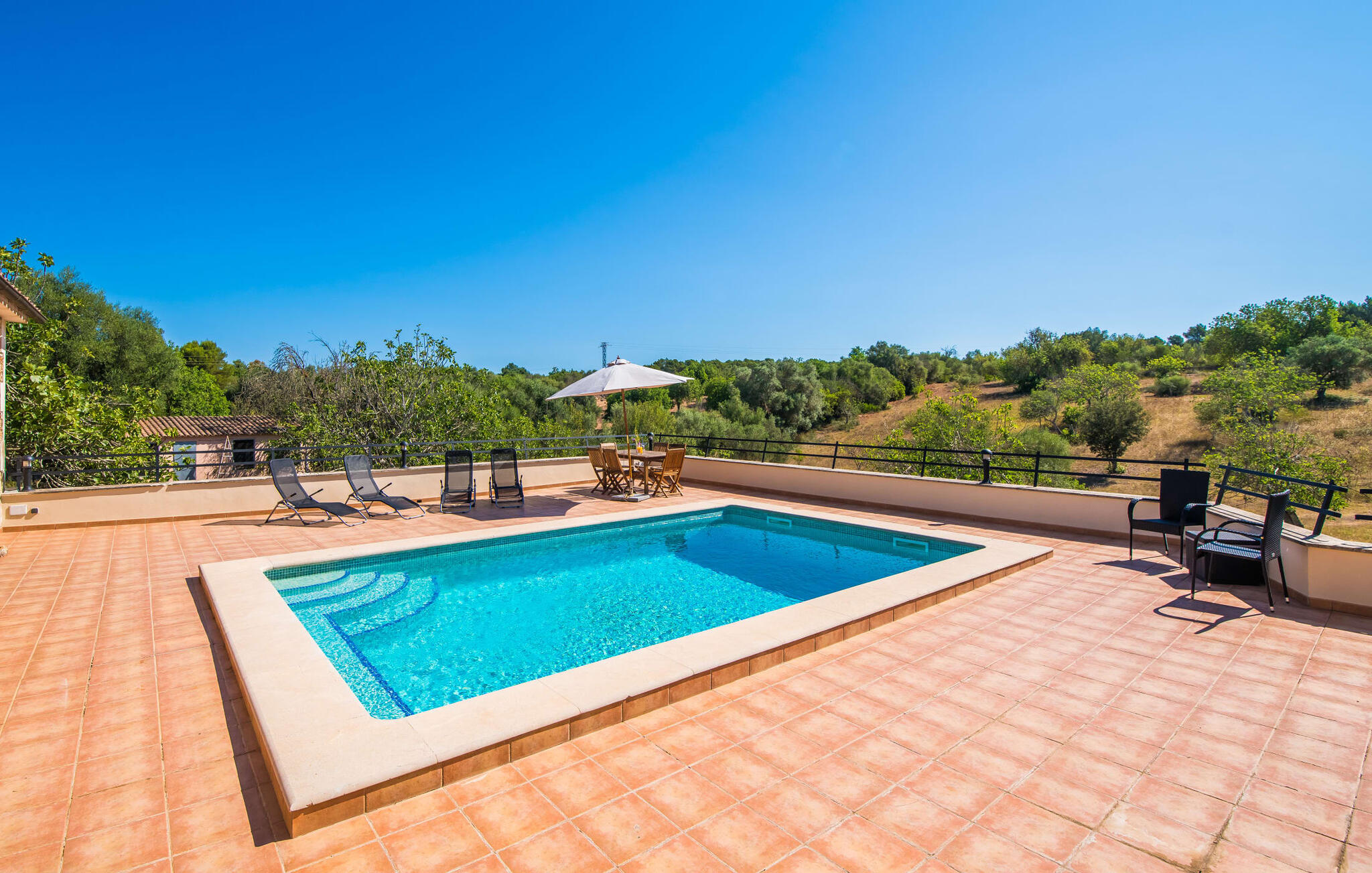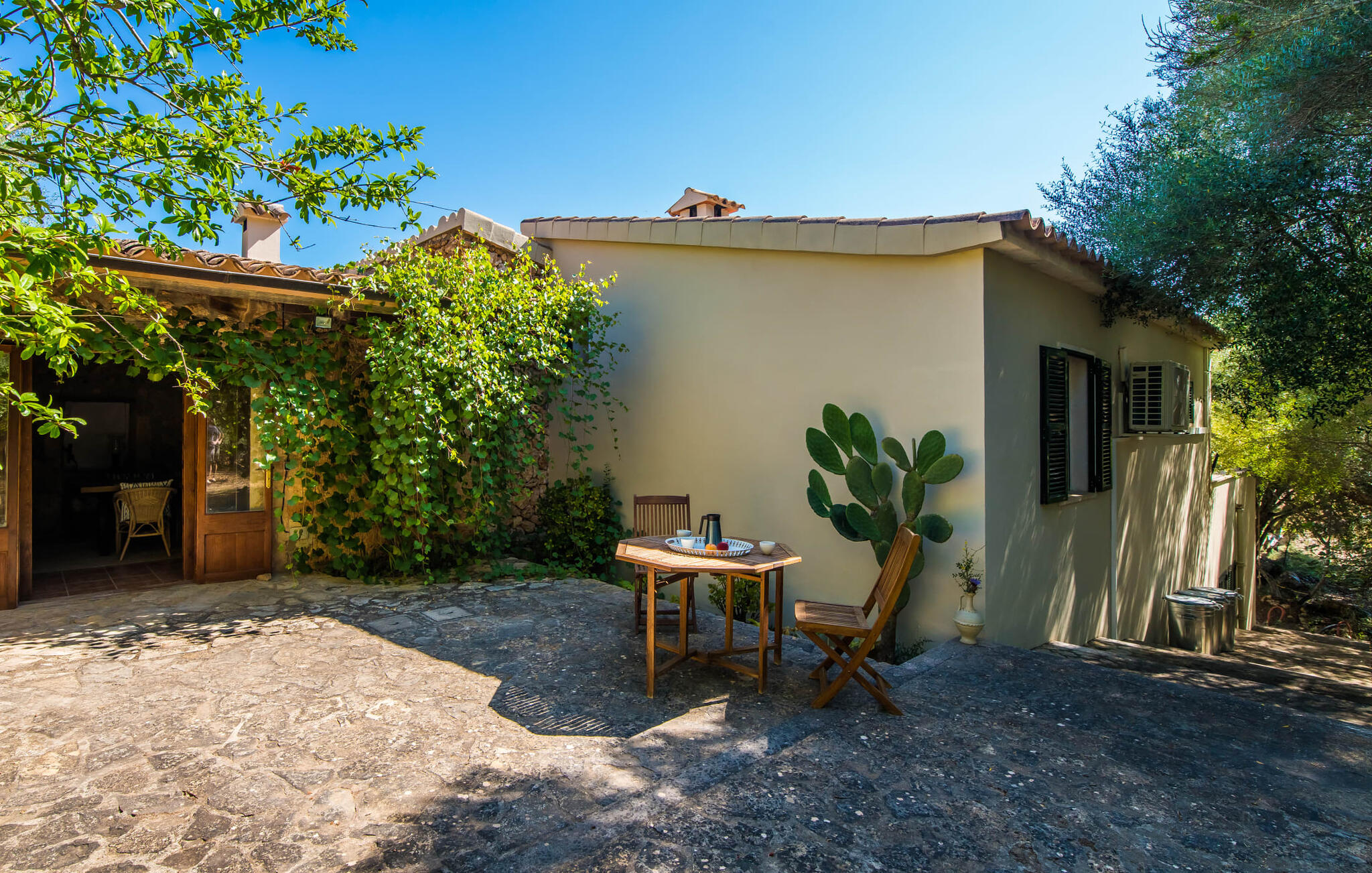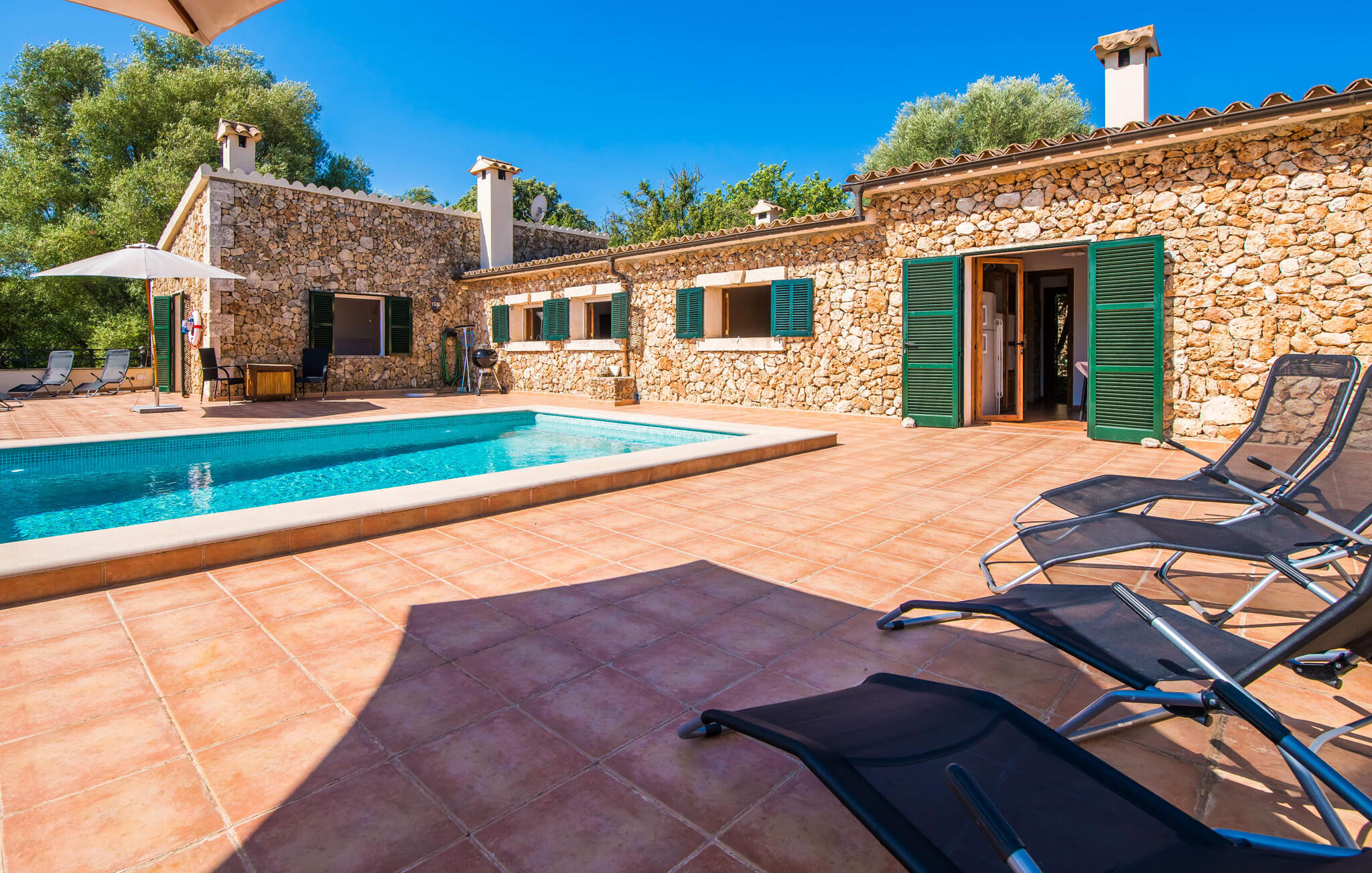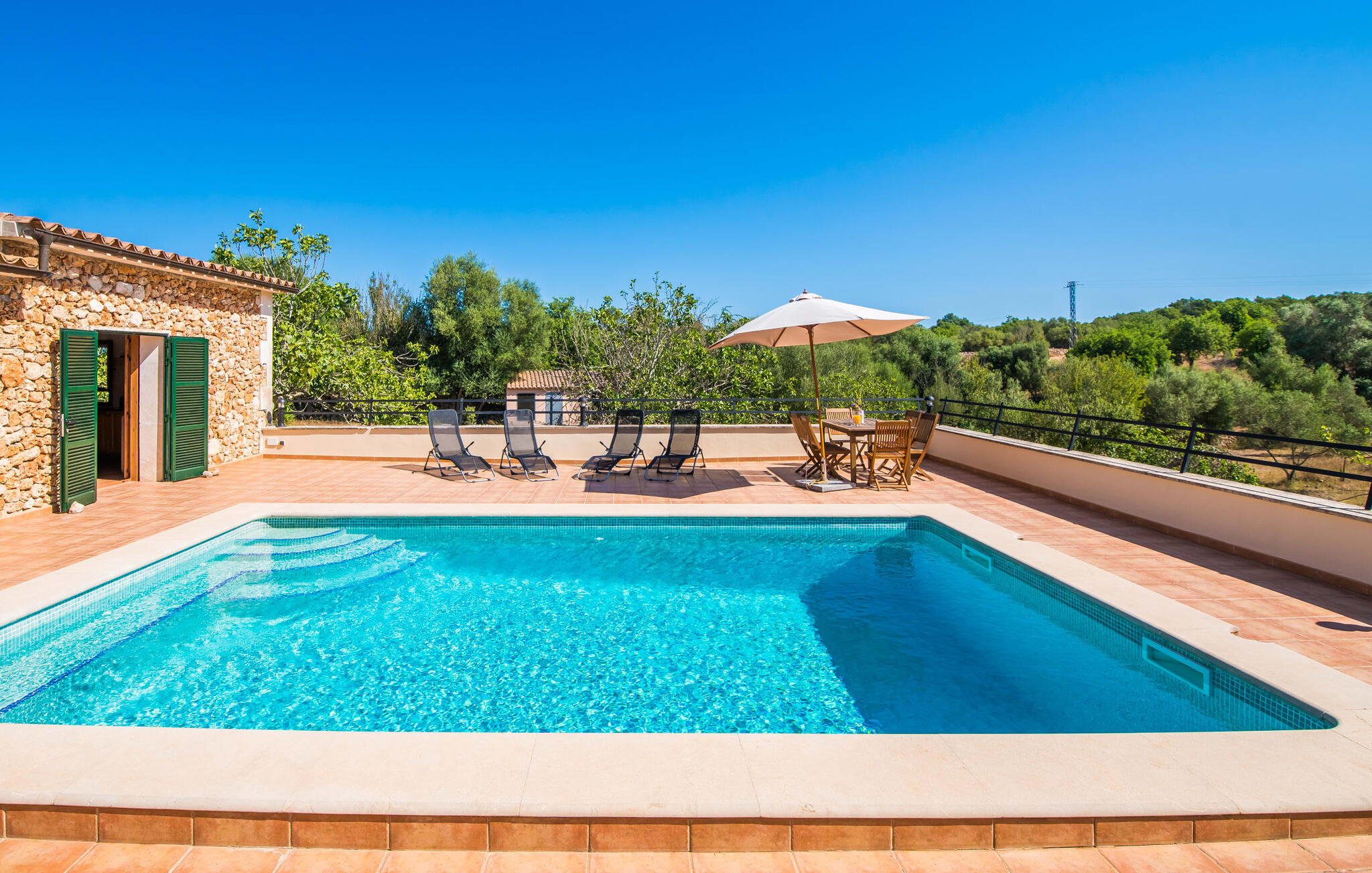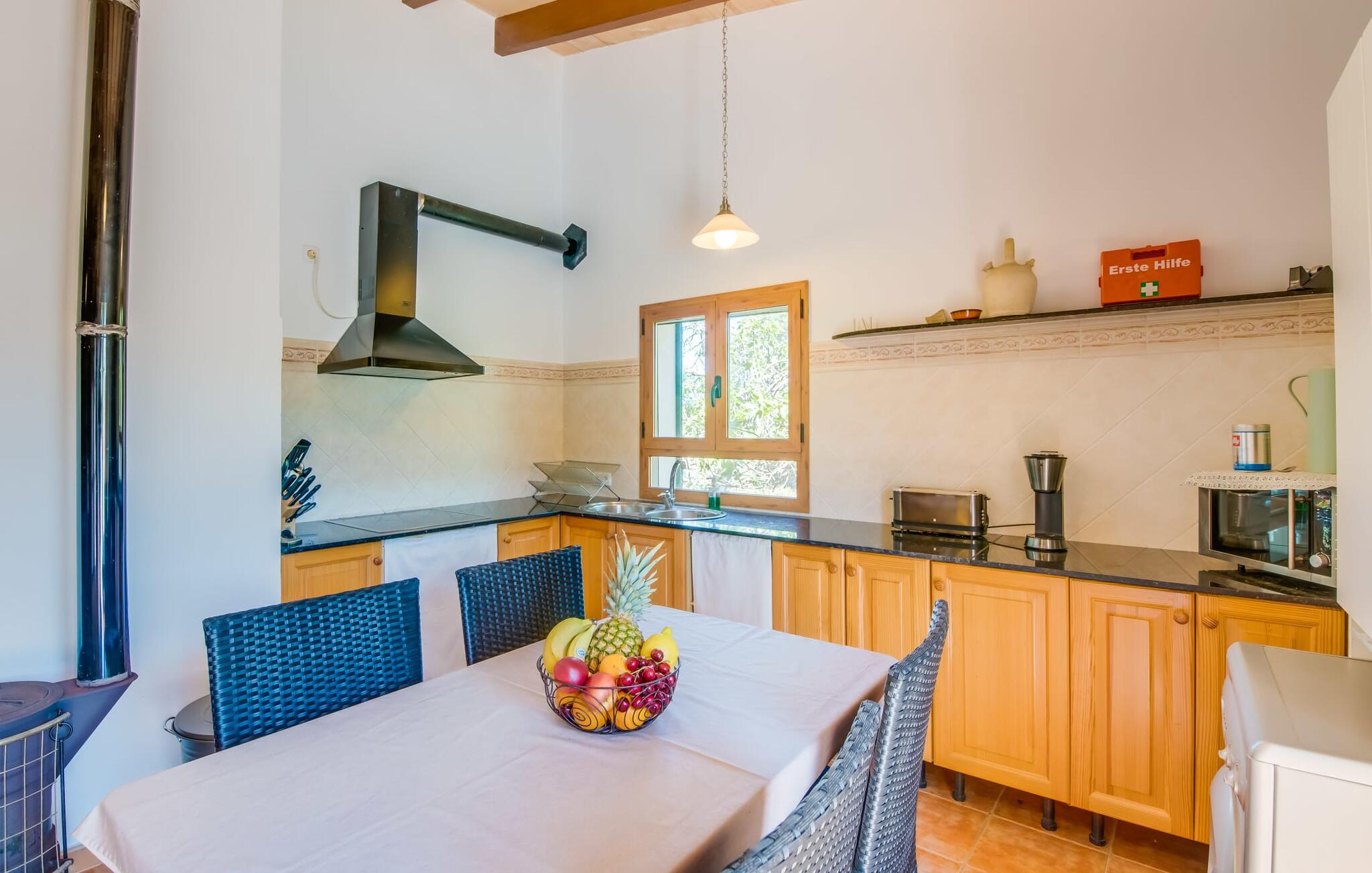 Het vakantiehuis Can Baldo, genesteld op een lichte helling, biedt een betoverend toevluchtsoord in het hart van Mallorca. Het belangrijkste woongedeelte heeft een betoverende natuurstenen gevel en biedt een adembenemend uitzicht op het omliggende landschap van pijnbomen en velden.