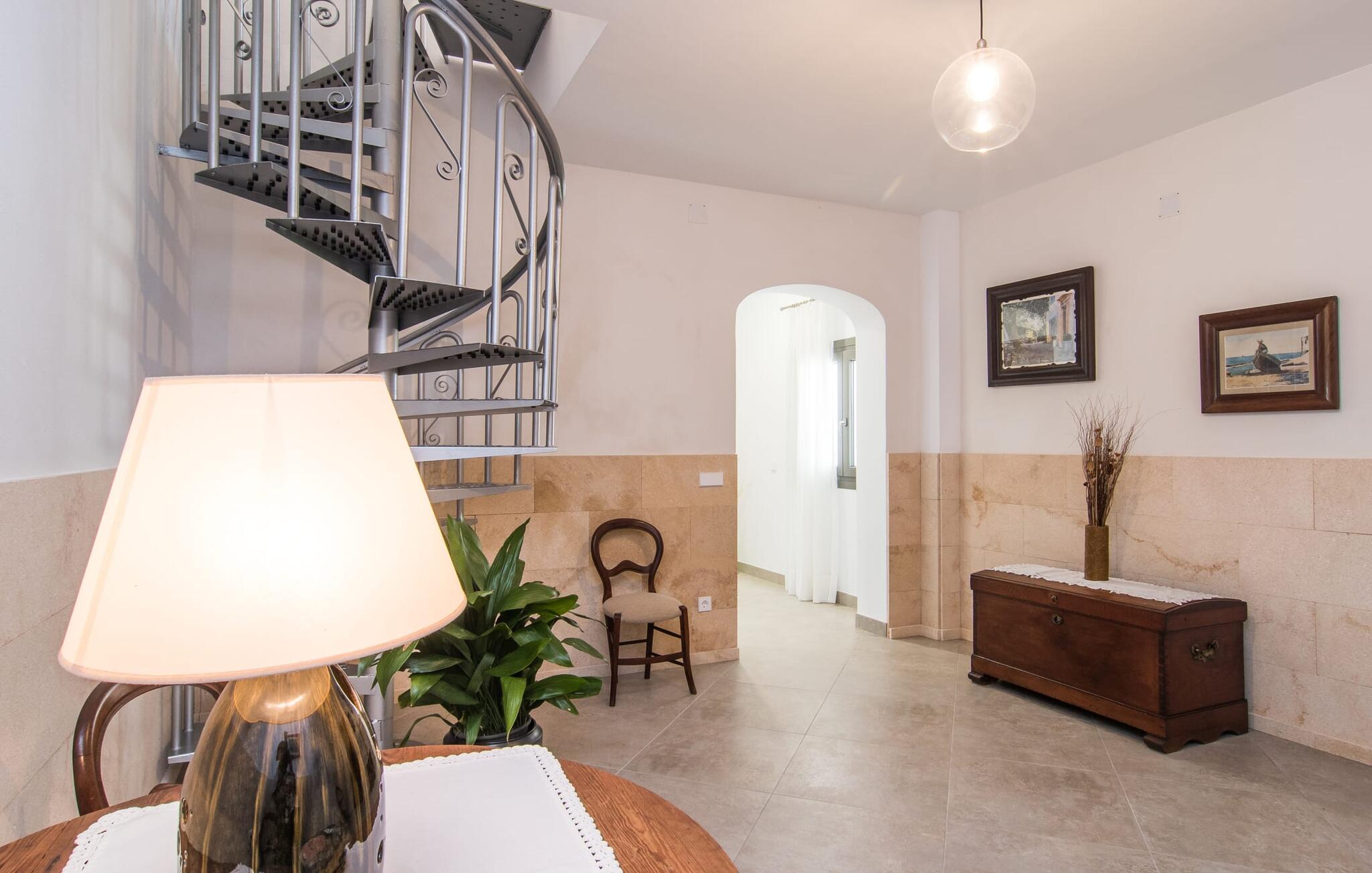 De handgesmede wenteltrap in de foyer leidt naar de bovenste verdieping, waar de slaapkamers wachten. De ouderslaapkamer heeft een comfortabel tweepersoonsbed en directe toegang tot het zonnedek.