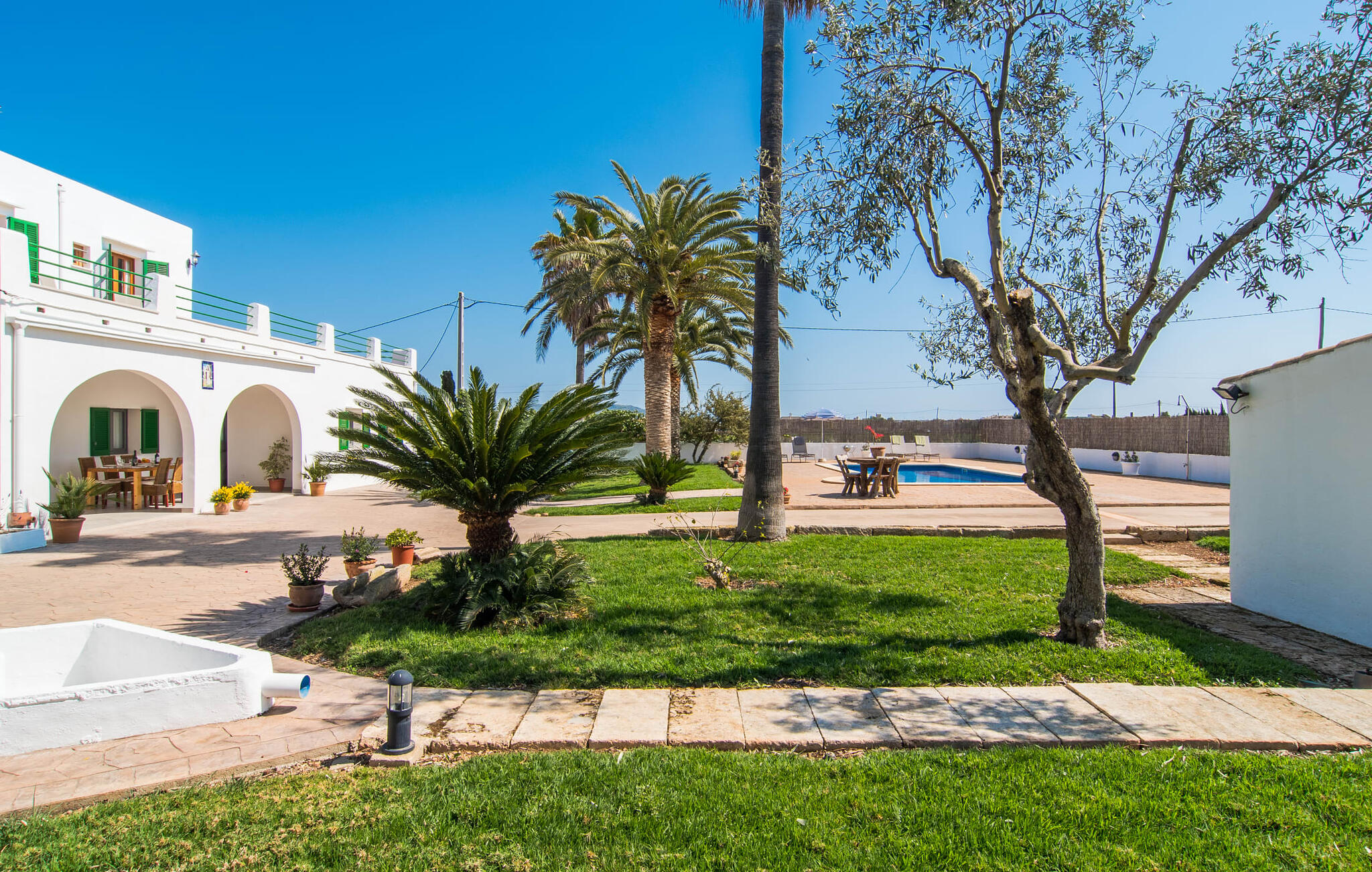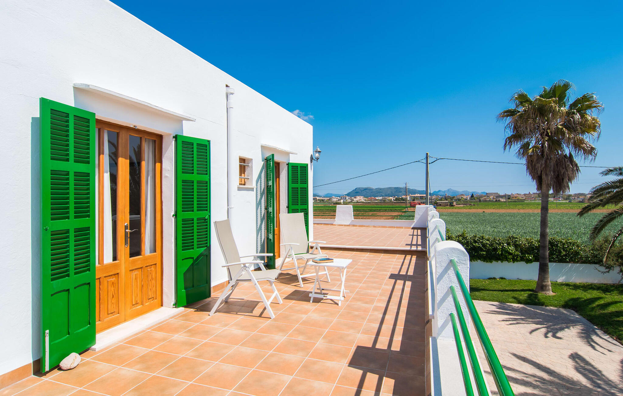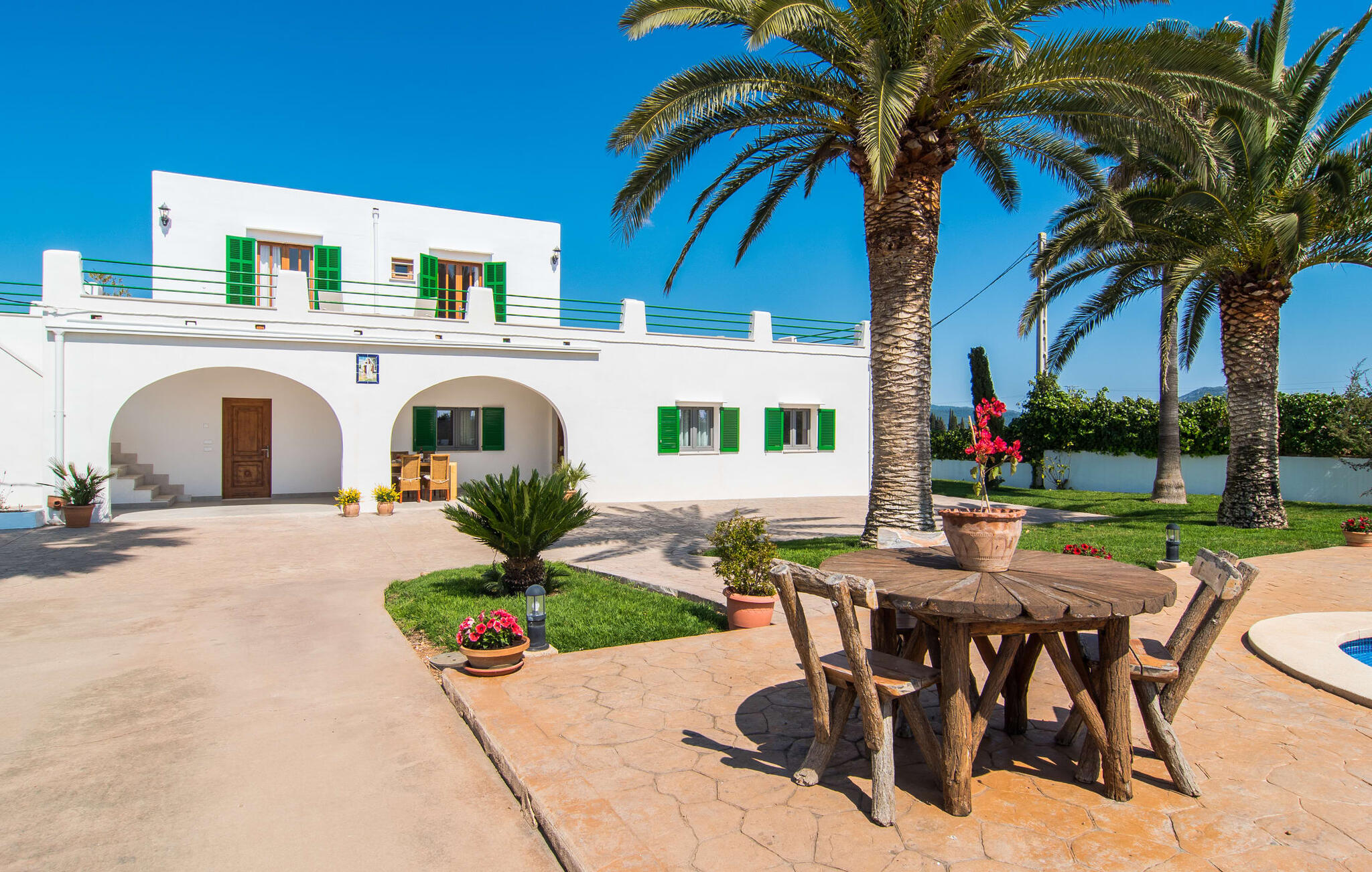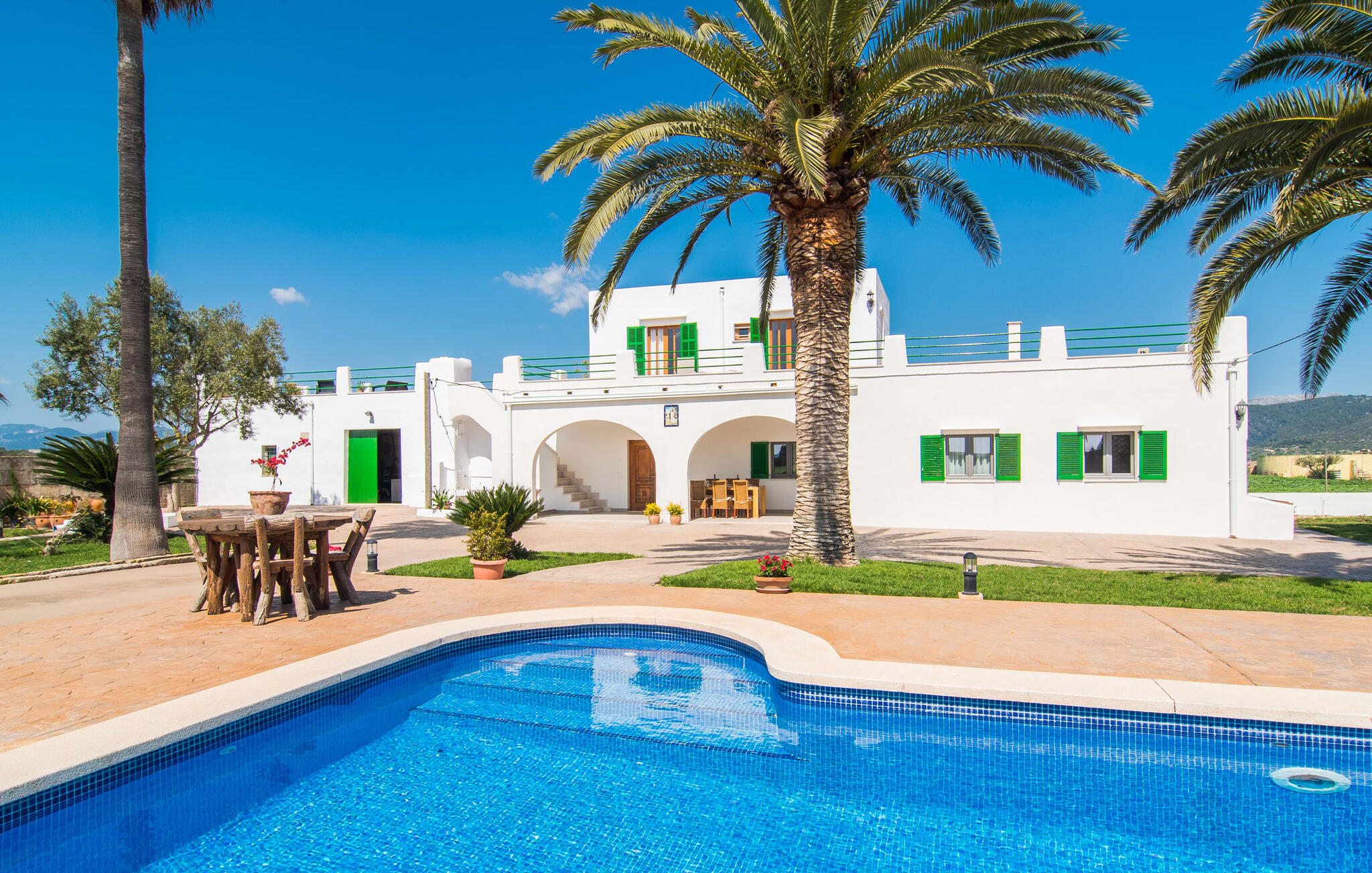 Vanaf de snelweg, net voor de poorten van Sa Pobla, leidt de brede weg tussen de heuvels je naar Villa Can Goet. Het stralend witte huis ligt aan de voet van het majestueuze Tramuntana-gebergte. Het huis wordt omringd door een kleine witte muur, waarlangs groene hagen en indrukwekkende hoge palmbomen groeien, die het gebied markeren waarop de prachtige villa met smaragdgroene luiken staat. De architectuur van het huis is een geslaagde mix van typische Ibiza-villa`s en klassieke koloniale stijl.