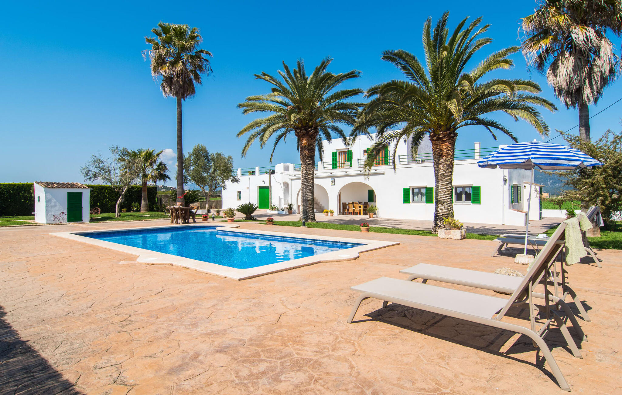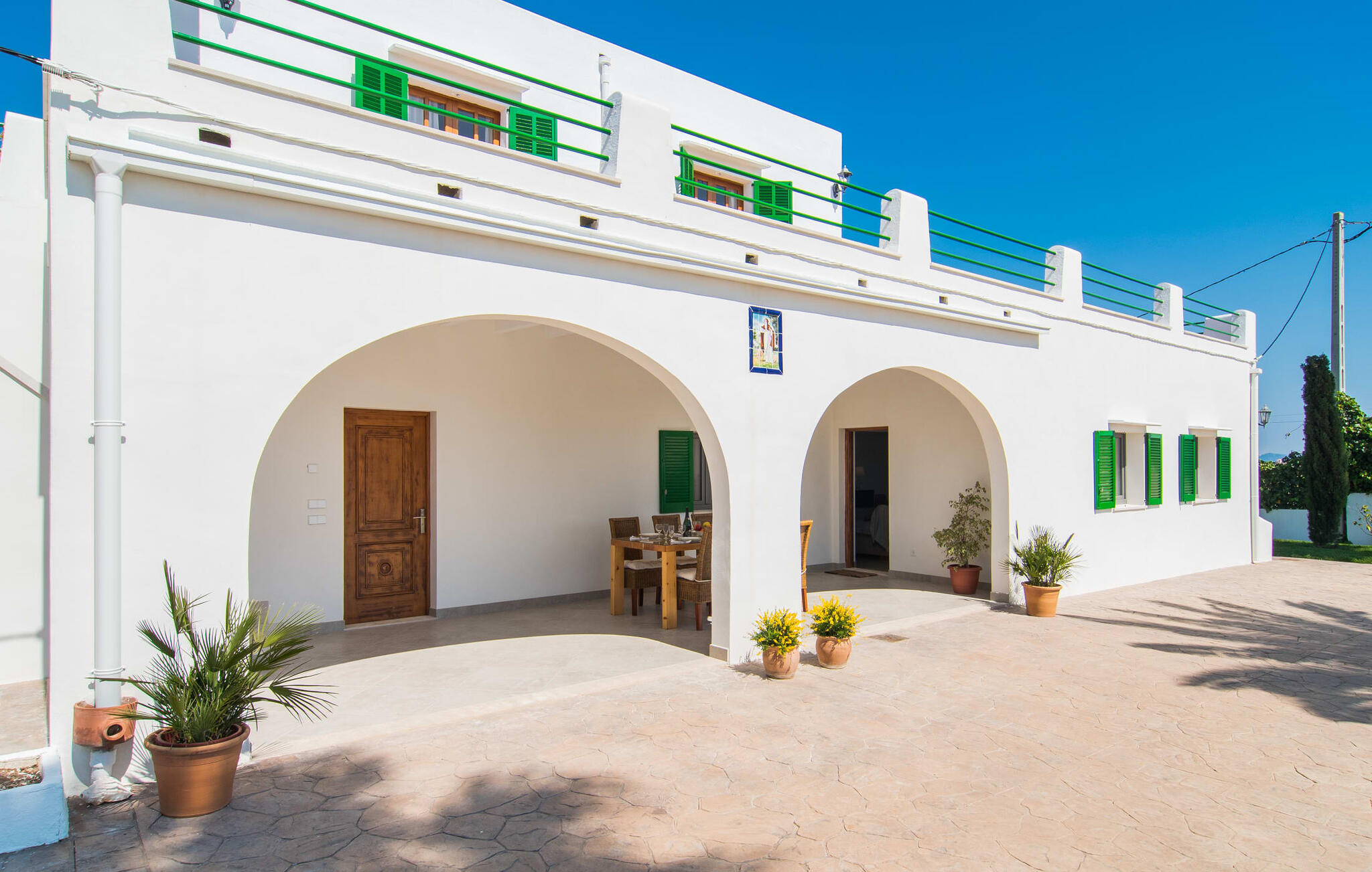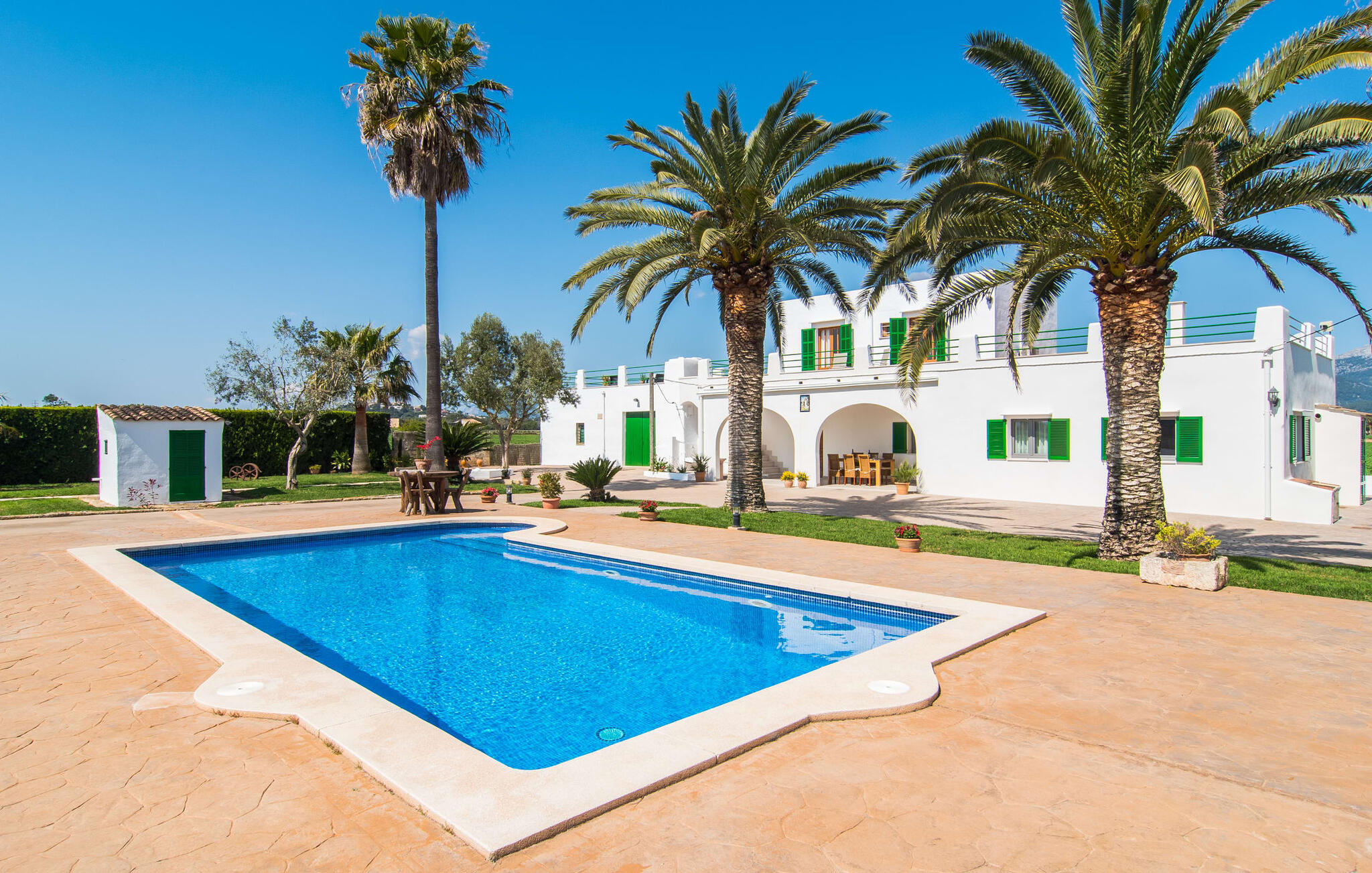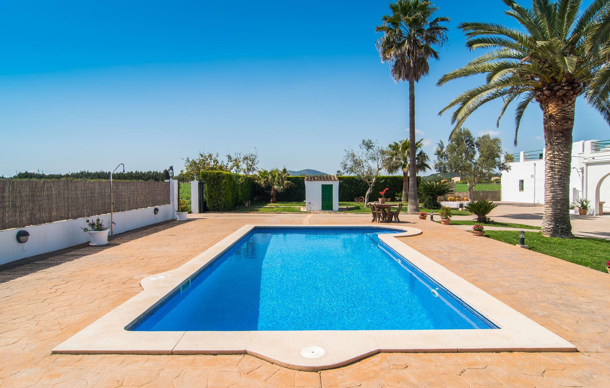 Vanaf de snelweg, net voor de poorten van Sa Pobla, leidt de brede weg tussen de heuvels je naar Villa Can Goet. Het stralend witte huis ligt aan de voet van het majestueuze Tramuntana-gebergte. Het huis wordt omringd door een kleine witte muur, waarlangs groene hagen en indrukwekkende hoge palmbomen groeien, die het gebied markeren waarop de prachtige villa met smaragdgroene luiken staat. De architectuur van het huis is een geslaagde mix van typische Ibiza-villa`s en klassieke koloniale stijl.