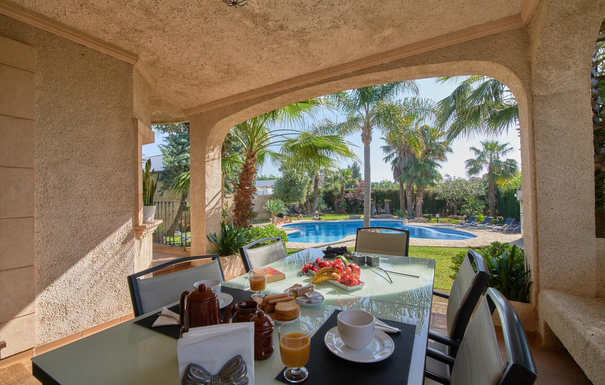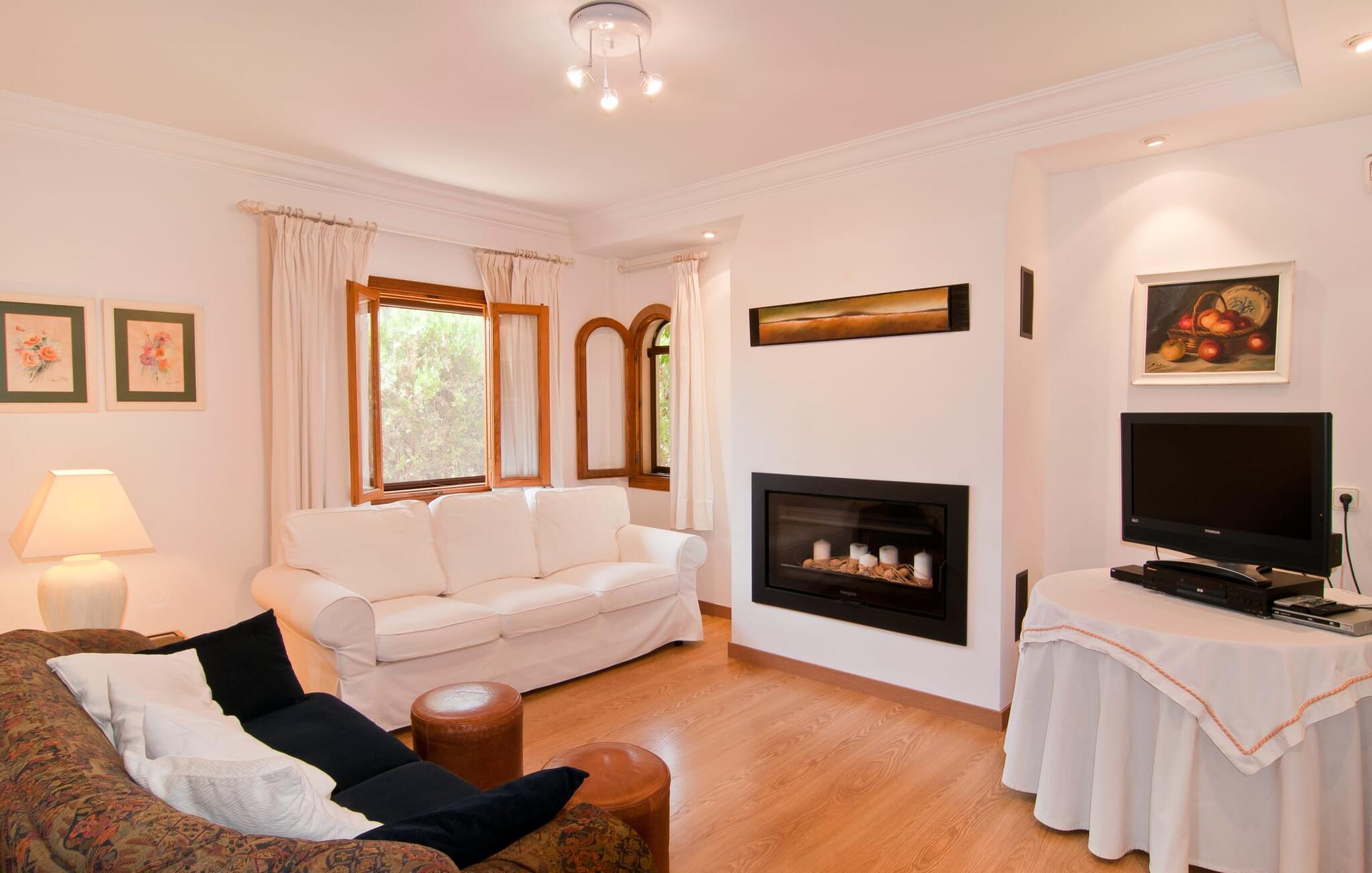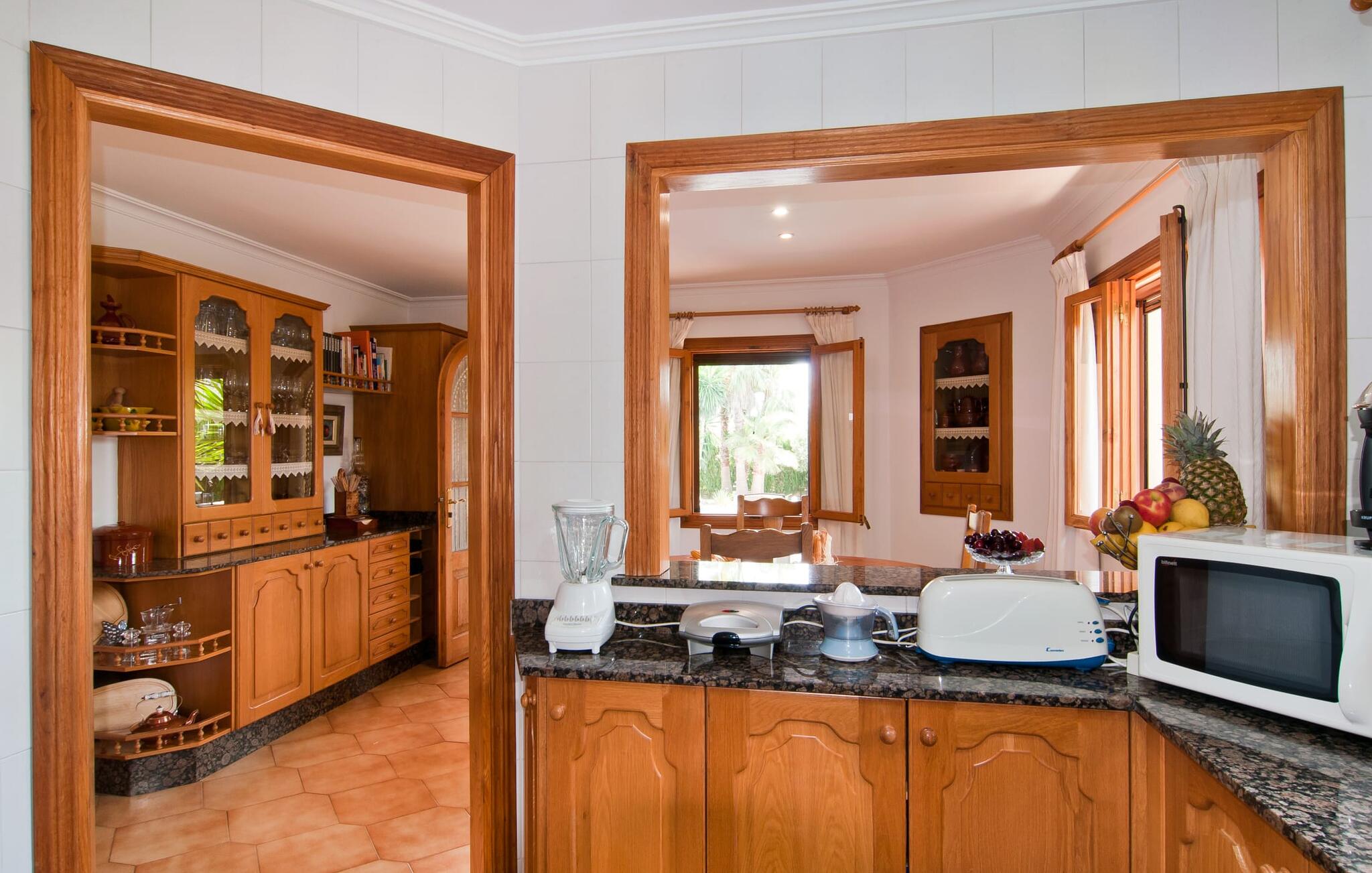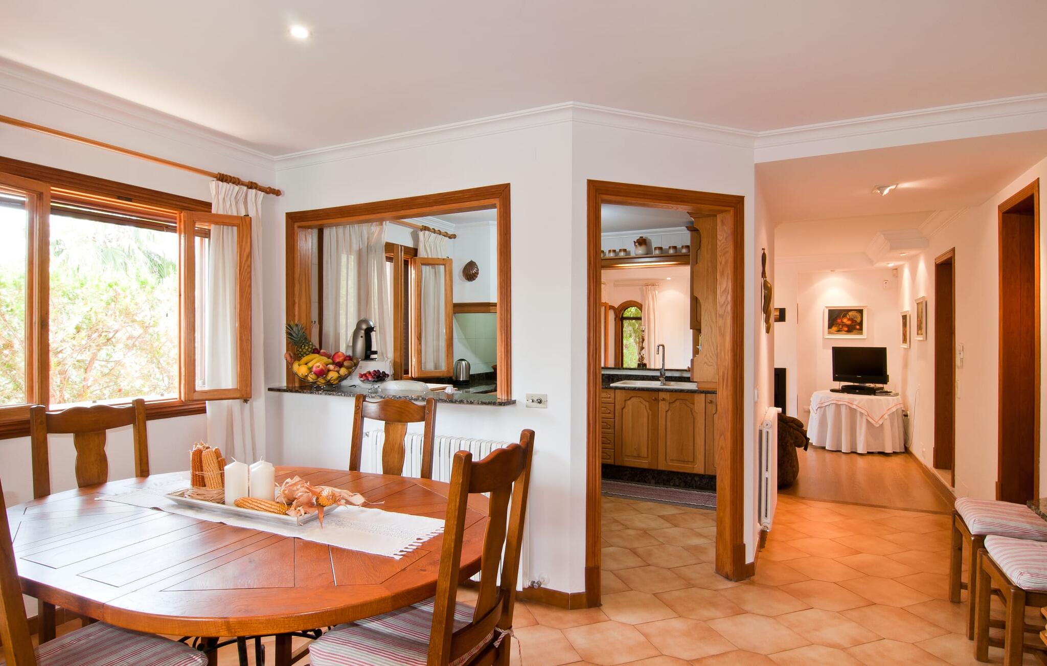 Binnen heeft de moderne en stijlvolle villa een grote woonkamer met hoogglans zandstenen tegels, witte muren en gezellige antieke meubels die een warme sfeer creëren. De goed uitgeruste keuken en eethoek zijn perfect voor self-catering en bieden moderne voorzieningen voor een comfortabel verblijf.
