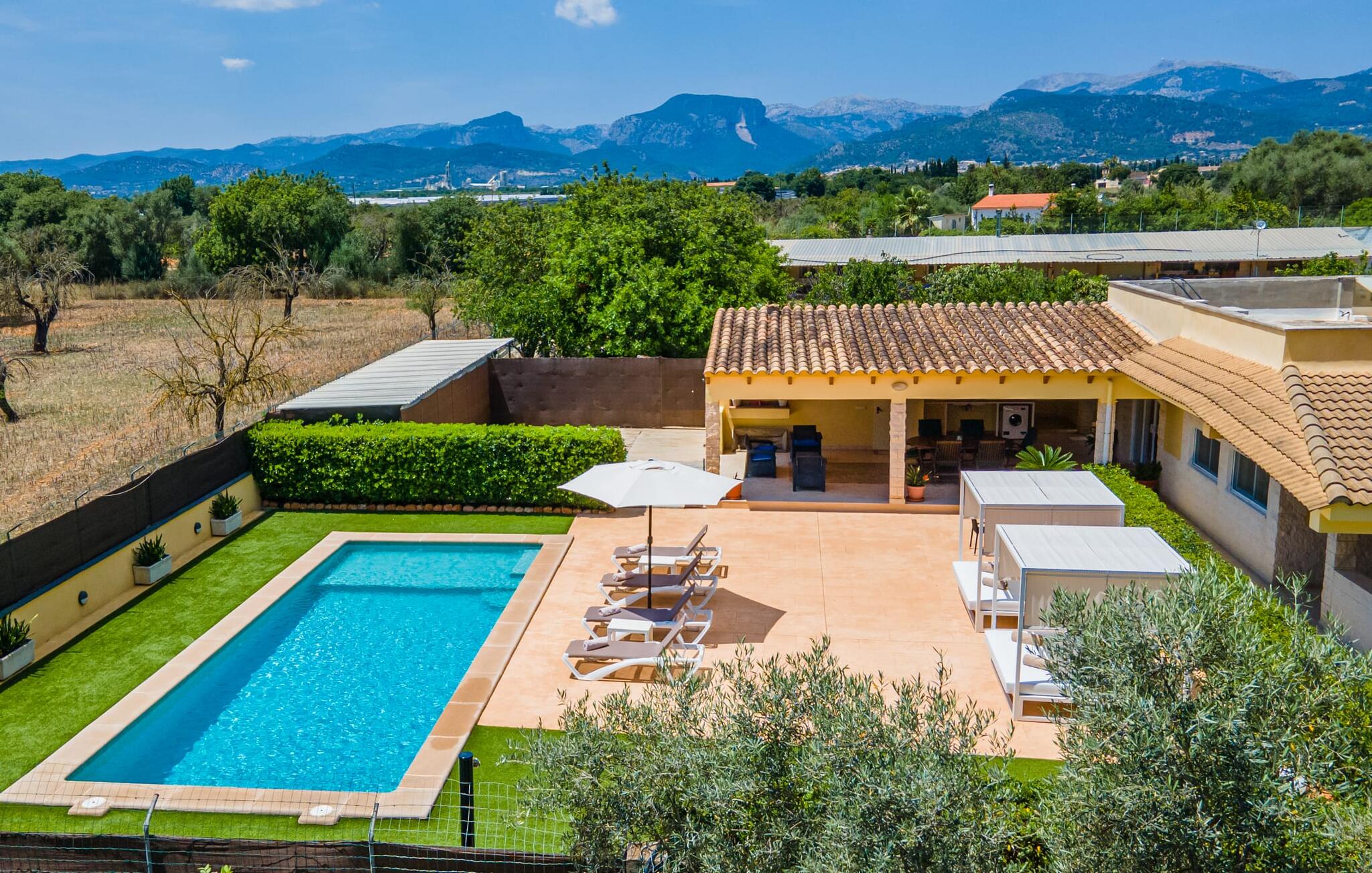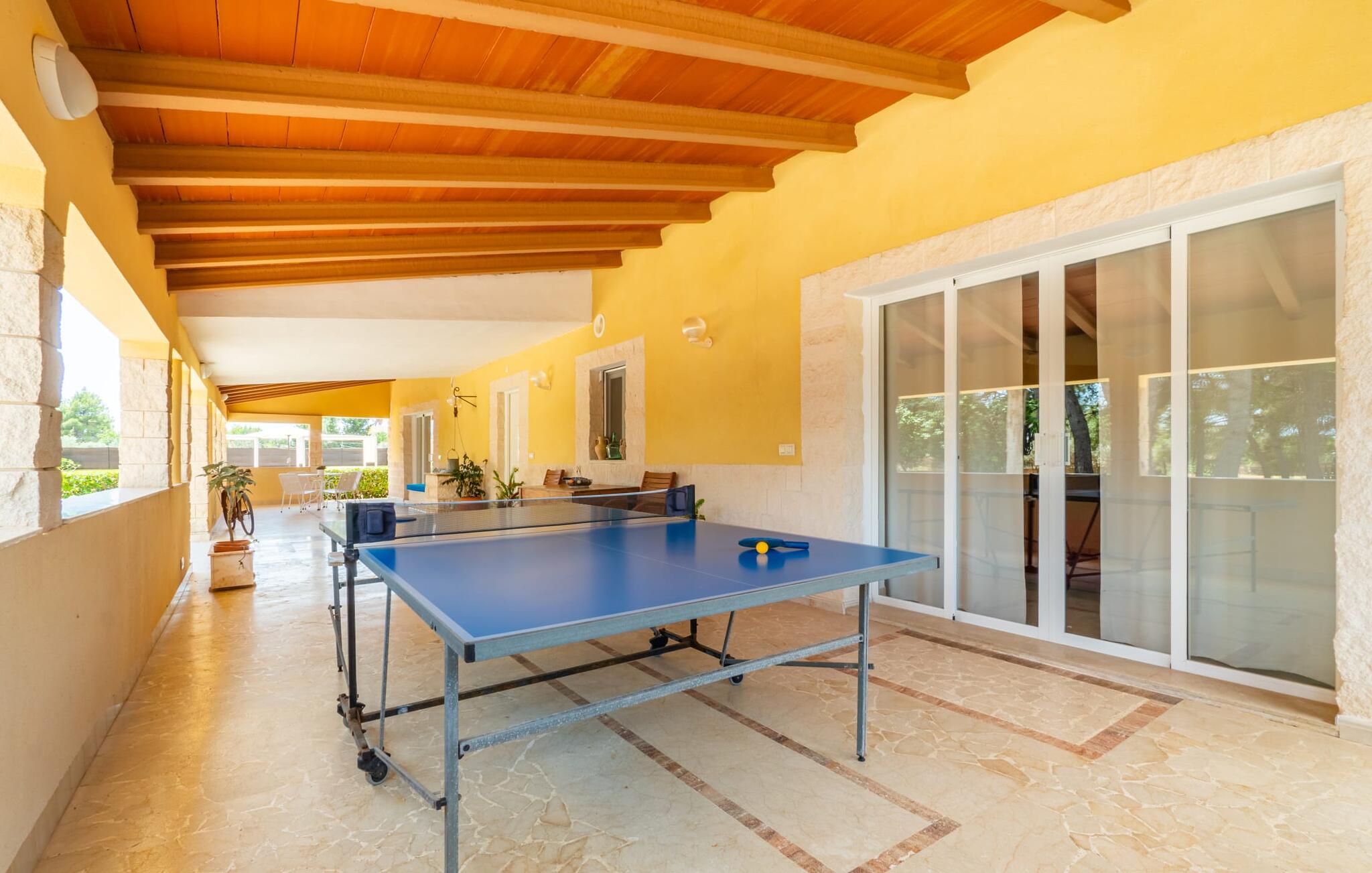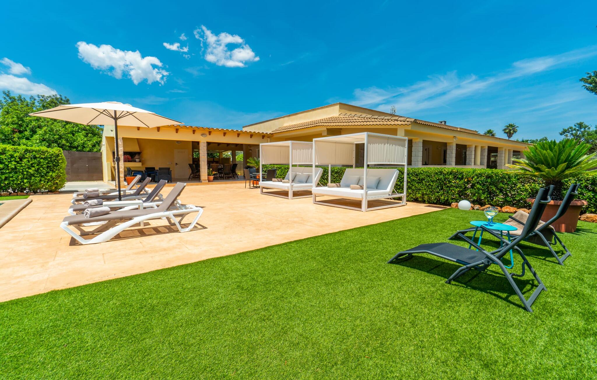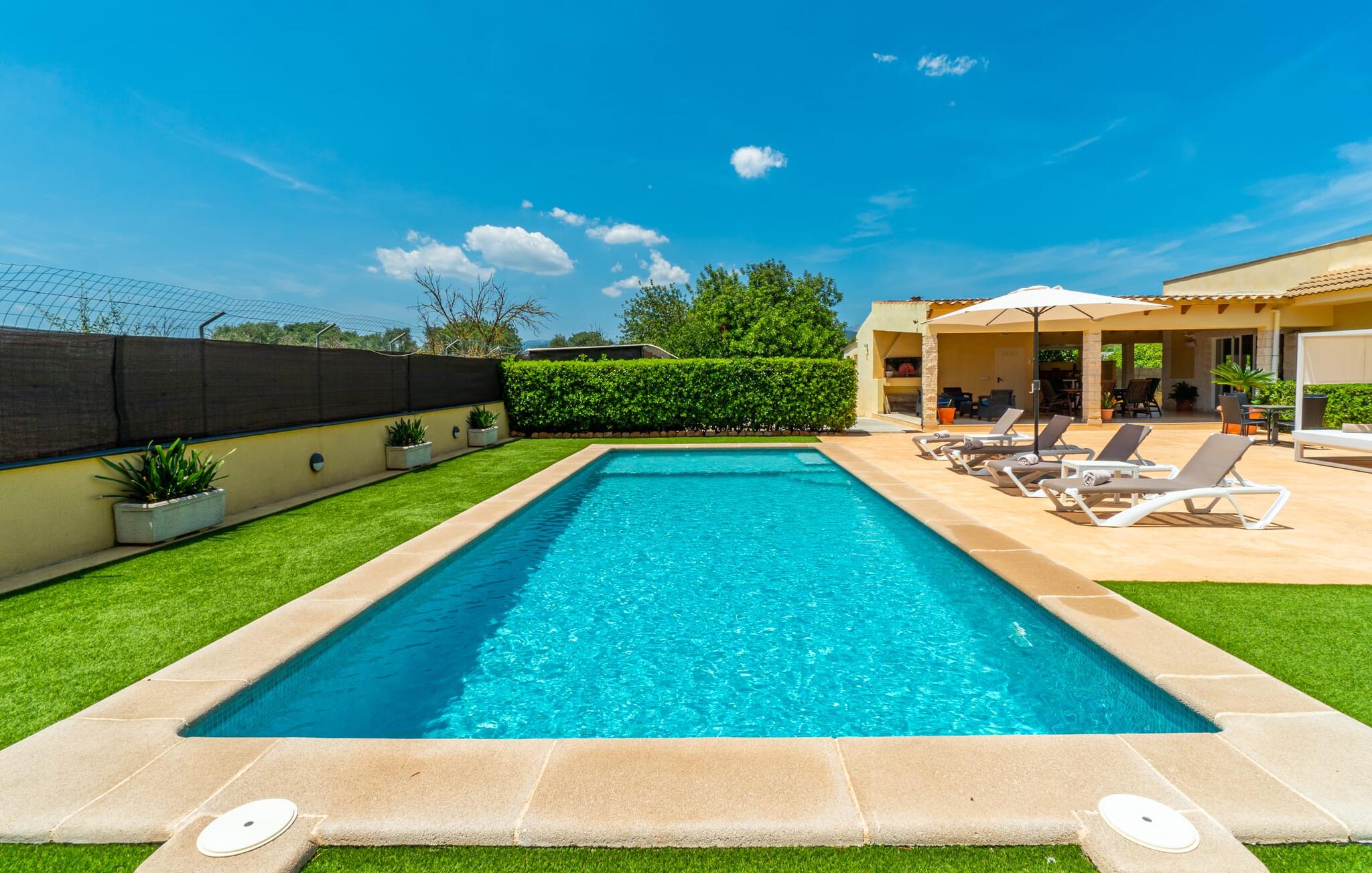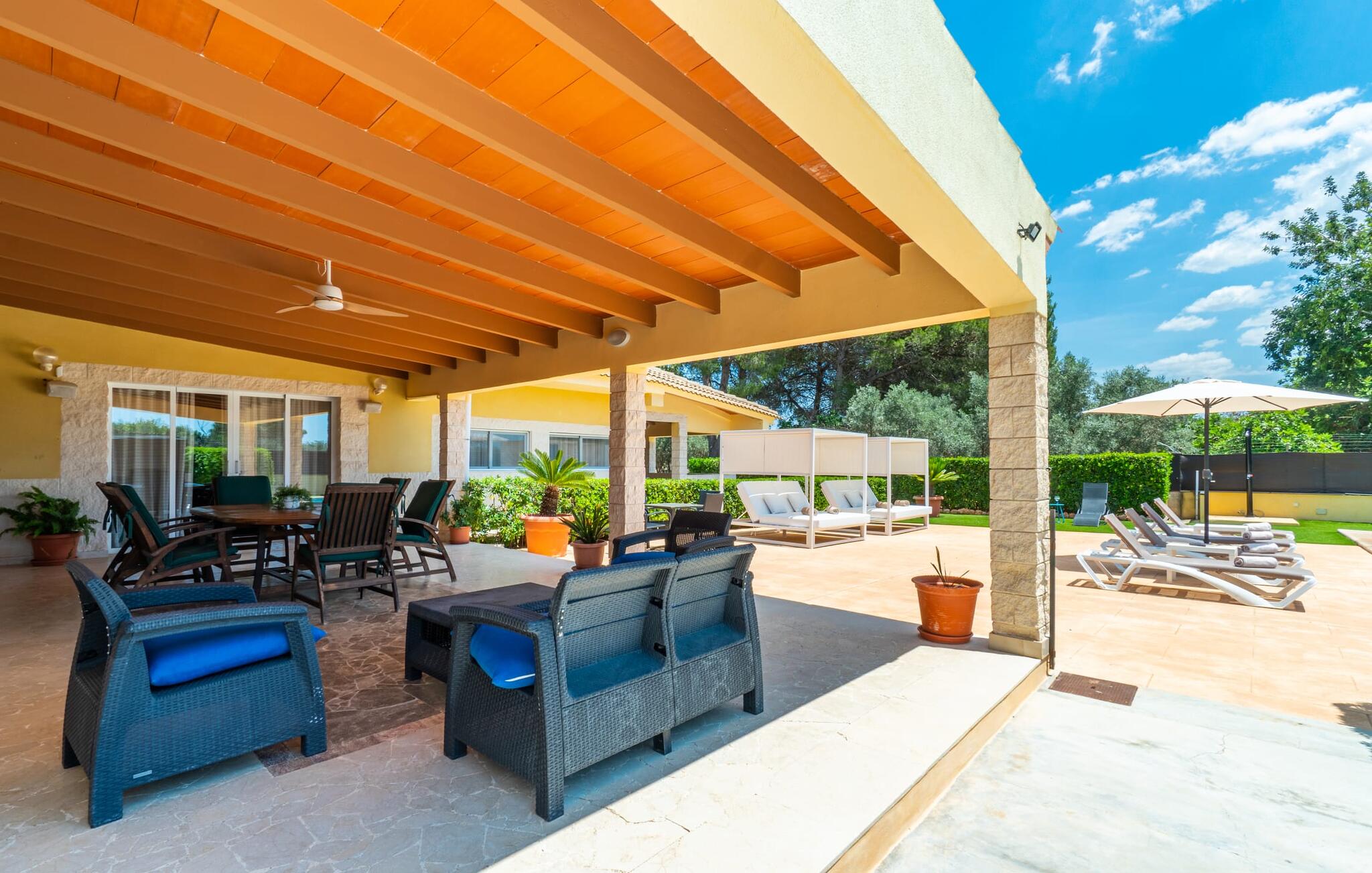 Villa Can Just schittert in zonnig geel, gecombineerd met rustiek natuursteen, vlakbij Inca in het midden van het eiland. Het nieuw gebouwde, gelijkvloerse huis heeft een uitnodigende, goed onderhouden buitenruimte. In het midden ligt het grote, rechthoekige zwembad met buitendouche, omringd door een betegeld zonneterras en een kunstgrasveld met voldoende comfortabele ligstoelen en een schaduwrijke parasol. Volledige privacy is hier gegarandeerd, en er is ook genoeg ruimte voor kinderen om te spetteren en voor volwassenen om te zwemmen. De overdekte terrassen rond het huis zijn bijzonder aantrekkelijk. Met de buitenkeuken en de buitenbadkamer verplaats je je vakantieleven bijna volledig naar buiten. Er zijn genoeg zit- en ontspanningsmogelijkheden: van gezellige loungemeubelen tot een mooie stenen bank met comfortabele kussens en een grote eettafel met bijpassende stoelen. En als je op zoek bent naar een uitdaging, kun je een potje tafeltennis spelen tegen je medereizigers aan de eigen tafel.