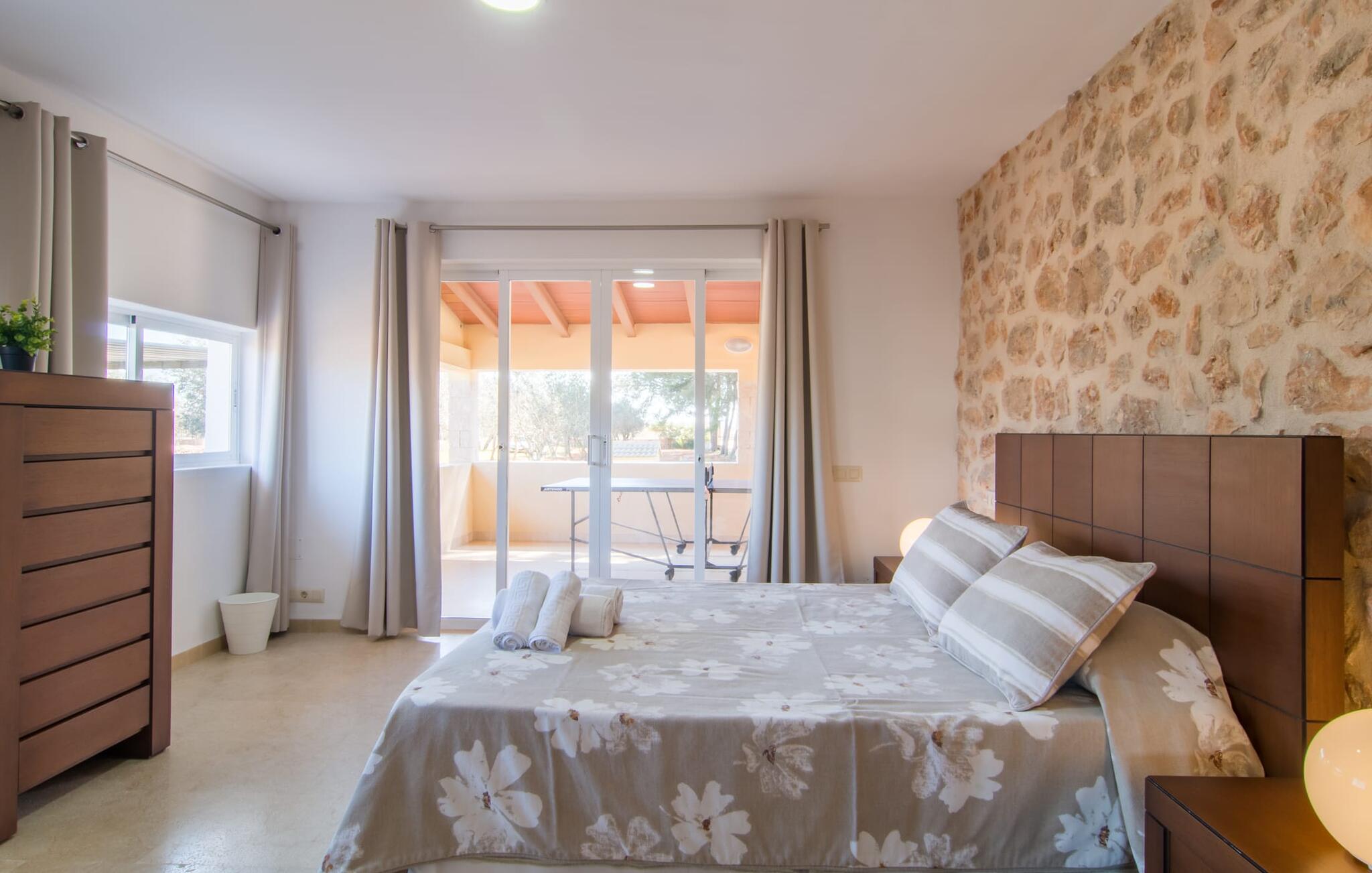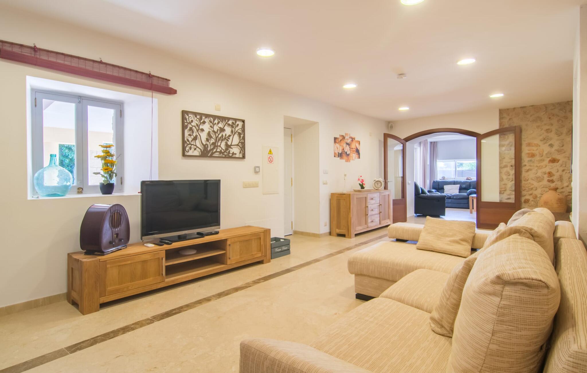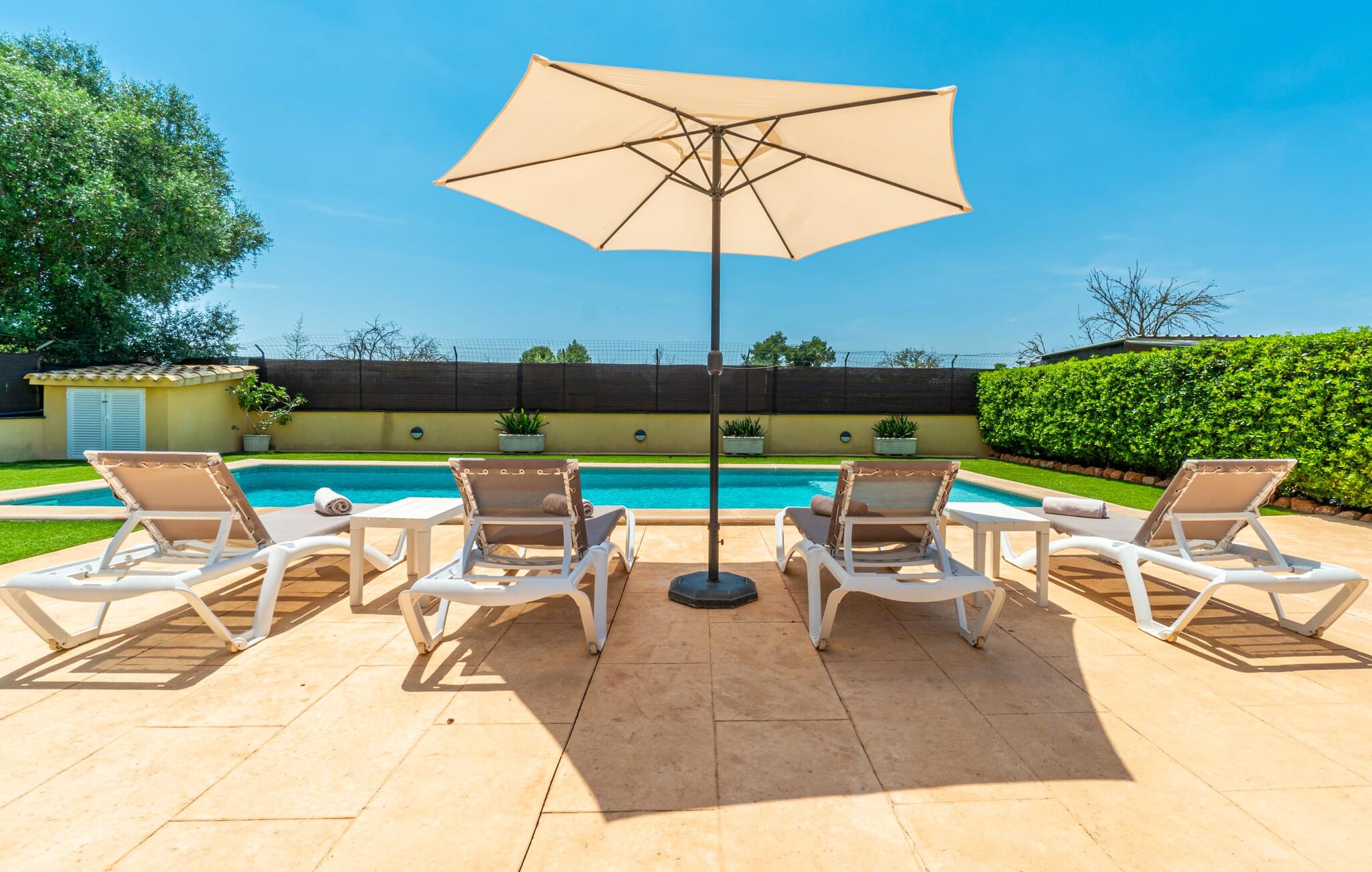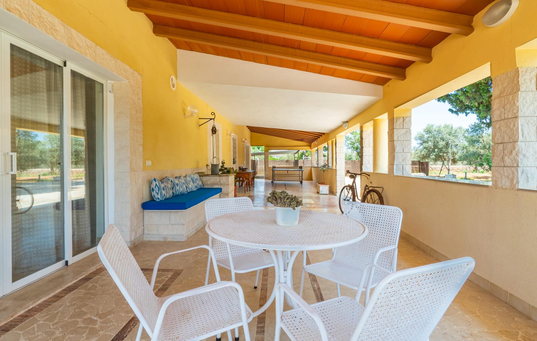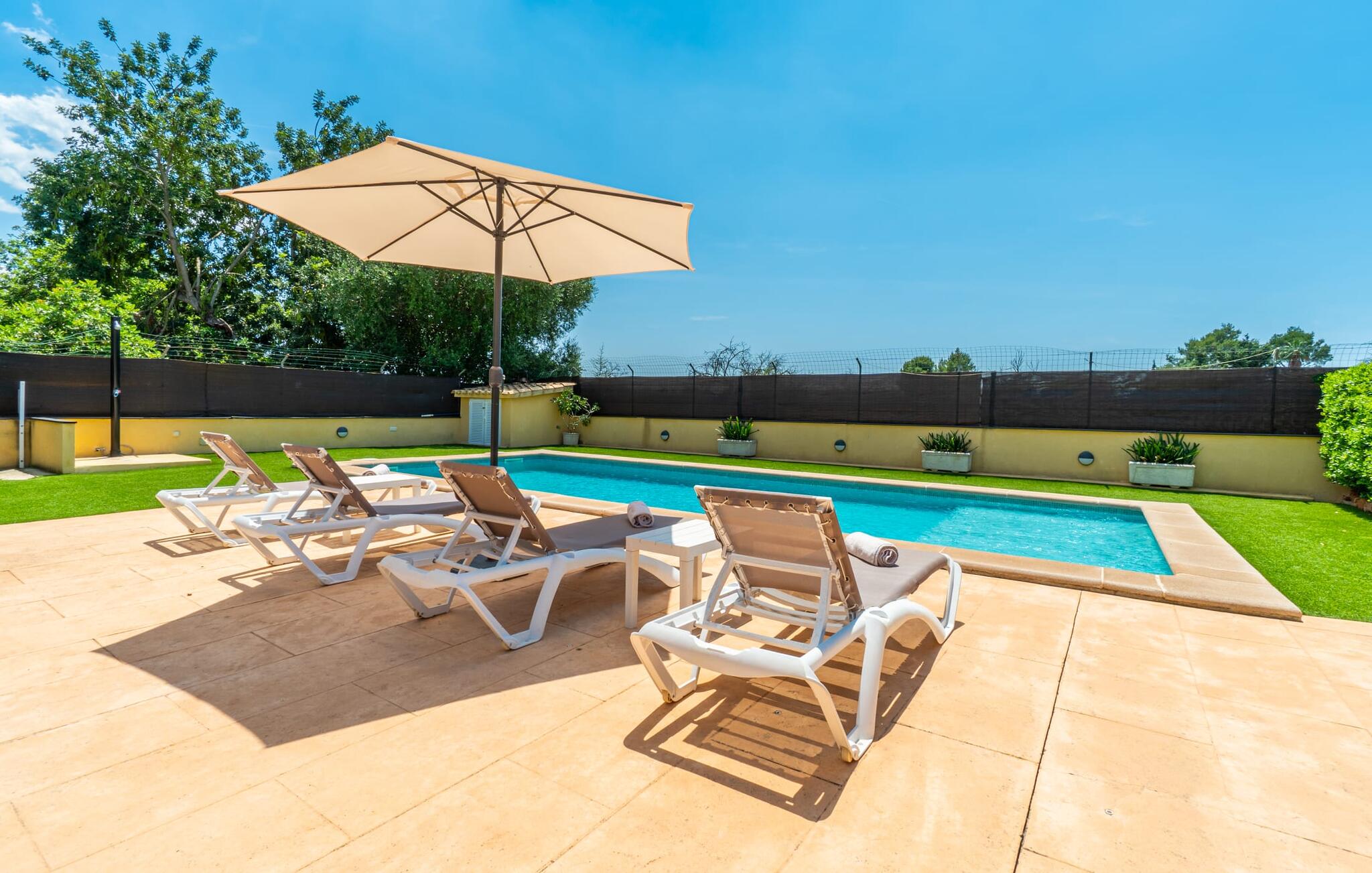 Villa Can Just schittert in zonnig geel, gecombineerd met rustiek natuursteen, vlakbij Inca in het midden van het eiland. Het nieuw gebouwde, gelijkvloerse huis heeft een uitnodigende, goed onderhouden buitenruimte. In het midden ligt het grote, rechthoekige zwembad met buitendouche, omringd door een betegeld zonneterras en een kunstgrasveld met voldoende comfortabele ligstoelen en een schaduwrijke parasol. Volledige privacy is hier gegarandeerd, en er is ook genoeg ruimte voor kinderen om te spetteren en voor volwassenen om te zwemmen. De overdekte terrassen rond het huis zijn bijzonder aantrekkelijk. Met de buitenkeuken en de buitenbadkamer verplaats je je vakantieleven bijna volledig naar buiten. Er zijn genoeg zit- en ontspanningsmogelijkheden: van gezellige loungemeubelen tot een mooie stenen bank met comfortabele kussens en een grote eettafel met bijpassende stoelen. En als je op zoek bent naar een uitdaging, kun je een potje tafeltennis spelen tegen je medereizigers aan de eigen tafel.