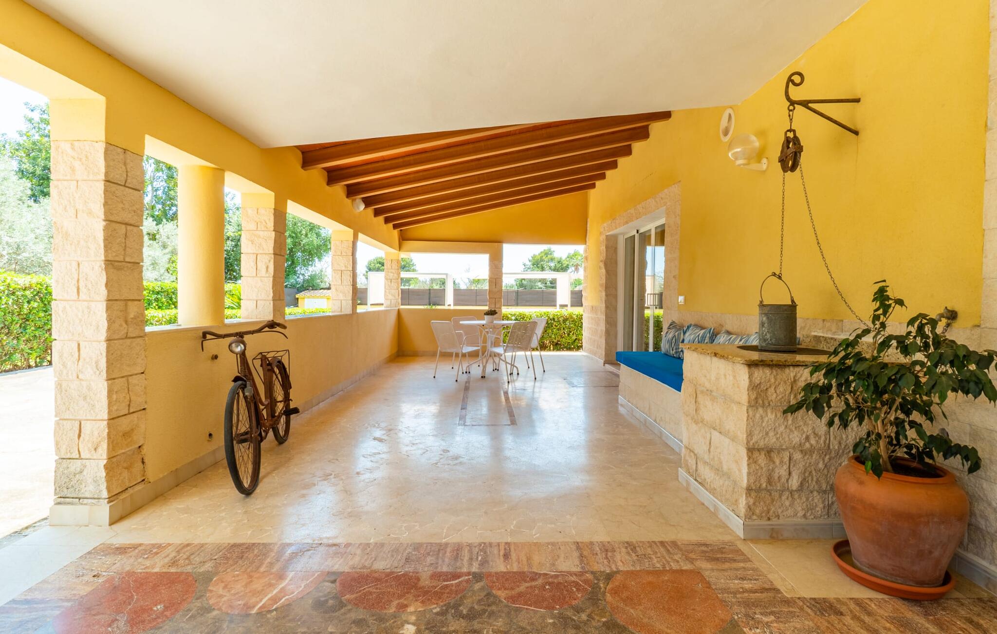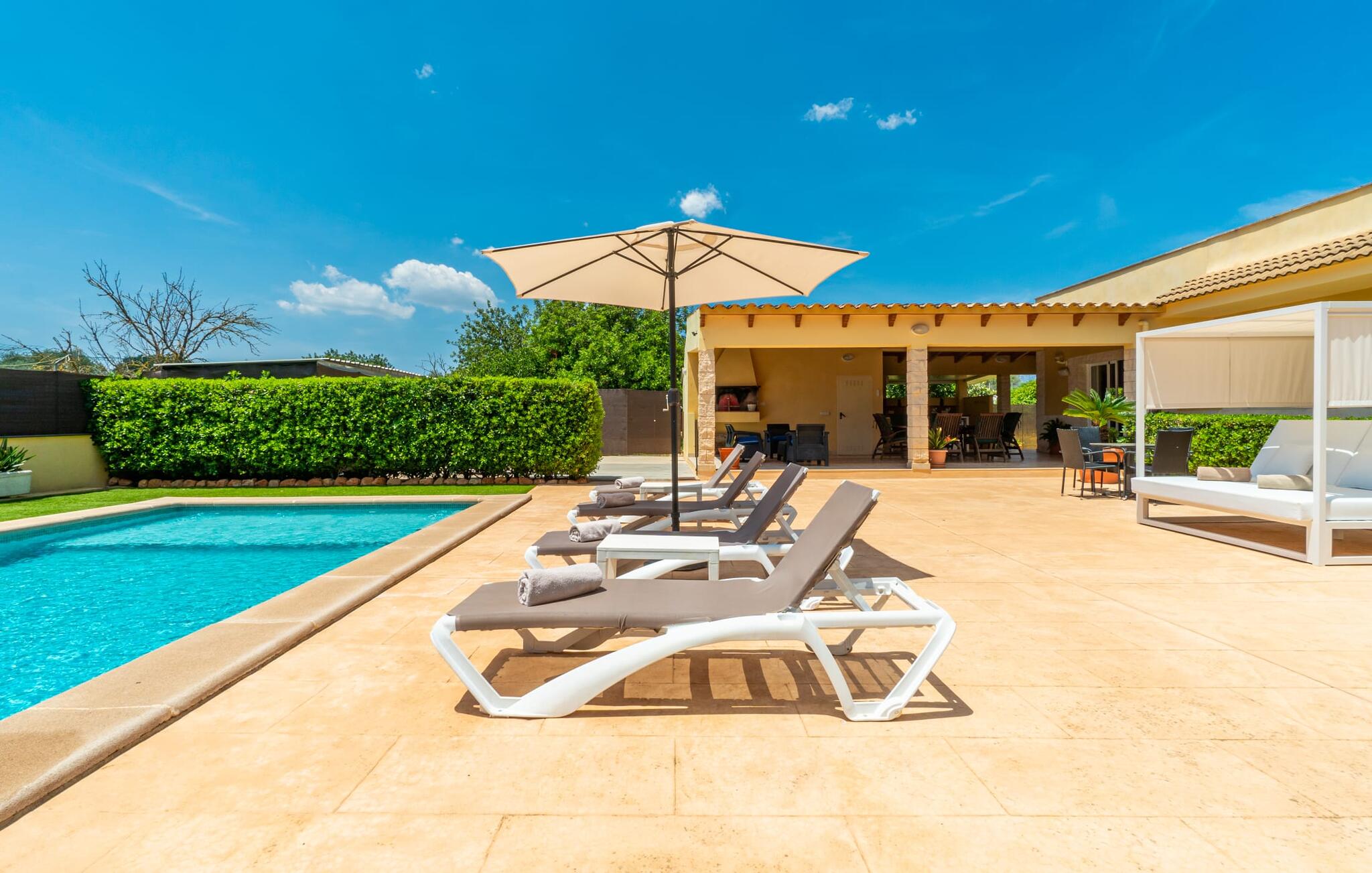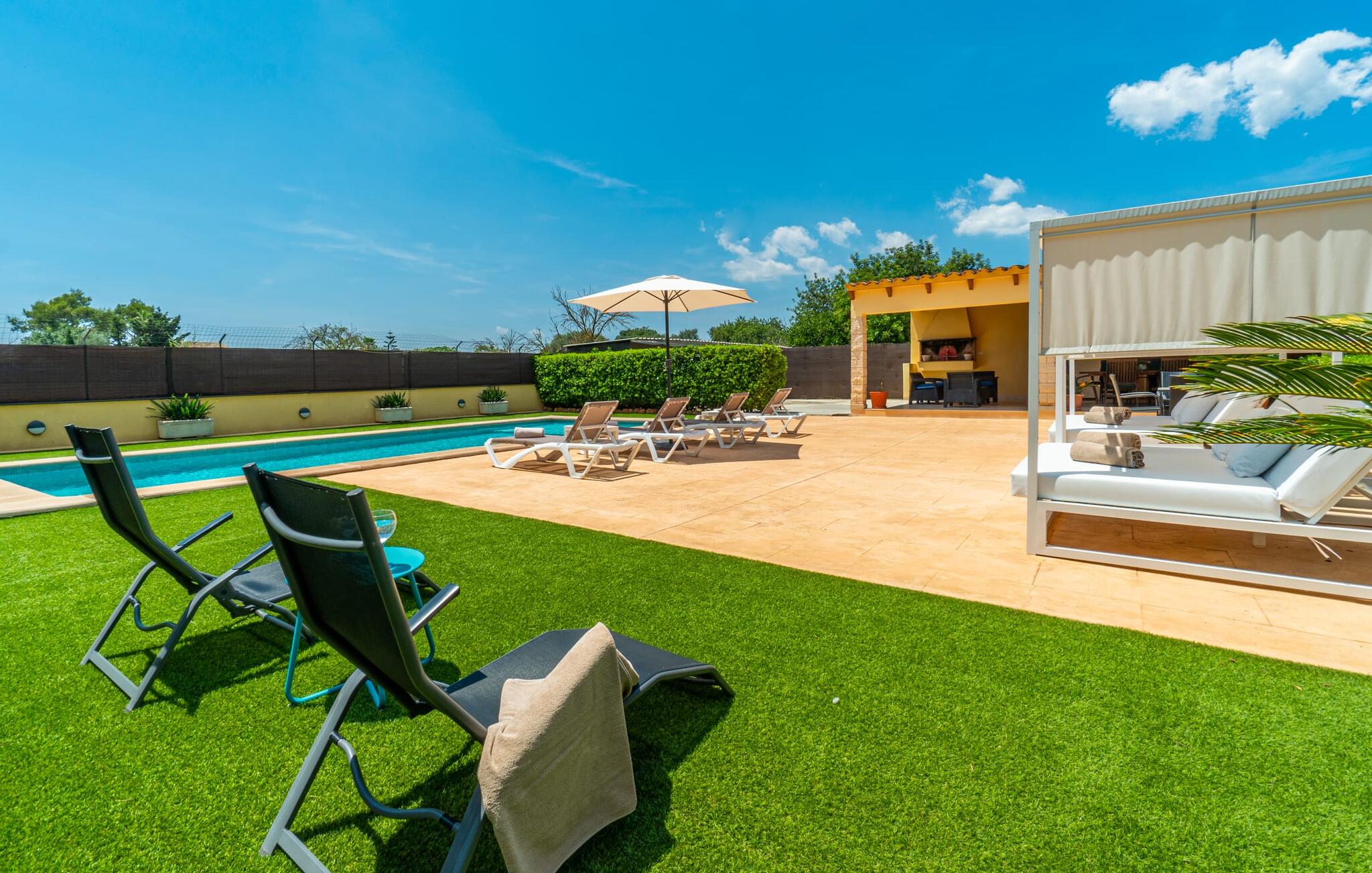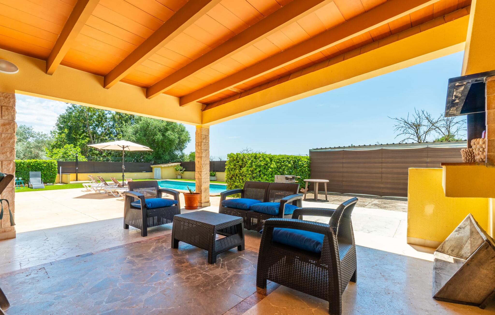 Villa Can Just schittert in zonnig geel, gecombineerd met rustiek natuursteen, vlakbij Inca in het midden van het eiland. Het nieuw gebouwde, gelijkvloerse huis heeft een uitnodigende, goed onderhouden buitenruimte. In het midden ligt het grote, rechthoekige zwembad met buitendouche, omringd door een betegeld zonneterras en een kunstgrasveld met voldoende comfortabele ligstoelen en een schaduwrijke parasol. Volledige privacy is hier gegarandeerd, en er is ook genoeg ruimte voor kinderen om te spetteren en voor volwassenen om te zwemmen. De overdekte terrassen rond het huis zijn bijzonder aantrekkelijk. Met de buitenkeuken en de buitenbadkamer verplaats je je vakantieleven bijna volledig naar buiten. Er zijn genoeg zit- en ontspanningsmogelijkheden: van gezellige loungemeubelen tot een mooie stenen bank met comfortabele kussens en een grote eettafel met bijpassende stoelen. En als je op zoek bent naar een uitdaging, kun je een potje tafeltennis spelen tegen je medereizigers aan de eigen tafel.