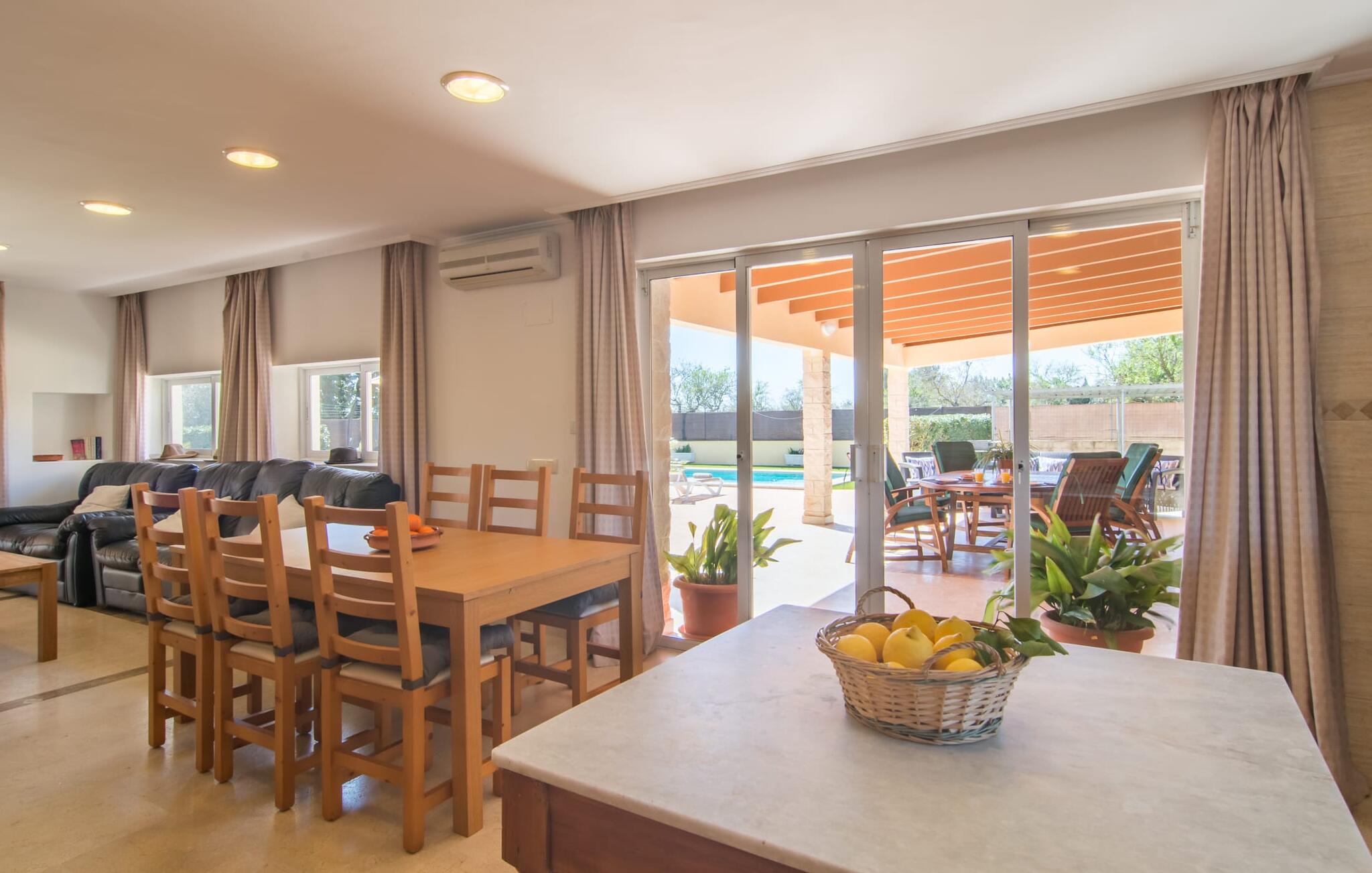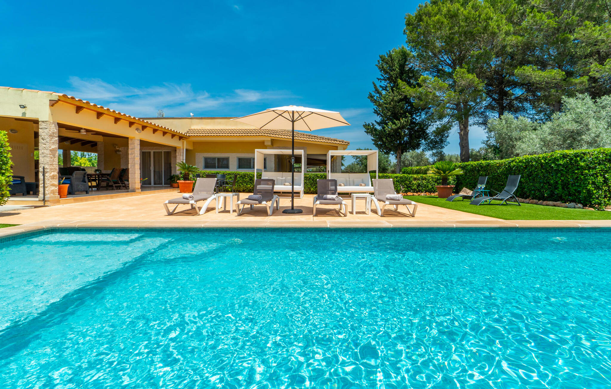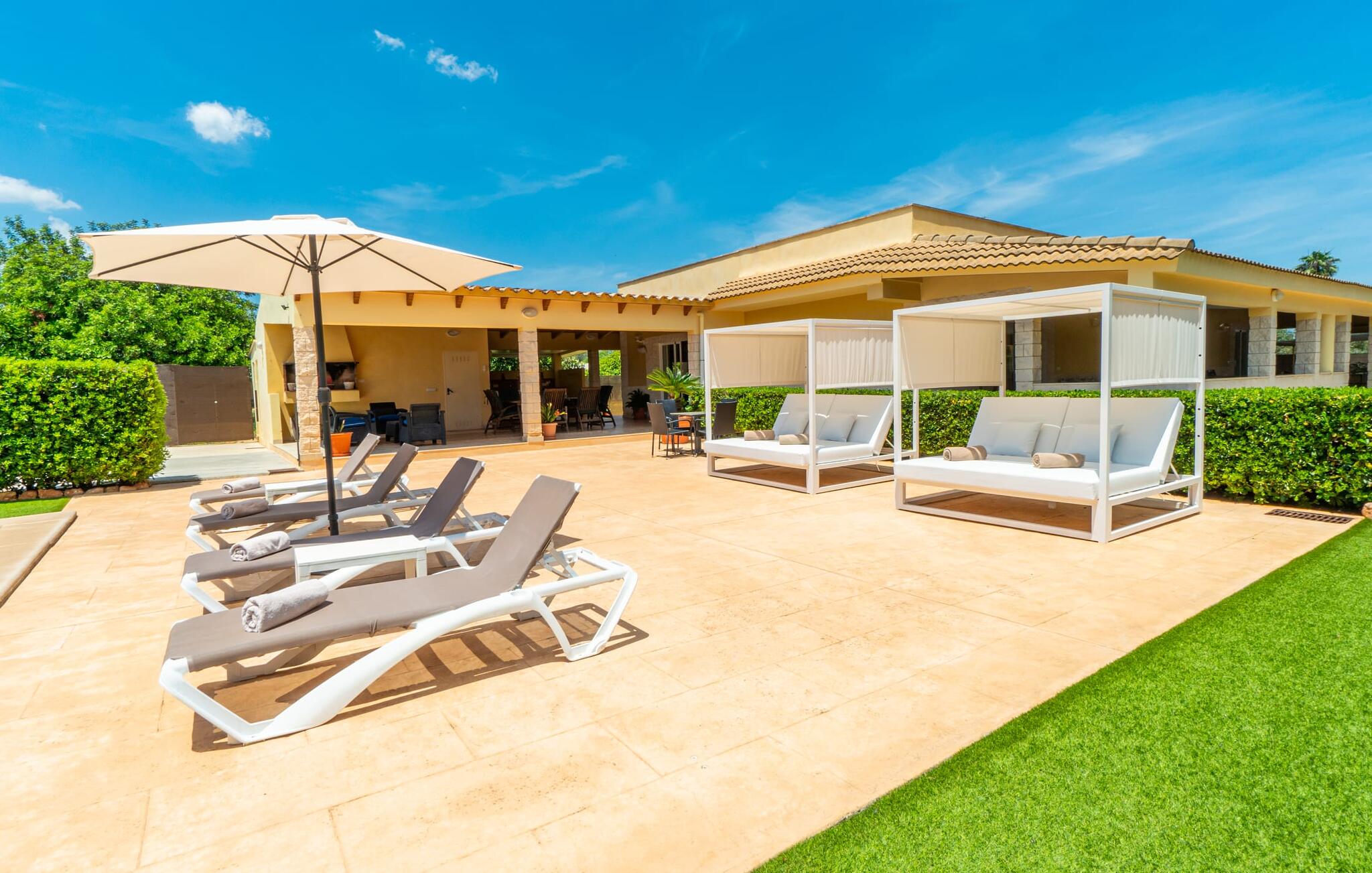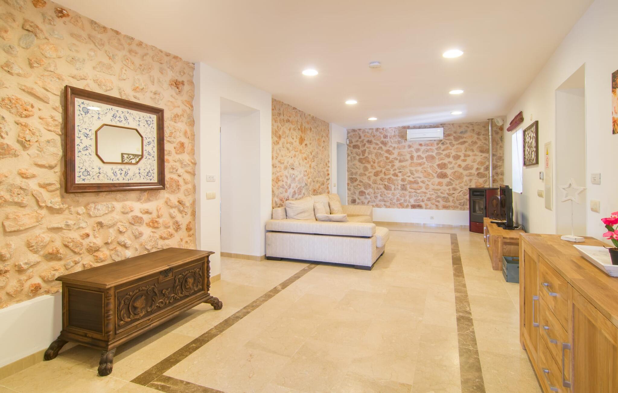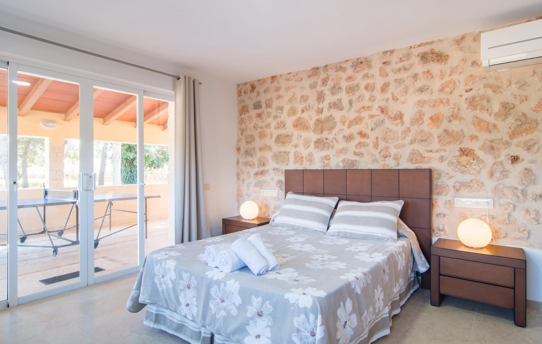 Villa Can Just schittert in zonnig geel, gecombineerd met rustiek natuursteen, vlakbij Inca in het midden van het eiland. Het nieuw gebouwde, gelijkvloerse huis heeft een uitnodigende, goed onderhouden buitenruimte. In het midden ligt het grote, rechthoekige zwembad met buitendouche, omringd door een betegeld zonneterras en een kunstgrasveld met voldoende comfortabele ligstoelen en een schaduwrijke parasol. Volledige privacy is hier gegarandeerd, en er is ook genoeg ruimte voor kinderen om te spetteren en voor volwassenen om te zwemmen. De overdekte terrassen rond het huis zijn bijzonder aantrekkelijk. Met de buitenkeuken en de buitenbadkamer verplaats je je vakantieleven bijna volledig naar buiten. Er zijn genoeg zit- en ontspanningsmogelijkheden: van gezellige loungemeubelen tot een mooie stenen bank met comfortabele kussens en een grote eettafel met bijpassende stoelen. En als je op zoek bent naar een uitdaging, kun je een potje tafeltennis spelen tegen je medereizigers aan de eigen tafel.