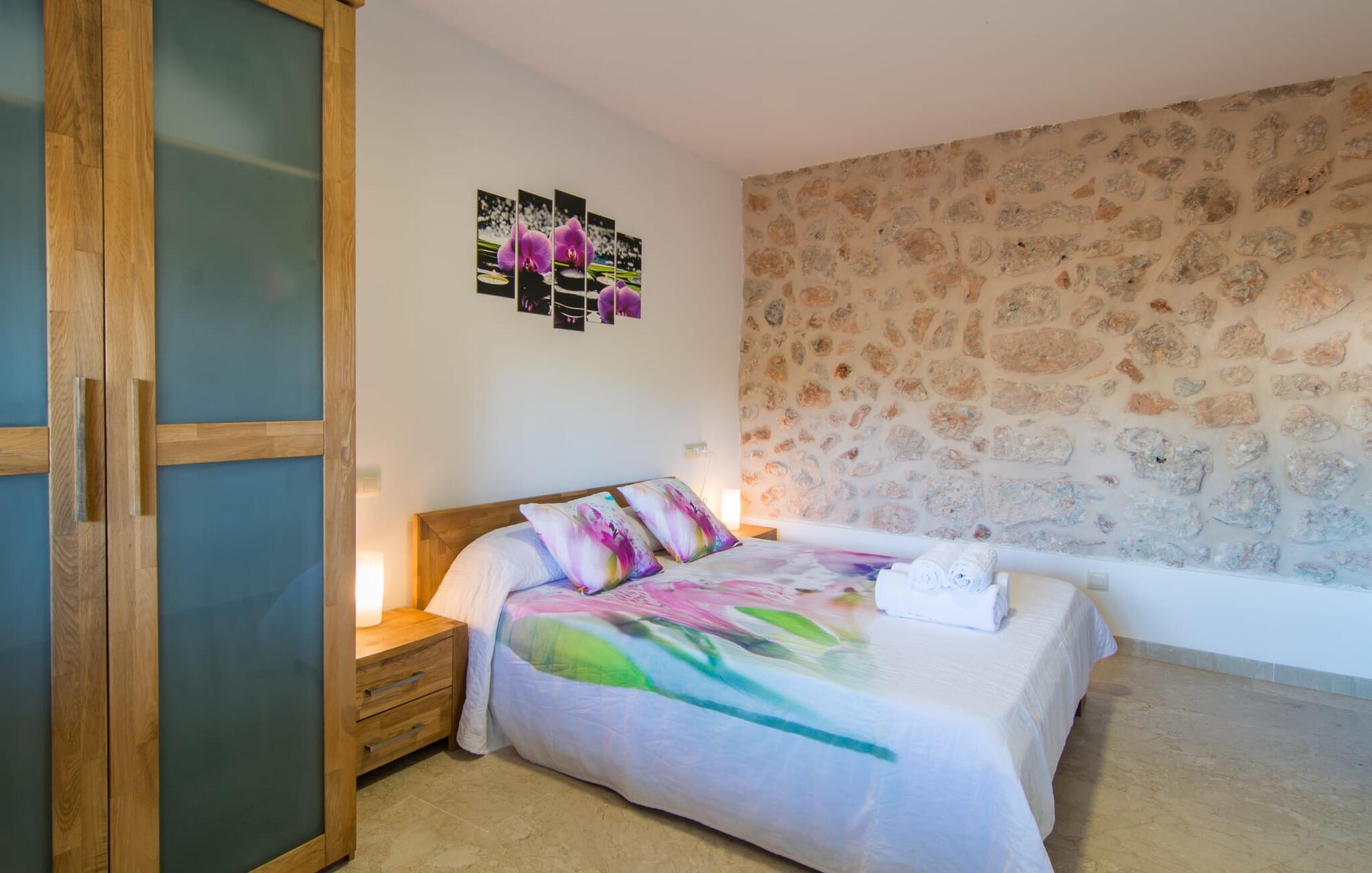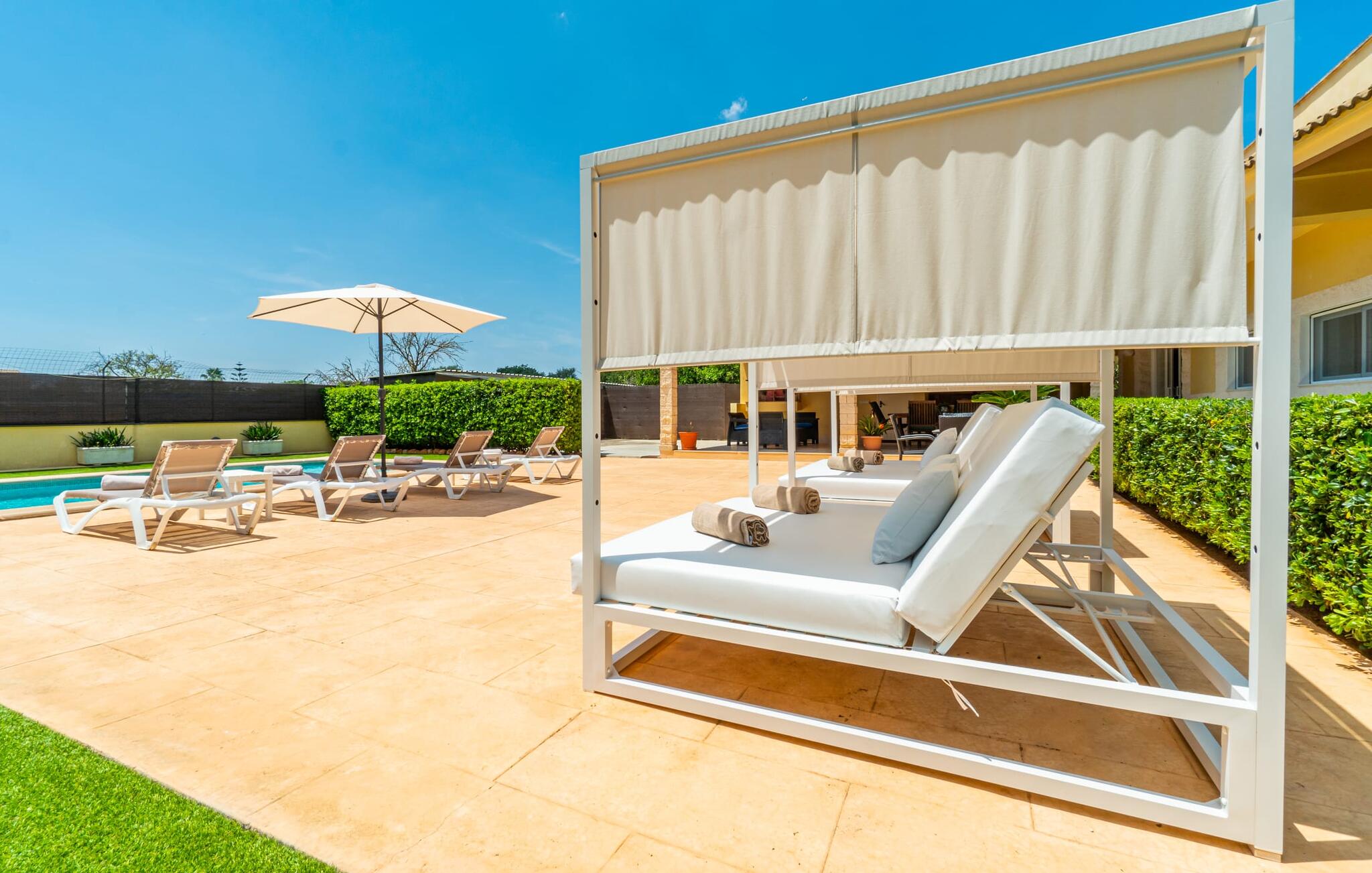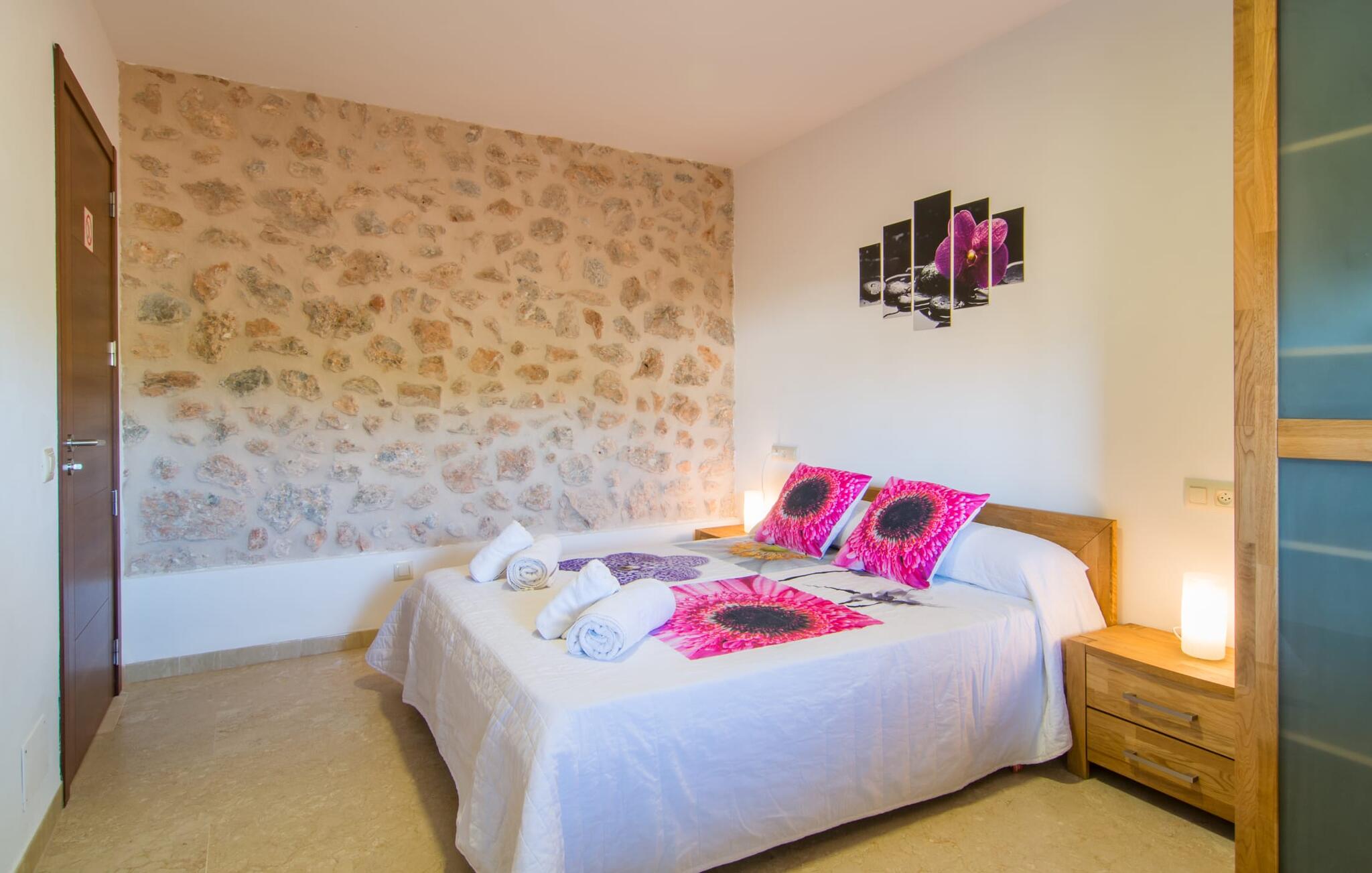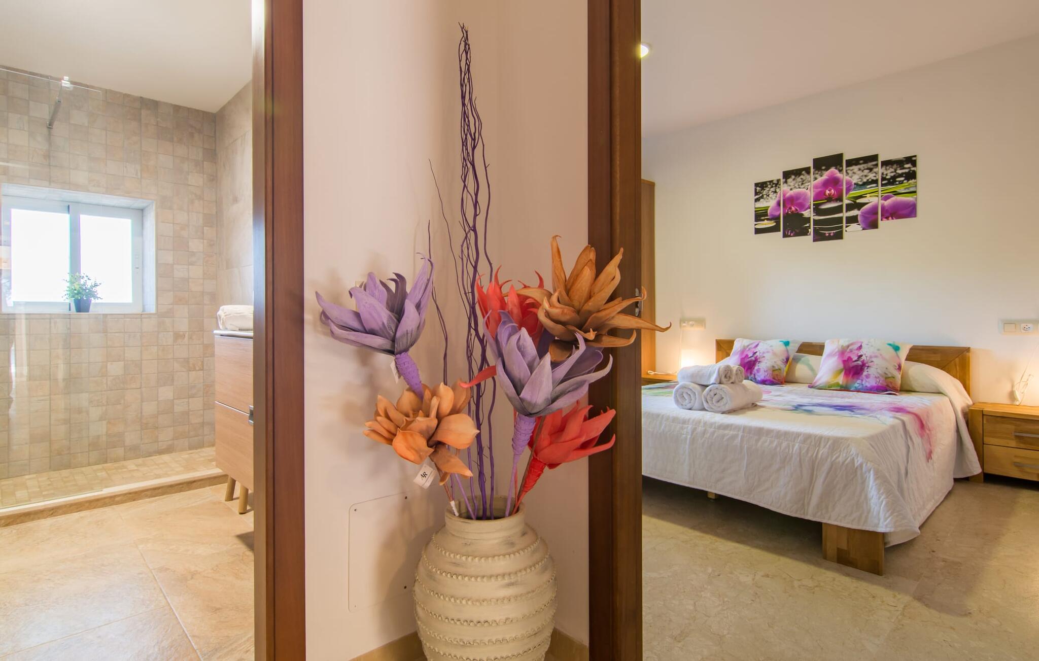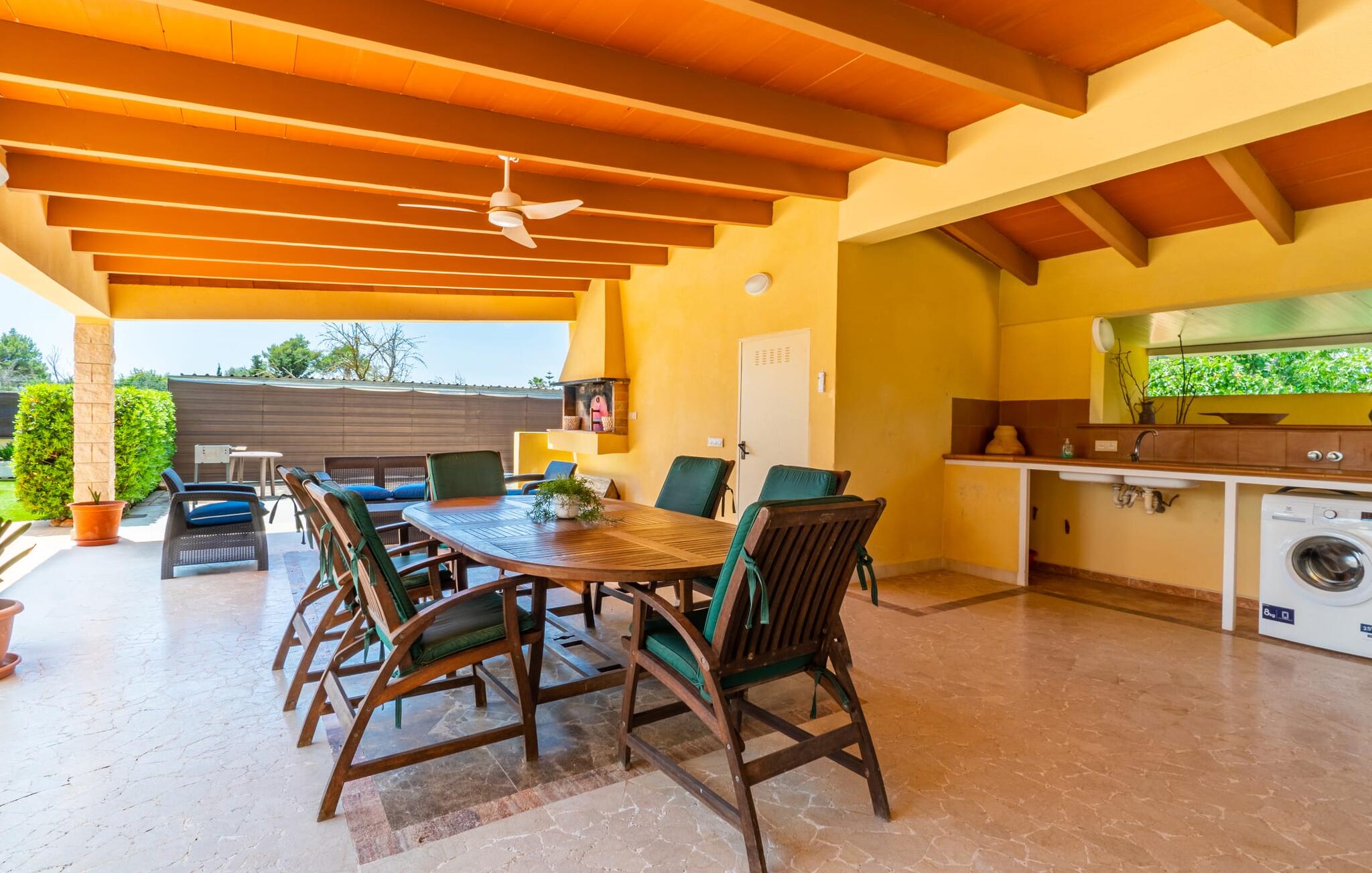 Villa Can Just schittert in zonnig geel, gecombineerd met rustiek natuursteen, vlakbij Inca in het midden van het eiland. Het nieuw gebouwde, gelijkvloerse huis heeft een uitnodigende, goed onderhouden buitenruimte. In het midden ligt het grote, rechthoekige zwembad met buitendouche, omringd door een betegeld zonneterras en een kunstgrasveld met voldoende comfortabele ligstoelen en een schaduwrijke parasol. Volledige privacy is hier gegarandeerd, en er is ook genoeg ruimte voor kinderen om te spetteren en voor volwassenen om te zwemmen. De overdekte terrassen rond het huis zijn bijzonder aantrekkelijk. Met de buitenkeuken en de buitenbadkamer verplaats je je vakantieleven bijna volledig naar buiten. Er zijn genoeg zit- en ontspanningsmogelijkheden: van gezellige loungemeubelen tot een mooie stenen bank met comfortabele kussens en een grote eettafel met bijpassende stoelen. En als je op zoek bent naar een uitdaging, kun je een potje tafeltennis spelen tegen je medereizigers aan de eigen tafel.