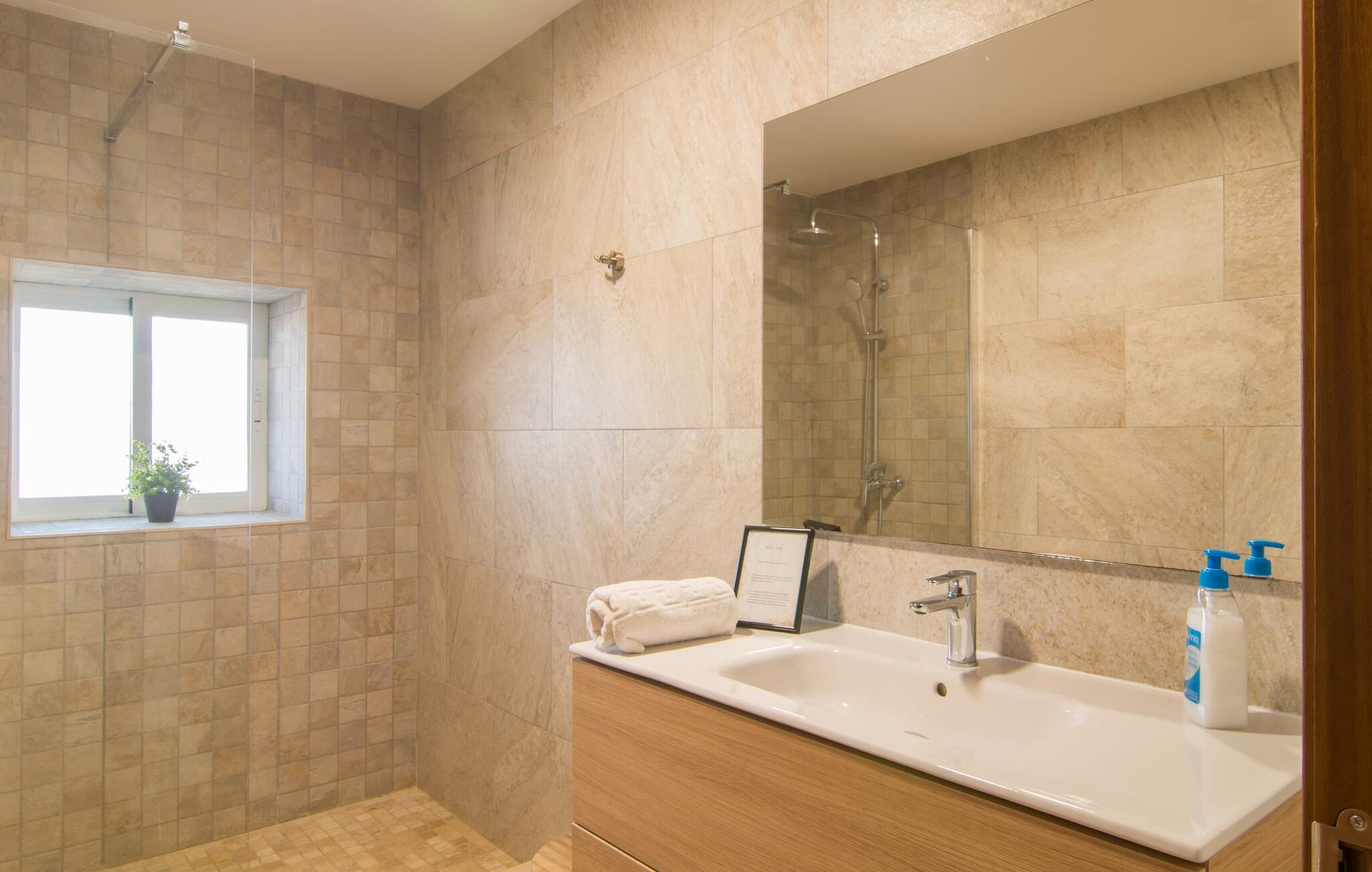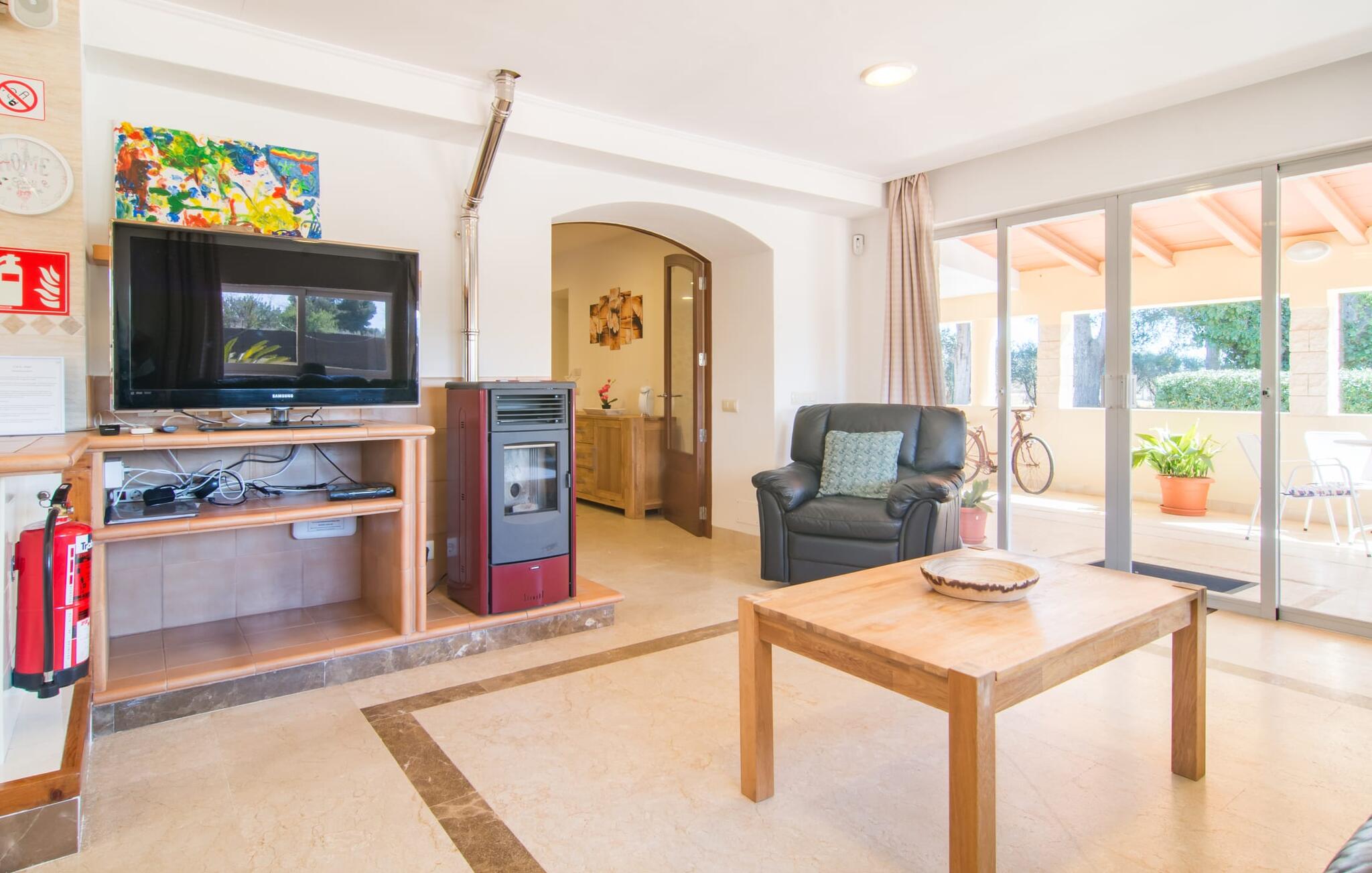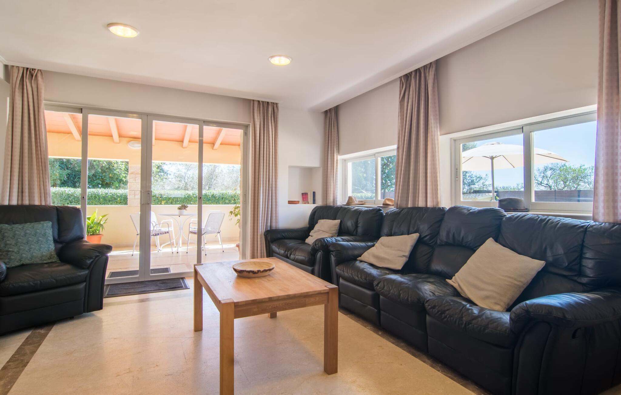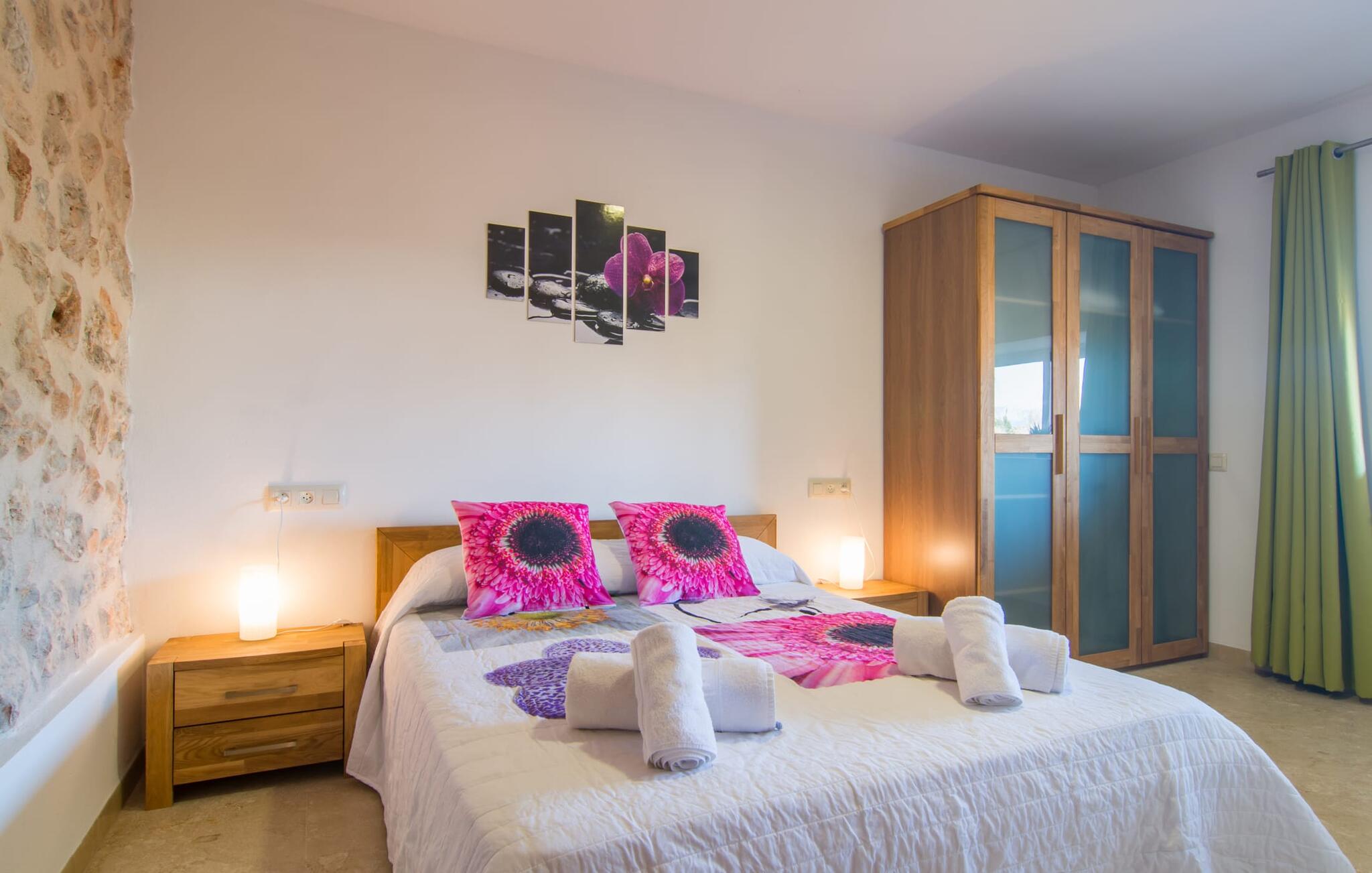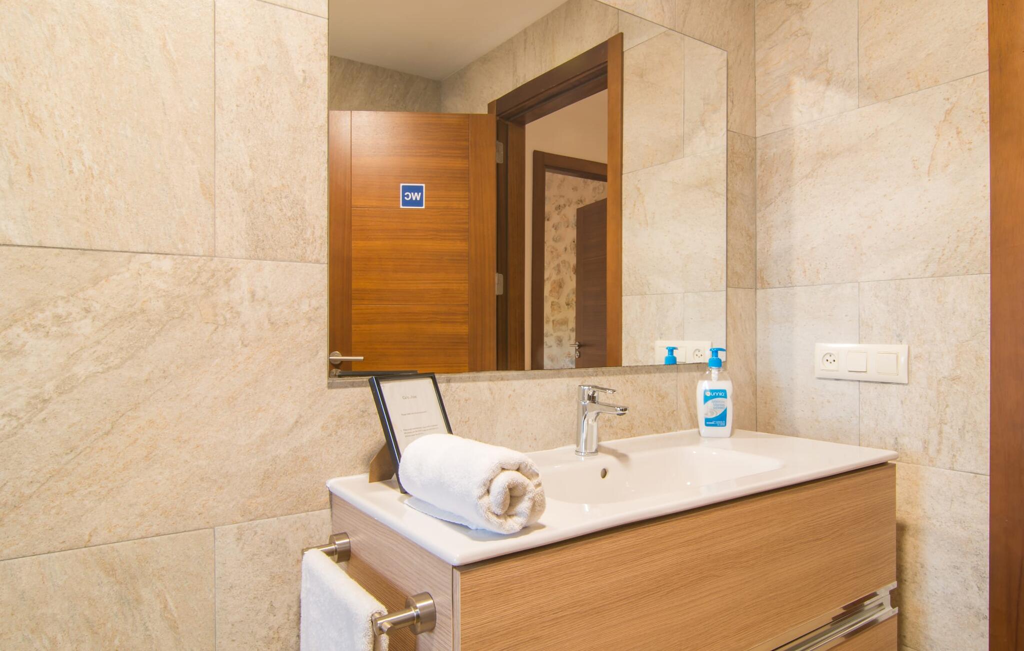Villa Can Just schittert in zonnig geel, gecombineerd met rustiek natuursteen, vlakbij Inca in het midden van het eiland. Het nieuw gebouwde, gelijkvloerse huis heeft een uitnodigende, goed onderhouden buitenruimte. In het midden ligt het grote, rechthoekige zwembad met buitendouche, omringd door een betegeld zonneterras en een kunstgrasveld met voldoende comfortabele ligstoelen en een schaduwrijke parasol. Volledige privacy is hier gegarandeerd, en er is ook genoeg ruimte voor kinderen om te spetteren en voor volwassenen om te zwemmen. De overdekte terrassen rond het huis zijn bijzonder aantrekkelijk. Met de buitenkeuken en de buitenbadkamer verplaats je je vakantieleven bijna volledig naar buiten. Er zijn genoeg zit- en ontspanningsmogelijkheden: van gezellige loungemeubelen tot een mooie stenen bank met comfortabele kussens en een grote eettafel met bijpassende stoelen. En als je op zoek bent naar een uitdaging, kun je een potje tafeltennis spelen tegen je medereizigers aan de eigen tafel.