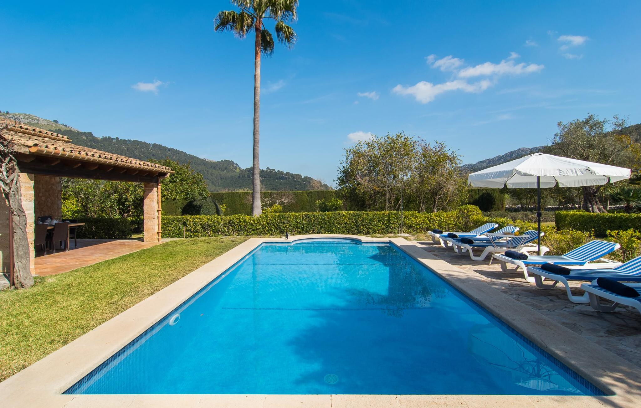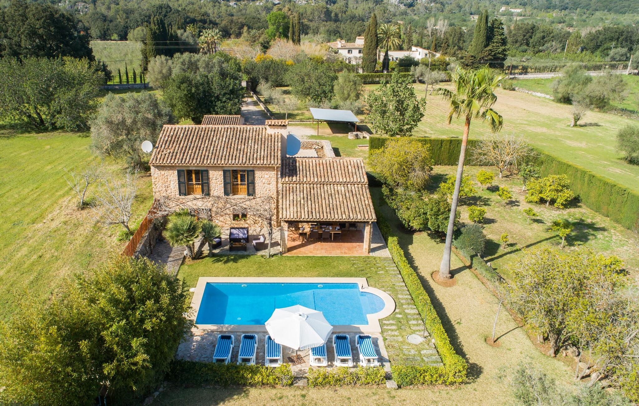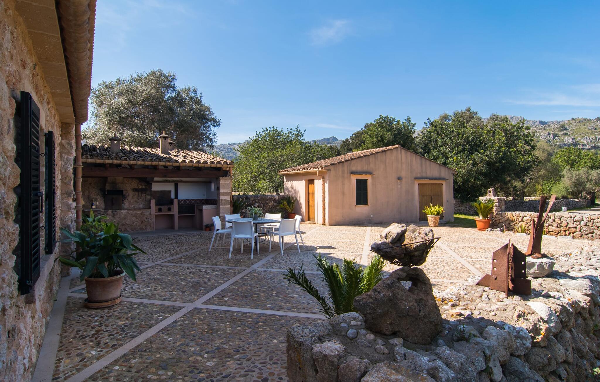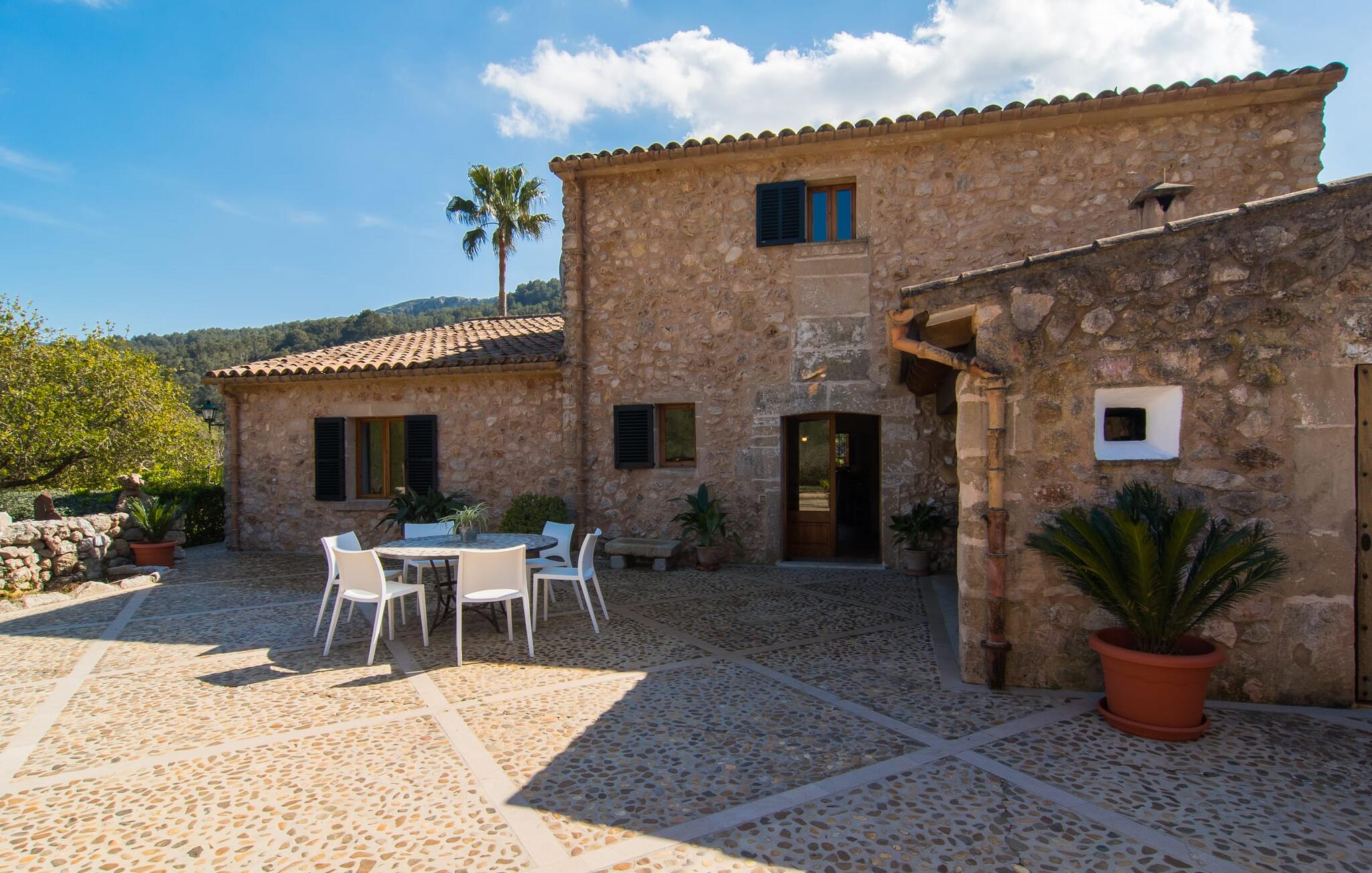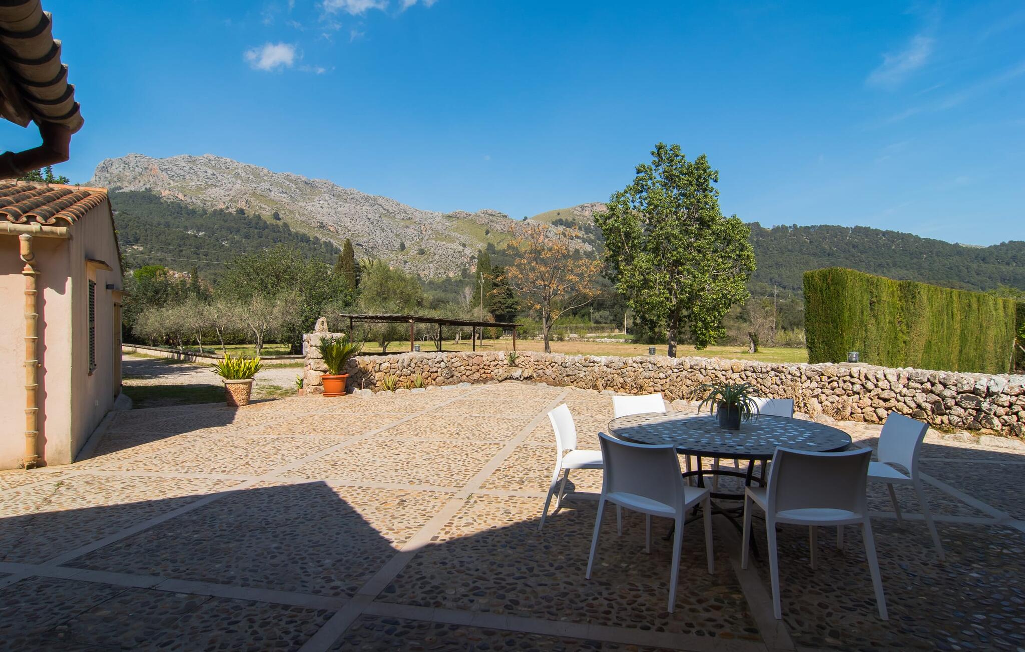 Deze boerderij in het noorden van Mallorca is een echt juweeltje en wacht op maximaal acht vakantiegangers die wat quality time willen doorbrengen in een rustige sfeer. De omgeving kan nauwelijks schilderachtiger zijn: De imposante Tramuntana bergen in de verte, een groene vlakte met weiden, velden en veel oude bomen rondom het huis - pure idylle! Dit gaat harmonieus verder op het eigen terrein van de finca, dat decoratief is omsloten door stenen muren en heggen: hier wisselen gazons en terrassen elkaar af, mediterrane planten verlevendigen met succes het totaalbeeld. Het zwembad, dat gemakkelijk te bereiken is via een Romeinse trap, ligt aangenaam dicht bij het huis en nodigt uit tot afkoelen, spetteren en zwemmen, en natuurlijk is er een praktische buitendouche. Er zijn comfortabele ligstoelen om te zonnebaden en een overdekt terras met zithoek en eettafel met uitzicht op het zwembad, de tuin en de bergen. Aan de andere kant van het huis biedt een ander groot terras de mogelijkheid om onder de open hemel te zitten of gebruik te maken van de prachtige faciliteiten van de buitenkeuken om buiten je vakantielekkernijen te bereiden en ervan te genieten.