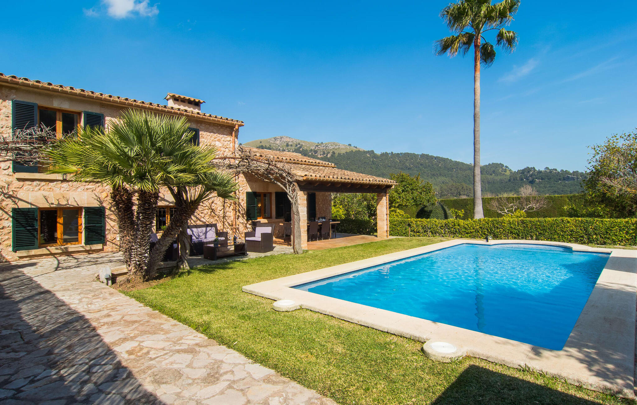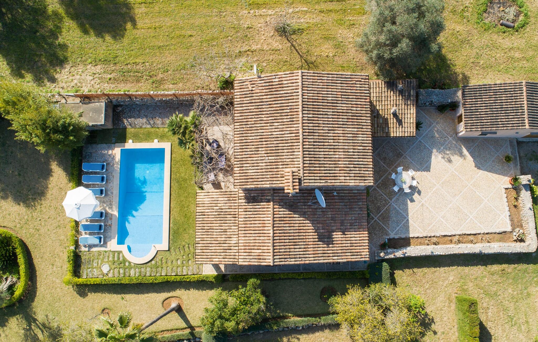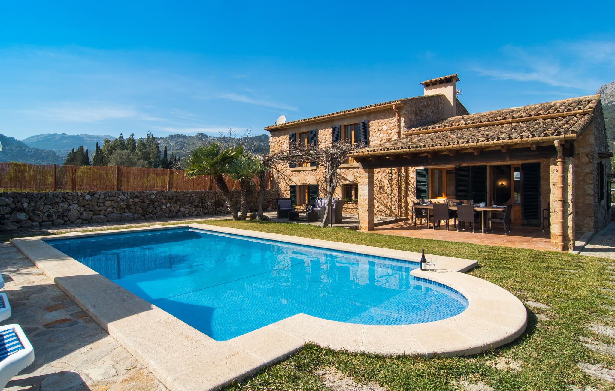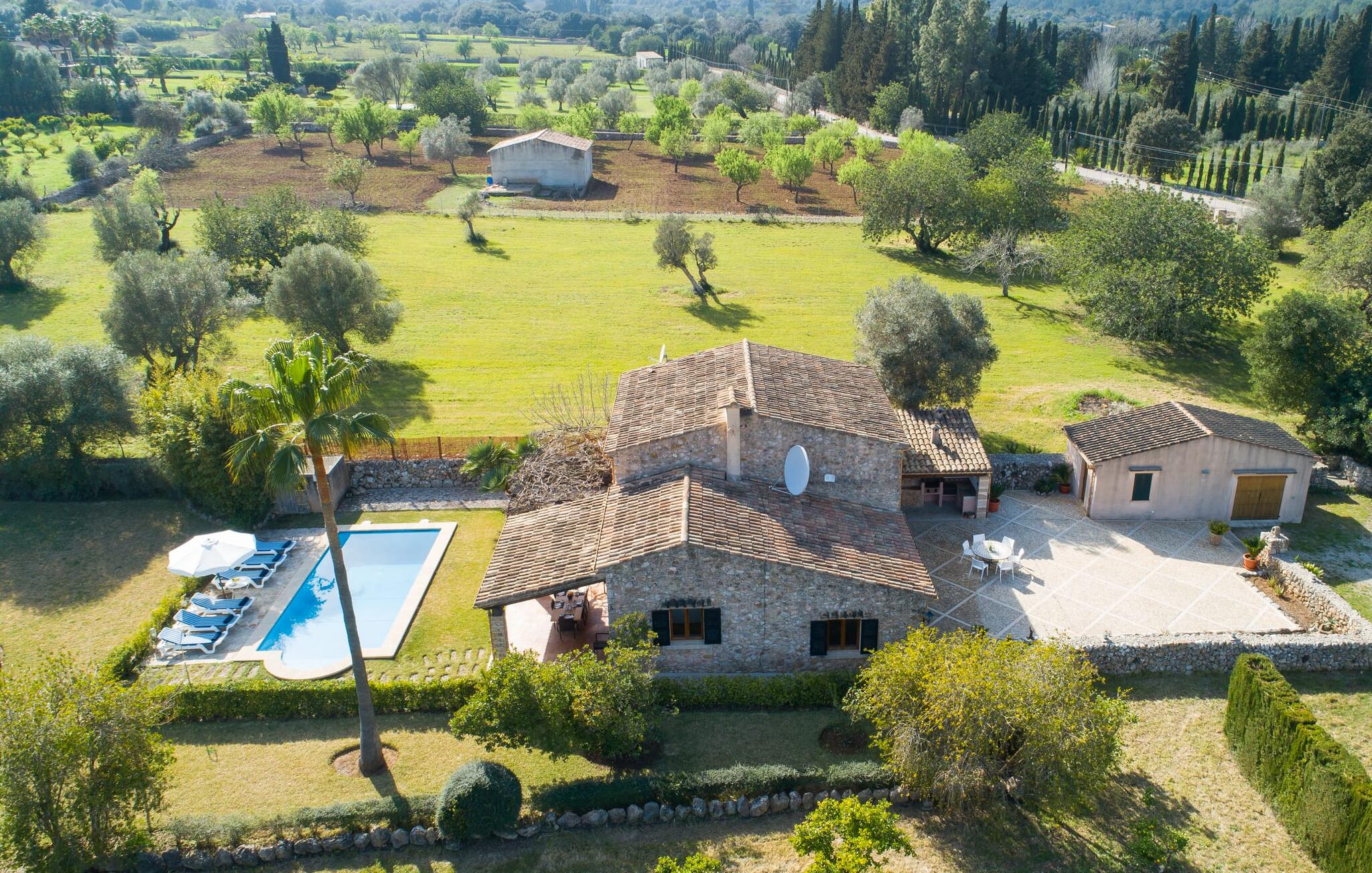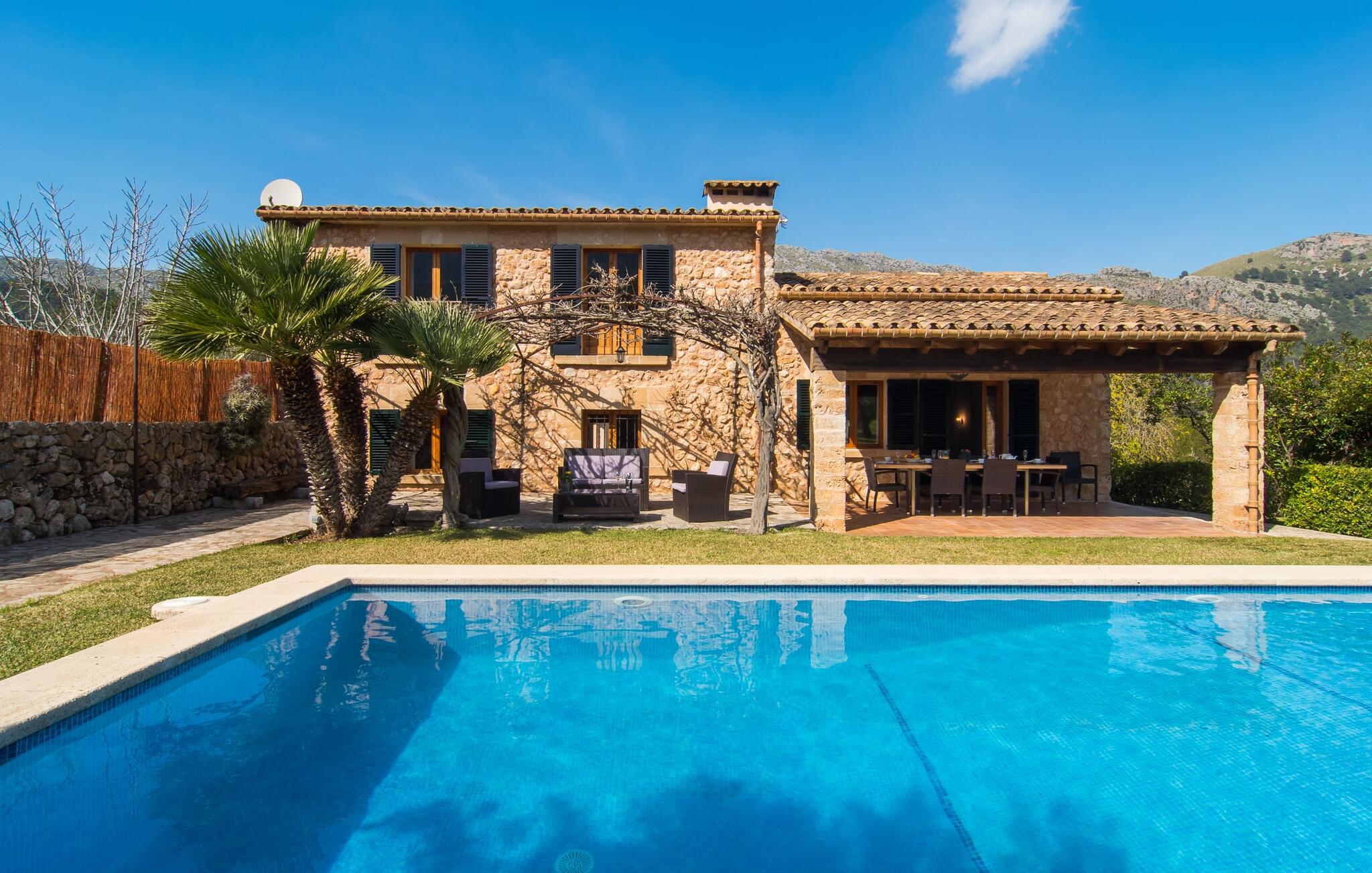 Deze boerderij in het noorden van Mallorca is een echt juweeltje en wacht op maximaal acht vakantiegangers die wat quality time willen doorbrengen in een rustige sfeer. De omgeving kan nauwelijks schilderachtiger zijn: De imposante Tramuntana bergen in de verte, een groene vlakte met weiden, velden en veel oude bomen rondom het huis - pure idylle! Dit gaat harmonieus verder op het eigen terrein van de finca, dat decoratief is omsloten door stenen muren en heggen: hier wisselen gazons en terrassen elkaar af, mediterrane planten verlevendigen met succes het totaalbeeld. Het zwembad, dat gemakkelijk te bereiken is via een Romeinse trap, ligt aangenaam dicht bij het huis en nodigt uit tot afkoelen, spetteren en zwemmen, en natuurlijk is er een praktische buitendouche. Er zijn comfortabele ligstoelen om te zonnebaden en een overdekt terras met zithoek en eettafel met uitzicht op het zwembad, de tuin en de bergen. Aan de andere kant van het huis biedt een ander groot terras de mogelijkheid om onder de open hemel te zitten of gebruik te maken van de prachtige faciliteiten van de buitenkeuken om buiten je vakantielekkernijen te bereiden en ervan te genieten.