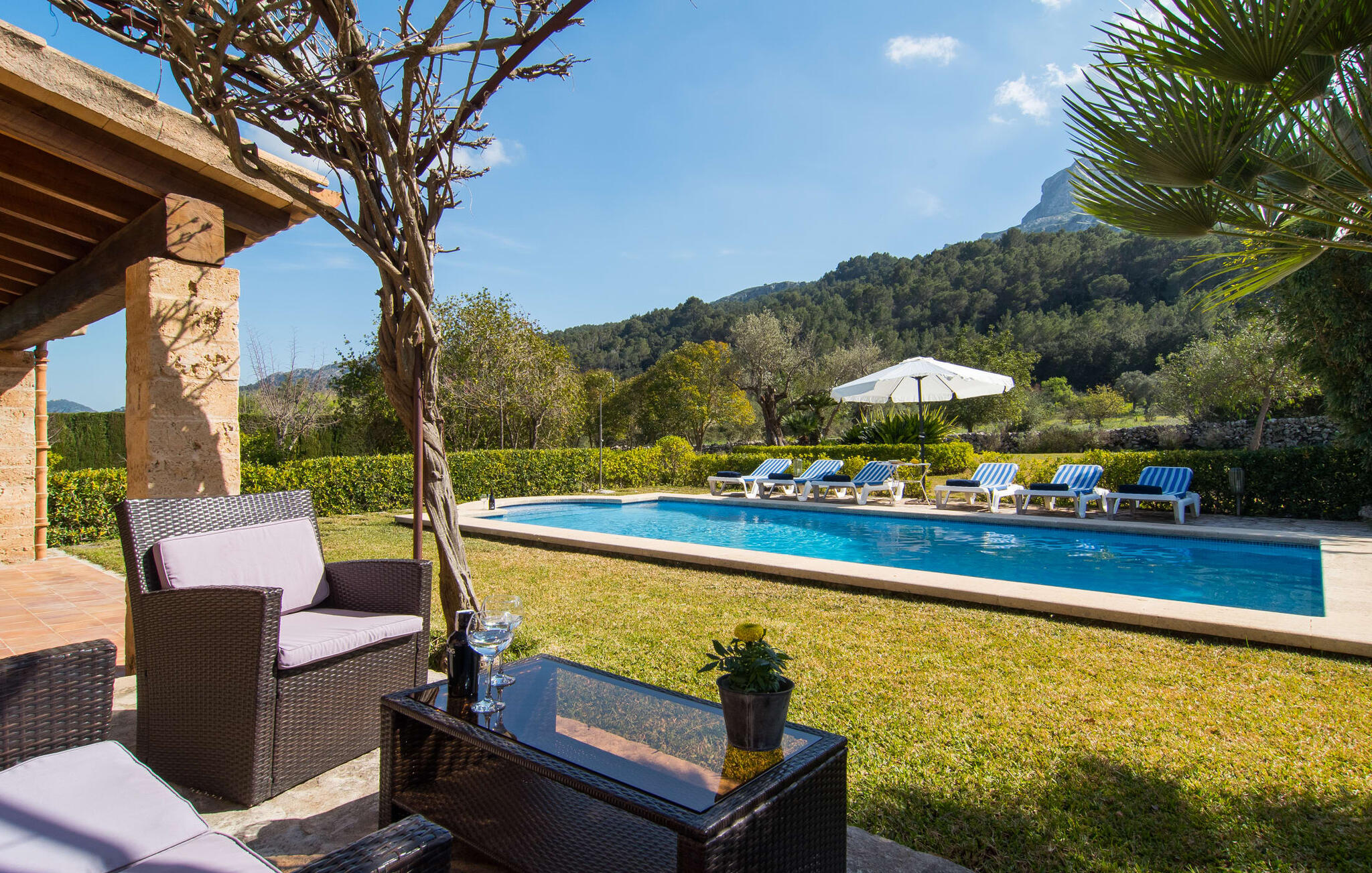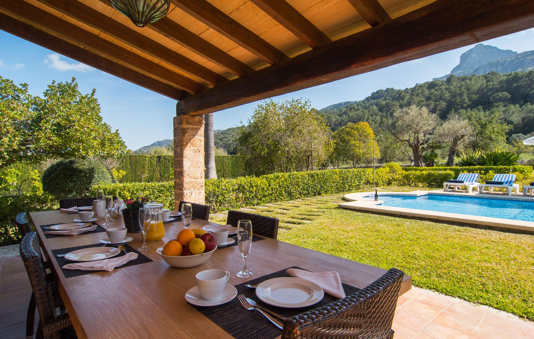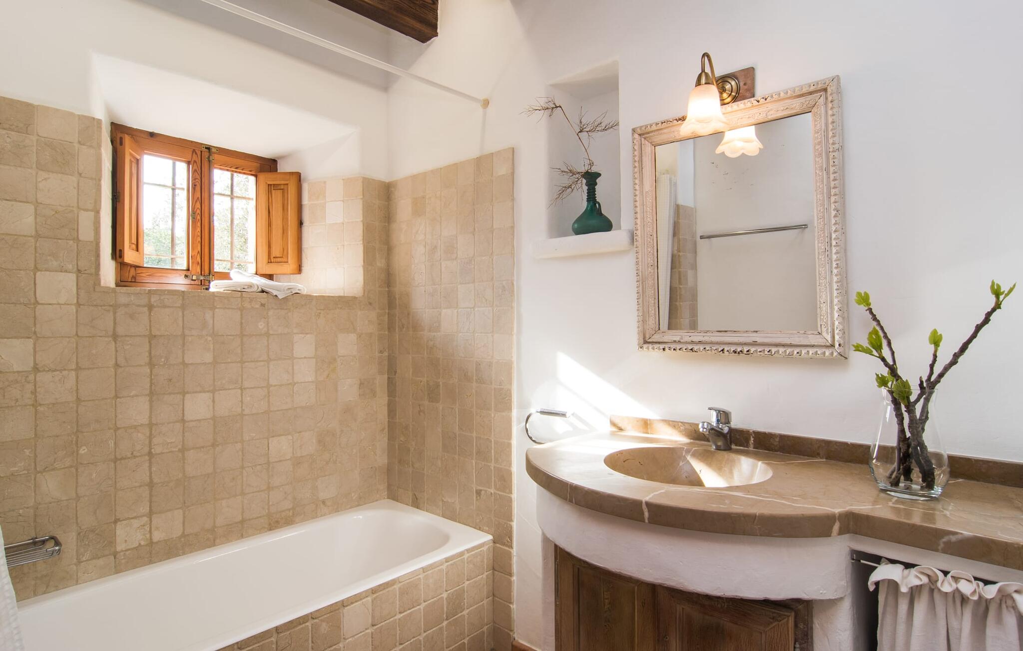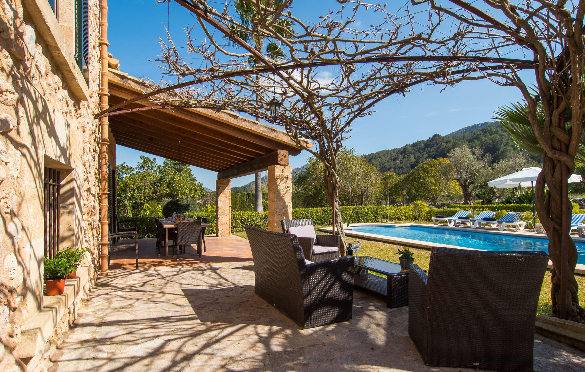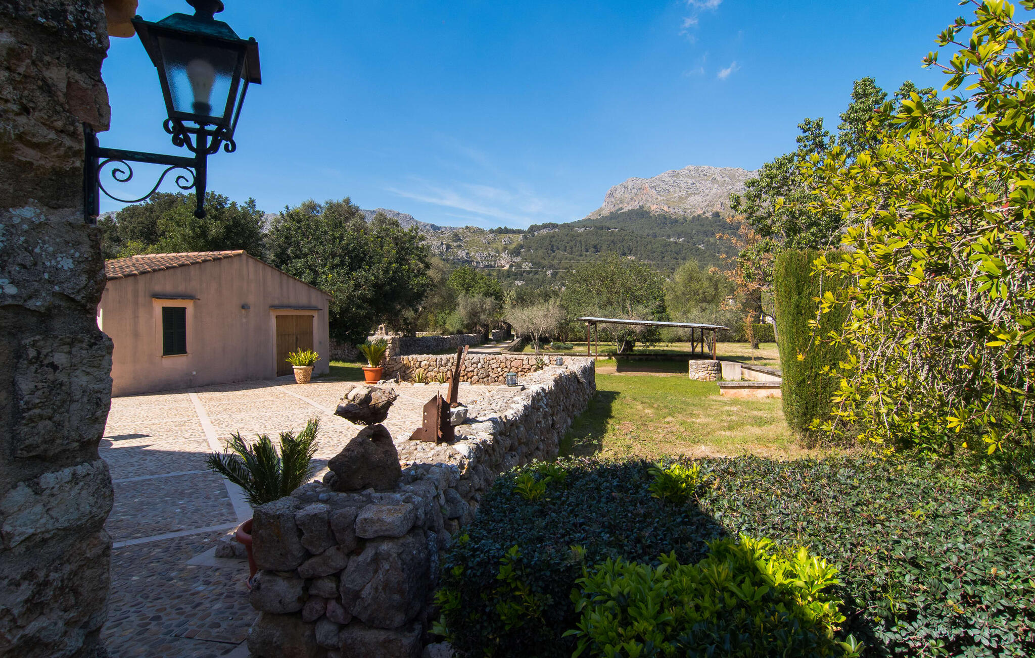 Deze boerderij in het noorden van Mallorca is een echt juweeltje en wacht op maximaal acht vakantiegangers die wat quality time willen doorbrengen in een rustige sfeer. De omgeving kan nauwelijks schilderachtiger zijn: De imposante Tramuntana bergen in de verte, een groene vlakte met weiden, velden en veel oude bomen rondom het huis - pure idylle! Dit gaat harmonieus verder op het eigen terrein van de finca, dat decoratief is omsloten door stenen muren en heggen: hier wisselen gazons en terrassen elkaar af, mediterrane planten verlevendigen met succes het totaalbeeld. Het zwembad, dat gemakkelijk te bereiken is via een Romeinse trap, ligt aangenaam dicht bij het huis en nodigt uit tot afkoelen, spetteren en zwemmen, en natuurlijk is er een praktische buitendouche. Er zijn comfortabele ligstoelen om te zonnebaden en een overdekt terras met zithoek en eettafel met uitzicht op het zwembad, de tuin en de bergen. Aan de andere kant van het huis biedt een ander groot terras de mogelijkheid om onder de open hemel te zitten of gebruik te maken van de prachtige faciliteiten van de buitenkeuken om buiten je vakantielekkernijen te bereiden en ervan te genieten.