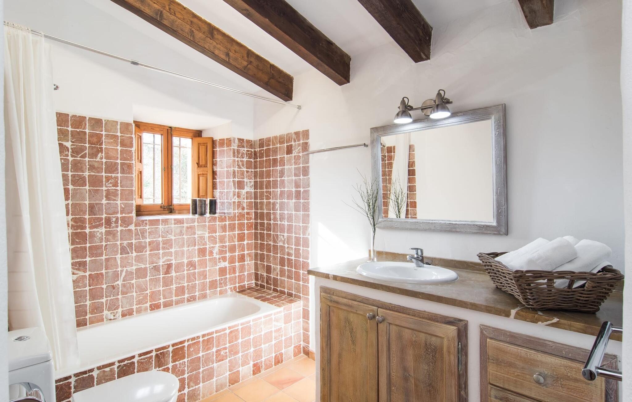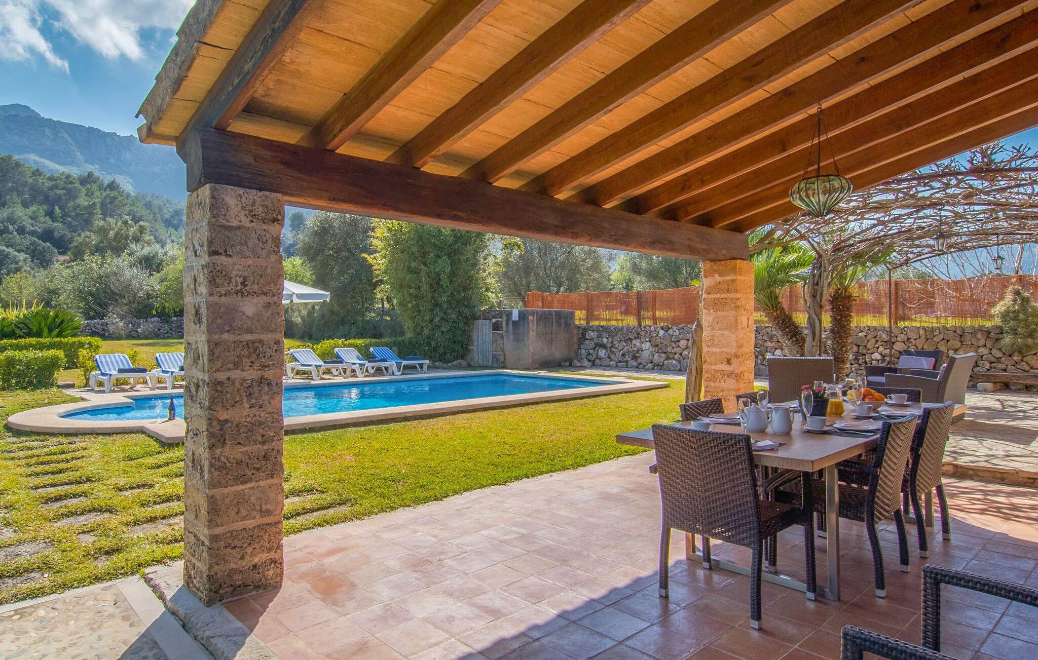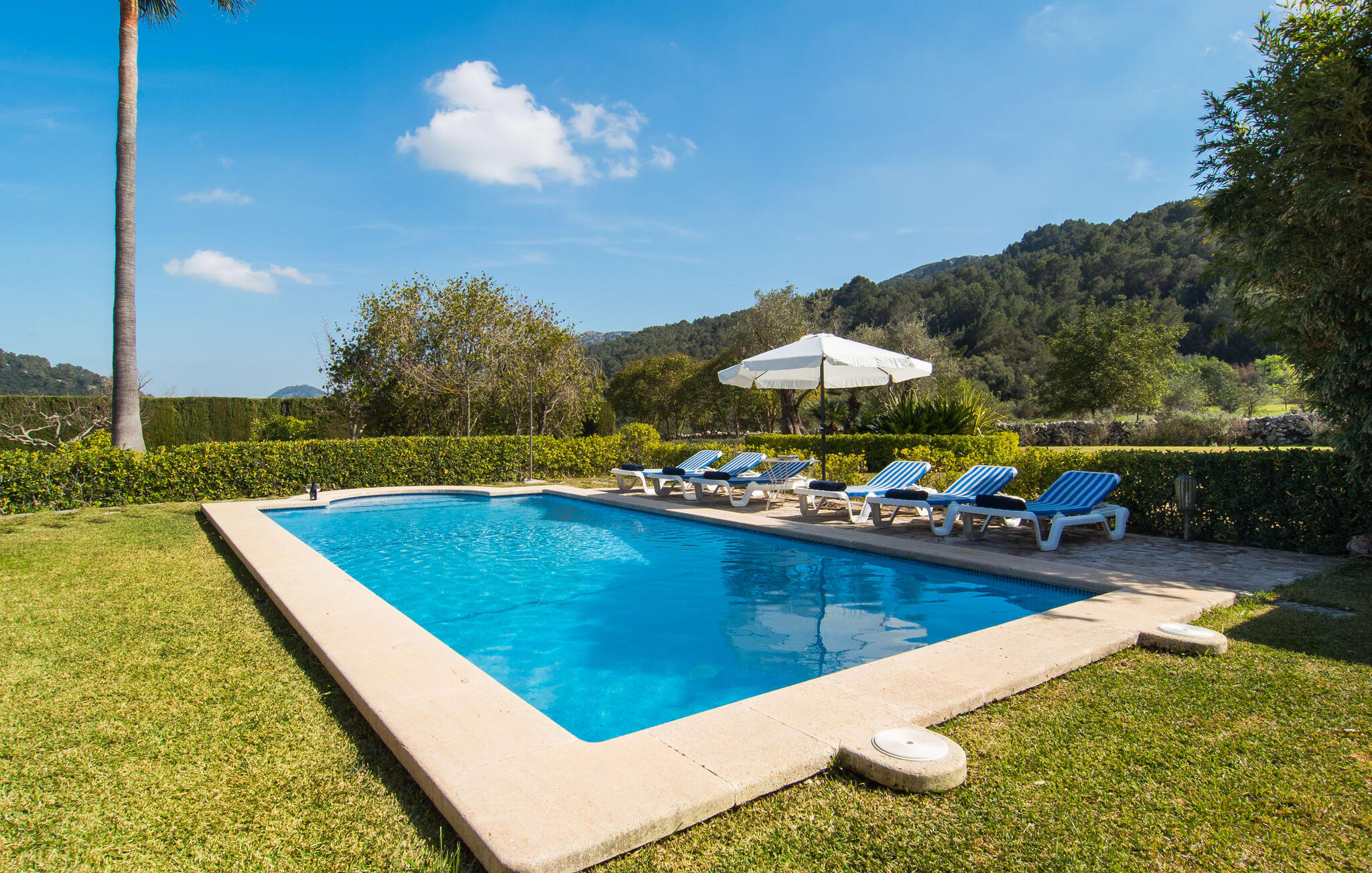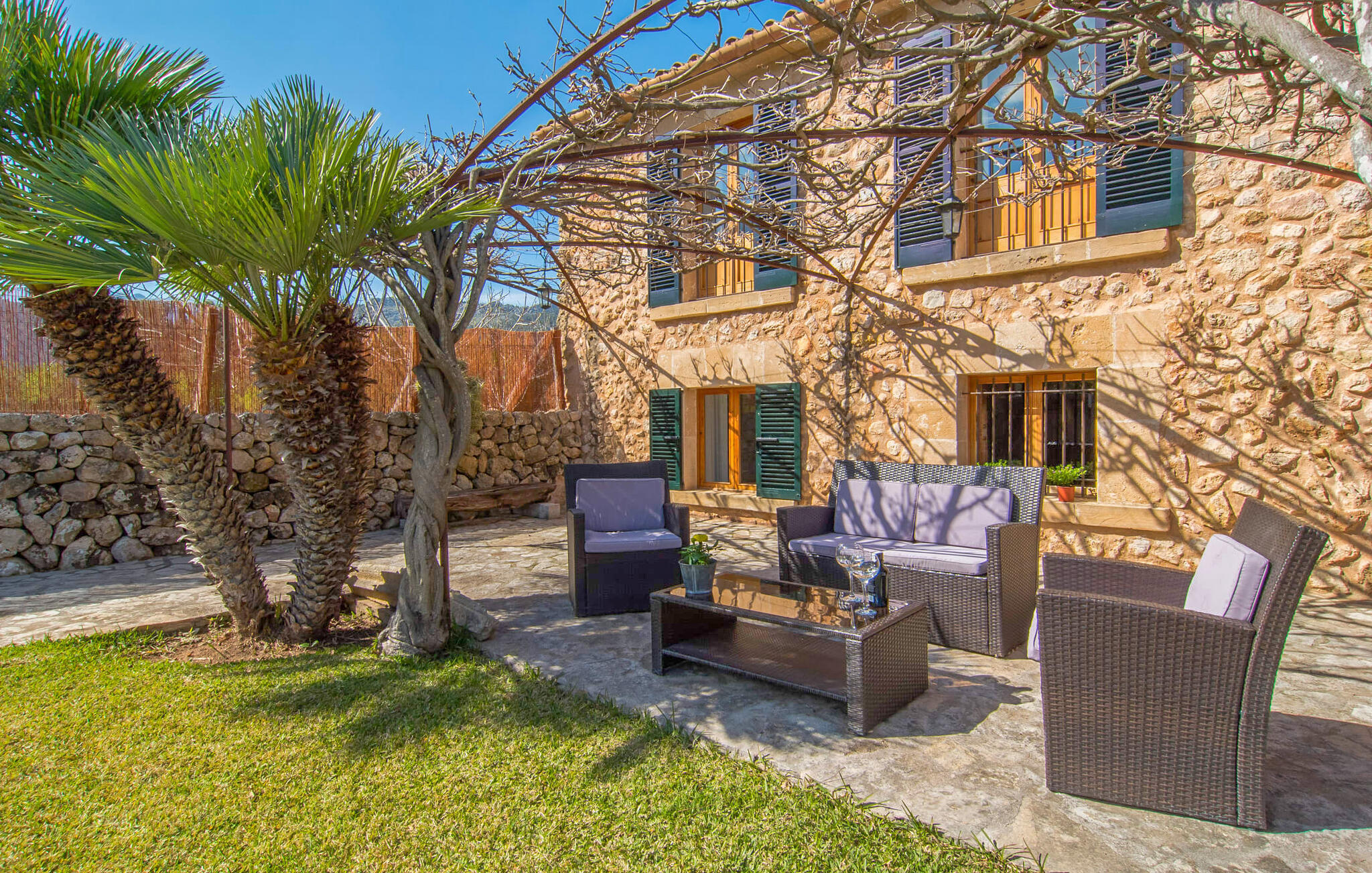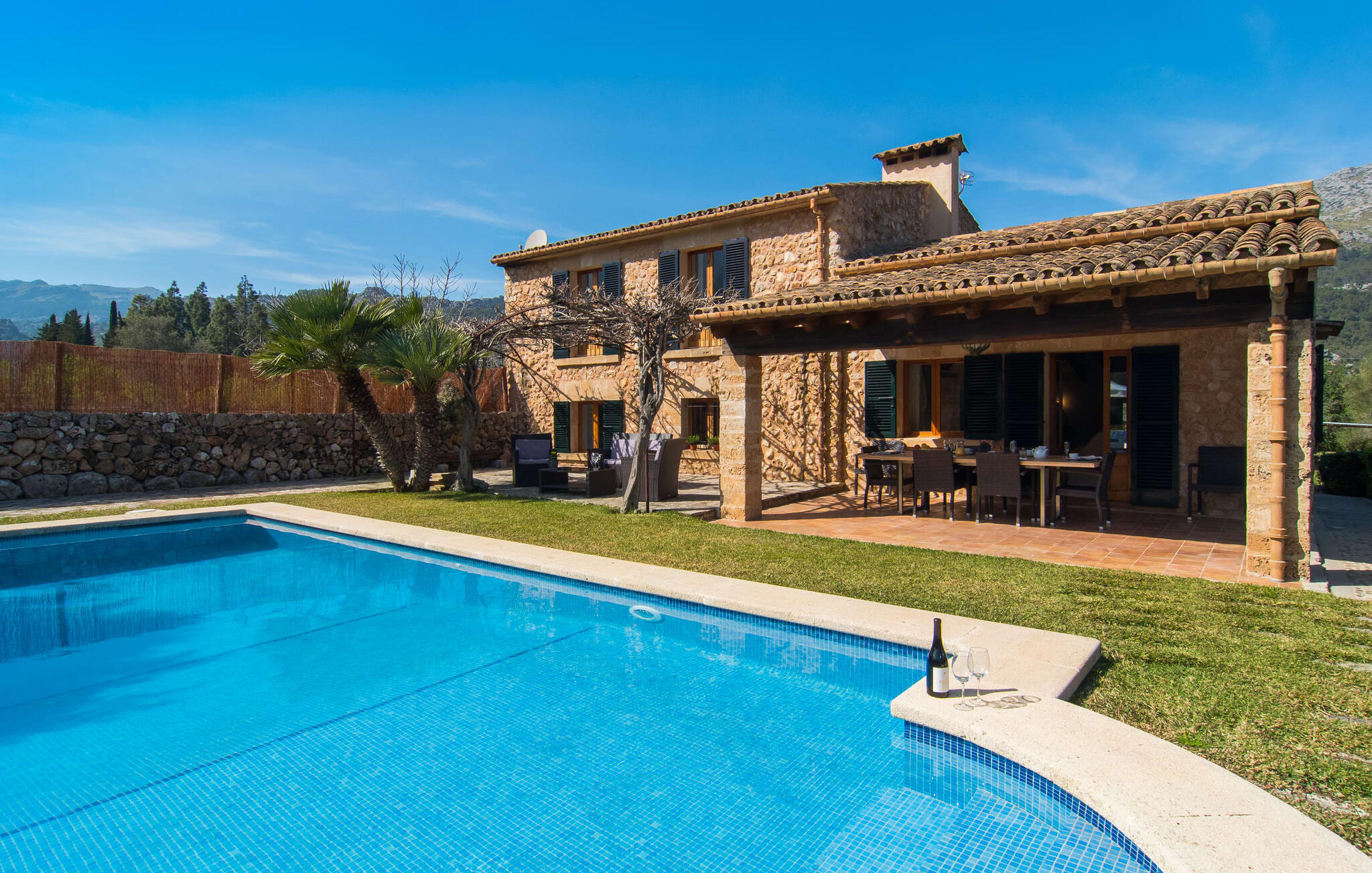 Deze boerderij in het noorden van Mallorca is een echt juweeltje en wacht op maximaal acht vakantiegangers die wat quality time willen doorbrengen in een rustige sfeer. De omgeving kan nauwelijks schilderachtiger zijn: De imposante Tramuntana bergen in de verte, een groene vlakte met weiden, velden en veel oude bomen rondom het huis - pure idylle! Dit gaat harmonieus verder op het eigen terrein van de finca, dat decoratief is omsloten door stenen muren en heggen: hier wisselen gazons en terrassen elkaar af, mediterrane planten verlevendigen met succes het totaalbeeld. Het zwembad, dat gemakkelijk te bereiken is via een Romeinse trap, ligt aangenaam dicht bij het huis en nodigt uit tot afkoelen, spetteren en zwemmen, en natuurlijk is er een praktische buitendouche. Er zijn comfortabele ligstoelen om te zonnebaden en een overdekt terras met zithoek en eettafel met uitzicht op het zwembad, de tuin en de bergen. Aan de andere kant van het huis biedt een ander groot terras de mogelijkheid om onder de open hemel te zitten of gebruik te maken van de prachtige faciliteiten van de buitenkeuken om buiten je vakantielekkernijen te bereiden en ervan te genieten.