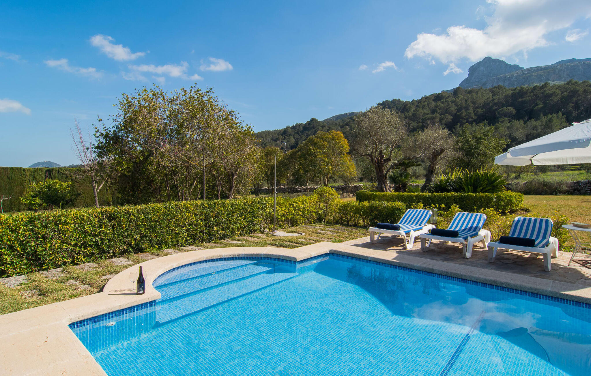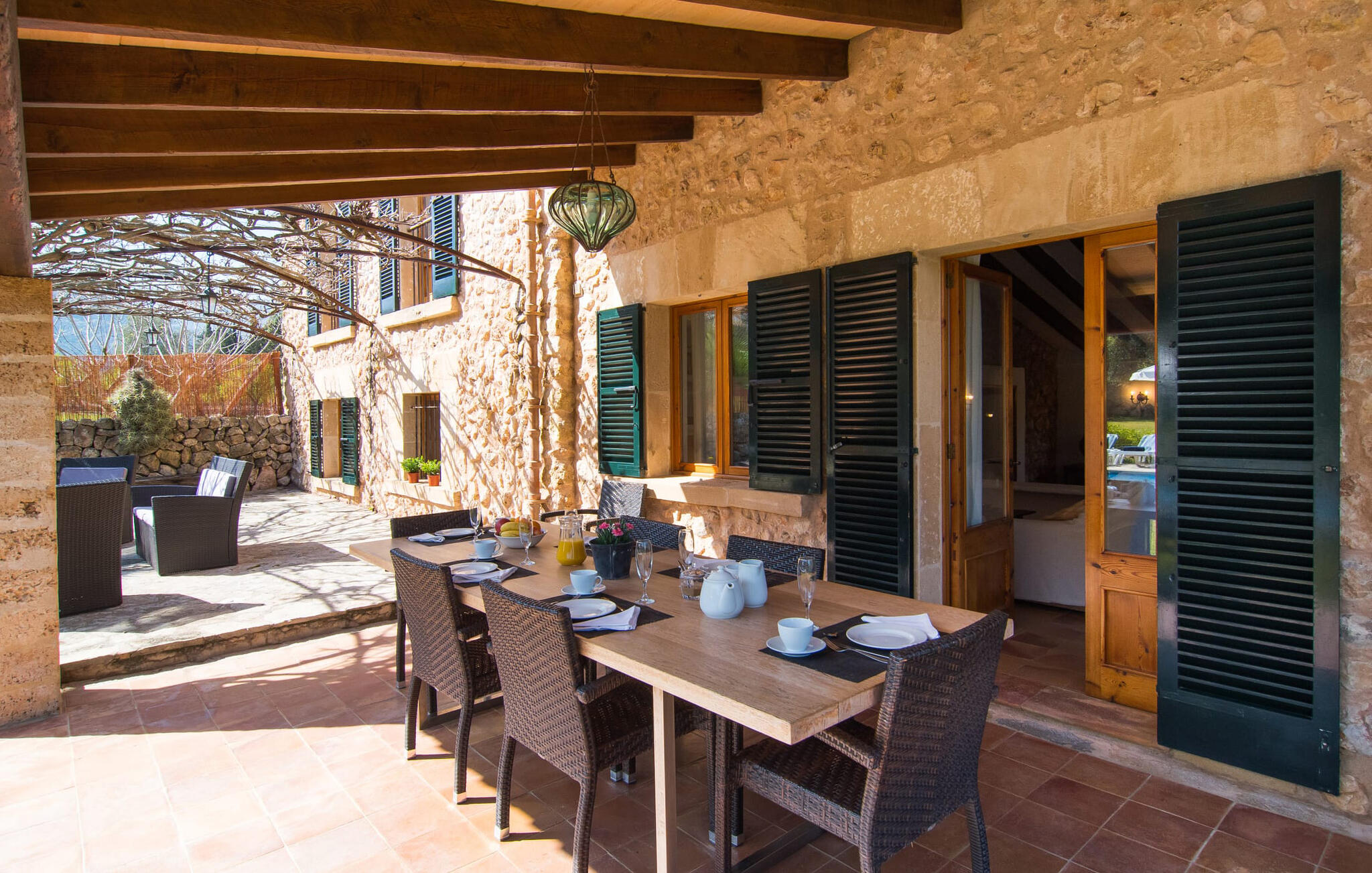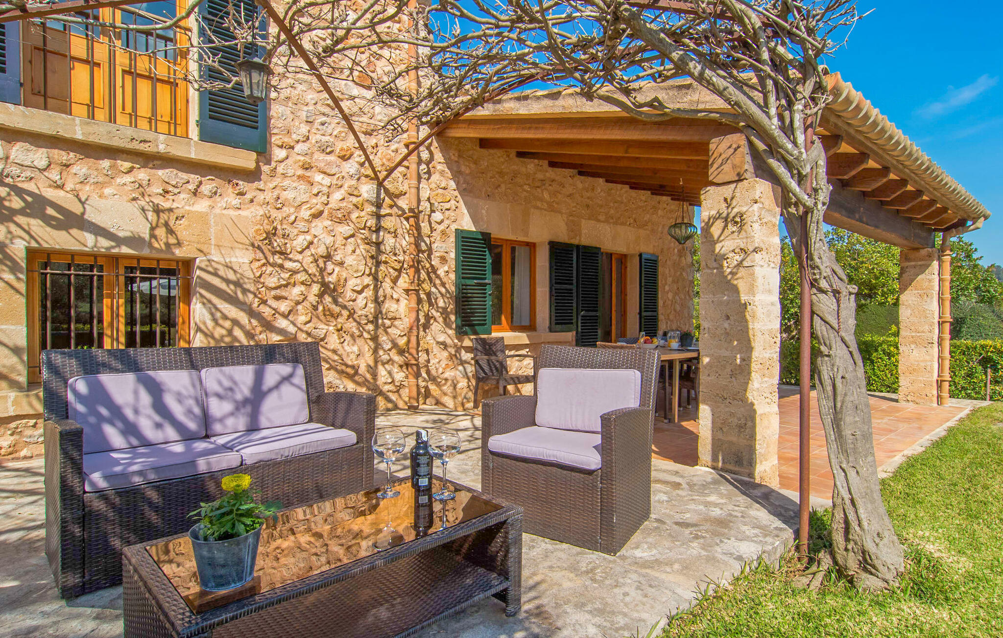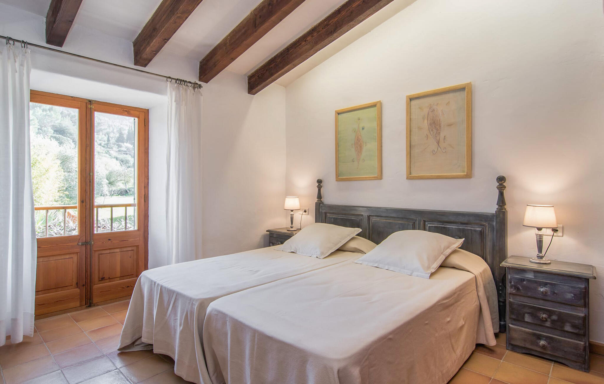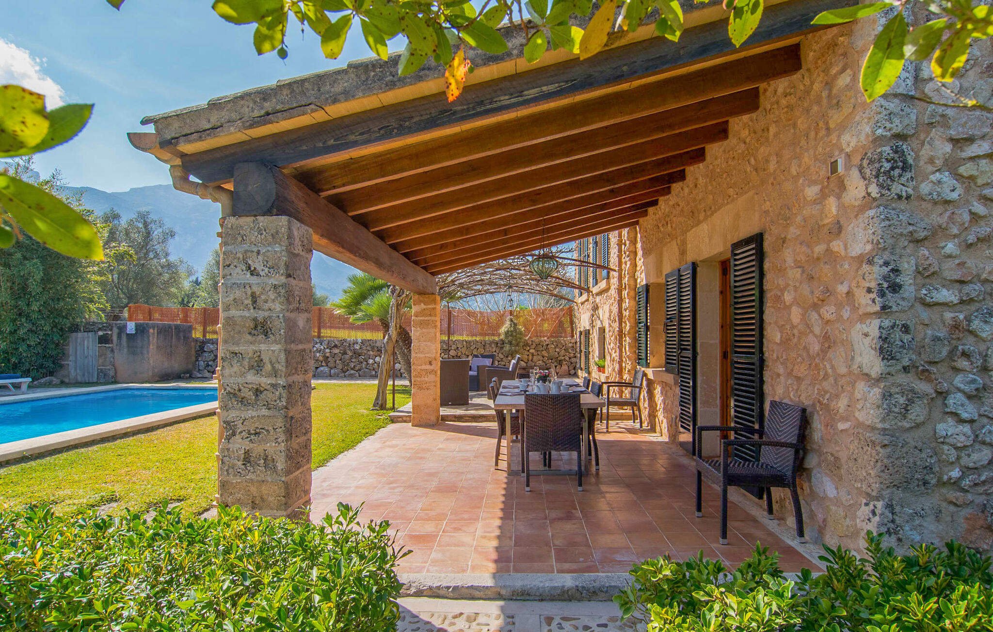Deze boerderij in het noorden van Mallorca is een echt juweeltje en wacht op maximaal acht vakantiegangers die wat quality time willen doorbrengen in een rustige sfeer. De omgeving kan nauwelijks schilderachtiger zijn: De imposante Tramuntana bergen in de verte, een groene vlakte met weiden, velden en veel oude bomen rondom het huis - pure idylle! Dit gaat harmonieus verder op het eigen terrein van de finca, dat decoratief is omsloten door stenen muren en heggen: hier wisselen gazons en terrassen elkaar af, mediterrane planten verlevendigen met succes het totaalbeeld. Het zwembad, dat gemakkelijk te bereiken is via een Romeinse trap, ligt aangenaam dicht bij het huis en nodigt uit tot afkoelen, spetteren en zwemmen, en natuurlijk is er een praktische buitendouche. Er zijn comfortabele ligstoelen om te zonnebaden en een overdekt terras met zithoek en eettafel met uitzicht op het zwembad, de tuin en de bergen. Aan de andere kant van het huis biedt een ander groot terras de mogelijkheid om onder de open hemel te zitten of gebruik te maken van de prachtige faciliteiten van de buitenkeuken om buiten je vakantielekkernijen te bereiden en ervan te genieten.
