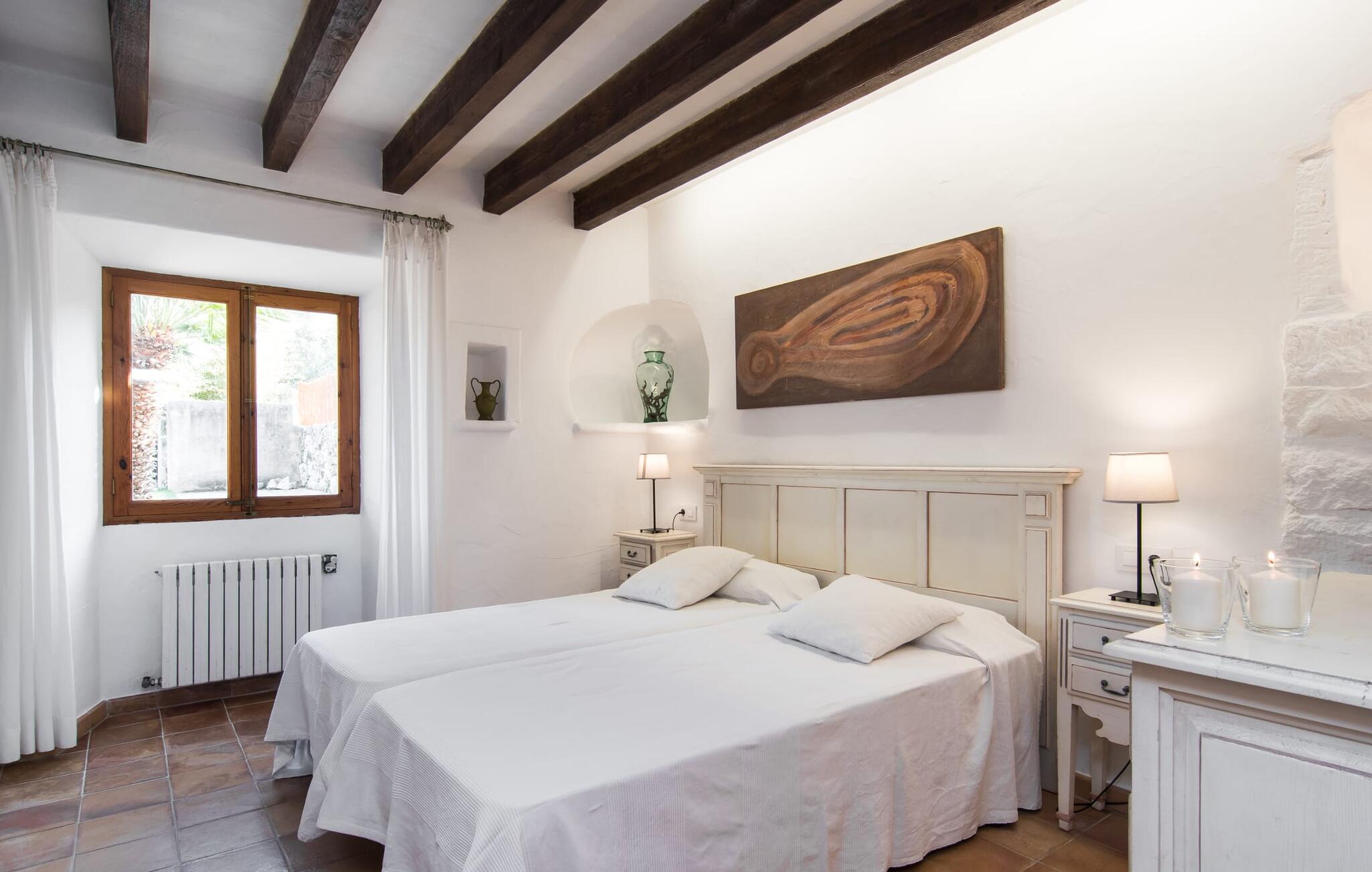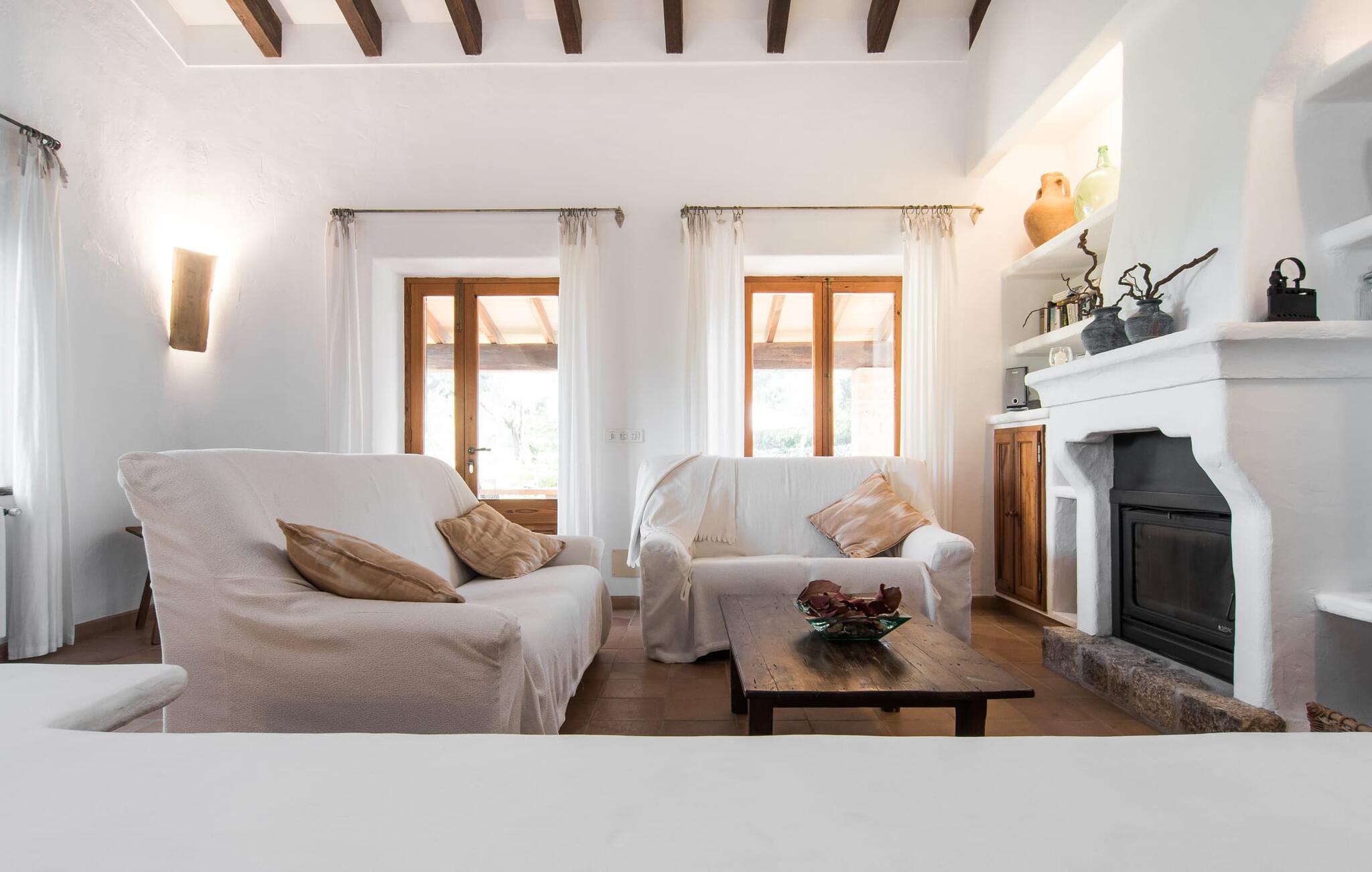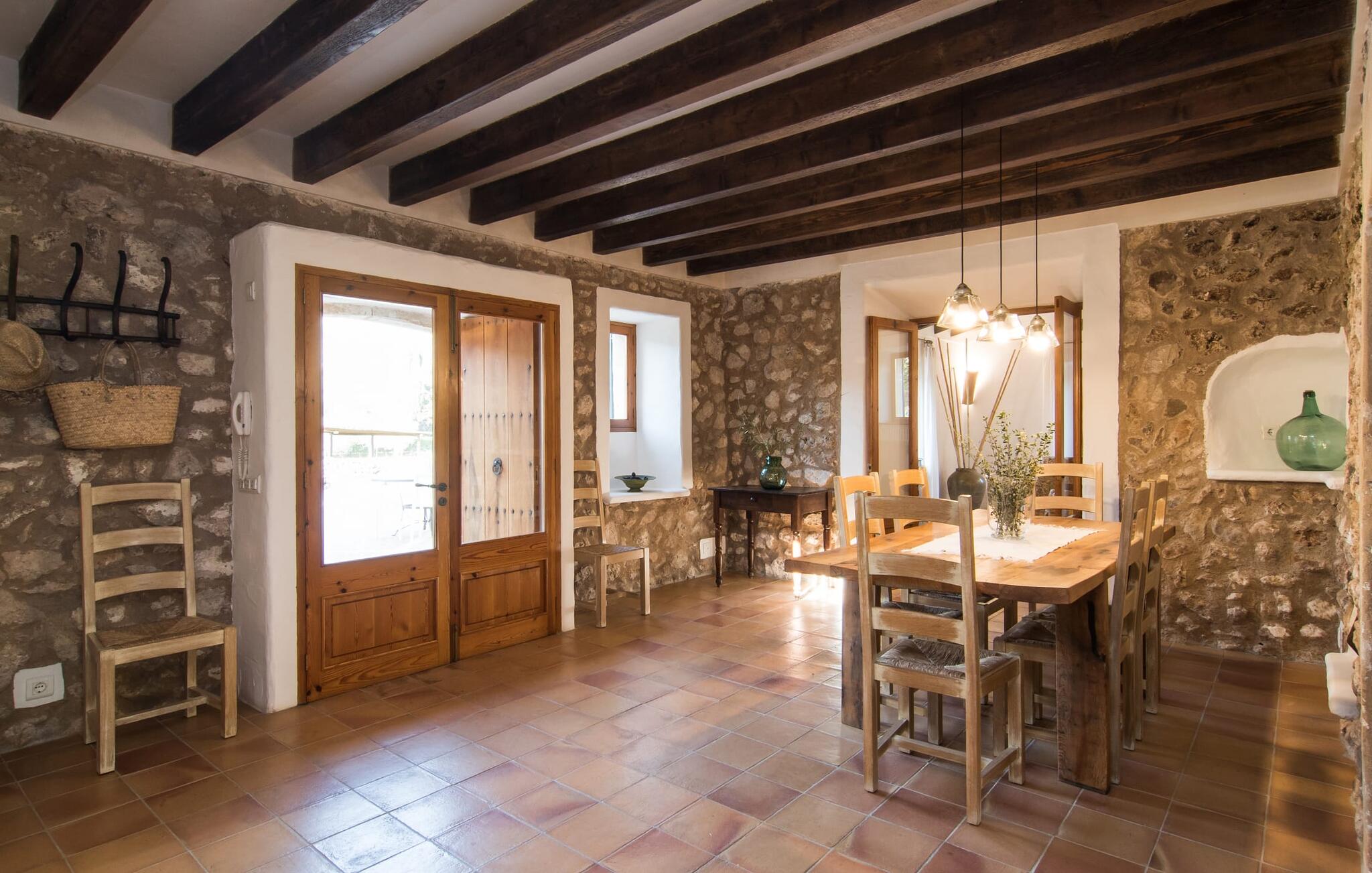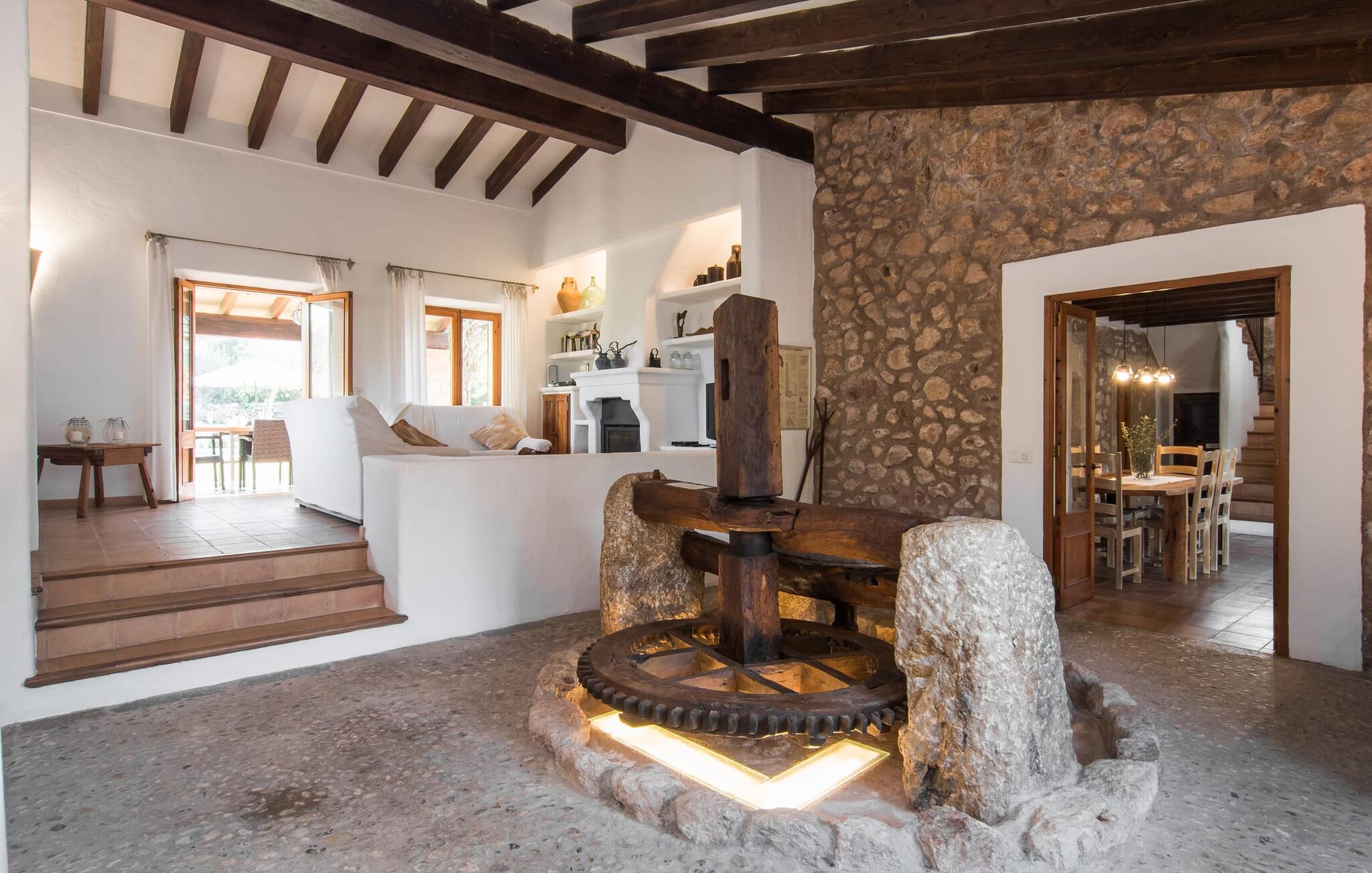 Het interieur van Can Peric wordt gekenmerkt door een verzorgde, uitnodigend lichte landhuisambiance. Direct naast het terras is een gezellige, gedeeltelijk uit bakstenen opgetrokken woonkamer met comfortabele banken, een tv en een gezellige open haard. Een paar treden leiden naar de traditioneel gelegde vloer met natuurlijke kiezels rond de oude, oorspronkelijk verlichte molensteen, die getuigt van de geschiedenis van het huis en een bijzondere blikvanger is. Je kunt binnen dineren aan de aangrenzende eettafel in de rustieke sfeer van de natuurstenen muren. Handig is dat de volledig uitgeruste keuken om de hoek ligt. Er is ook een slaapkamer met een tweepersoonsbed en een badkamer op dit woonniveau. Boven zijn er twee slaapkamers met tweepersoonsbedden, een slaapkamer met twee eenpersoonsbedden en twee badkamers. Alle slaapkamers hebben lichte kleuren en veel hout om een zeer gezellige sfeer te creëren, de beste voorwaarde om aangename nachten door te brengen in dit rustige gebied. Dit prachtige vakantiehuis op Mallorca, dat ongeveer 8 km ten westen van het pittoreske dorpje Pollenca ligt, scoort niet alleen punten met zijn prachtige, rustige ligging. Je kunt je dagelijkse boodschappen in het dorp doen. Het uitnodigende strand Platja de Port de Pollença ligt op ongeveer 11 km afstand en de populaire stad Alcúdia bereik je in iets meer dan 20 minuten met de auto.