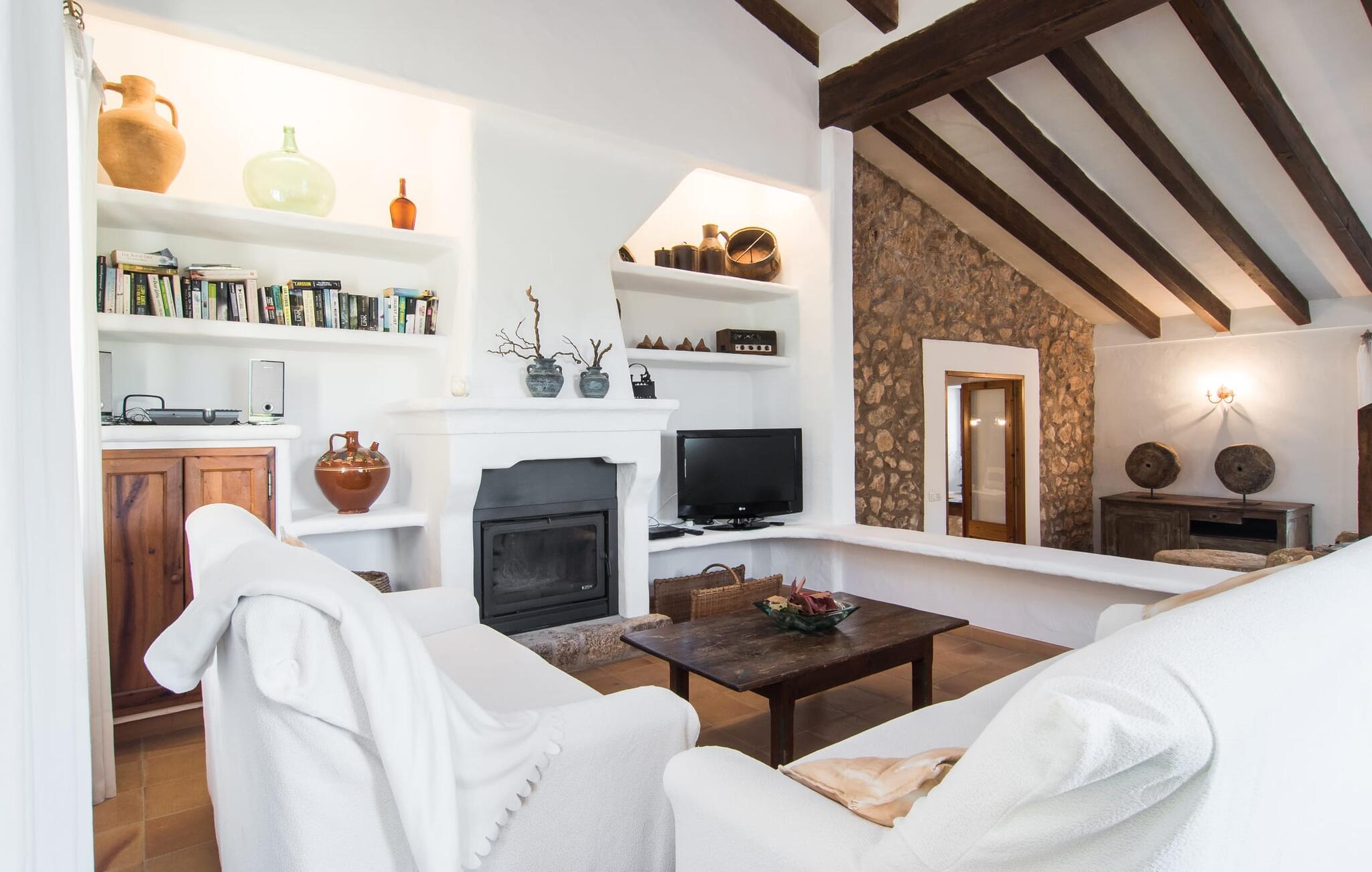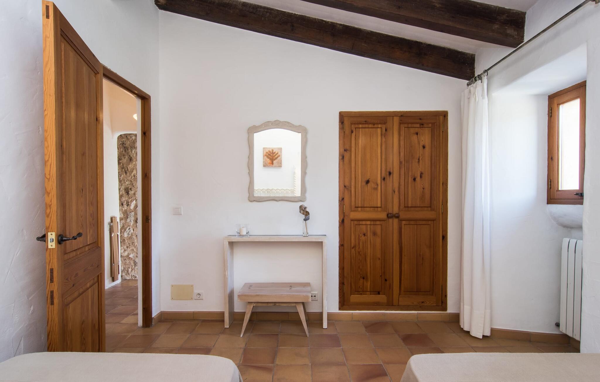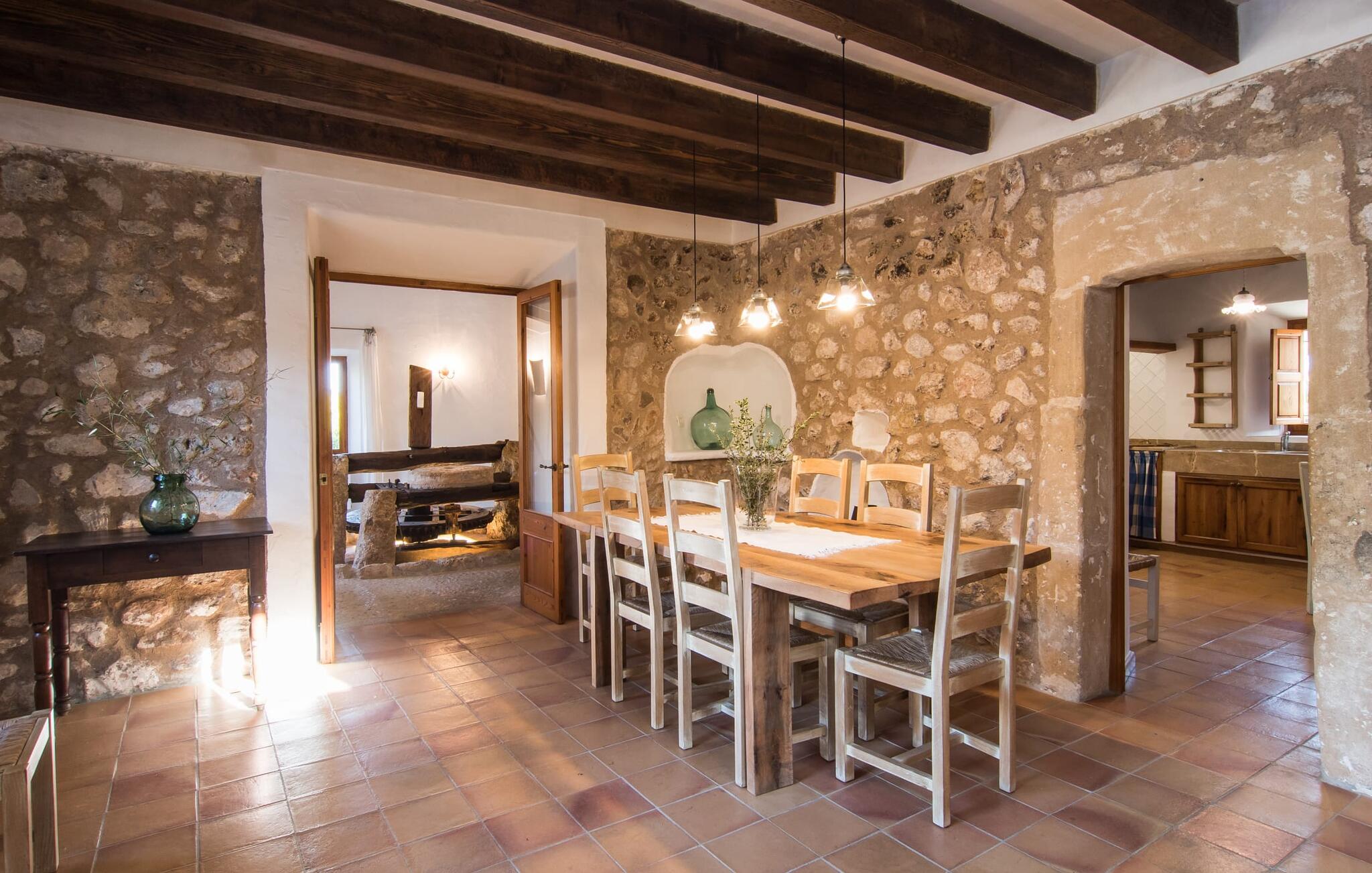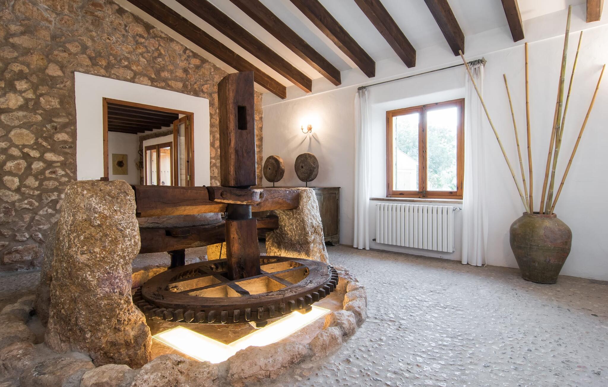 Het interieur van Can Peric wordt gekenmerkt door een verzorgde, uitnodigend lichte landhuisambiance. Direct naast het terras is een gezellige, gedeeltelijk uit bakstenen opgetrokken woonkamer met comfortabele banken, een tv en een gezellige open haard. Een paar treden leiden naar de traditioneel gelegde vloer met natuurlijke kiezels rond de oude, oorspronkelijk verlichte molensteen, die getuigt van de geschiedenis van het huis en een bijzondere blikvanger is. Je kunt binnen dineren aan de aangrenzende eettafel in de rustieke sfeer van de natuurstenen muren. Handig is dat de volledig uitgeruste keuken om de hoek ligt. Er is ook een slaapkamer met een tweepersoonsbed en een badkamer op dit woonniveau. Boven zijn er twee slaapkamers met tweepersoonsbedden, een slaapkamer met twee eenpersoonsbedden en twee badkamers. Alle slaapkamers hebben lichte kleuren en veel hout om een zeer gezellige sfeer te creëren, de beste voorwaarde om aangename nachten door te brengen in dit rustige gebied. Dit prachtige vakantiehuis op Mallorca, dat ongeveer 8 km ten westen van het pittoreske dorpje Pollenca ligt, scoort niet alleen punten met zijn prachtige, rustige ligging. Je kunt je dagelijkse boodschappen in het dorp doen. Het uitnodigende strand Platja de Port de Pollença ligt op ongeveer 11 km afstand en de populaire stad Alcúdia bereik je in iets meer dan 20 minuten met de auto.