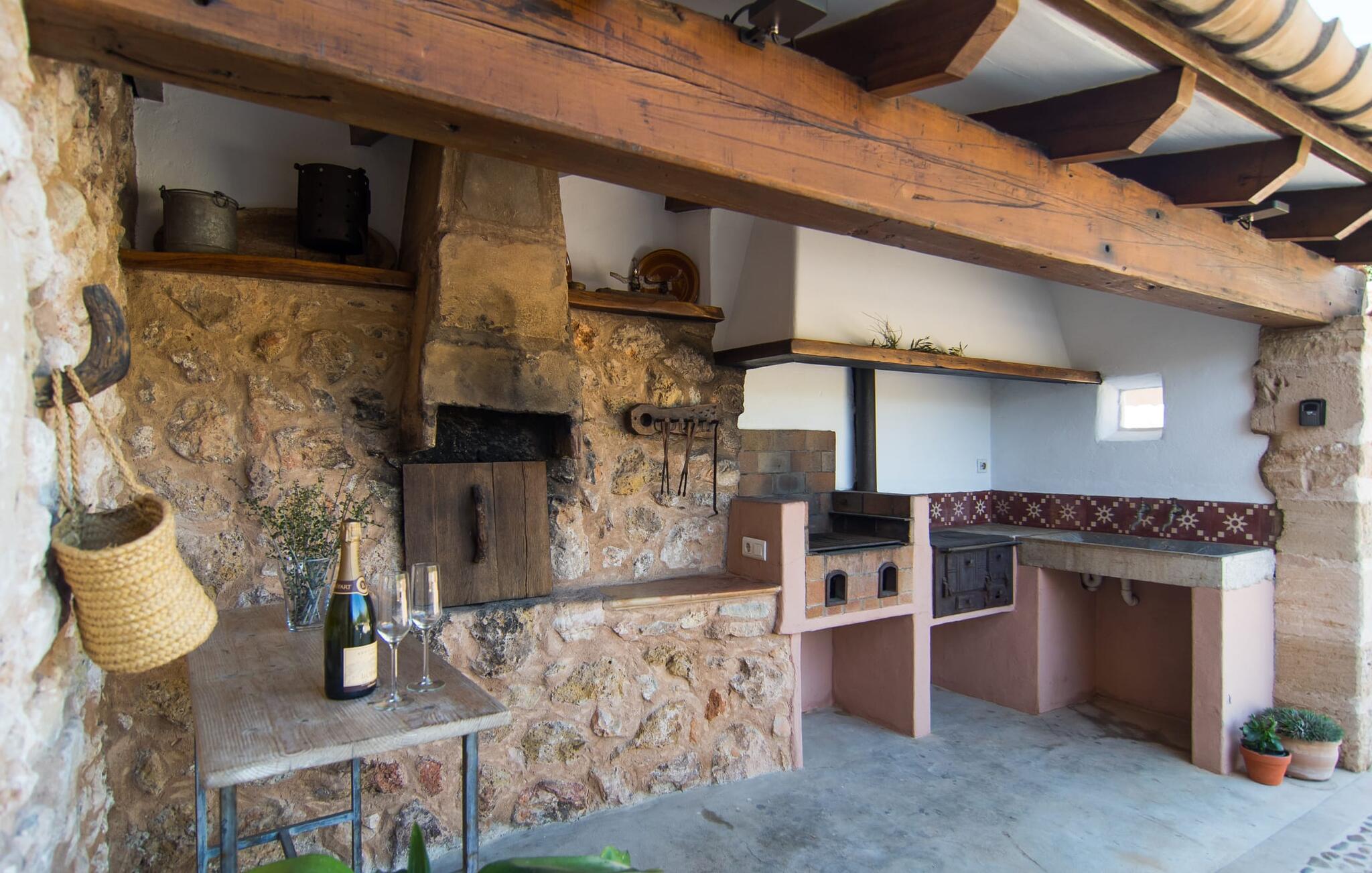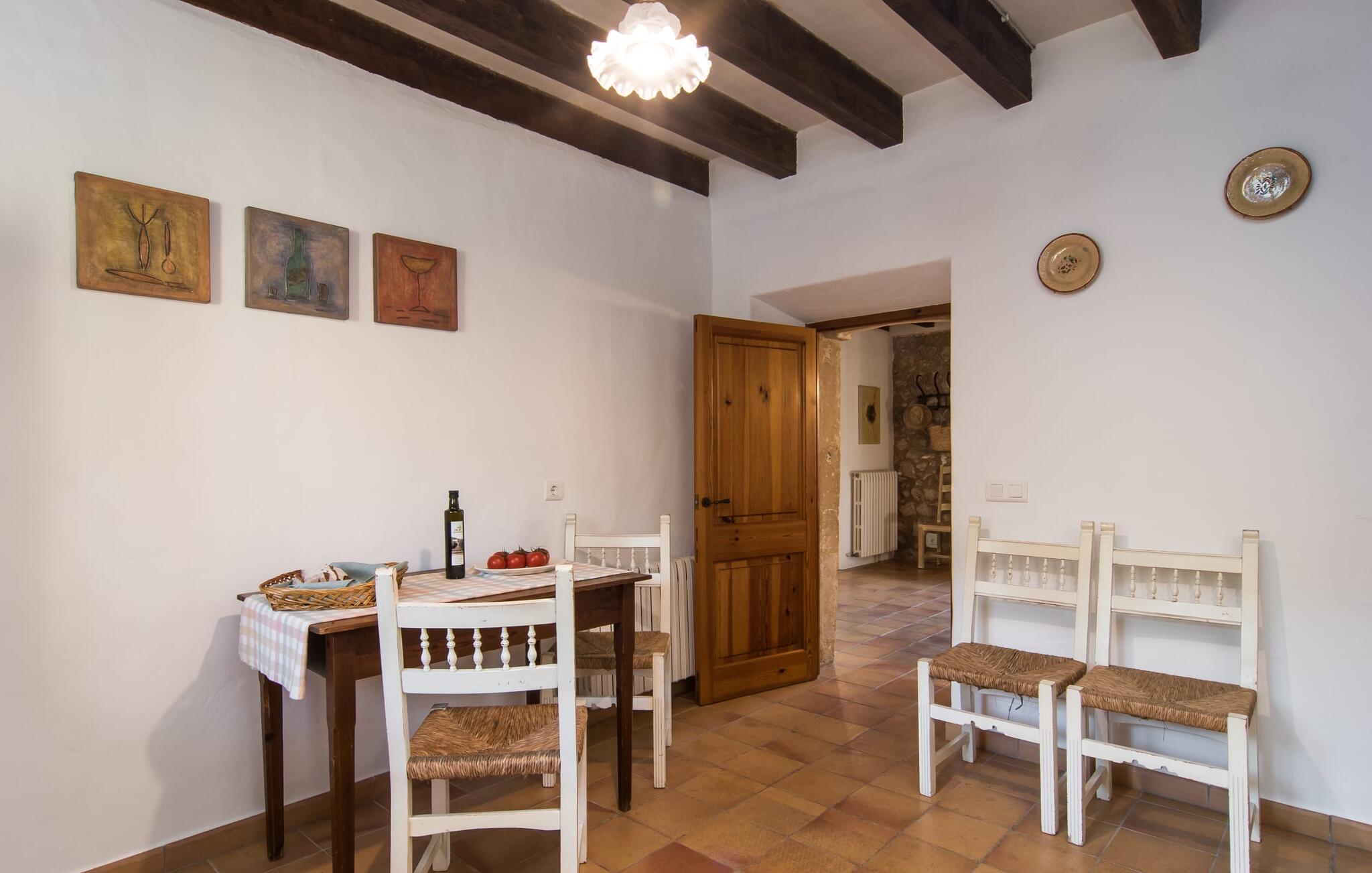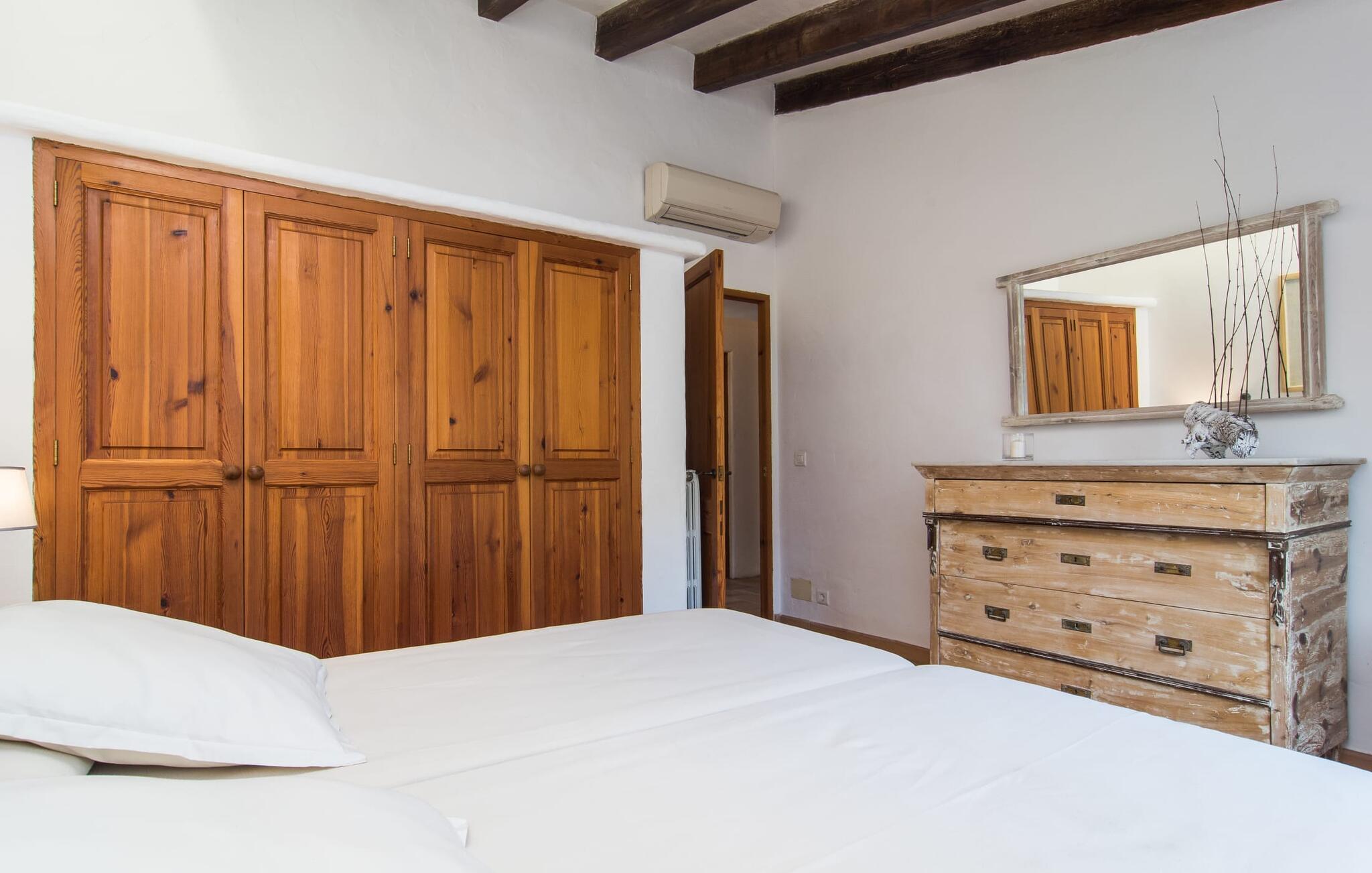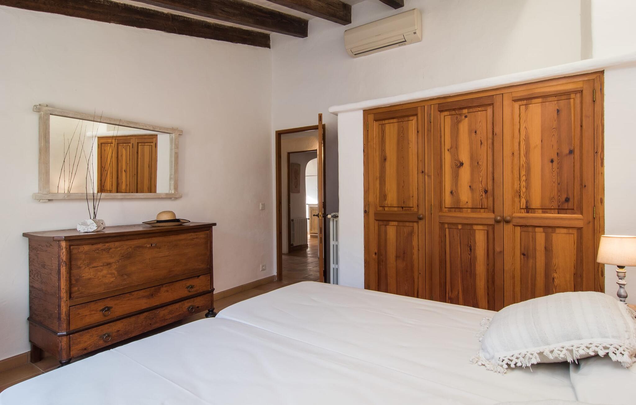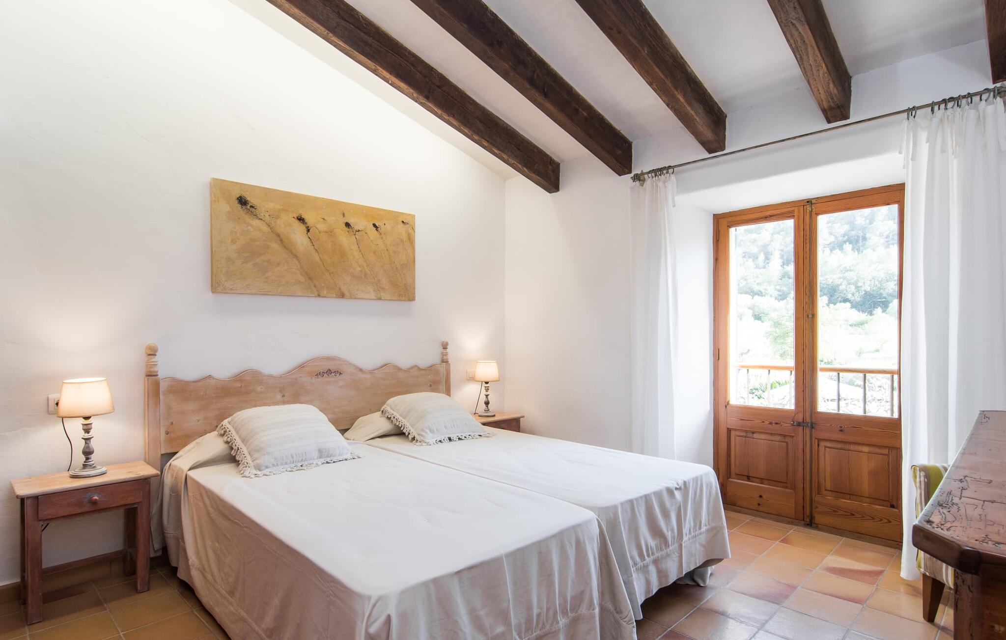 Het interieur van Can Peric wordt gekenmerkt door een verzorgde, uitnodigend lichte landhuisambiance. Direct naast het terras is een gezellige, gedeeltelijk uit bakstenen opgetrokken woonkamer met comfortabele banken, een tv en een gezellige open haard. Een paar treden leiden naar de traditioneel gelegde vloer met natuurlijke kiezels rond de oude, oorspronkelijk verlichte molensteen, die getuigt van de geschiedenis van het huis en een bijzondere blikvanger is. Je kunt binnen dineren aan de aangrenzende eettafel in de rustieke sfeer van de natuurstenen muren. Handig is dat de volledig uitgeruste keuken om de hoek ligt. Er is ook een slaapkamer met een tweepersoonsbed en een badkamer op dit woonniveau. Boven zijn er twee slaapkamers met tweepersoonsbedden, een slaapkamer met twee eenpersoonsbedden en twee badkamers. Alle slaapkamers hebben lichte kleuren en veel hout om een zeer gezellige sfeer te creëren, de beste voorwaarde om aangename nachten door te brengen in dit rustige gebied. Dit prachtige vakantiehuis op Mallorca, dat ongeveer 8 km ten westen van het pittoreske dorpje Pollenca ligt, scoort niet alleen punten met zijn prachtige, rustige ligging. Je kunt je dagelijkse boodschappen in het dorp doen. Het uitnodigende strand Platja de Port de Pollença ligt op ongeveer 11 km afstand en de populaire stad Alcúdia bereik je in iets meer dan 20 minuten met de auto.