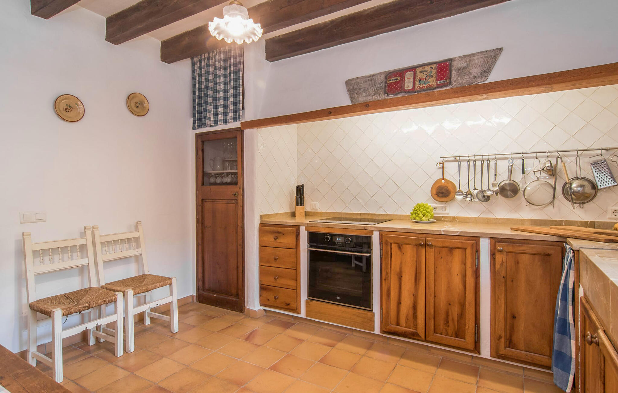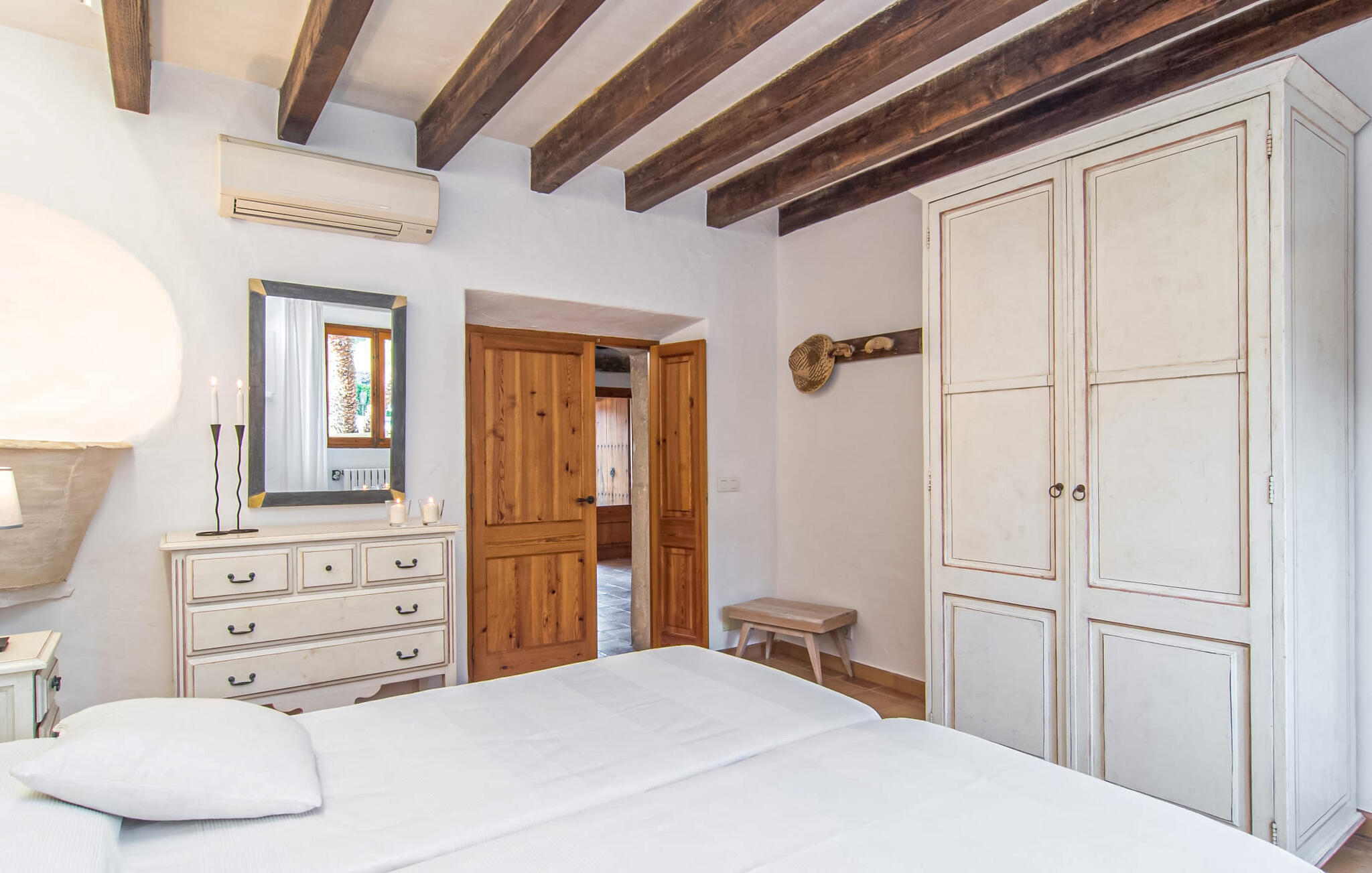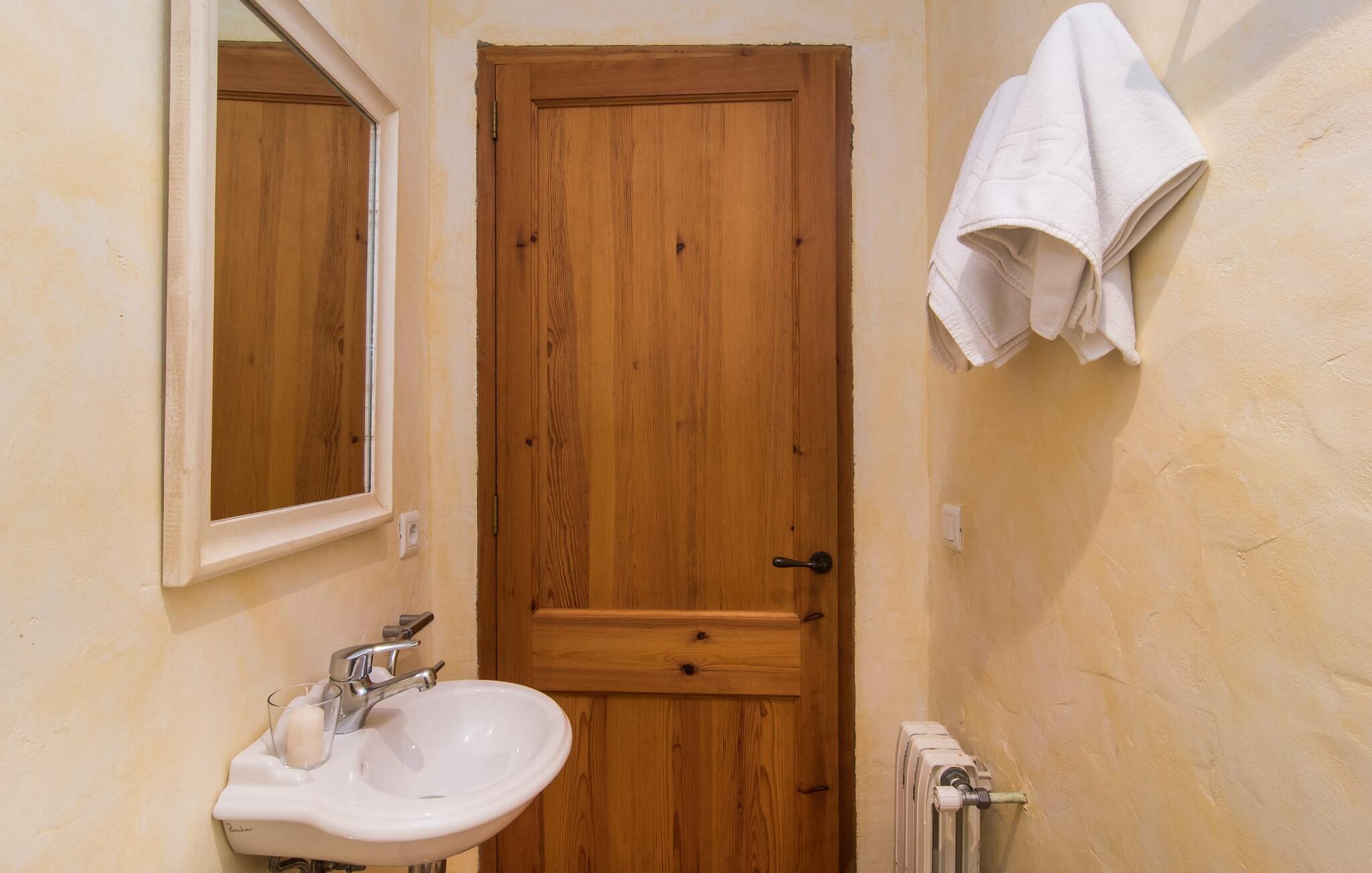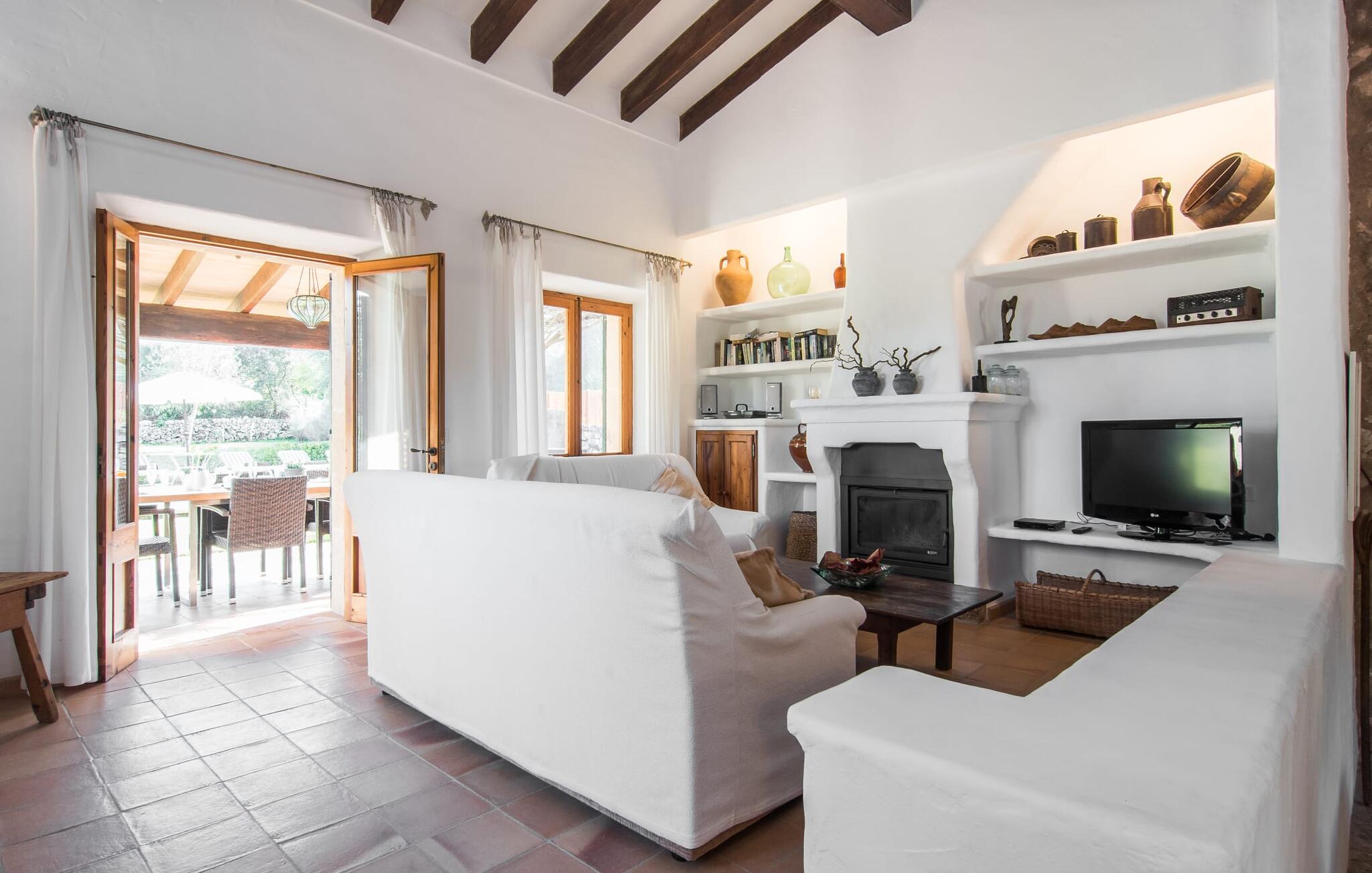 Het interieur van Can Peric wordt gekenmerkt door een verzorgde, uitnodigend lichte landhuisambiance. Direct naast het terras is een gezellige, gedeeltelijk uit bakstenen opgetrokken woonkamer met comfortabele banken, een tv en een gezellige open haard. Een paar treden leiden naar de traditioneel gelegde vloer met natuurlijke kiezels rond de oude, oorspronkelijk verlichte molensteen, die getuigt van de geschiedenis van het huis en een bijzondere blikvanger is. Je kunt binnen dineren aan de aangrenzende eettafel in de rustieke sfeer van de natuurstenen muren. Handig is dat de volledig uitgeruste keuken om de hoek ligt. Er is ook een slaapkamer met een tweepersoonsbed en een badkamer op dit woonniveau. Boven zijn er twee slaapkamers met tweepersoonsbedden, een slaapkamer met twee eenpersoonsbedden en twee badkamers. Alle slaapkamers hebben lichte kleuren en veel hout om een zeer gezellige sfeer te creëren, de beste voorwaarde om aangename nachten door te brengen in dit rustige gebied. Dit prachtige vakantiehuis op Mallorca, dat ongeveer 8 km ten westen van het pittoreske dorpje Pollenca ligt, scoort niet alleen punten met zijn prachtige, rustige ligging. Je kunt je dagelijkse boodschappen in het dorp doen. Het uitnodigende strand Platja de Port de Pollença ligt op ongeveer 11 km afstand en de populaire stad Alcúdia bereik je in iets meer dan 20 minuten met de auto.
