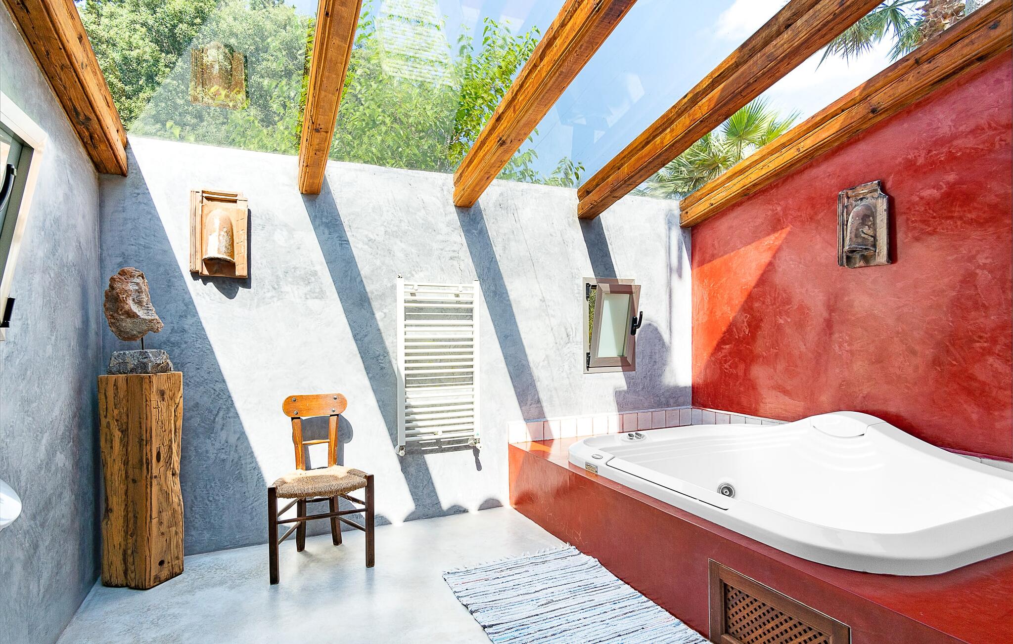Het interieur van de villa verwelkomt je met een buitengewoon gezellige en smaakvolle sfeer. Lichtgekleurde muren, traditionele balkenplafonds en bijpassende terracotta tegels harmoniëren prachtig met de met de hand uitgekozen meubels, die individueel zijn samengesteld. Het huis heeft een ruime woonkamer waar je volledig kunt ontspannen op de comfortabele bank of de bijpassende fauteuils. Je kunt jezelf ook vermaken met een goede film op tv. Vanuit deze woonkamer heb je toegang tot de lichte keuken, die volledig is uitgerust met een vaatwasser, gaskookplaat, elektrische oven, magnetron, koelkast/vriezer en broodrooster. Een waterkoker en filterkoffiezetapparaat zijn ook aanwezig. De eethoek is verbonden met de keuken en biedt plaats aan zes personen aan tafel om `s avonds binnen te eten. De drie tweepersoonskamers zijn elk liefdevol ingericht en ontworpen in een zeer individuele stijl. Gasten hebben twee bedden van 1,50 x 2,00 meter en een ander van 1,50 x 1,90 meter tot hun beschikking. Ze hebben elk een inloopkast en/of praktische inbouwkasten. Elke slaapkamer heeft gemakkelijke toegang tot een terras. De grote design badkamer is een echt hoogtepunt van dit vakantiehuis. Het is uitgerust met een fantastisch bubbelbad en een aparte en ruime douche in Arabische stijl, een originele vierkante wastafel en twee aparte toiletten. Een strijkijzer en haardroger zijn in het huis aanwezig, zodat je die niet van thuis hoeft mee te nemen. Er zijn ook muskietennetten beschikbaar.
