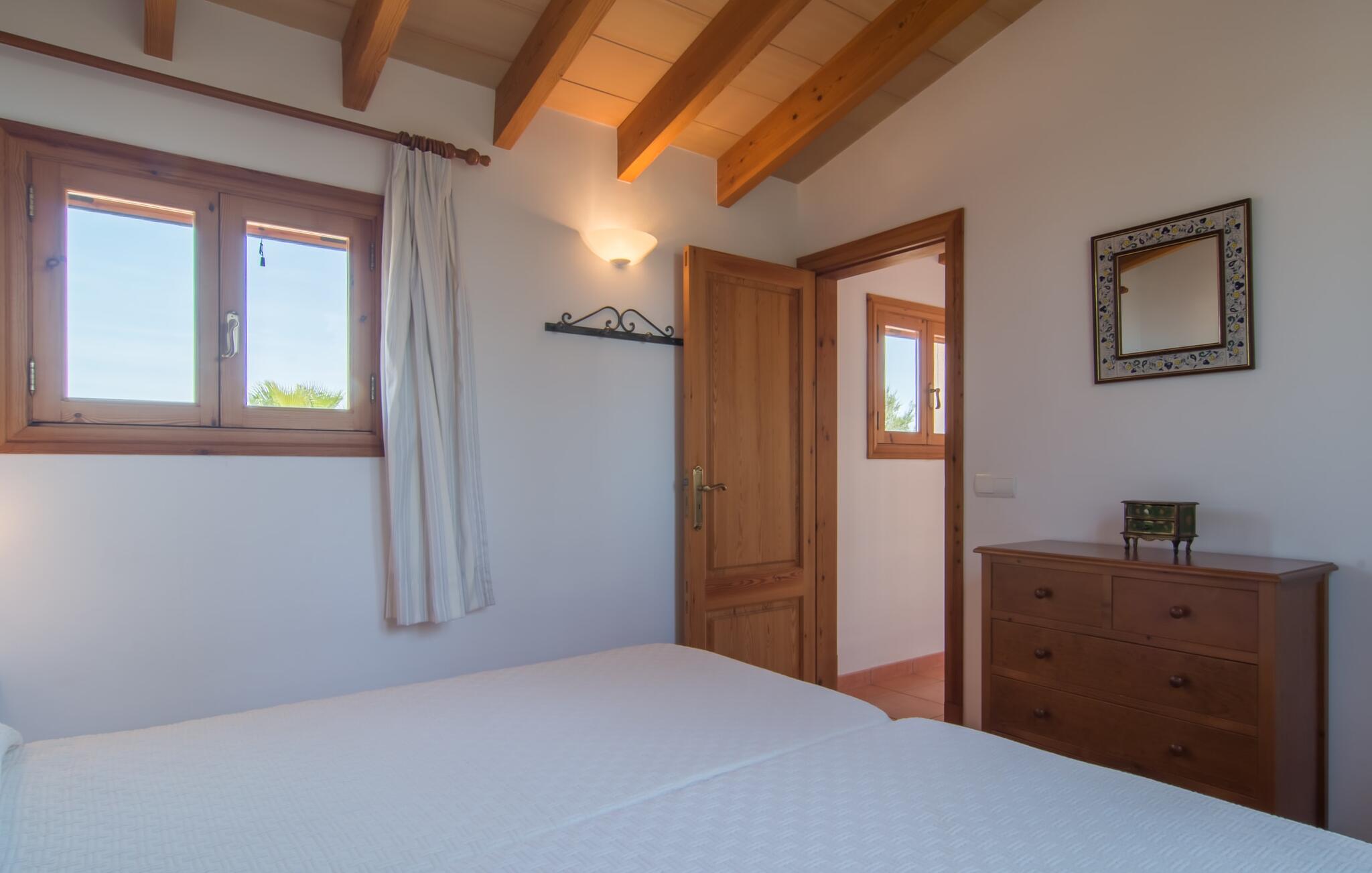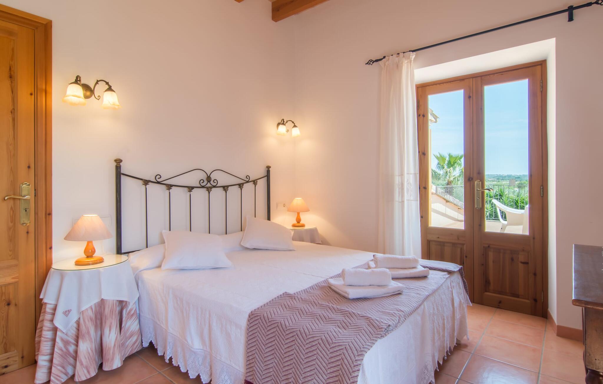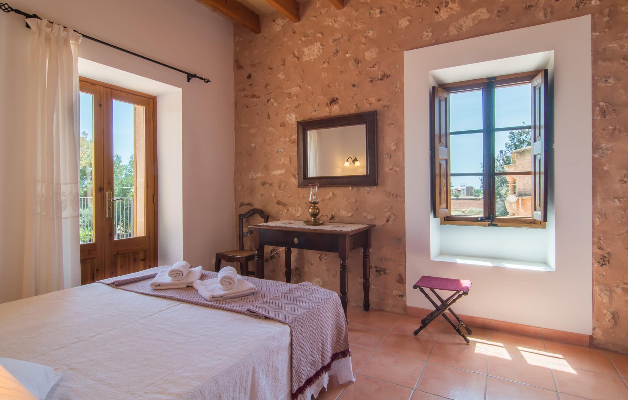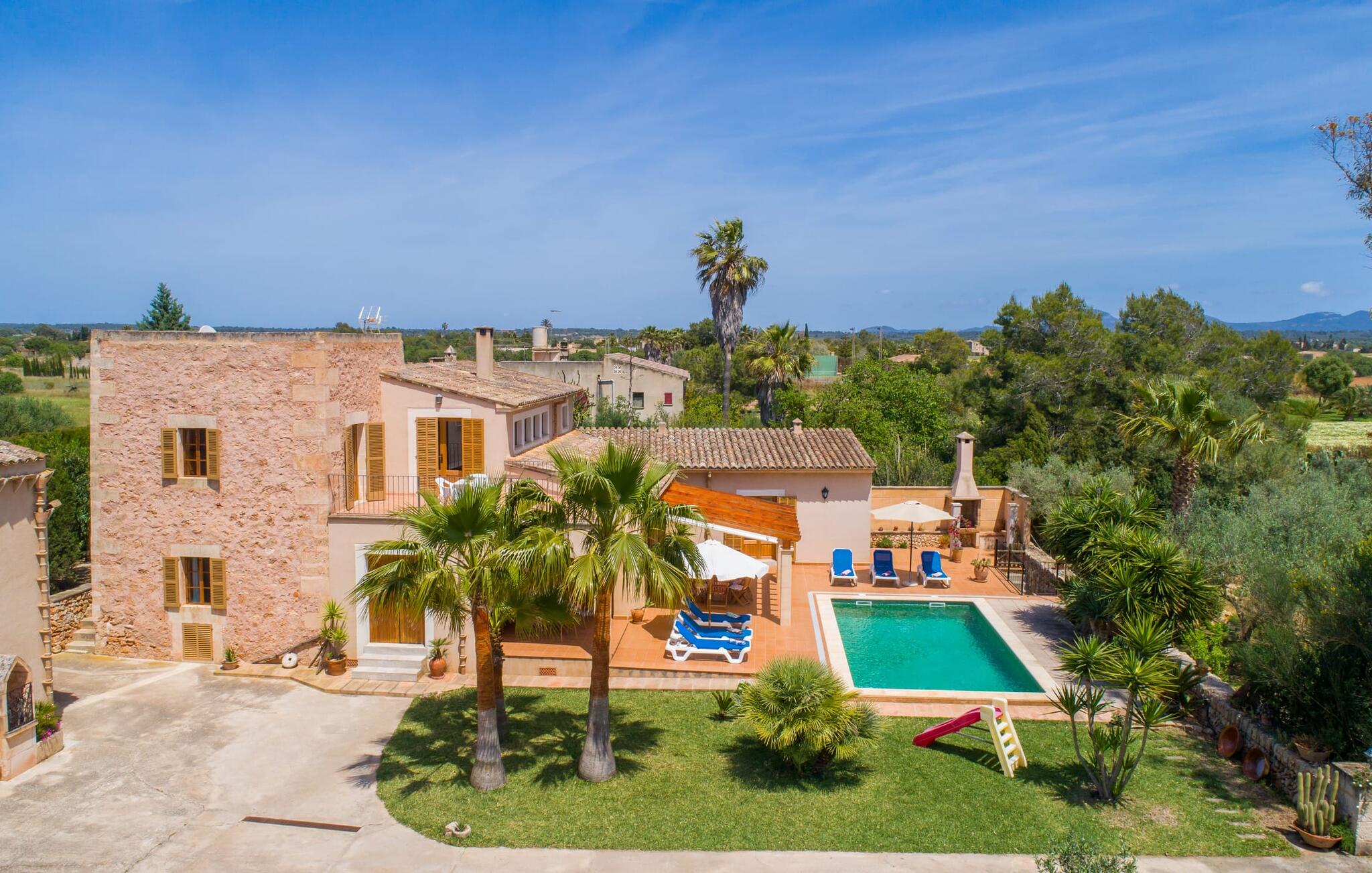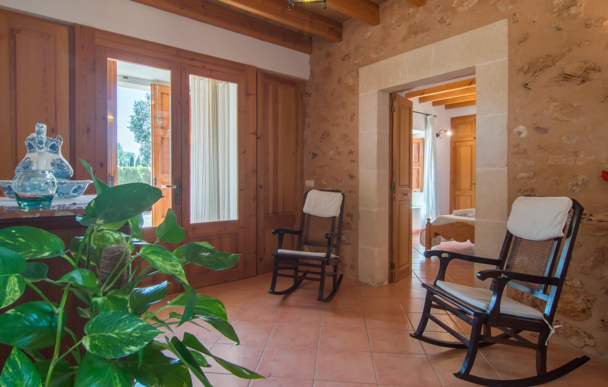 Villa Cas Padrins de Campos bij Campos wordt omgeven door een idyllisch landschap en een prachtige mediterrane tuin. De buitenruimte wordt gekenmerkt door een tuin en een zwembadterras omringd door palmbomen en biedt een verscheidenheid aan aantrekkelijke plekken om te ontspannen. Het gazon is een geweldige plek voor kinderen om te spelen. Er is zelfs een kleine glijbaan voor de kleintjes. Begeleidende ouders kunnen ernaast ontspannen of in het grote zwembad, dat ook ideaal is voor waterspelletjes en spetteren. Als je niet in het koele water wilt springen, kun je gemakkelijk bij het zwembad komen via een halfronde trap. Je kunt dan ontspannen en zonnebaden op een van de ligstoelen. Twee grote parasols zorgen voor schaduw, zodat je naar hartenlust kunt chillen en gewoon ontspannen. Twee overdekte terrassen bieden een luchtige zithoek met uitzicht op de prachtig onderhouden tuin. Bij mooi weer kun je samen genieten van alle maaltijden aan een indrukwekkende houten eettafel. Voor een hartige maaltijd is er een gemetselde barbecue waar je naar eigen smaak verse lokale lekkernijen kunt bereiden.