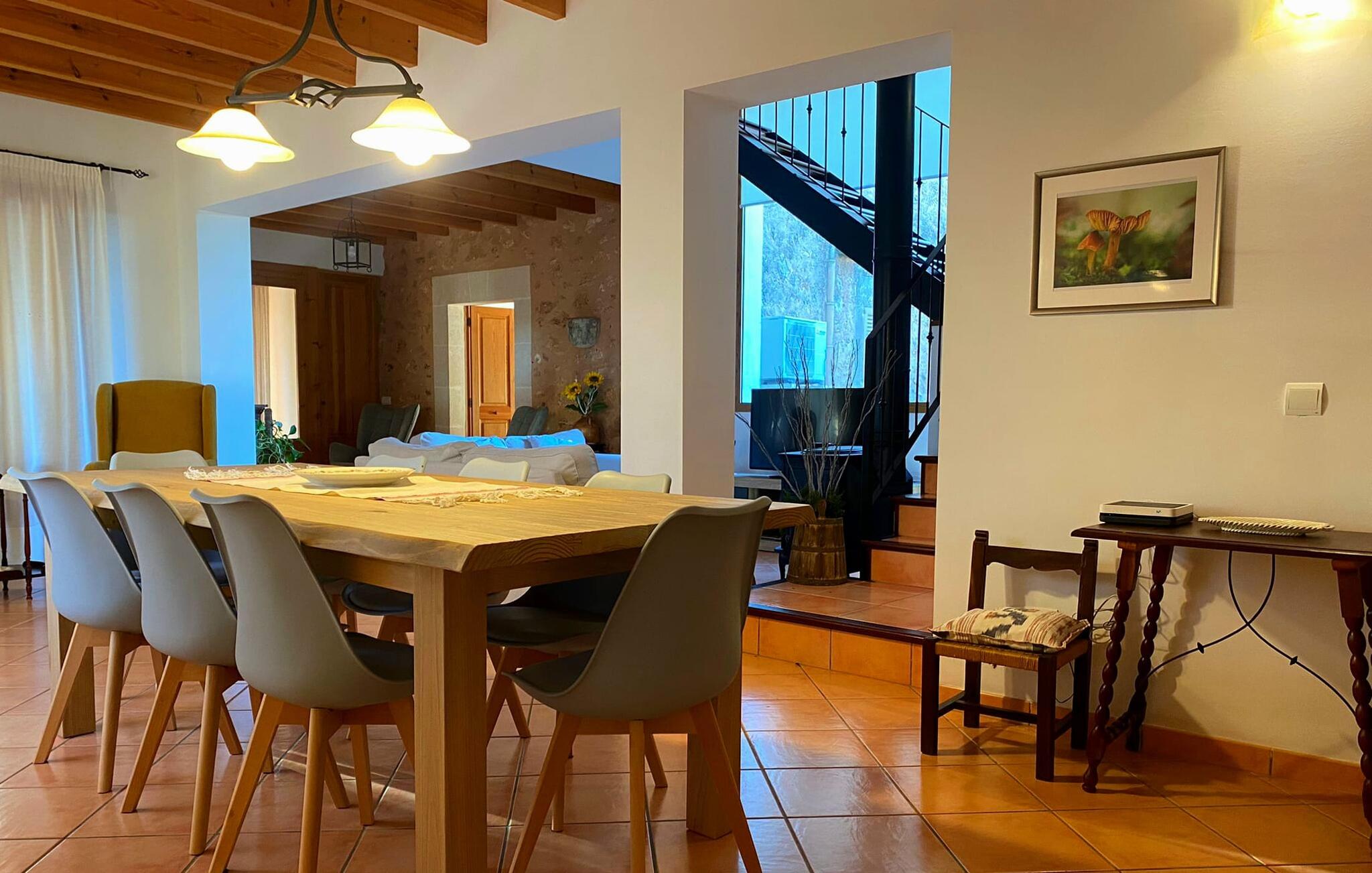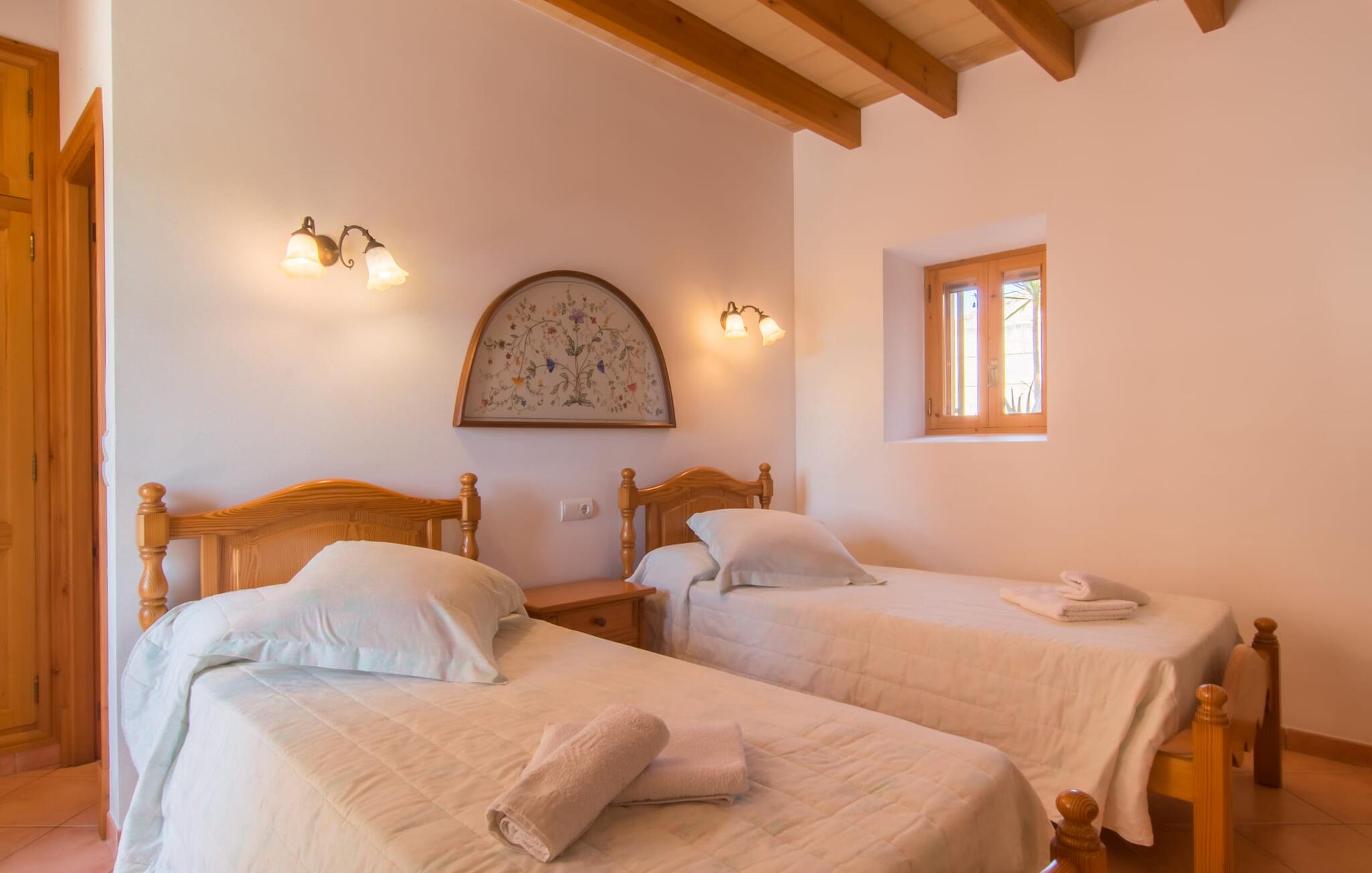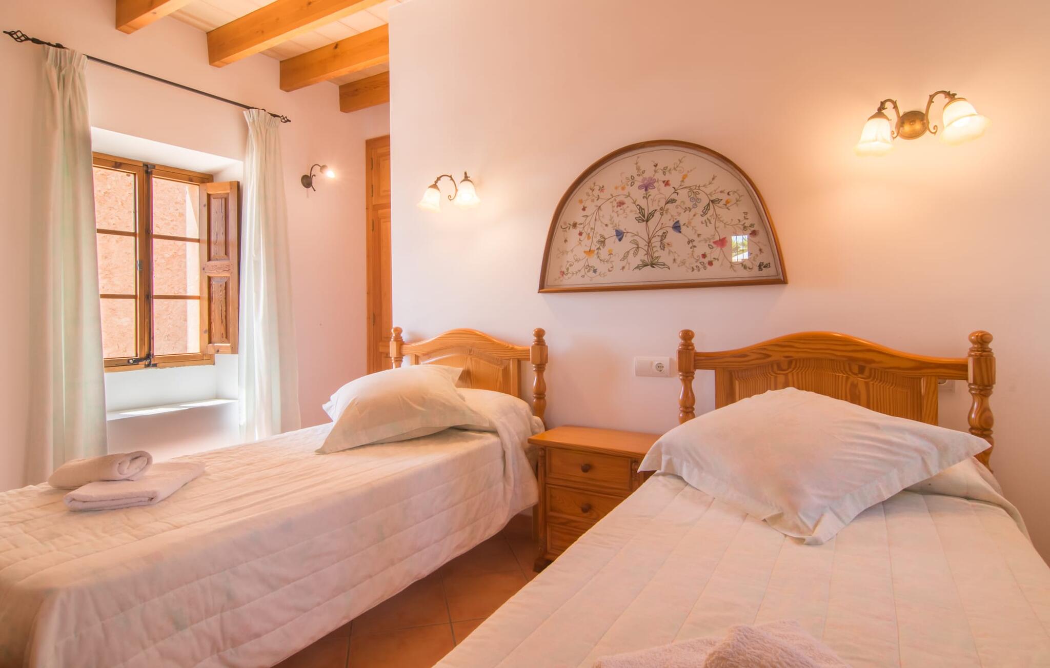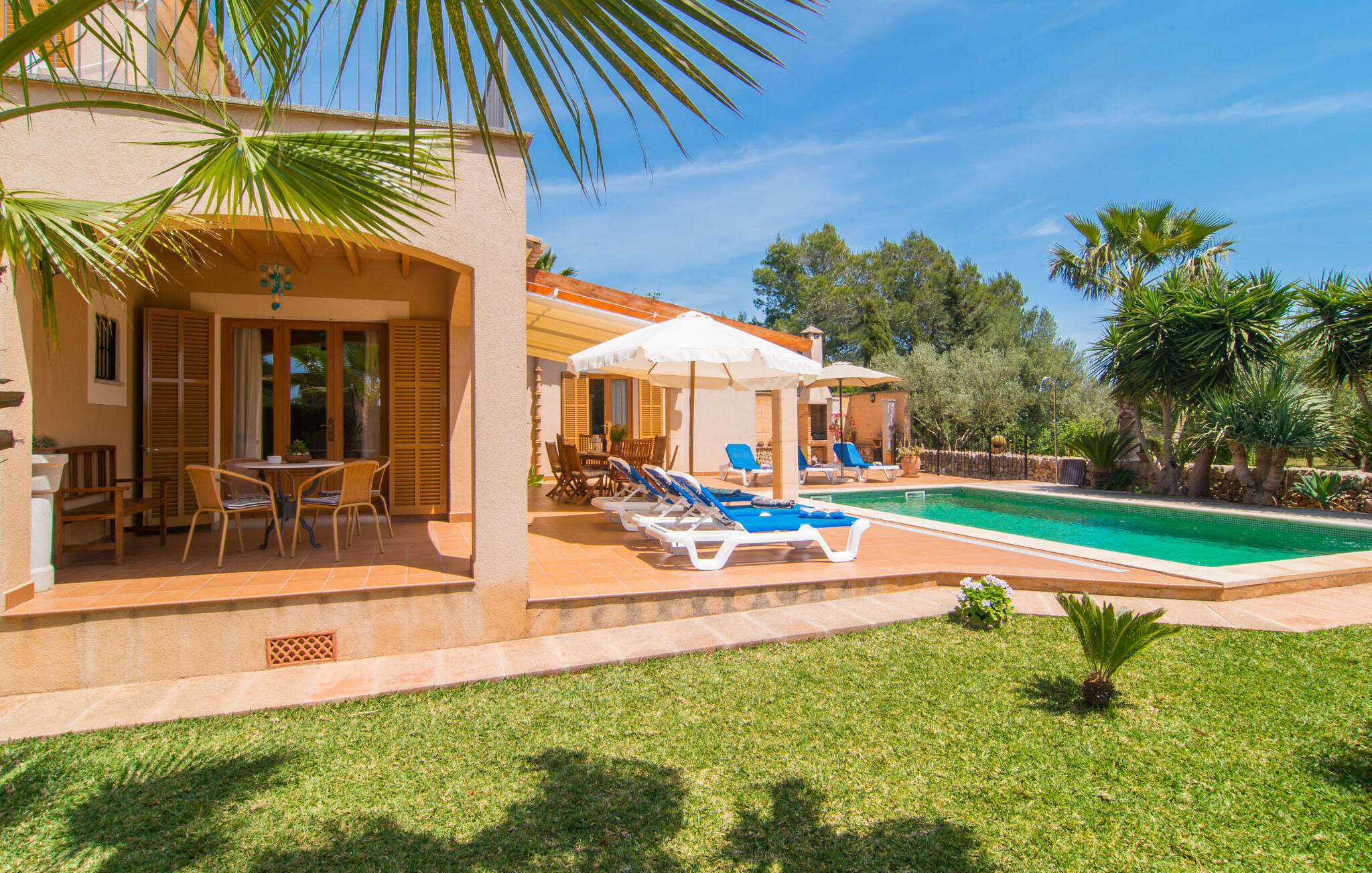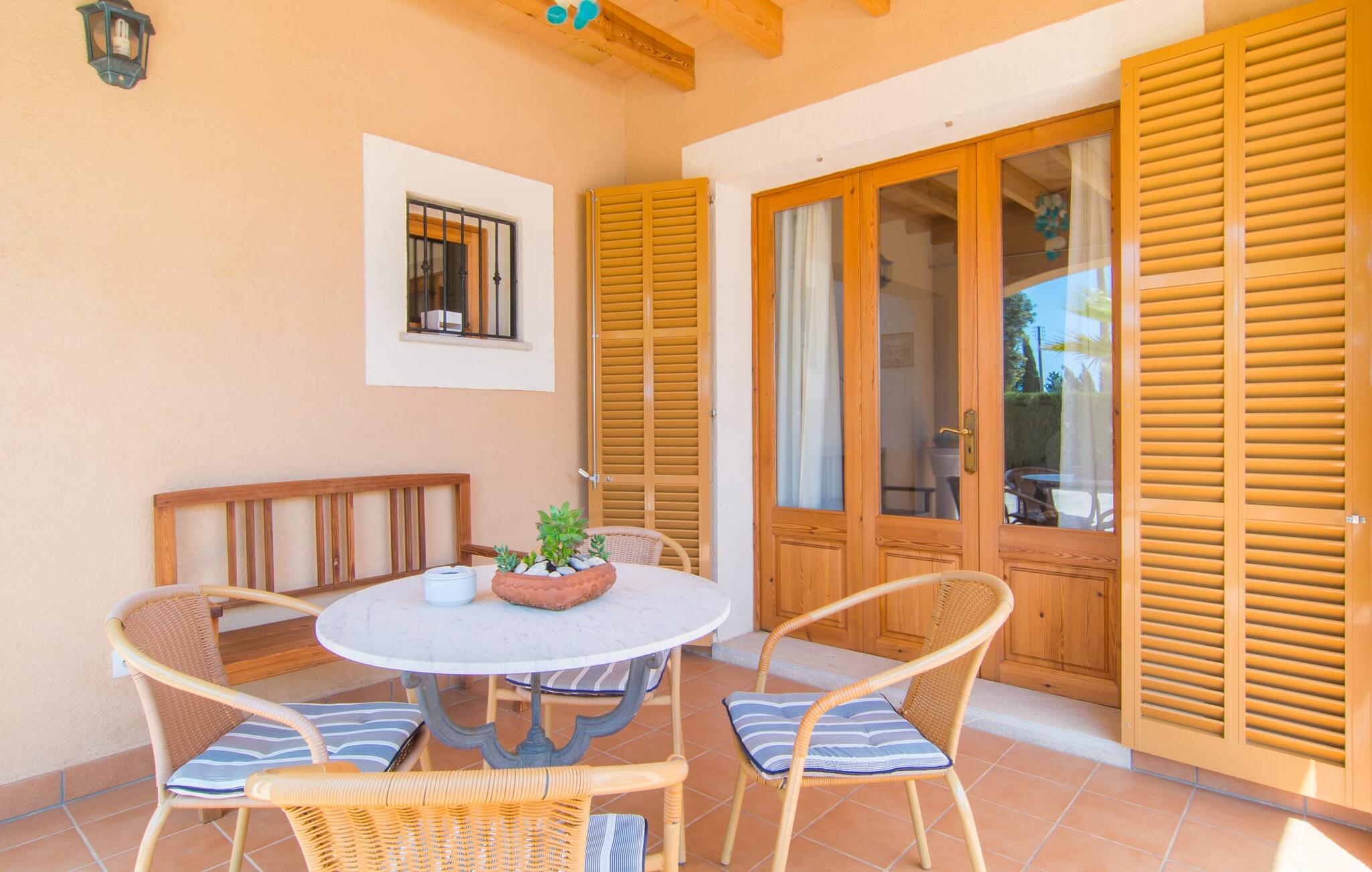 Villa Cas Padrins de Campos bij Campos wordt omgeven door een idyllisch landschap en een prachtige mediterrane tuin. De buitenruimte wordt gekenmerkt door een tuin en een zwembadterras omringd door palmbomen en biedt een verscheidenheid aan aantrekkelijke plekken om te ontspannen. Het gazon is een geweldige plek voor kinderen om te spelen. Er is zelfs een kleine glijbaan voor de kleintjes. Begeleidende ouders kunnen ernaast ontspannen of in het grote zwembad, dat ook ideaal is voor waterspelletjes en spetteren. Als je niet in het koele water wilt springen, kun je gemakkelijk bij het zwembad komen via een halfronde trap. Je kunt dan ontspannen en zonnebaden op een van de ligstoelen. Twee grote parasols zorgen voor schaduw, zodat je naar hartenlust kunt chillen en gewoon ontspannen. Twee overdekte terrassen bieden een luchtige zithoek met uitzicht op de prachtig onderhouden tuin. Bij mooi weer kun je samen genieten van alle maaltijden aan een indrukwekkende houten eettafel. Voor een hartige maaltijd is er een gemetselde barbecue waar je naar eigen smaak verse lokale lekkernijen kunt bereiden.