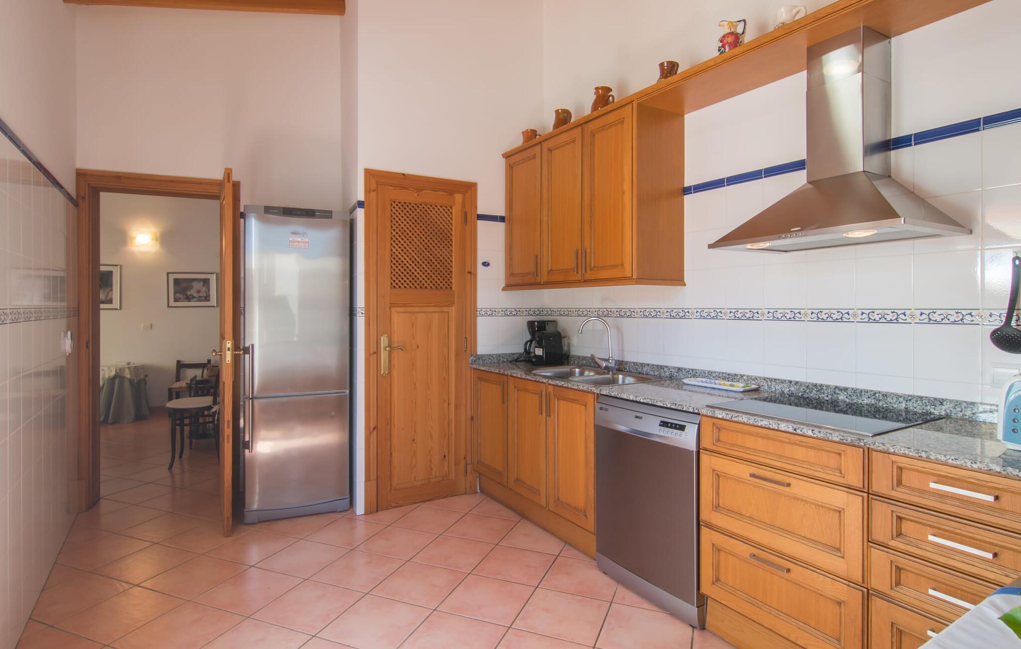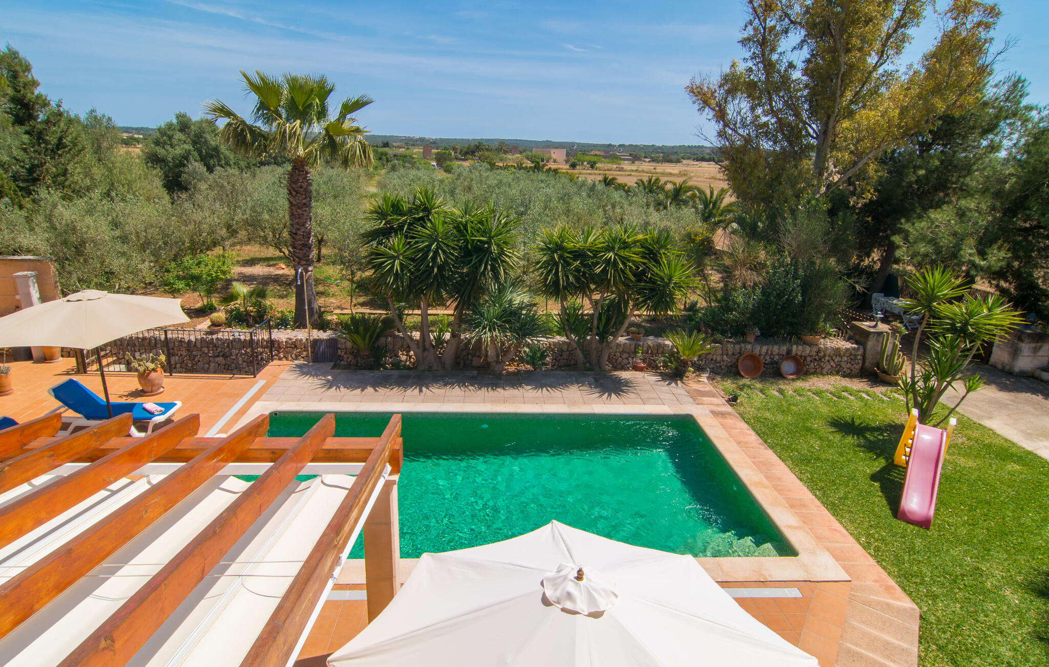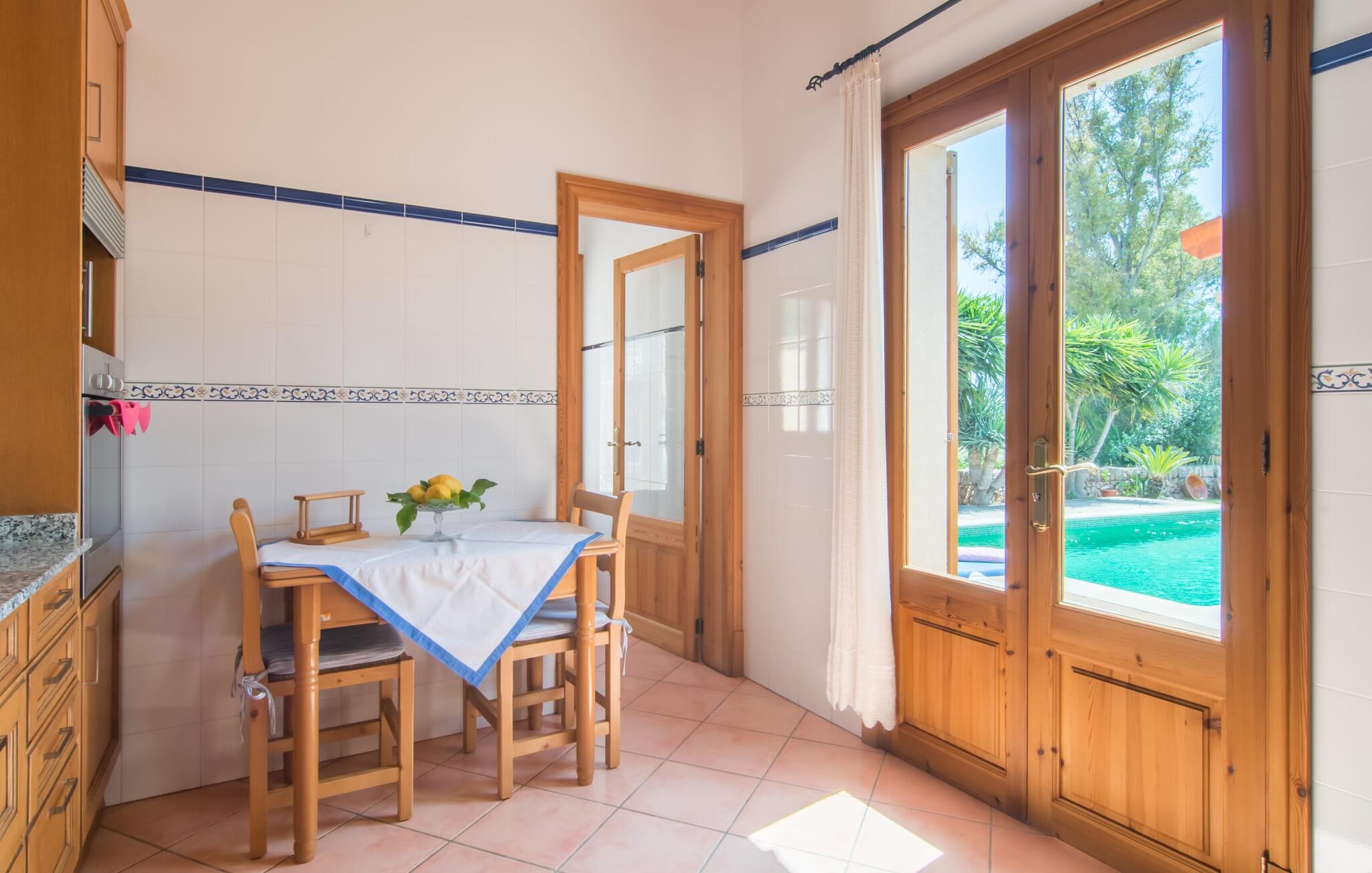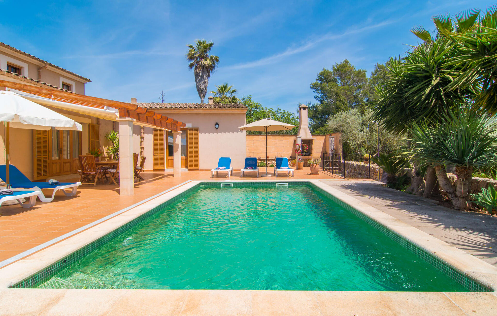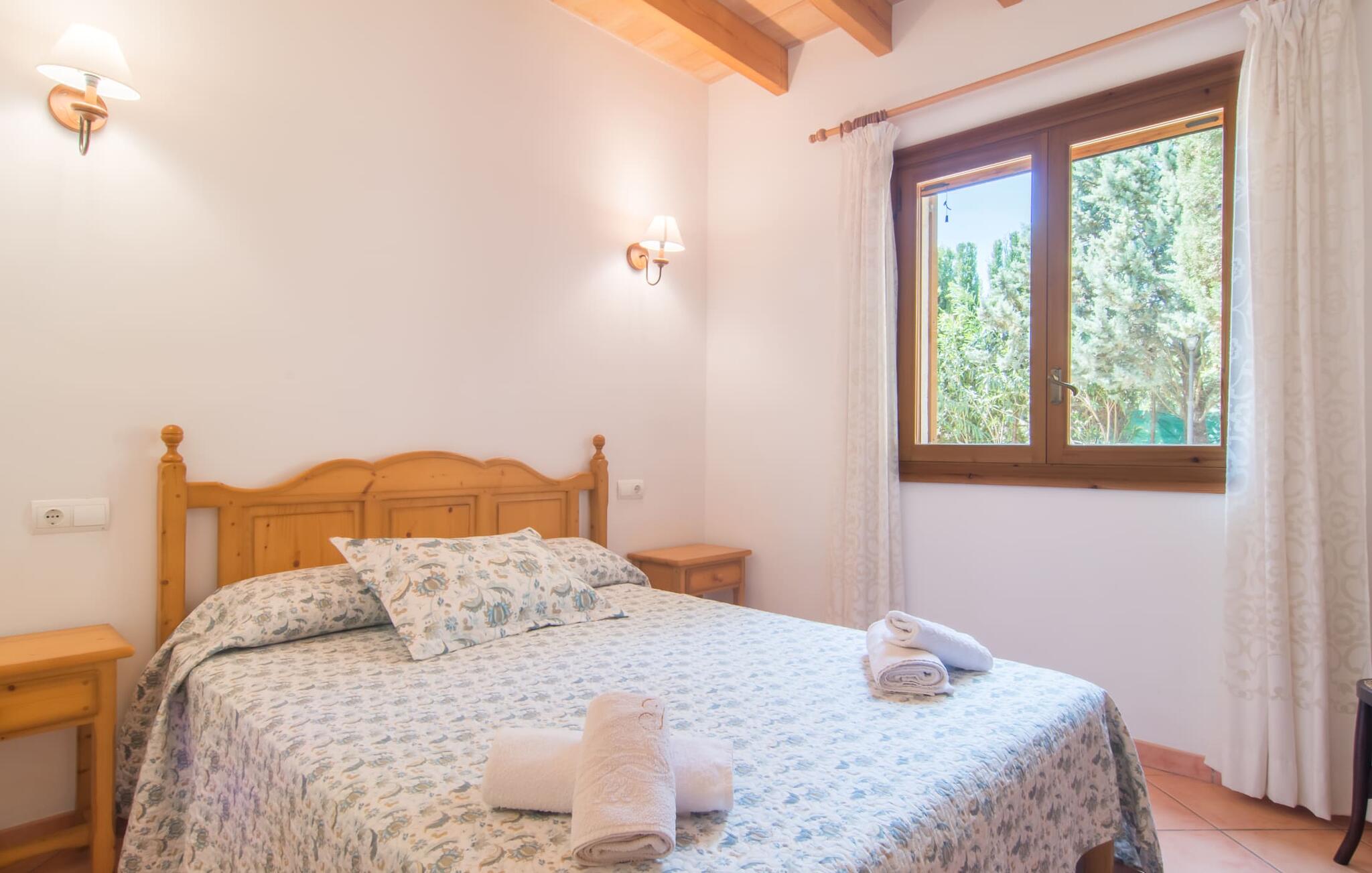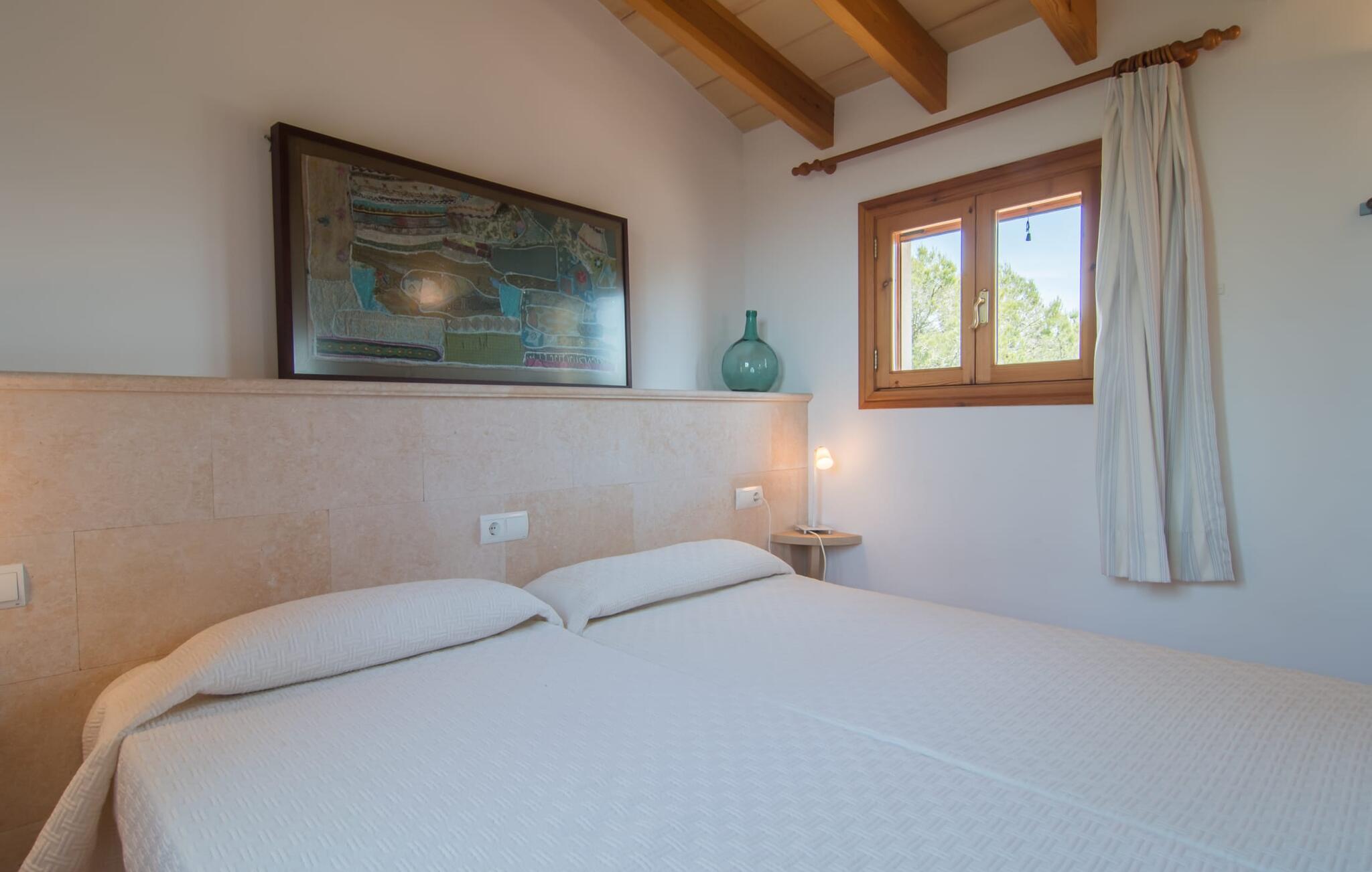 Villa Cas Padrins de Campos bij Campos wordt omgeven door een idyllisch landschap en een prachtige mediterrane tuin. De buitenruimte wordt gekenmerkt door een tuin en een zwembadterras omringd door palmbomen en biedt een verscheidenheid aan aantrekkelijke plekken om te ontspannen. Het gazon is een geweldige plek voor kinderen om te spelen. Er is zelfs een kleine glijbaan voor de kleintjes. Begeleidende ouders kunnen ernaast ontspannen of in het grote zwembad, dat ook ideaal is voor waterspelletjes en spetteren. Als je niet in het koele water wilt springen, kun je gemakkelijk bij het zwembad komen via een halfronde trap. Je kunt dan ontspannen en zonnebaden op een van de ligstoelen. Twee grote parasols zorgen voor schaduw, zodat je naar hartenlust kunt chillen en gewoon ontspannen. Twee overdekte terrassen bieden een luchtige zithoek met uitzicht op de prachtig onderhouden tuin. Bij mooi weer kun je samen genieten van alle maaltijden aan een indrukwekkende houten eettafel. Voor een hartige maaltijd is er een gemetselde barbecue waar je naar eigen smaak verse lokale lekkernijen kunt bereiden.