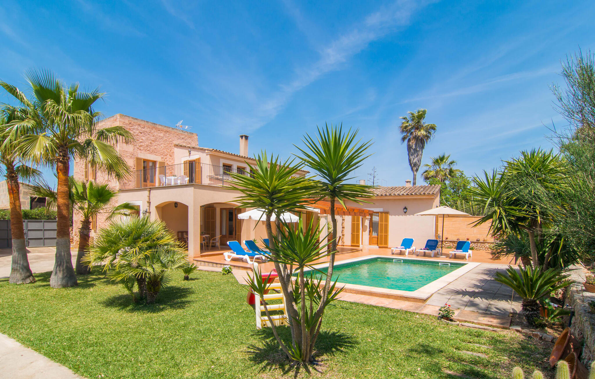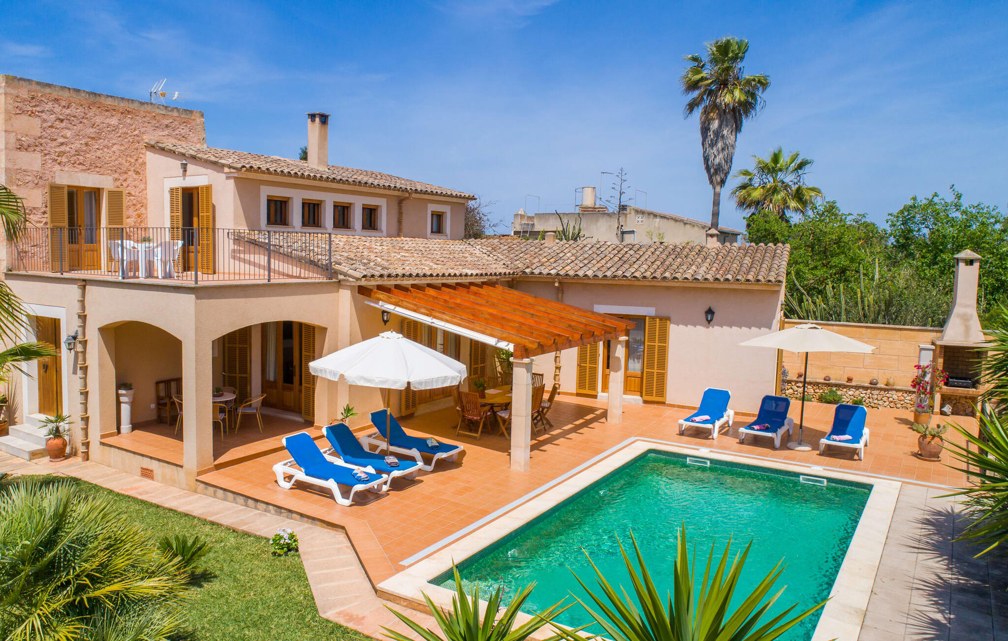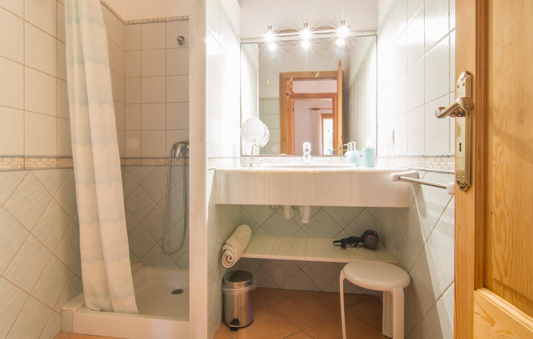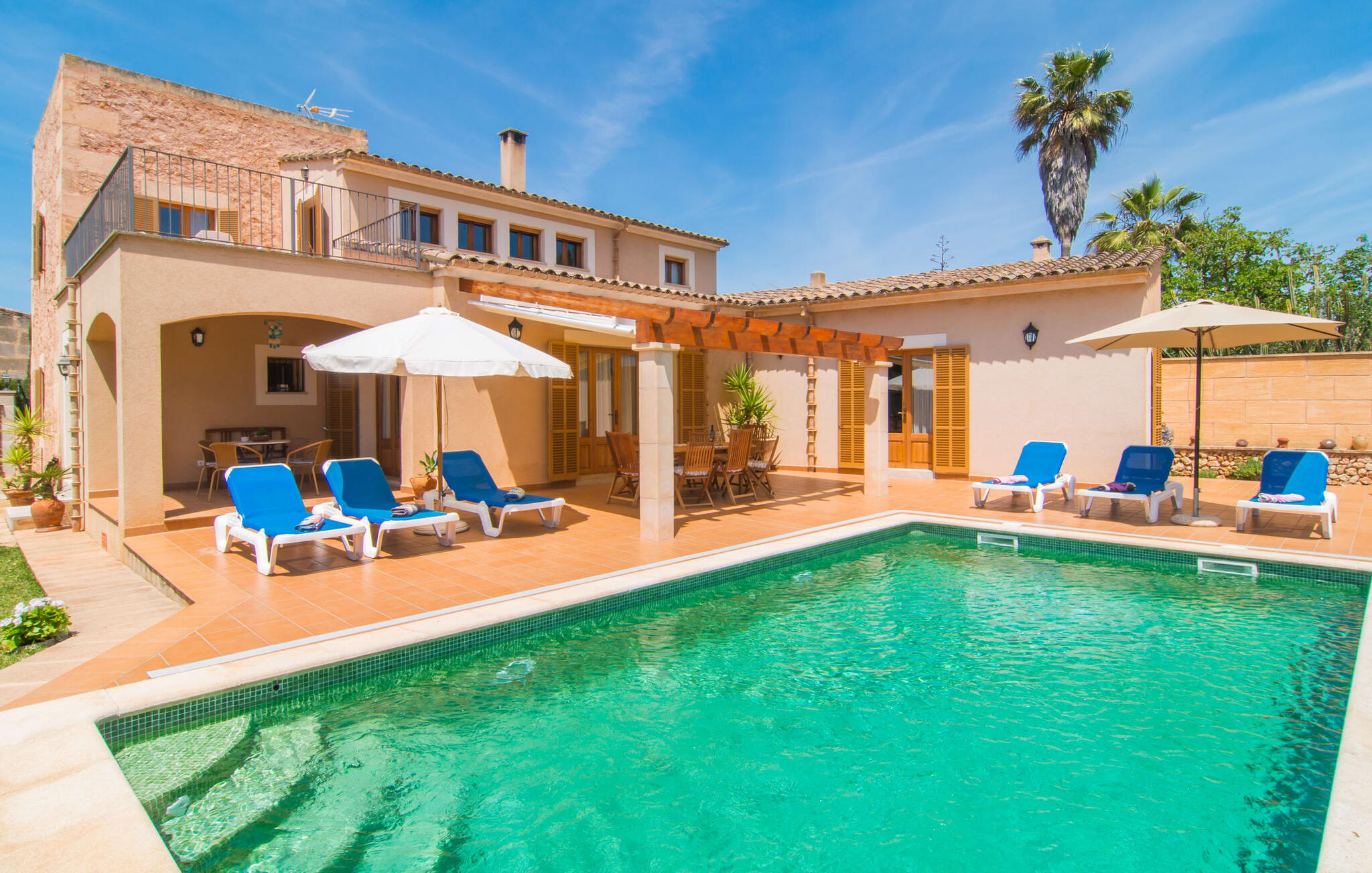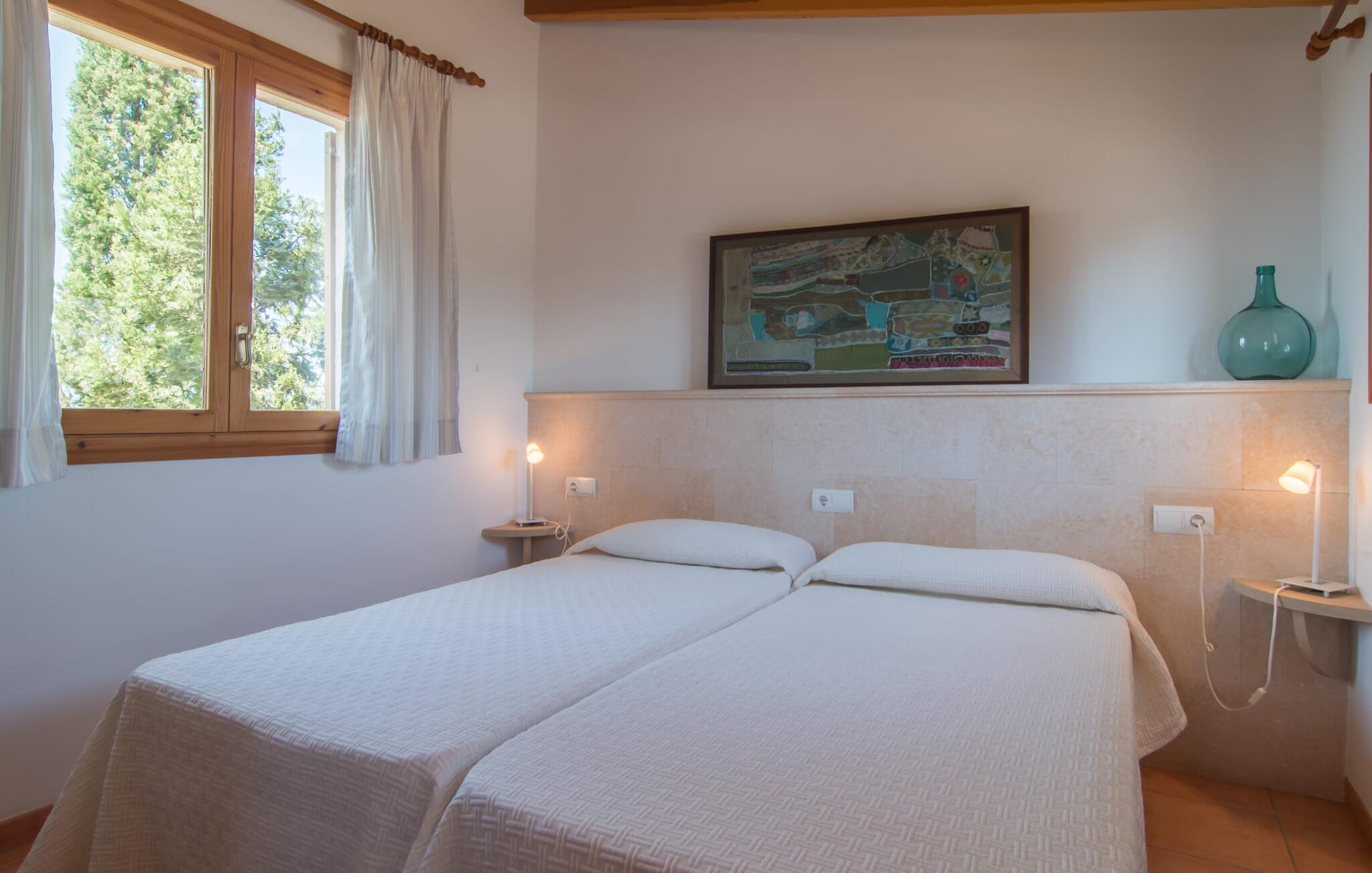 Villa Cas Padrins de Campos bij Campos wordt omgeven door een idyllisch landschap en een prachtige mediterrane tuin. De buitenruimte wordt gekenmerkt door een tuin en een zwembadterras omringd door palmbomen en biedt een verscheidenheid aan aantrekkelijke plekken om te ontspannen. Het gazon is een geweldige plek voor kinderen om te spelen. Er is zelfs een kleine glijbaan voor de kleintjes. Begeleidende ouders kunnen ernaast ontspannen of in het grote zwembad, dat ook ideaal is voor waterspelletjes en spetteren. Als je niet in het koele water wilt springen, kun je gemakkelijk bij het zwembad komen via een halfronde trap. Je kunt dan ontspannen en zonnebaden op een van de ligstoelen. Twee grote parasols zorgen voor schaduw, zodat je naar hartenlust kunt chillen en gewoon ontspannen. Twee overdekte terrassen bieden een luchtige zithoek met uitzicht op de prachtig onderhouden tuin. Bij mooi weer kun je samen genieten van alle maaltijden aan een indrukwekkende houten eettafel. Voor een hartige maaltijd is er een gemetselde barbecue waar je naar eigen smaak verse lokale lekkernijen kunt bereiden.