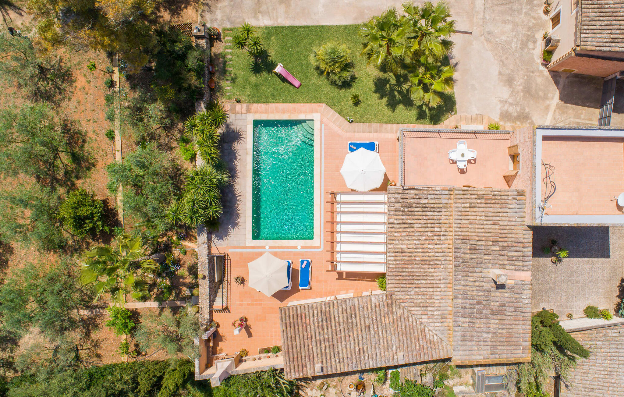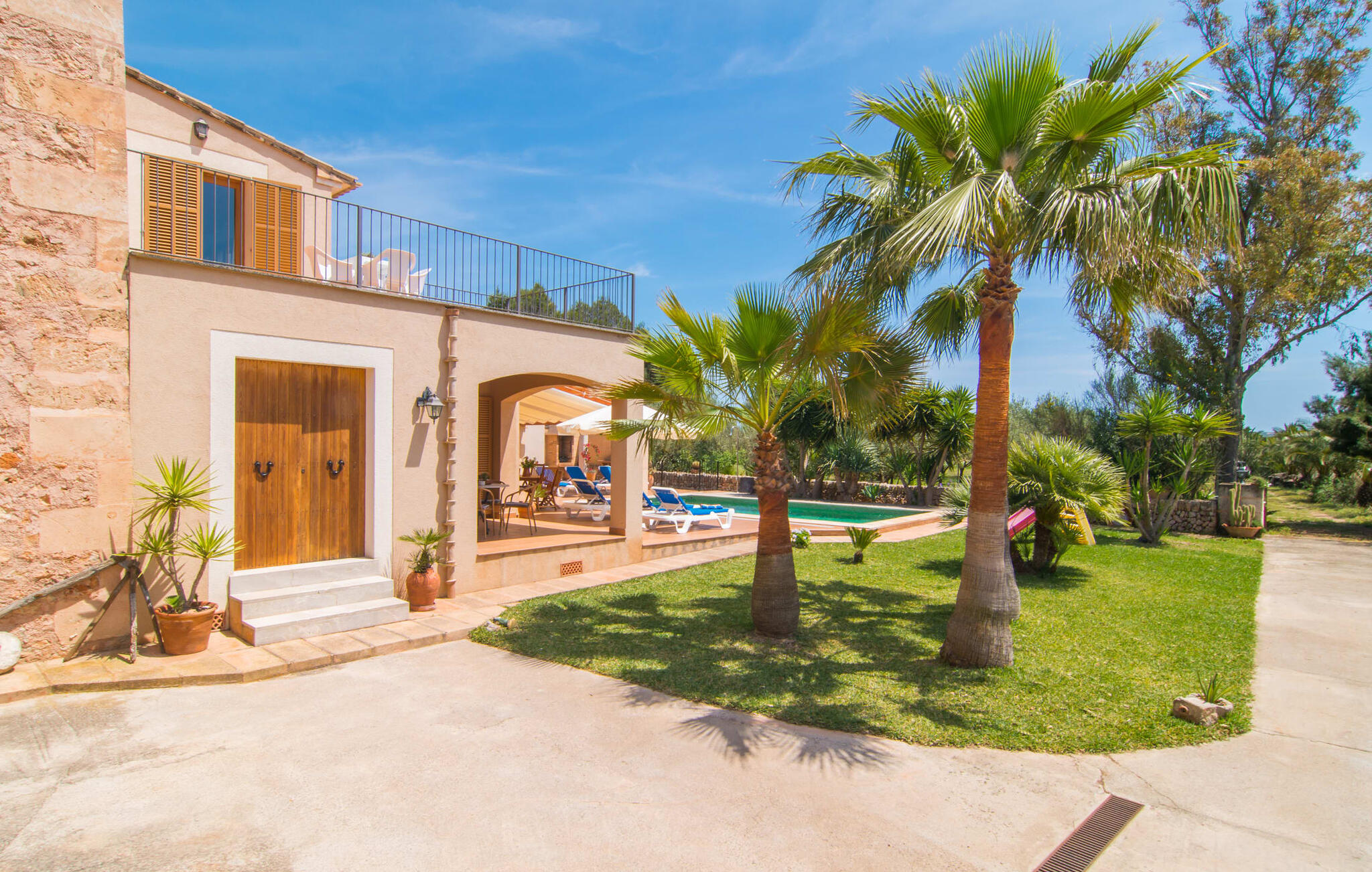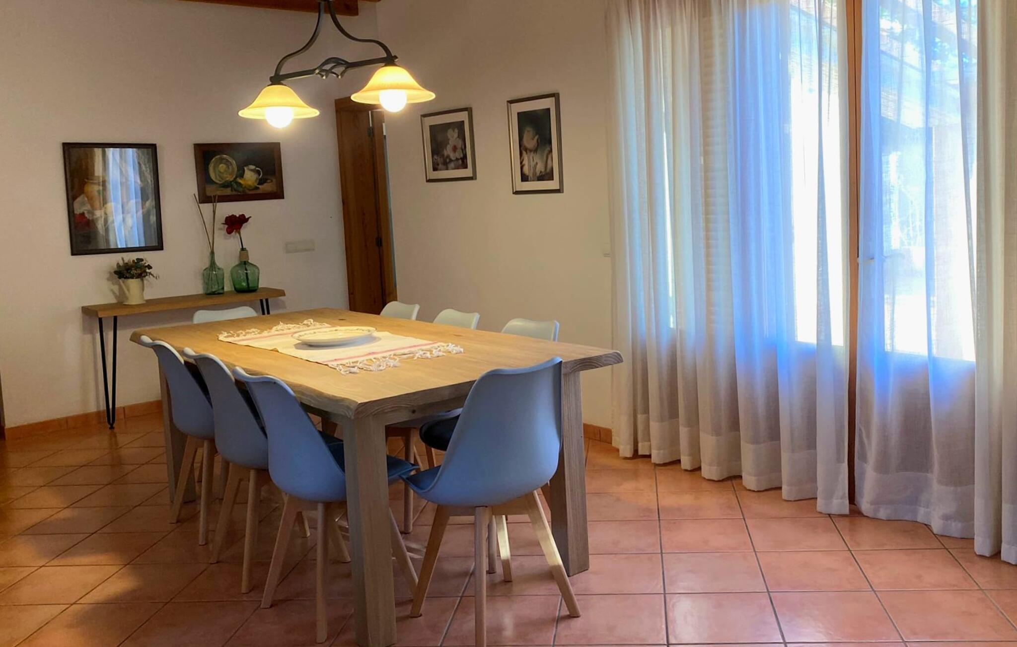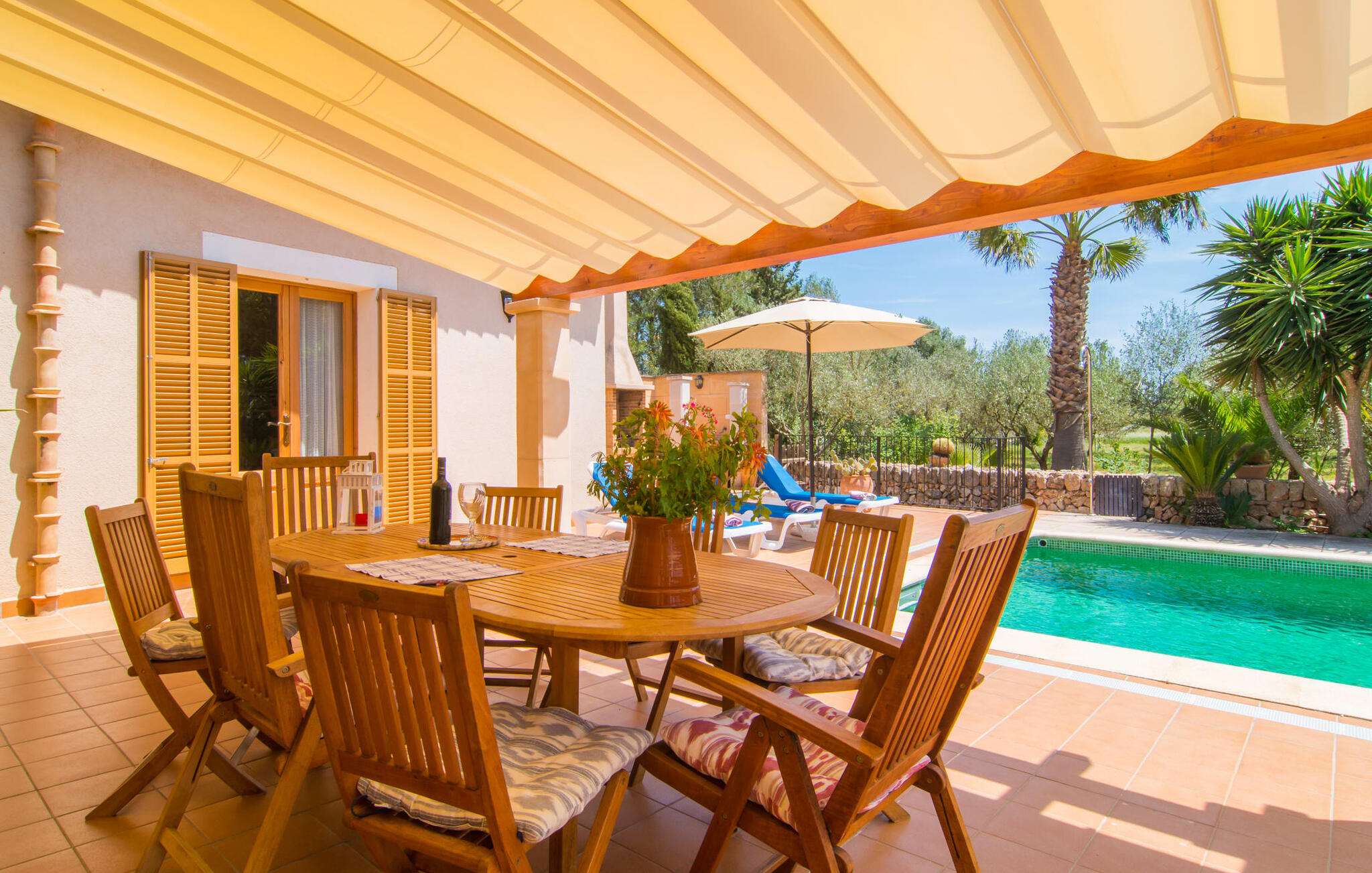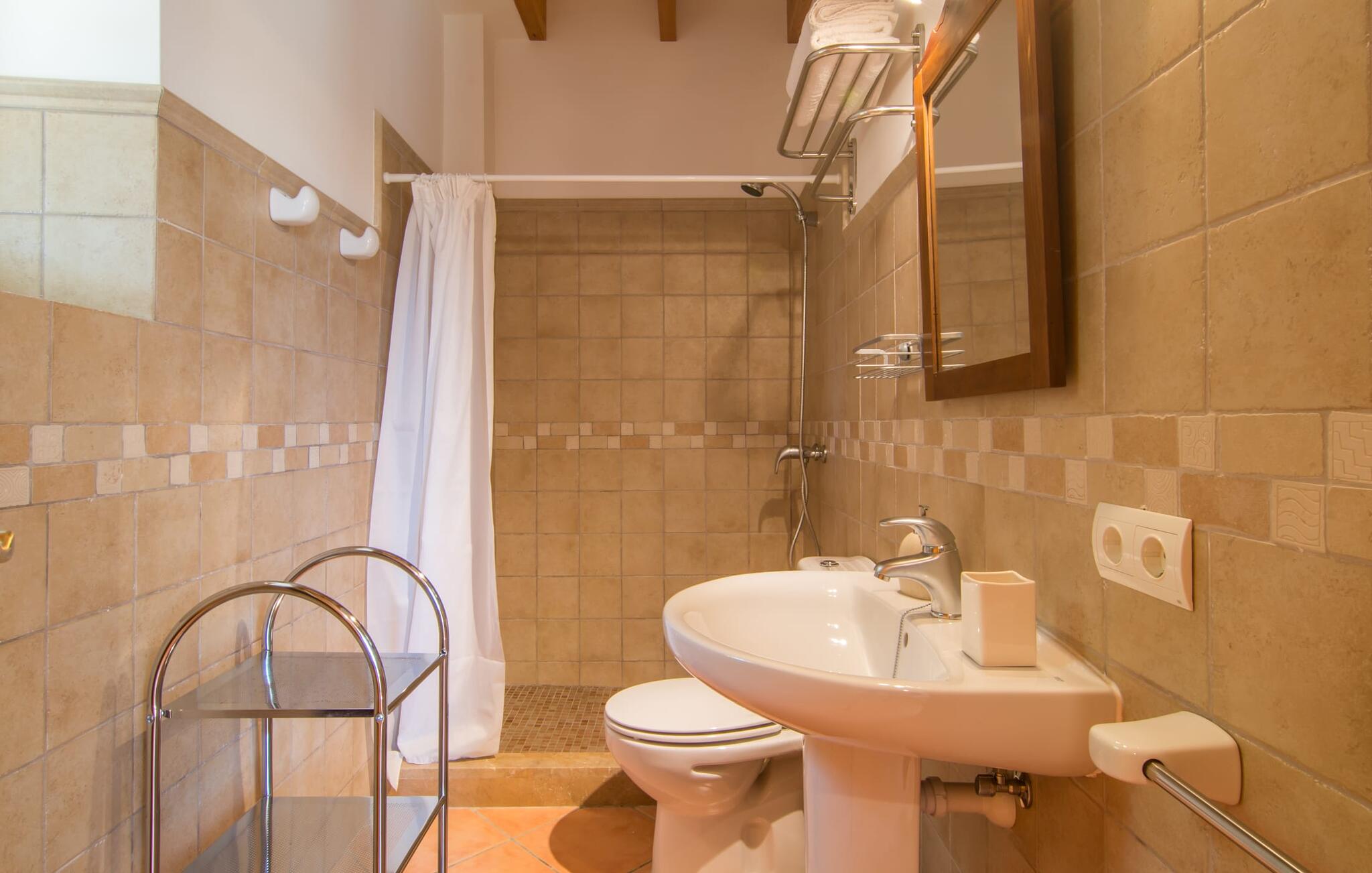 Villa Cas Padrins de Campos bij Campos wordt omgeven door een idyllisch landschap en een prachtige mediterrane tuin. De buitenruimte wordt gekenmerkt door een tuin en een zwembadterras omringd door palmbomen en biedt een verscheidenheid aan aantrekkelijke plekken om te ontspannen. Het gazon is een geweldige plek voor kinderen om te spelen. Er is zelfs een kleine glijbaan voor de kleintjes. Begeleidende ouders kunnen ernaast ontspannen of in het grote zwembad, dat ook ideaal is voor waterspelletjes en spetteren. Als je niet in het koele water wilt springen, kun je gemakkelijk bij het zwembad komen via een halfronde trap. Je kunt dan ontspannen en zonnebaden op een van de ligstoelen. Twee grote parasols zorgen voor schaduw, zodat je naar hartenlust kunt chillen en gewoon ontspannen. Twee overdekte terrassen bieden een luchtige zithoek met uitzicht op de prachtig onderhouden tuin. Bij mooi weer kun je samen genieten van alle maaltijden aan een indrukwekkende houten eettafel. Voor een hartige maaltijd is er een gemetselde barbecue waar je naar eigen smaak verse lokale lekkernijen kunt bereiden.