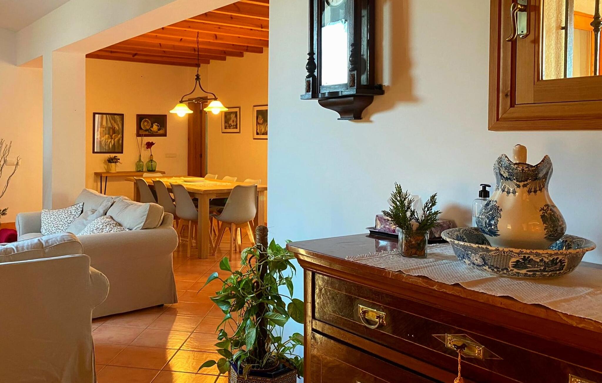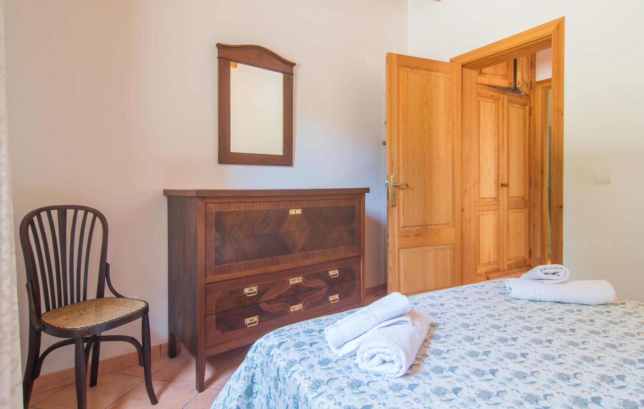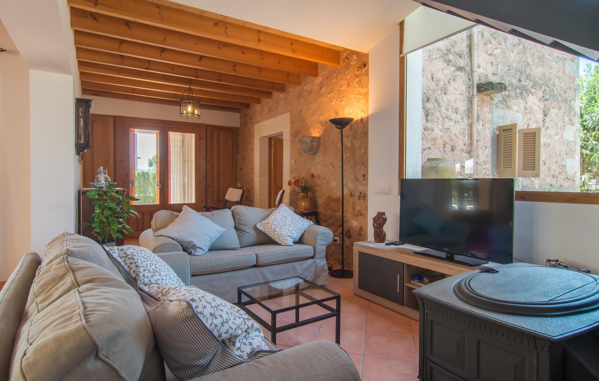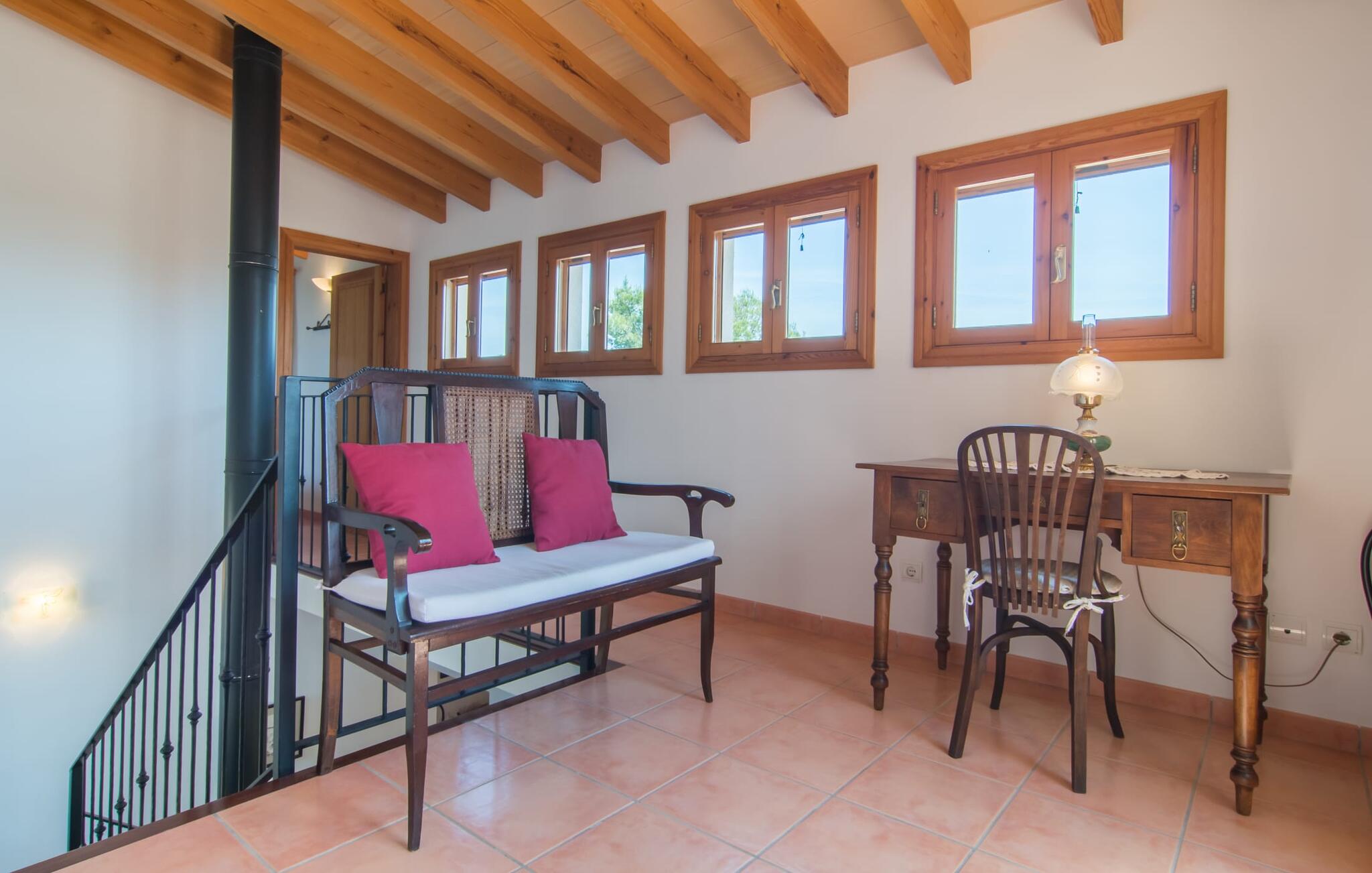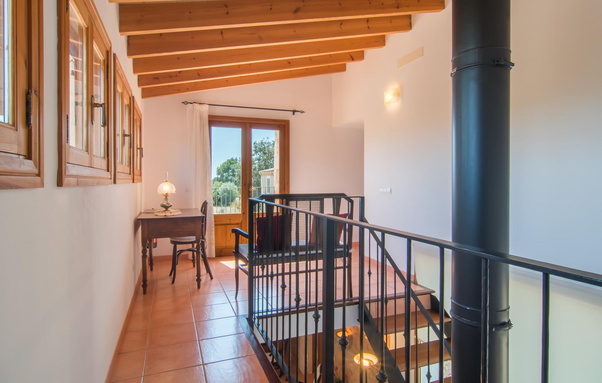 Klassiek, traditioneel en Mallorcaans zijn de woorden die het interieur van de villa het best omschrijven. Maar als je meteen denkt aan iets donkers, ouds en rustieks, dan heb je het mis. Hoewel hout het dominante element is in de villa in de vorm van plafonds, ramen, deuren en de inrichting, is het huis in uitstekende staat, schoon, licht, modern en eigentijds. Verdere stijlelementen op beide verdiepingen zijn een betegelde terracotta vloer en overal lichtgekleurde muren. De gedeeltelijk ongepleisterde muren van breuksteen, oudere meubels en een gietijzeren kachel, waarvan de pijp vanuit de woonkamer via de galerij op de eerste verdieping naar het dak loopt, zorgen voor aantrekkelijke accenten. Op de begane grond bevinden zich naast de entree een open eet- en woonkamer, een goed uitgeruste keuken met toegang tot het terras bij het zwembad, twee tweepersoonsslaapkamers en twee badkamers (waarvan één en-suite). Een aangrenzende galerij naast de woonkamer, nog twee tweepersoonsslaapkamers en een badkamer ronden het interieur op de bovenverdieping af. Het dakterras met prachtig panoramisch uitzicht op het omliggende platteland is de kers op de taart. Idyllisch, landelijk en afgelegen ligt de traditionele steengroeve villa Cas Padrins de Campos op slechts 4 km ten zuidoosten van Campos in het zuiden van het eiland. Verschillende supermarkten zijn te vinden in het dichtstbijzijnde dorp, dat op slechts 10 minuten rijden ligt. Op donderdag en zaterdag is er markt. De paradijselijke stranden van de zuid- en zuidoostkust, zoals het natuurlijke strand van Es Trenc of Cala Mondragó, liggen op slechts een klein eindje rijden. De hoofdstad van het eiland, Palma, en het vliegveld zijn ook snel te bereiken via de nabijgelegen snelweg Ma-19.