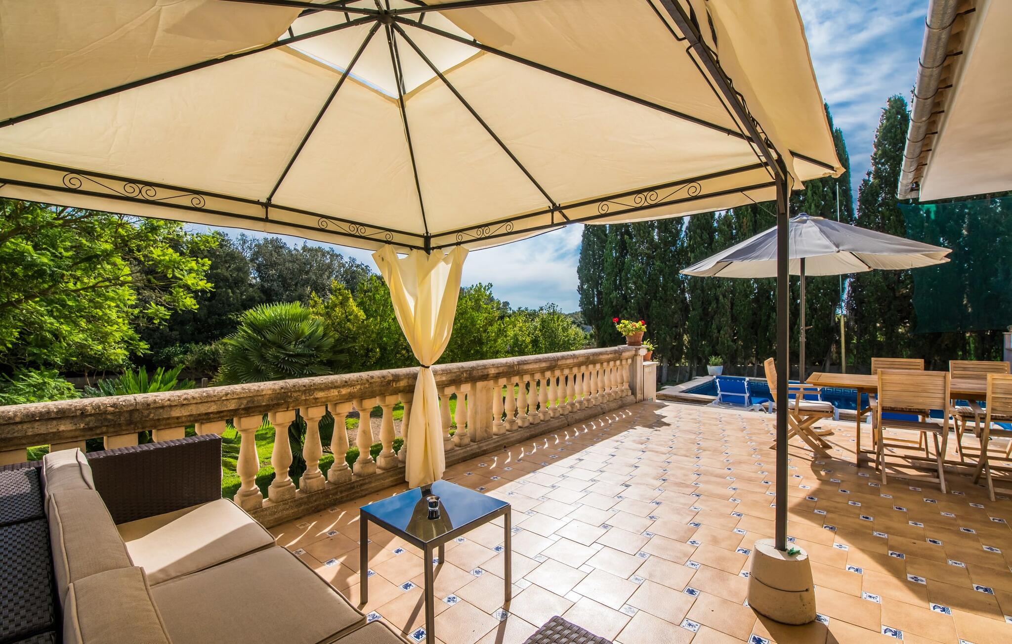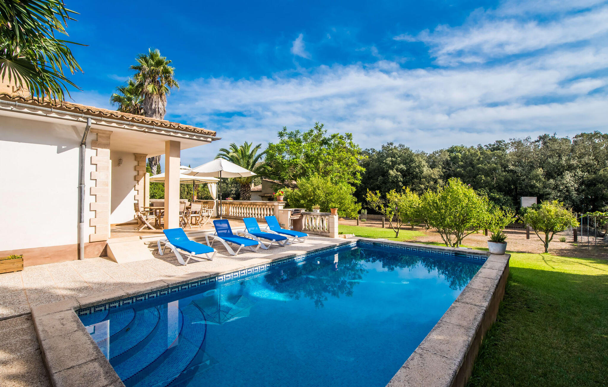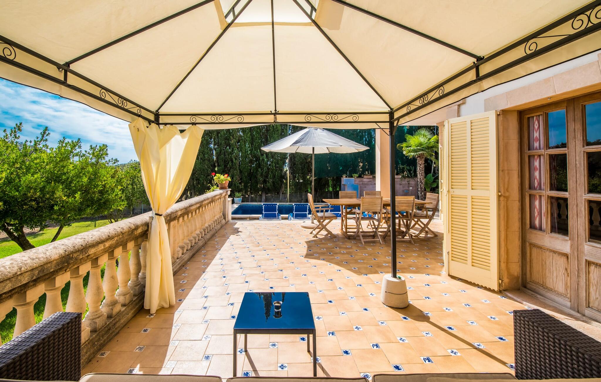 Hoge palmbomen en mediterrane bomen kenmerken de buitenruimte van deze boerderij bij Artà in het oosten van het eiland. De ligweide en het zwembad met blauw mozaïek en ligstoelen bieden volop mogelijkheden om tijd buiten door te brengen. Een tent met bank en fauteuil wacht op je op het terras en een eettafel onder de veranda. Er is zelfs een tweede eettafel aan de andere kant, zodat je op elk moment van de dag de ideale plek kunt kiezen.
