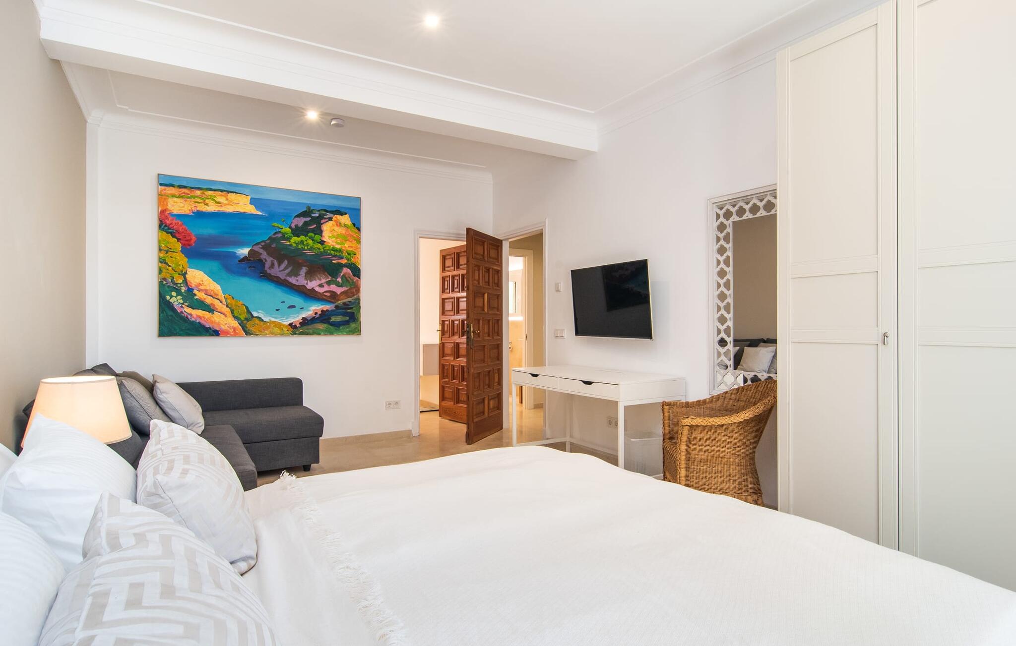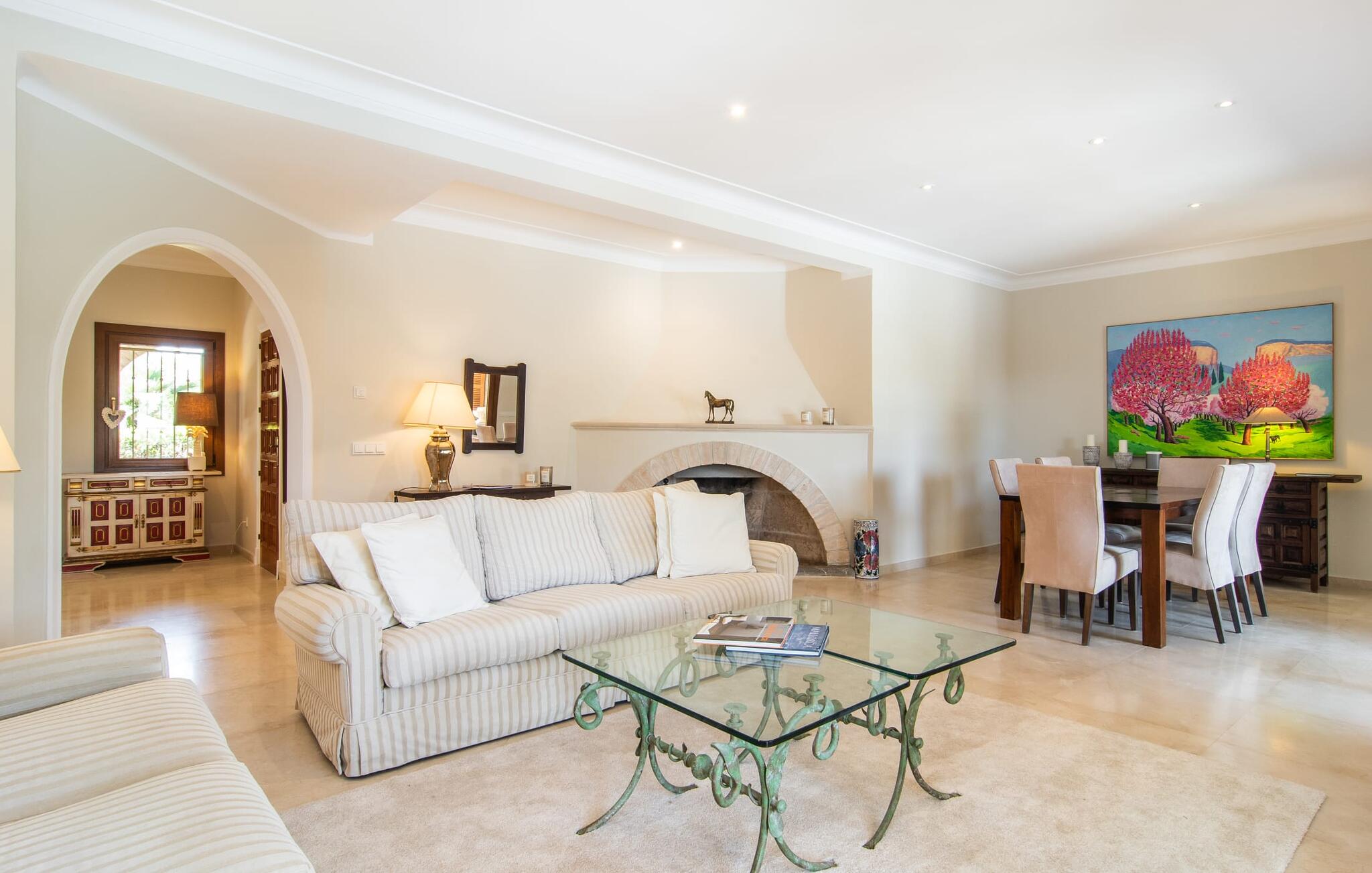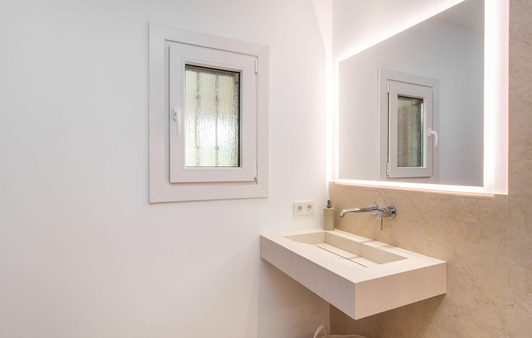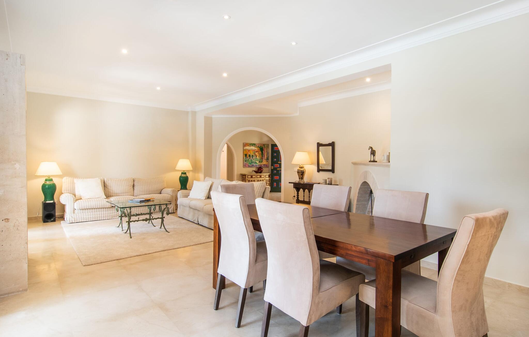 Vanaf het overdekte terras leiden verschillende ramen van vloer tot plafond rechtstreeks naar verschillende delen van het huis. De standaard is consequent gehandhaafd in het interieur en strekt zich ook uit tot alle buitenruimtes. Lichtgekleurde vloeren, muren, plafonds en stoffen, evenals zorgvuldig geselecteerde, stijlvolle accessoires die de sfeer effectief oppeppen, kenmerken de woonflair. De gecombineerde woon- en eetkamer is een geweldige plek om tijd door te brengen met je medereizigers en toch verschillende activiteiten te kunnen ondernemen. Ernaast ligt de ruime, volledig uitgeruste keuken, die ook een uitgang heeft naar het terras. Drie mooie tweepersoonsslaapkamers bieden heerlijke eilanden van rust voor rustgevende vakantienachten. Drie badkamers met douche, waarvan twee en suite, ronden de ruimtelijkheid van deze villa op Mallorca af, die we aanraden aan iedereen voor wie de nabijheid van de zee en superieur comfort bovenaan het verlanglijstje staan.