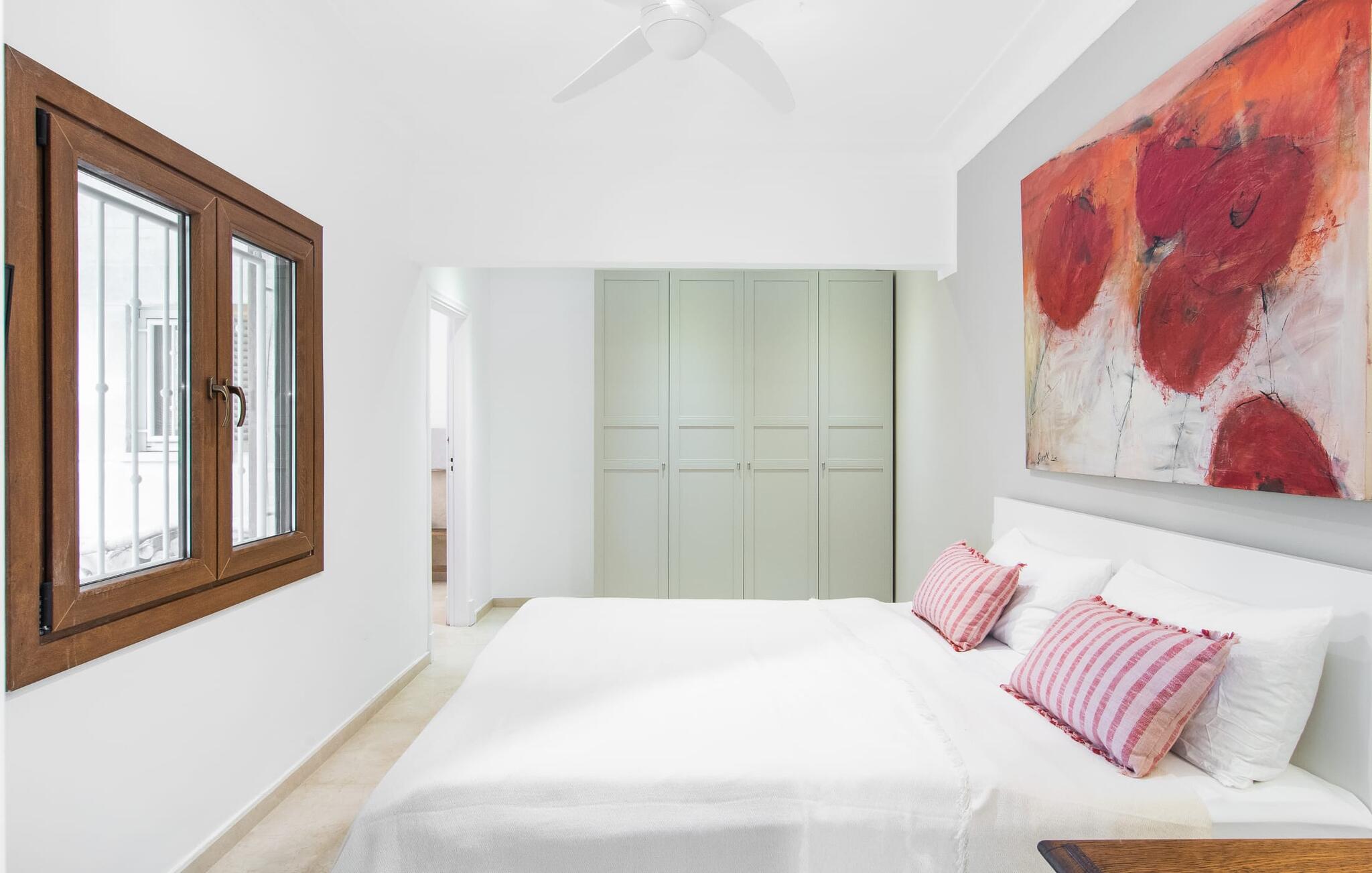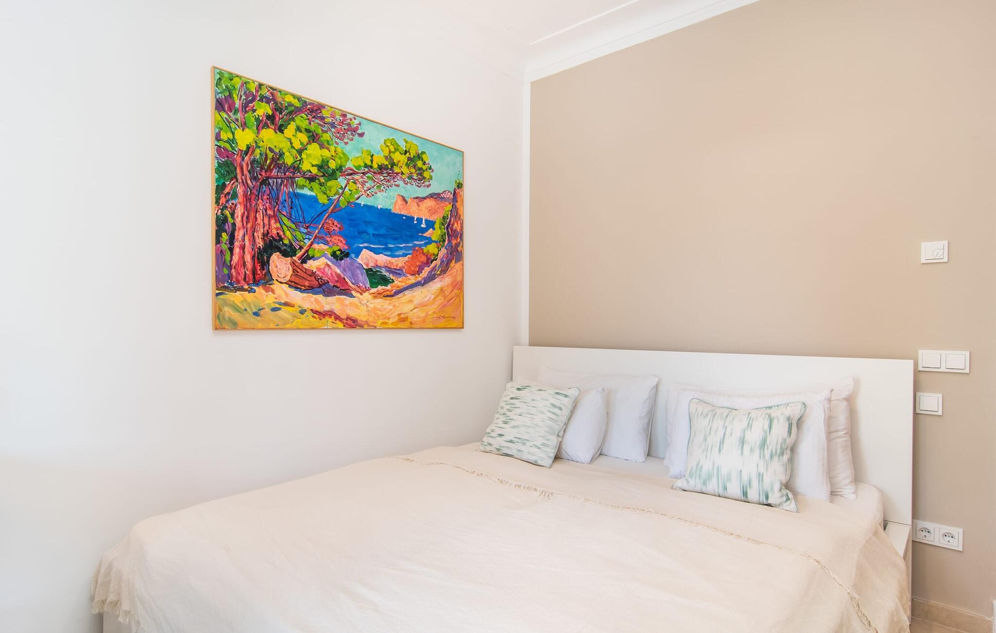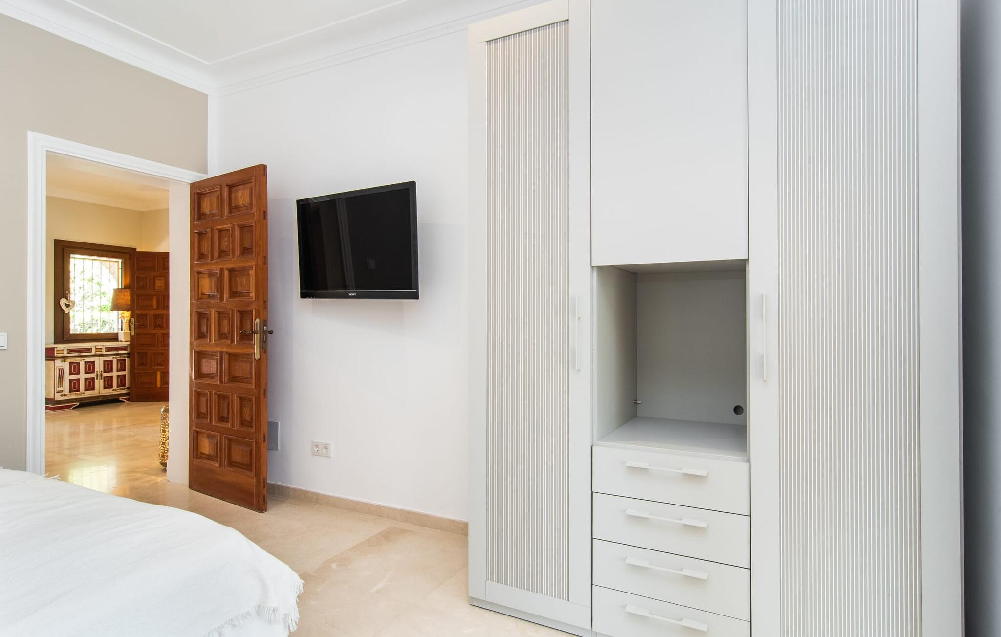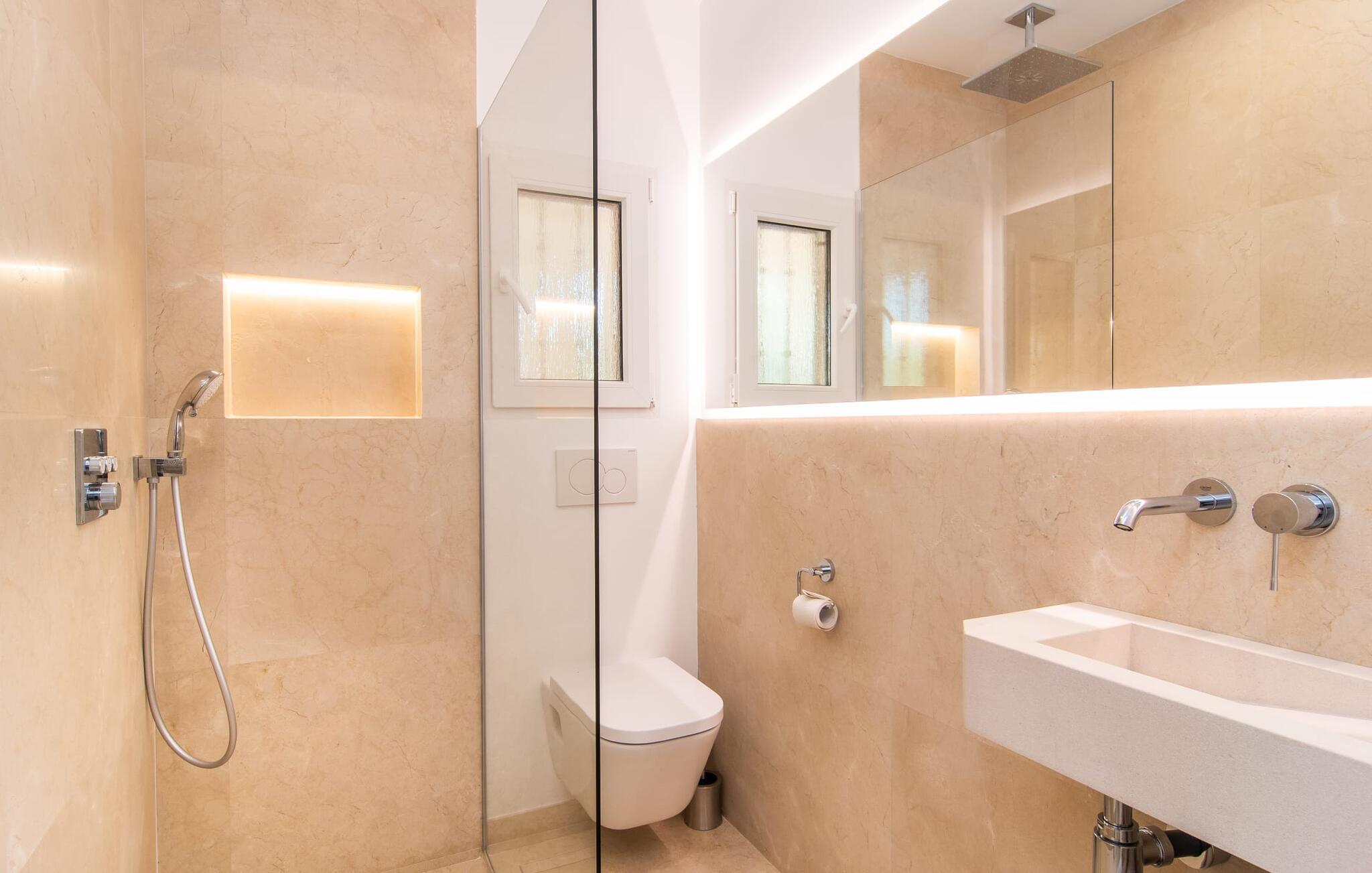 Vanaf het overdekte terras leiden verschillende ramen van vloer tot plafond rechtstreeks naar verschillende delen van het huis. De standaard is consequent gehandhaafd in het interieur en strekt zich ook uit tot alle buitenruimtes. Lichtgekleurde vloeren, muren, plafonds en stoffen, evenals zorgvuldig geselecteerde, stijlvolle accessoires die de sfeer effectief oppeppen, kenmerken de woonflair. De gecombineerde woon- en eetkamer is een geweldige plek om tijd door te brengen met je medereizigers en toch verschillende activiteiten te kunnen ondernemen. Ernaast ligt de ruime, volledig uitgeruste keuken, die ook een uitgang heeft naar het terras. Drie mooie tweepersoonsslaapkamers bieden heerlijke eilanden van rust voor rustgevende vakantienachten. Drie badkamers met douche, waarvan twee en suite, ronden de ruimtelijkheid van deze villa op Mallorca af, die we aanraden aan iedereen voor wie de nabijheid van de zee en superieur comfort bovenaan het verlanglijstje staan.