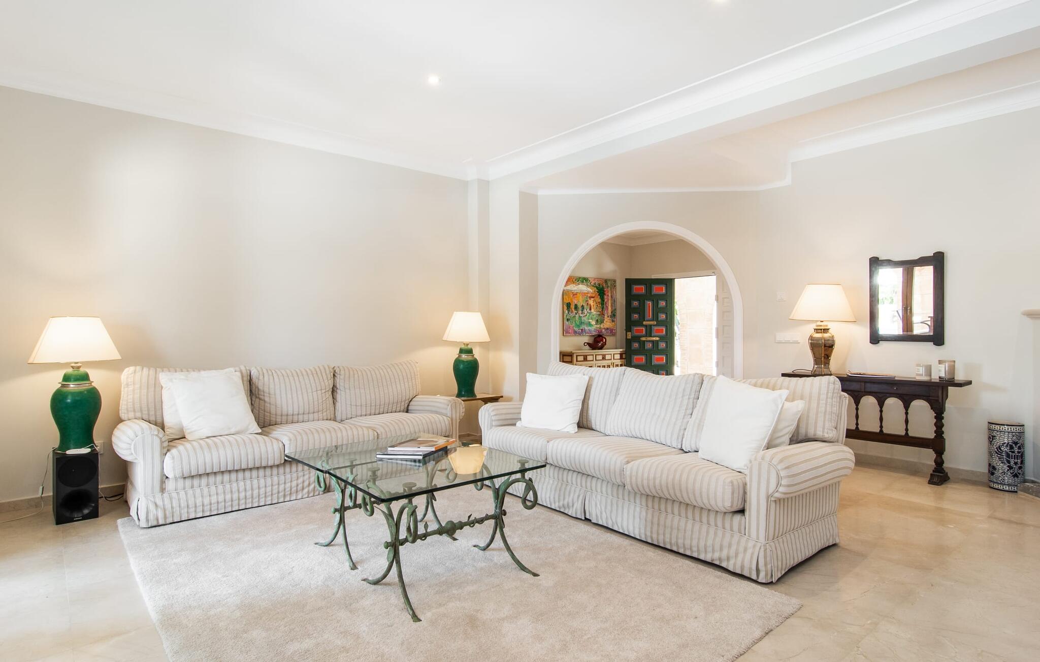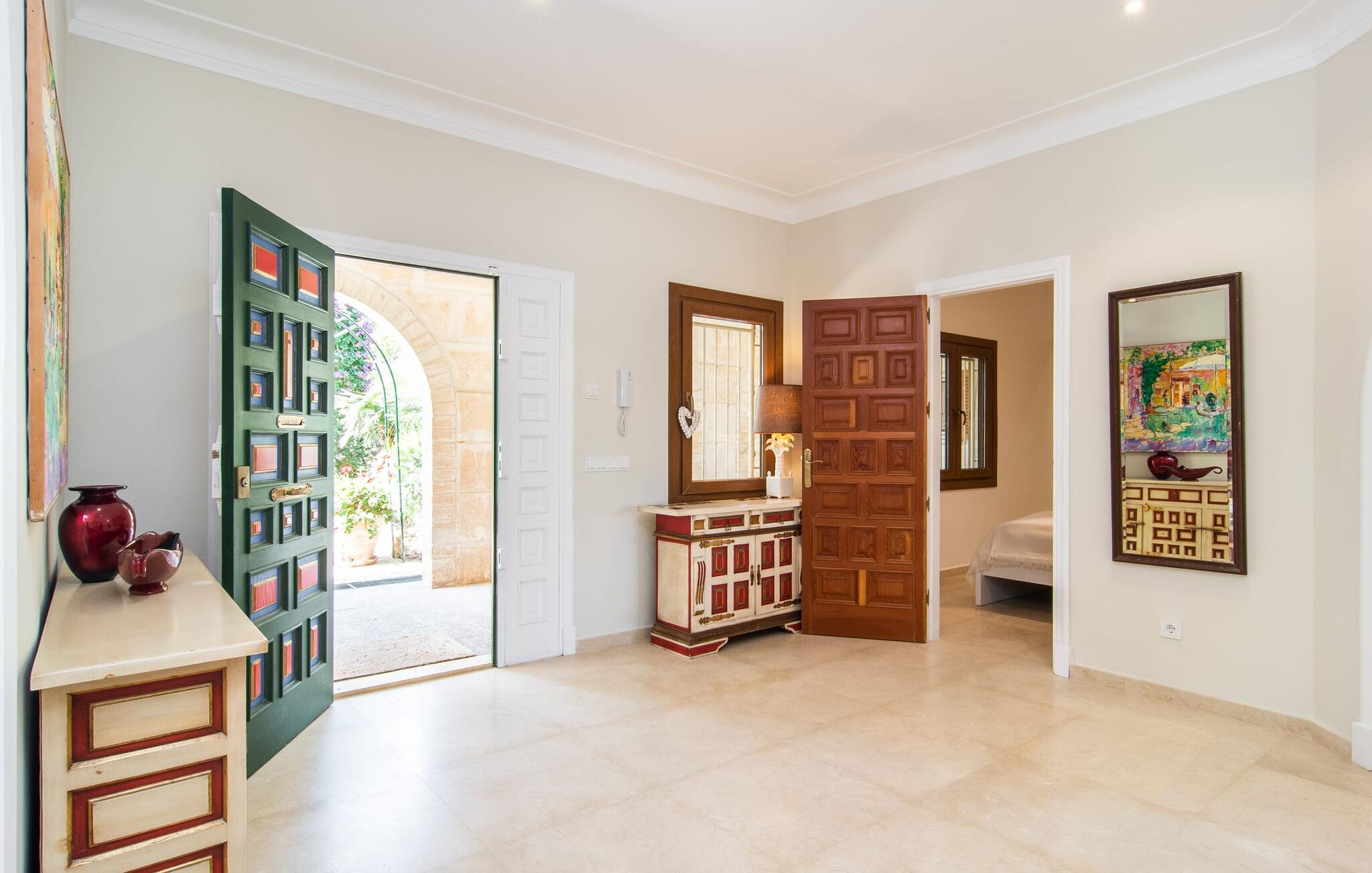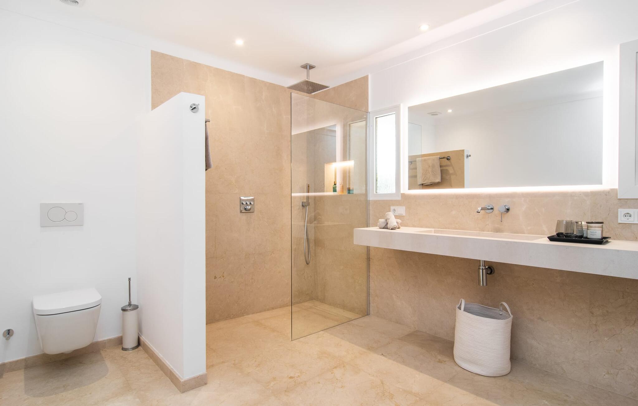 Een prachtig aangelegde, ruime tuin is het middelpunt van deze villa van hoge kwaliteit op Mallorca, die hoog scoort op het gebied van design en inrichting. Betegelde gebieden, gazons en mooie paden kenmerken het terrein, samen met een prachtige pracht aan mediterrane planten. Liefhebbers van buiten chillen komen hier aan hun trekken: overdekte en openlucht terrassen, een overdekt gedeelte met luifels, een chill-out lounge en, last but not least, natuurlijk de prachtige ligweiden bij het zwembad nodigen je uit om je vakantieleven overdag volledig naar buiten te verplaatsen en van het ene favoriete plekje naar het andere te wandelen. Wat je altijd bij je moet hebben is het juiste drankje om af en toe van te nippen. Buiten zijn er ook uitstekende culinaire mogelijkheden. Twee verschillende barbecues en een pizzaoven nodigen je uit om te genieten van stevige uitjes in je eigen koninkrijk. Zwemliefhebbers zullen blij zijn met de indrukwekkende afmetingen van het zwembad, dat ook een praktische buitendouche heeft.