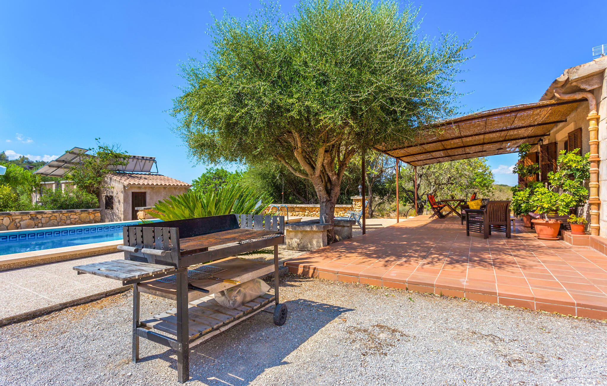 Je kunt je auto parkeren in de carport en genieten van voldoende ruimte voor spelletjes zoals jeu de boules direct voor het huis. Geniet van het adembenemende uitzicht over de velden en plantages vanaf de dakbalkons en laat je blik afdwalen naar de horizon. Dit traditioneel gebouwde landhuis heeft verschillende niveaus, schaduwrijke terrassen, een natuurlijke tuin en talloze potplanten, die allemaal bijdragen aan het unieke karakter. Het zwembad zorgt voor verfrissende ontspanning, aangevuld met een praktische buitenbadkamer. Stel je voor dat je de stevige barbecue naar je favoriete plek rolt en geniet van een heerlijke maaltijd.
