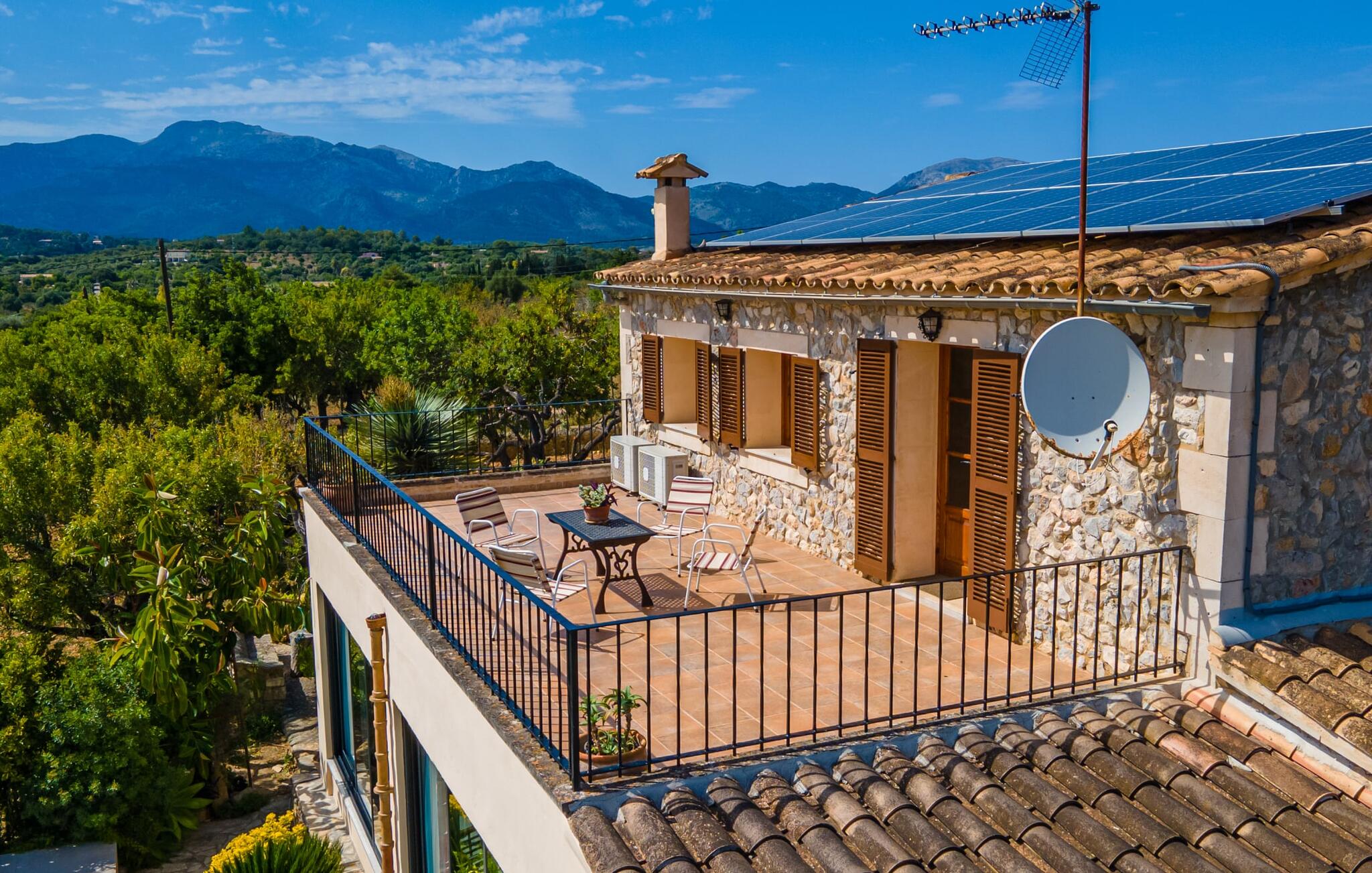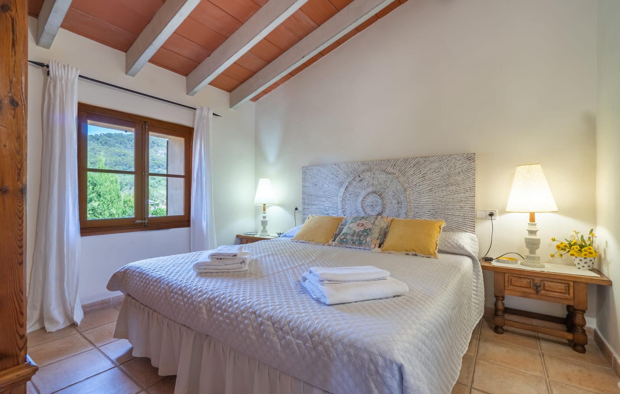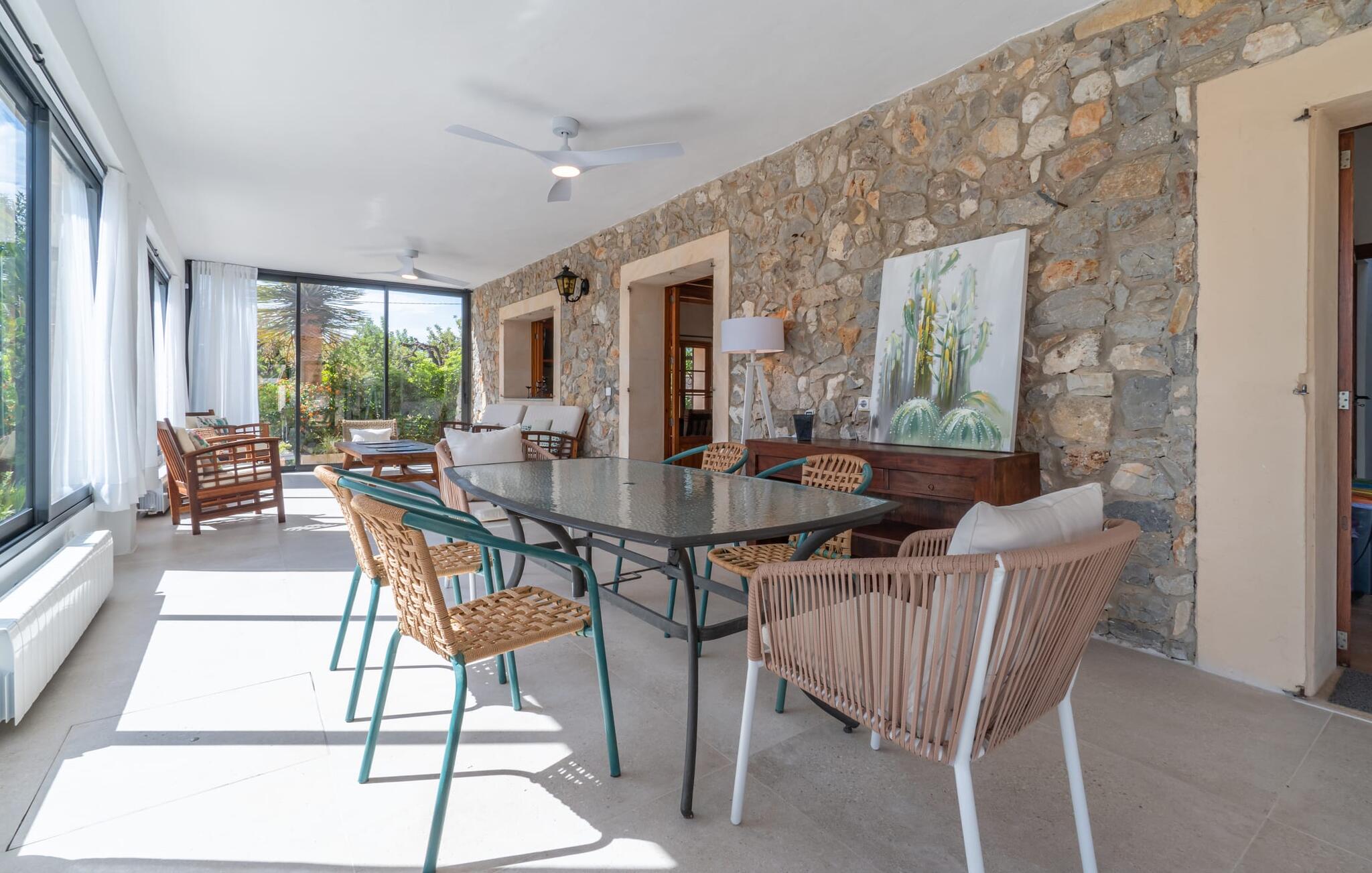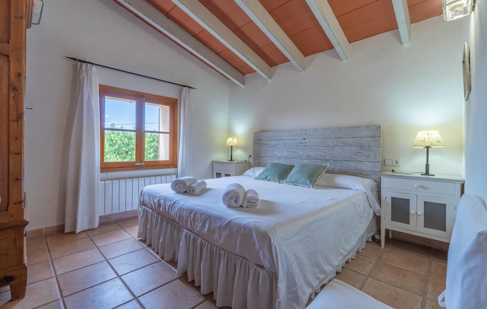 Het interieur van de 2 verdiepingen tellende villa harmonieert met de rustieke, landelijke stijl van het huis en deze fantastische omgeving. Zware houten meubels met een antiek karakter zijn ontworpen voor solide comfort. De grote, open woonkamer is uitgebreid met een eethoek. De lichte keuken heeft een volledig uitgeruste houten keuken. Een waterkoker, broodrooster, koffiezetapparaat, vaatwasser en meer - alles wat je nodig hebt voor een ontspannen vakantie is aanwezig, dus je bent goed uitgerust om je beslissing om zelf te koken waar te maken. Op de bovenste verdieping van de elegante villa is een tweede woonkamer, die wordt overspoeld met licht dankzij verschillende ramen. Comfortabele zitplaatsen onder zichtbare houten balken zijn te vinden in de lichte kamer met mooie decoratieve items zoals een geweven tapijt en groot formaat foto`s. De slaapkamers zijn allemaal voldoende uitgerust voor 2 personen en hebben elk een tweepersoonsbed of 2 eenpersoonsbedden. Gasten hebben 3 badkamers tot hun beschikking, ook met een modern design. Het huis is daarom ideaal voor een groep van maximaal 8 personen die hun tijd willen doorbrengen in een vakantiehuis dat dicht bij de natuur ligt en toch goede verbindingen heeft. Wij van Fincallorca wensen je alvast een afwisselende en ontspannen actieve vakantie toe. Deze rustieke Villa Els Ametllers ligt in een prachtige natuurlijke omgeving op de Plà de Mallorca, het weelderige groene gebied in het midden van het eiland, vlakbij de stad Inca. Dankzij de centrale en toch zeer rustige, weelderige groene ligging kun je snel je dagelijkse boodschappen doen. Vanaf de gezellige villa liggen de prachtige stranden van de noordelijke helft van het eiland op ongeveer 20-25 km afstand, bijvoorbeeld de 16 km lange keten van stranden die begint in de baai van Alcúdia.