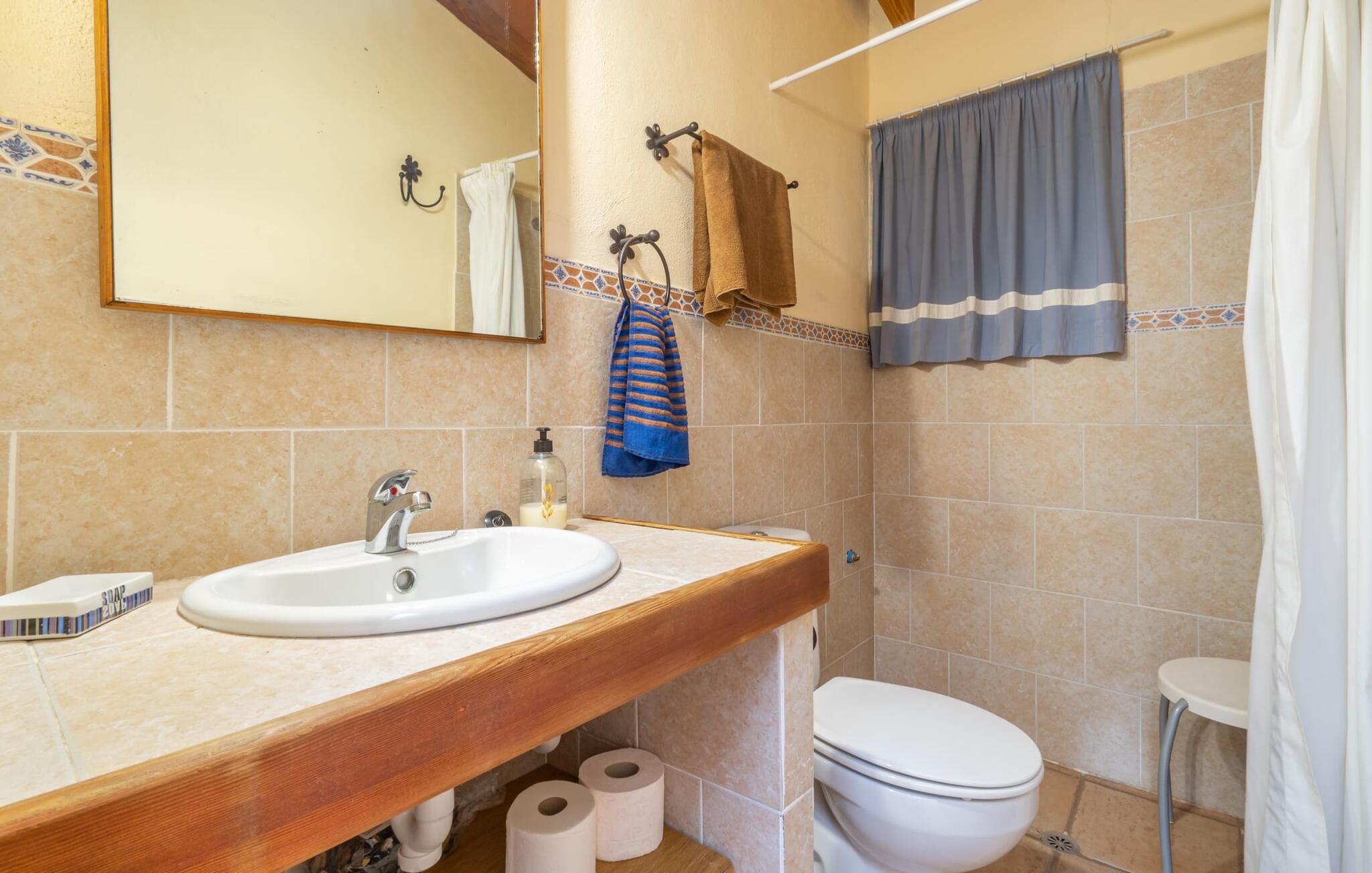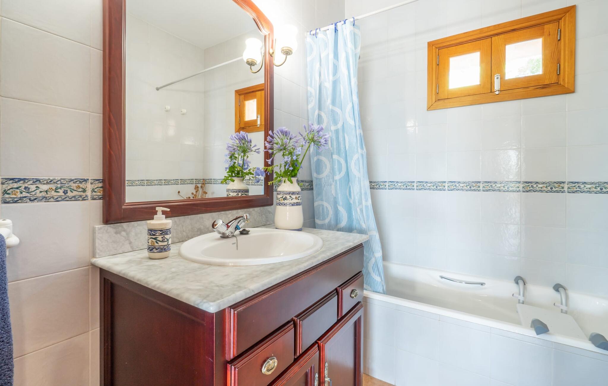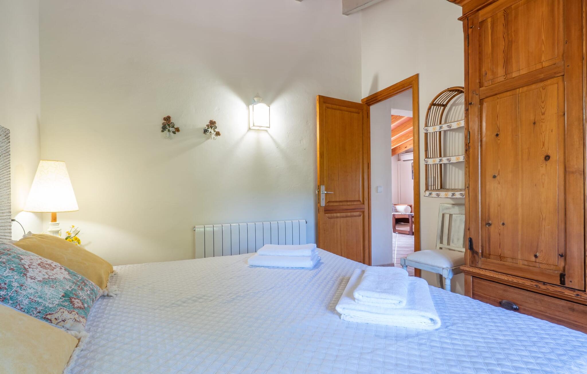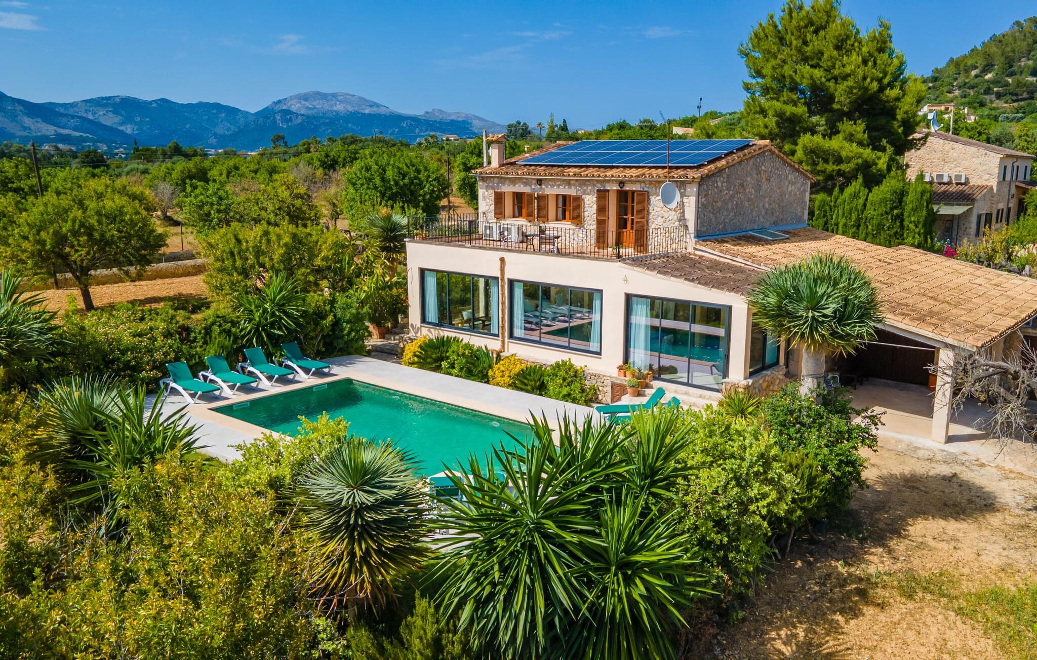 Het interieur van de 2 verdiepingen tellende villa harmonieert met de rustieke, landelijke stijl van het huis en deze fantastische omgeving. Zware houten meubels met een antiek karakter zijn ontworpen voor solide comfort. De grote, open woonkamer is uitgebreid met een eethoek. De lichte keuken heeft een volledig uitgeruste houten keuken. Een waterkoker, broodrooster, koffiezetapparaat, vaatwasser en meer - alles wat je nodig hebt voor een ontspannen vakantie is aanwezig, dus je bent goed uitgerust om je beslissing om zelf te koken waar te maken. Op de bovenste verdieping van de elegante villa is een tweede woonkamer, die wordt overspoeld met licht dankzij verschillende ramen. Comfortabele zitplaatsen onder zichtbare houten balken zijn te vinden in de lichte kamer met mooie decoratieve items zoals een geweven tapijt en groot formaat foto`s. De slaapkamers zijn allemaal voldoende uitgerust voor 2 personen en hebben elk een tweepersoonsbed of 2 eenpersoonsbedden. Gasten hebben 3 badkamers tot hun beschikking, ook met een modern design. Het huis is daarom ideaal voor een groep van maximaal 8 personen die hun tijd willen doorbrengen in een vakantiehuis dat dicht bij de natuur ligt en toch goede verbindingen heeft. Wij van Fincallorca wensen je alvast een afwisselende en ontspannen actieve vakantie toe. Deze rustieke Villa Els Ametllers ligt in een prachtige natuurlijke omgeving op de Plà de Mallorca, het weelderige groene gebied in het midden van het eiland, vlakbij de stad Inca. Dankzij de centrale en toch zeer rustige, weelderige groene ligging kun je snel je dagelijkse boodschappen doen. Vanaf de gezellige villa liggen de prachtige stranden van de noordelijke helft van het eiland op ongeveer 20-25 km afstand, bijvoorbeeld de 16 km lange keten van stranden die begint in de baai van Alcúdia.