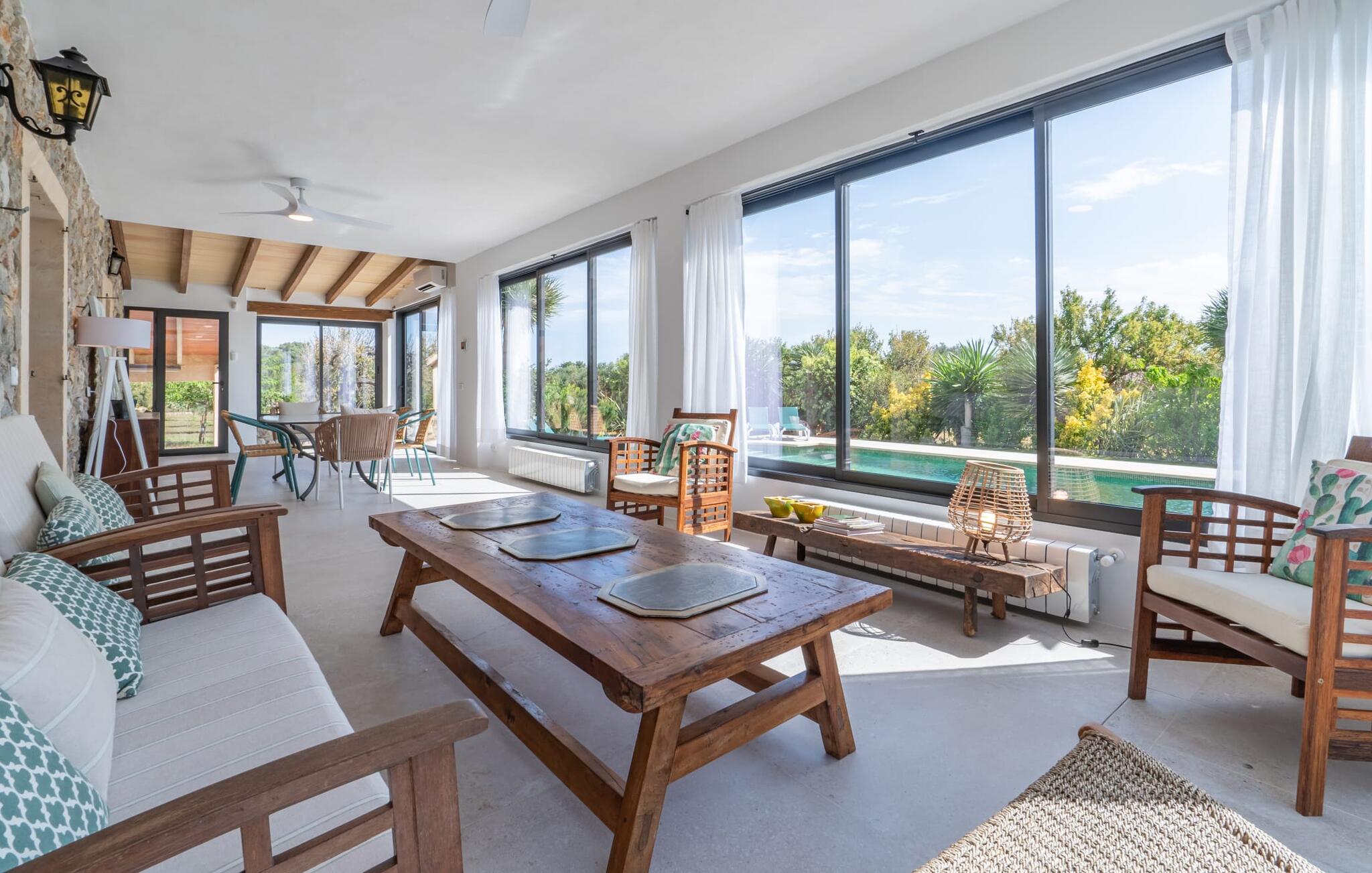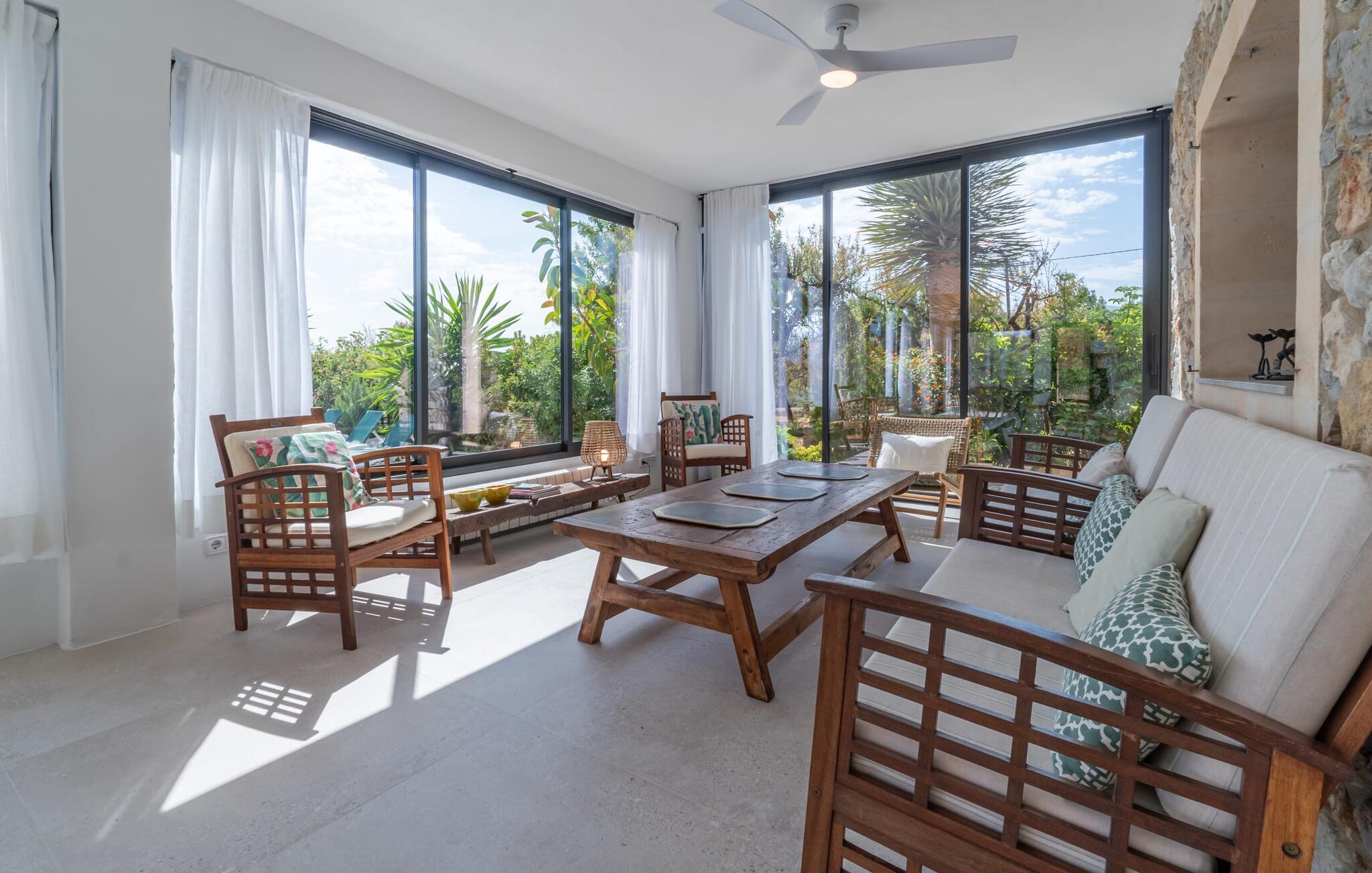 Er valt ook veel te zeggen over de prachtig gelegen Villa Els Ametllers zelf. We houden vooral van de buitenruimte van de villa. Niet alleen het azuurblauwe zwembad, omgeven door een natuurstenen terras en zachtjes bereikbaar via een trapje, is echt fantastisch; ook de vele zitmogelijkheden in de buitenruimte zijn indrukwekkend. Eigenlijk kun je zeggen dat de leefruimtes zich uitstrekken over het ommuurde terras. De vele banken zijn prachtig opgesteld als balustrades aan de rand van het terras. De lichte gordijnen in warme beige tinten bieden schaduw wanneer dat nodig is. Een glazen tafel met comfortabele stoelen zorgt voor een geweldige eethoek buiten. Het grote terras biedt zoveel ruimte dat er ook plaats is voor een koele loungeset naast de historische, bakstenen fontein. Een kleine table-pour-deux is beschikbaar voor je ochtendkoffie. Boven dit prachtige terras is een groot zonnig balkon van dezelfde grootte. Hier is nog een zithoek met 4 stoelen, geschikt om `s avonds te relaxen of overdag te zonnebaden. Vanaf hier kun je comfortabel genieten van het uitzicht op de prachtige groene Plà en de bergen.