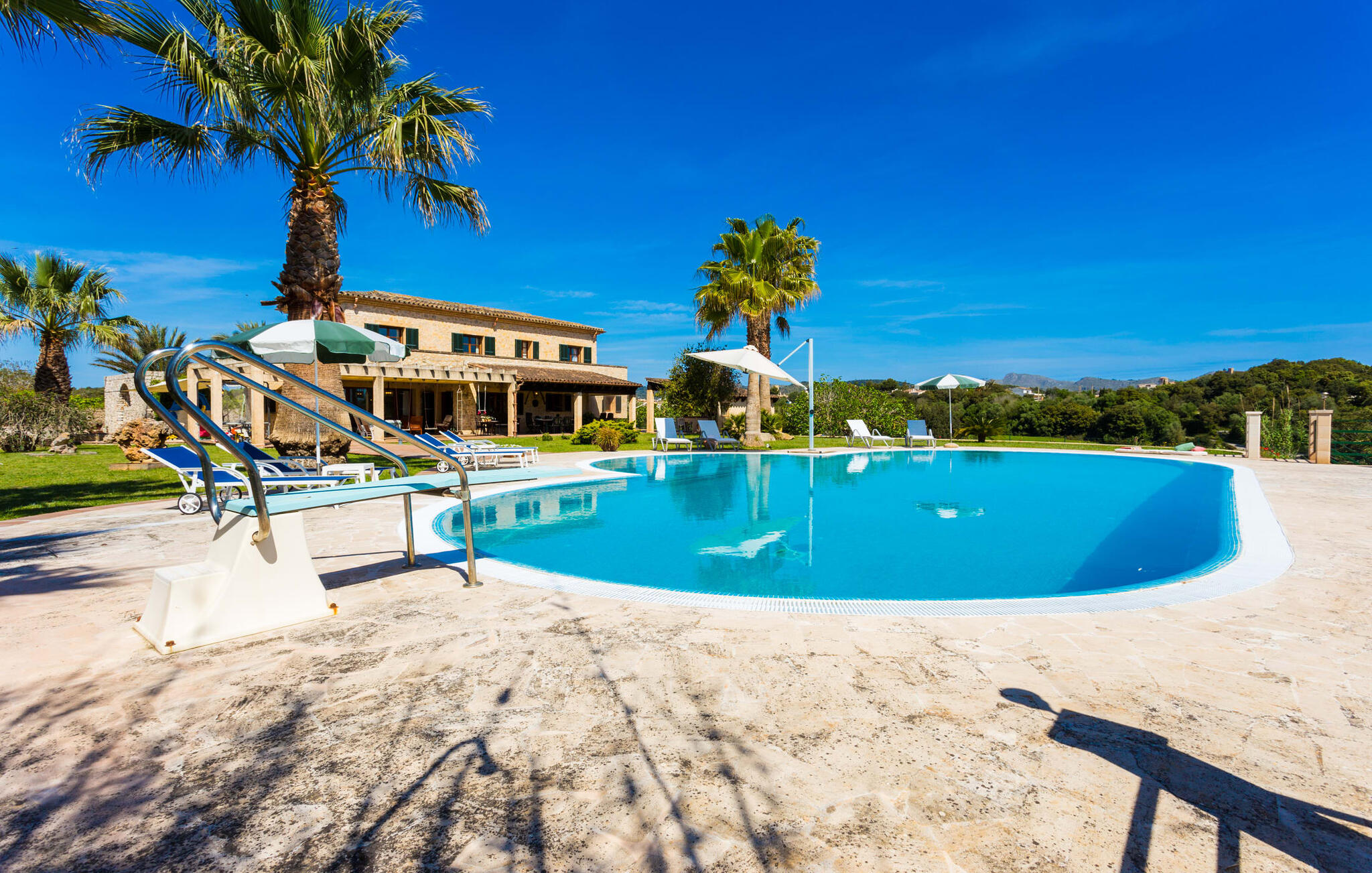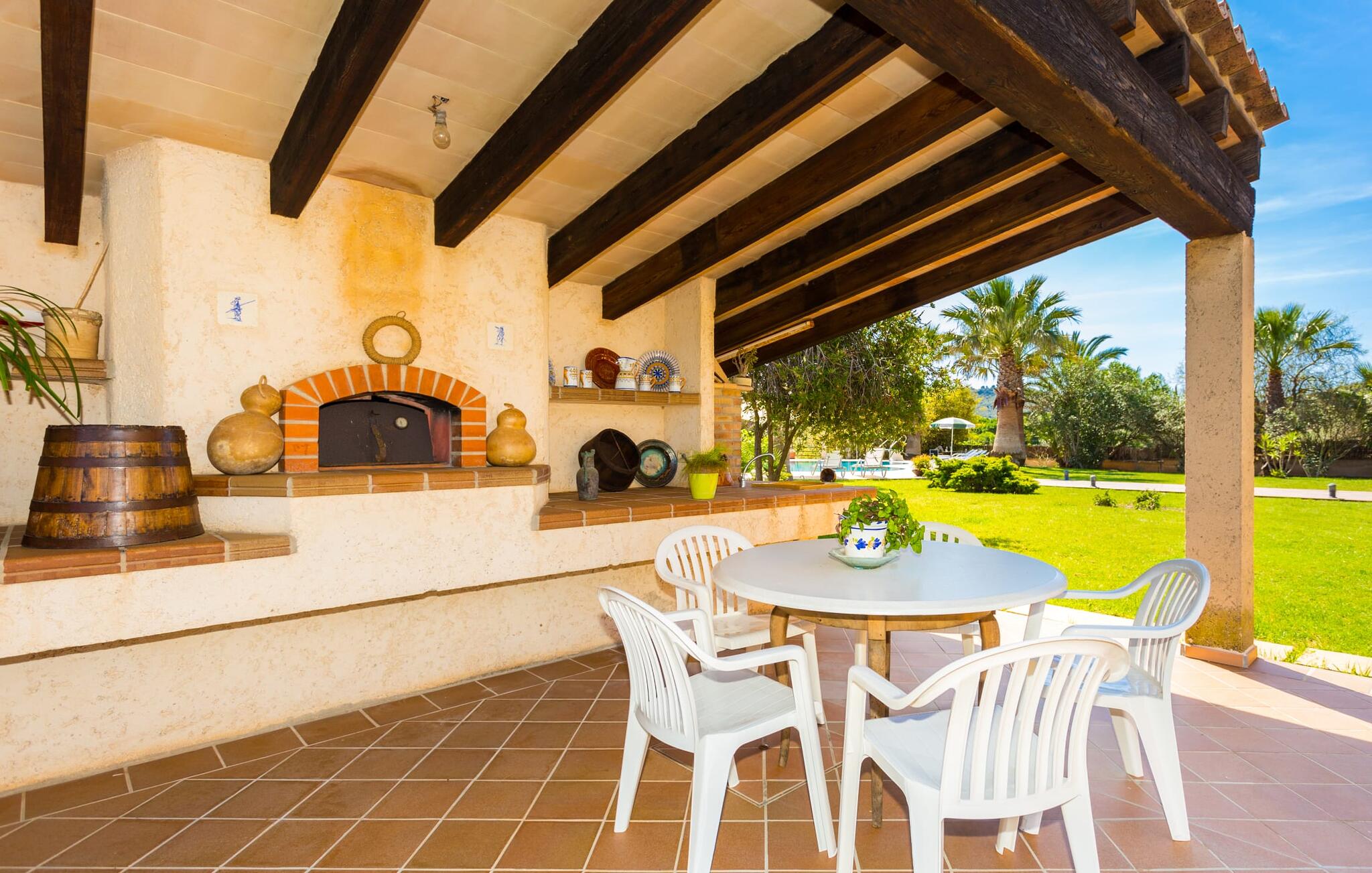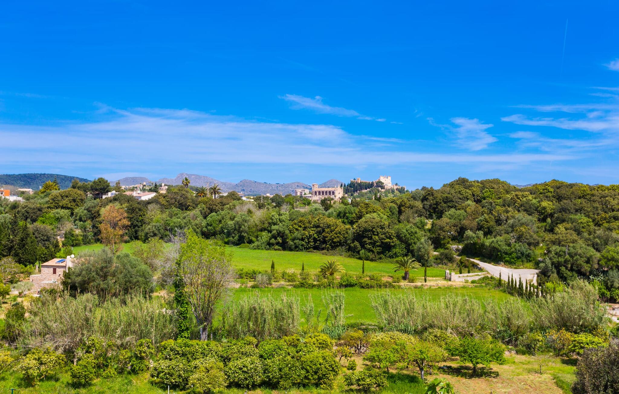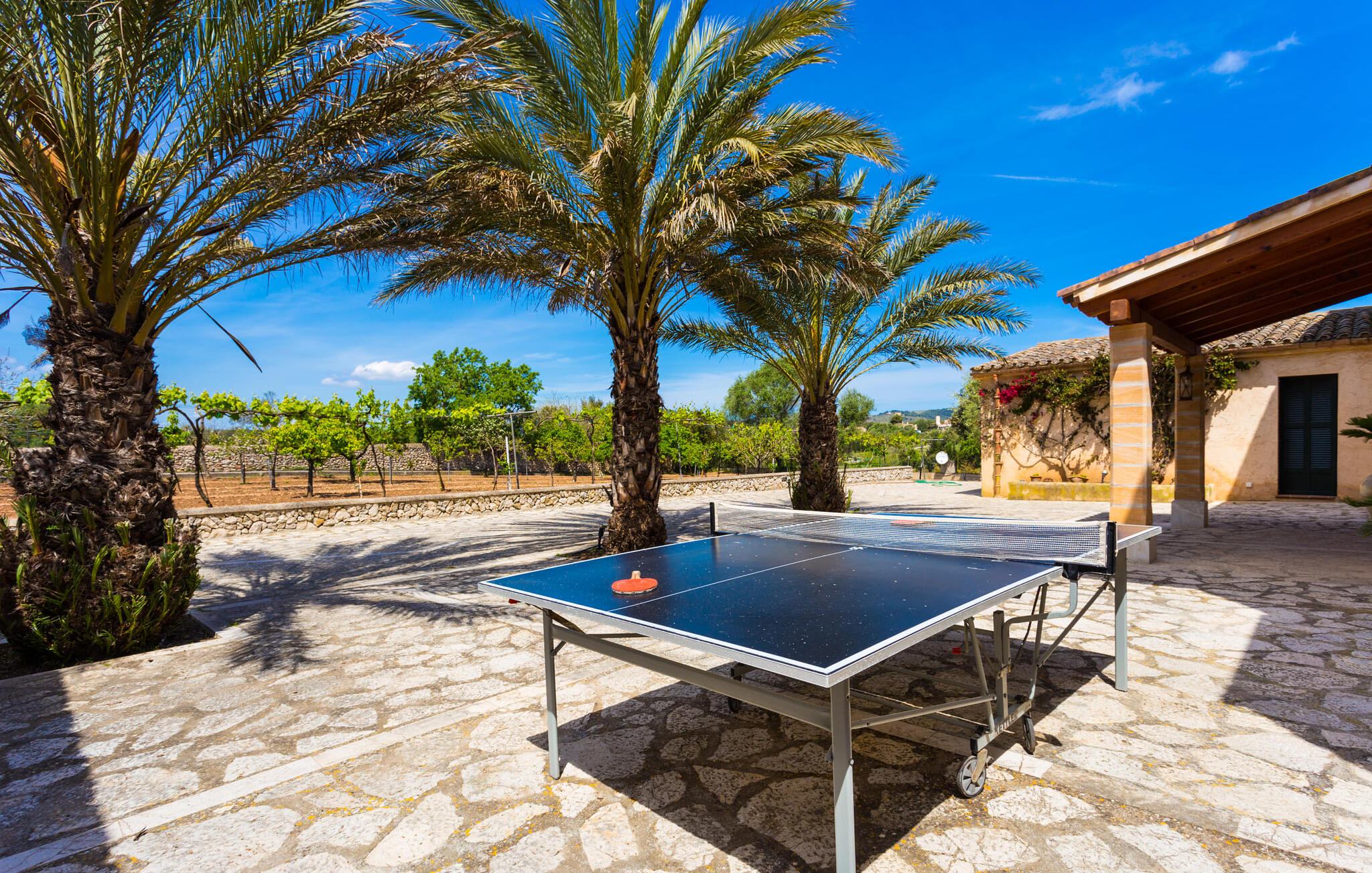 Als je de finca "Els Mitjans" nadert, vallen meteen de hoge palmbomen op die een tropisch tintje geven aan de rustige omgeving.