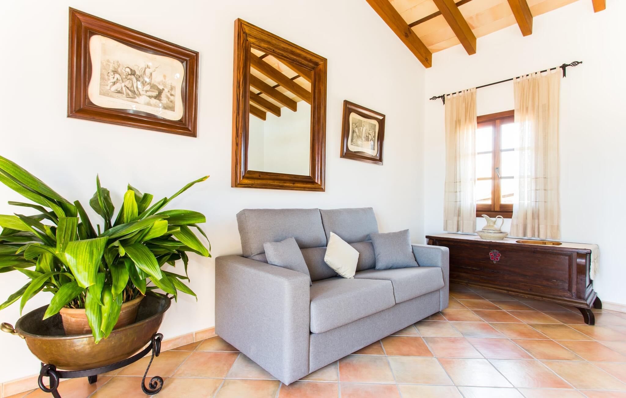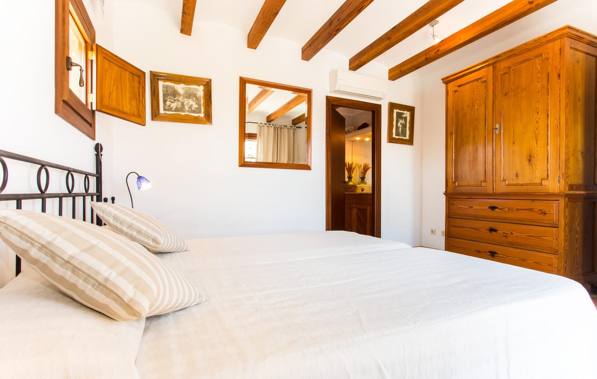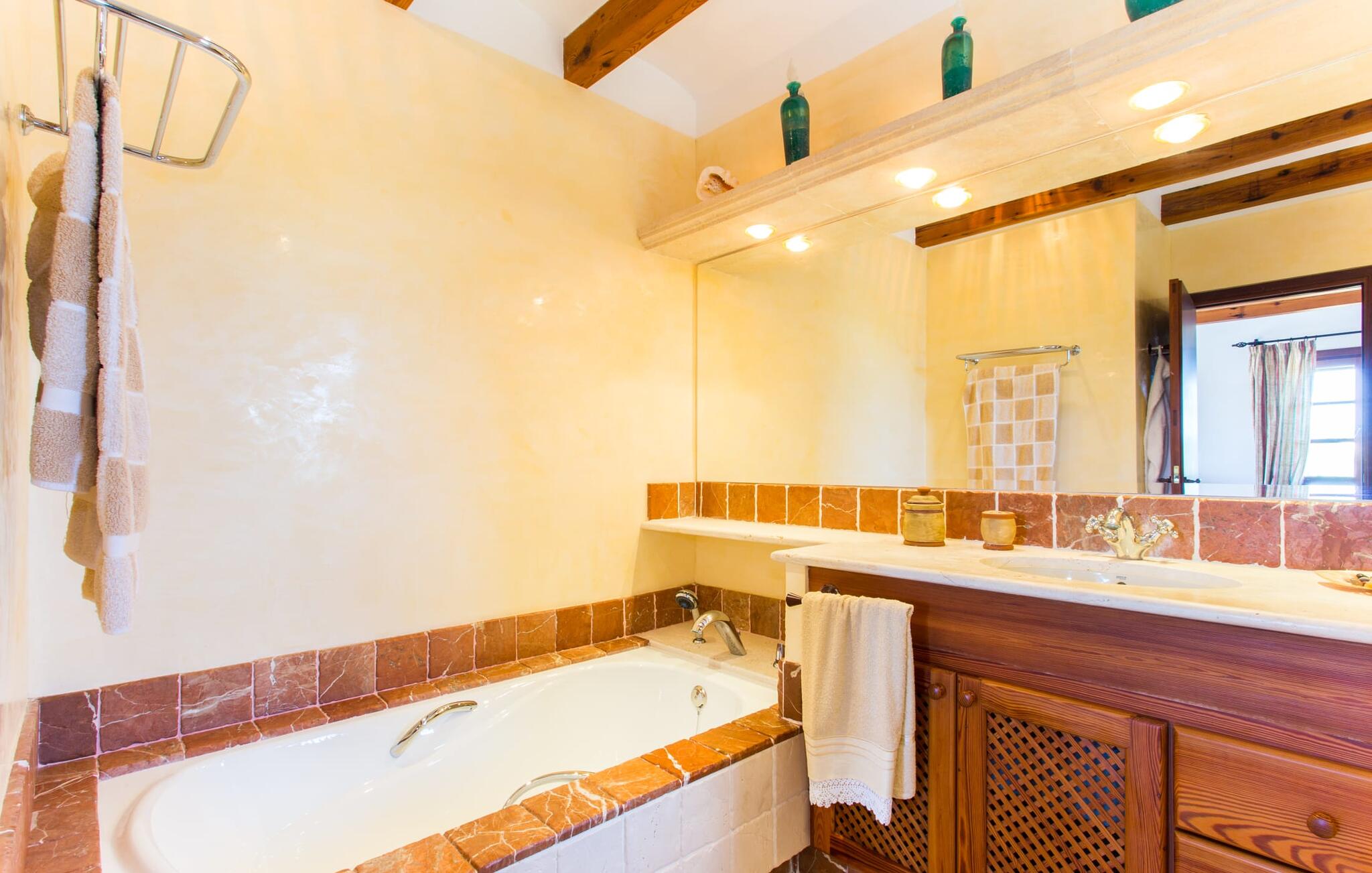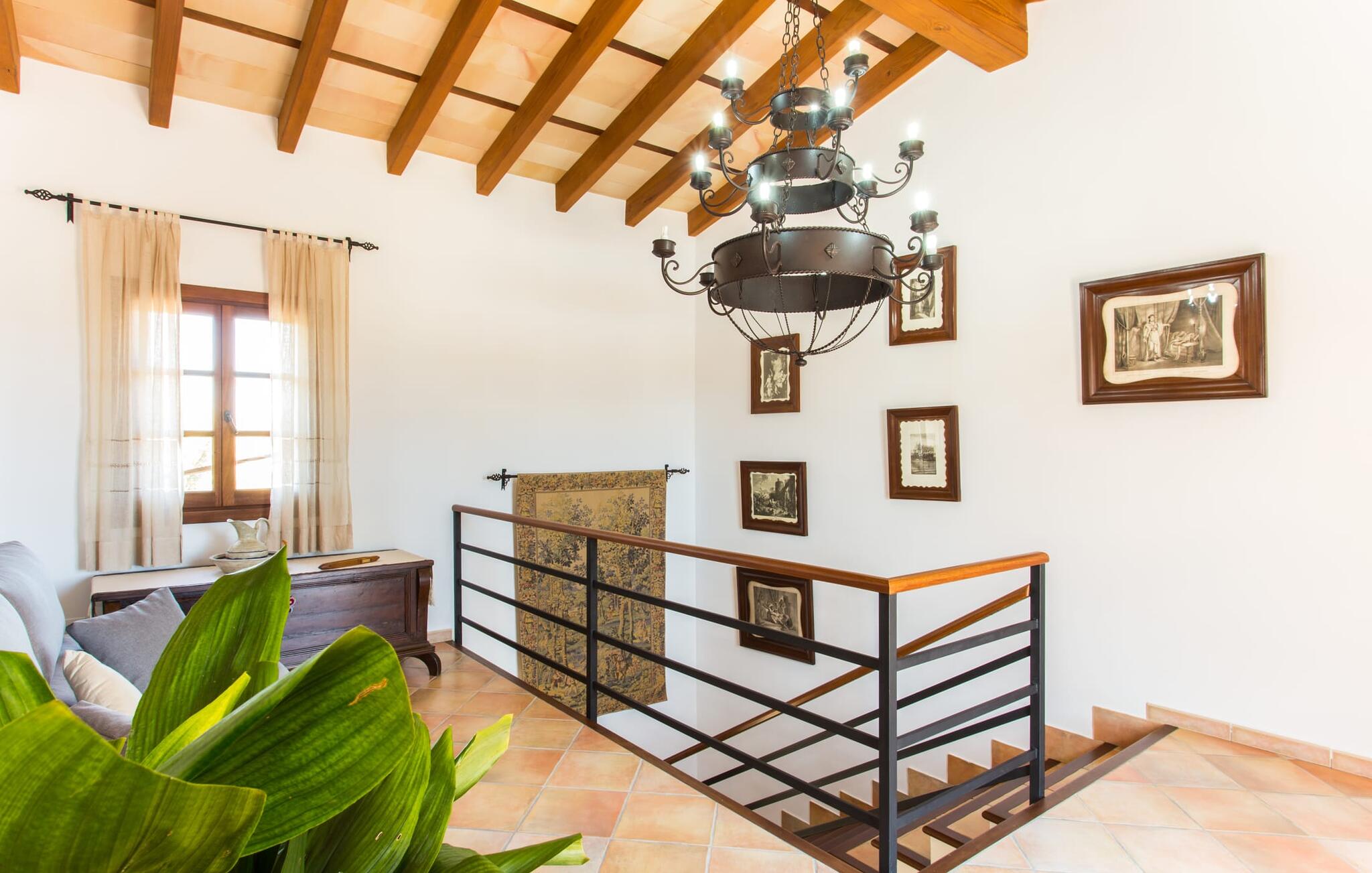 Binnen komt de woonkamer direct uit op de tuin, met smaakvol meubilair en een open haard voor gezellige avonden. De Mallorcaanse houten balken en rustieke tegels creëren een warme, uitnodigende sfeer. De moderne keuken is goed uitgerust en de eettafel staat op een steenworp afstand. Drie slaapkamers, waaronder een op de benedenverdieping met een eigen badkamer, bieden comfort en moderne badkamers. De slaapkamers op de bovenverdieping hebben toegang tot het dakterras met prachtig uitzicht.
