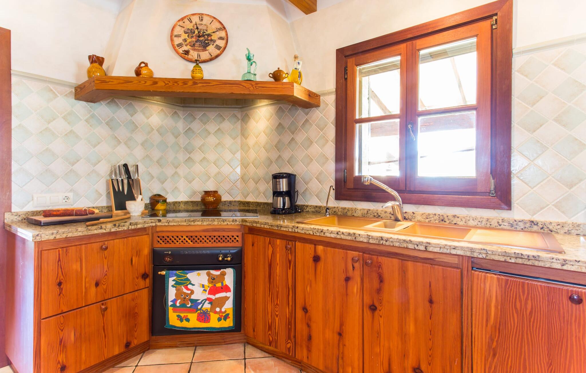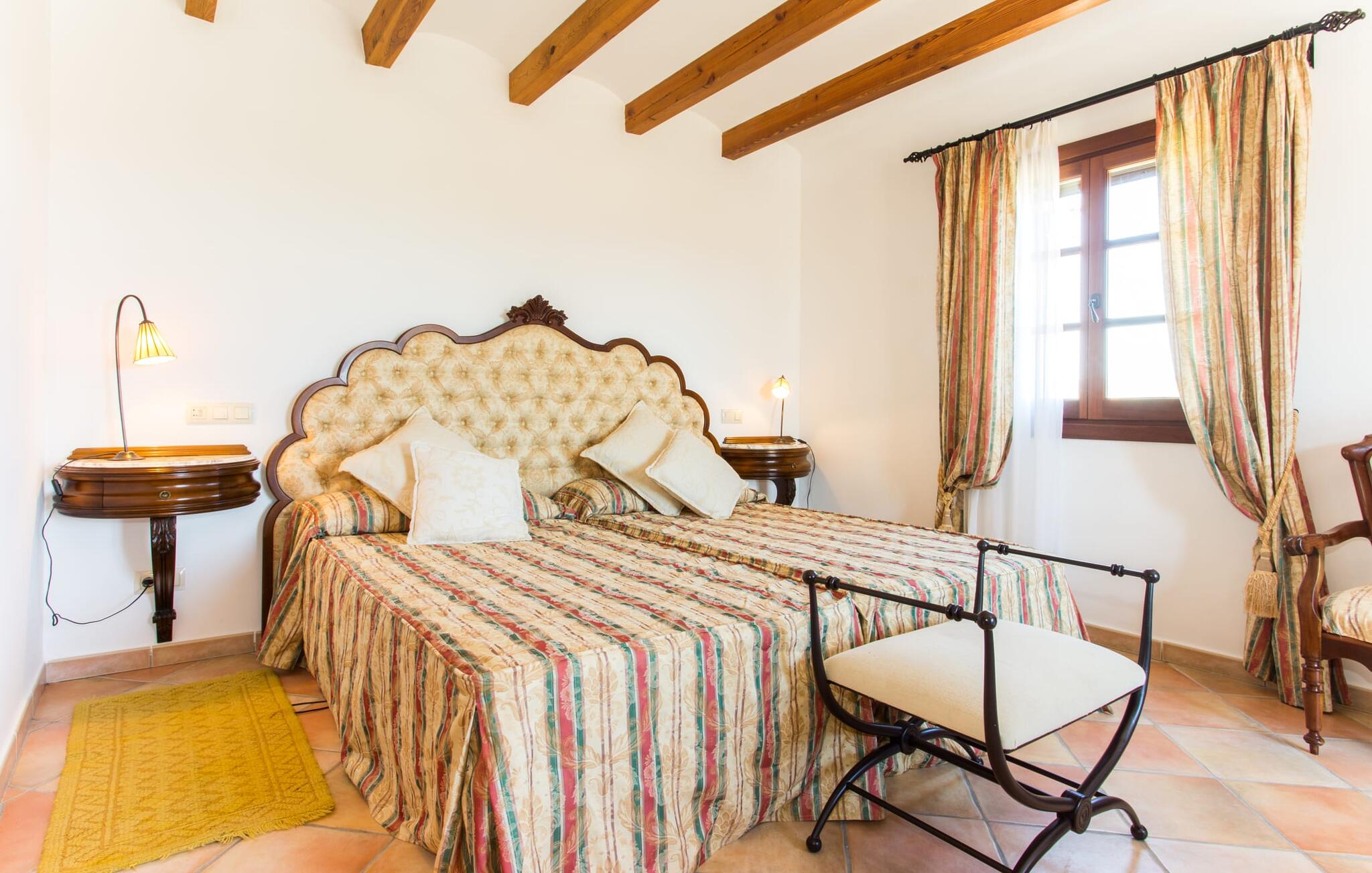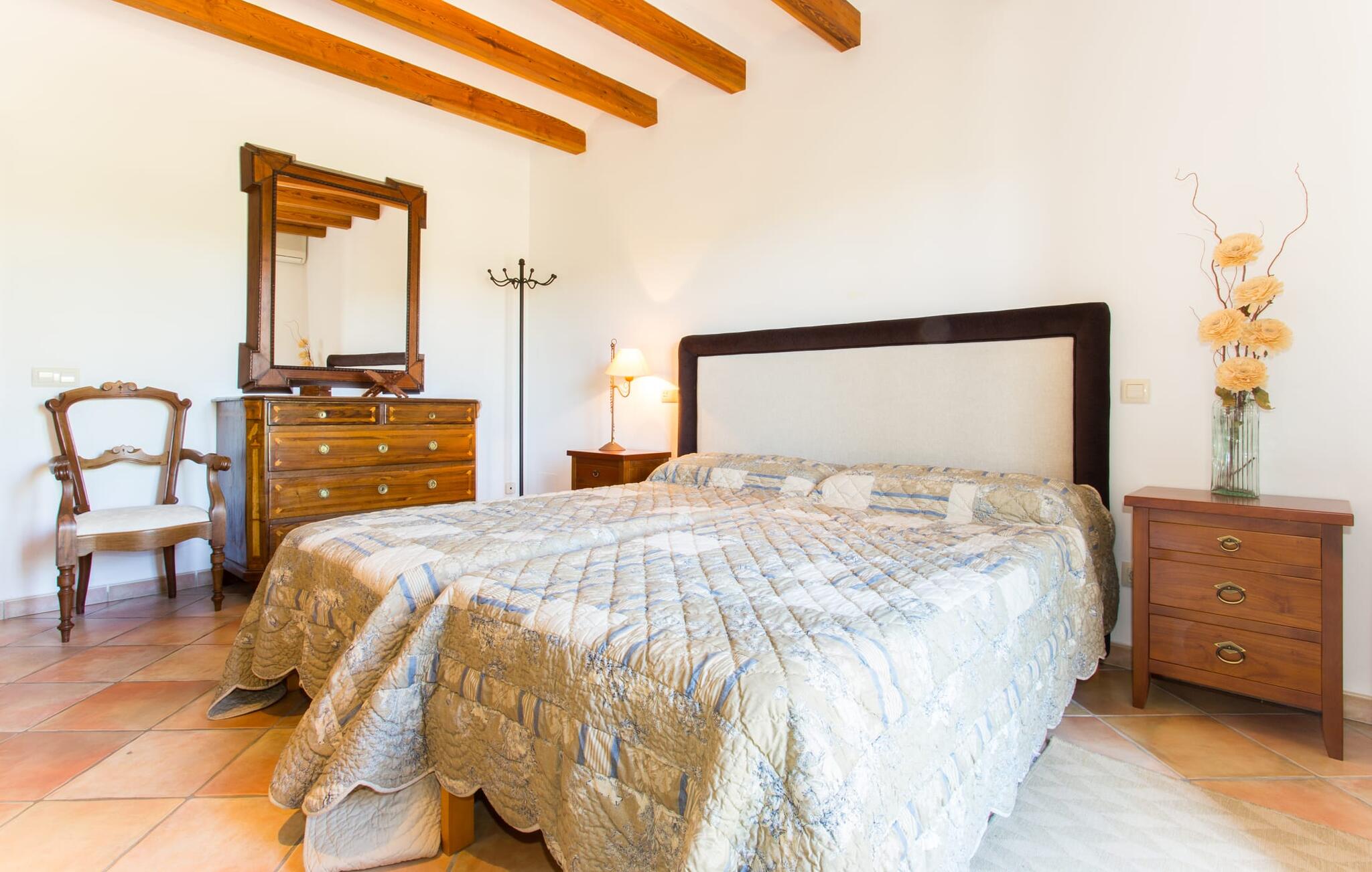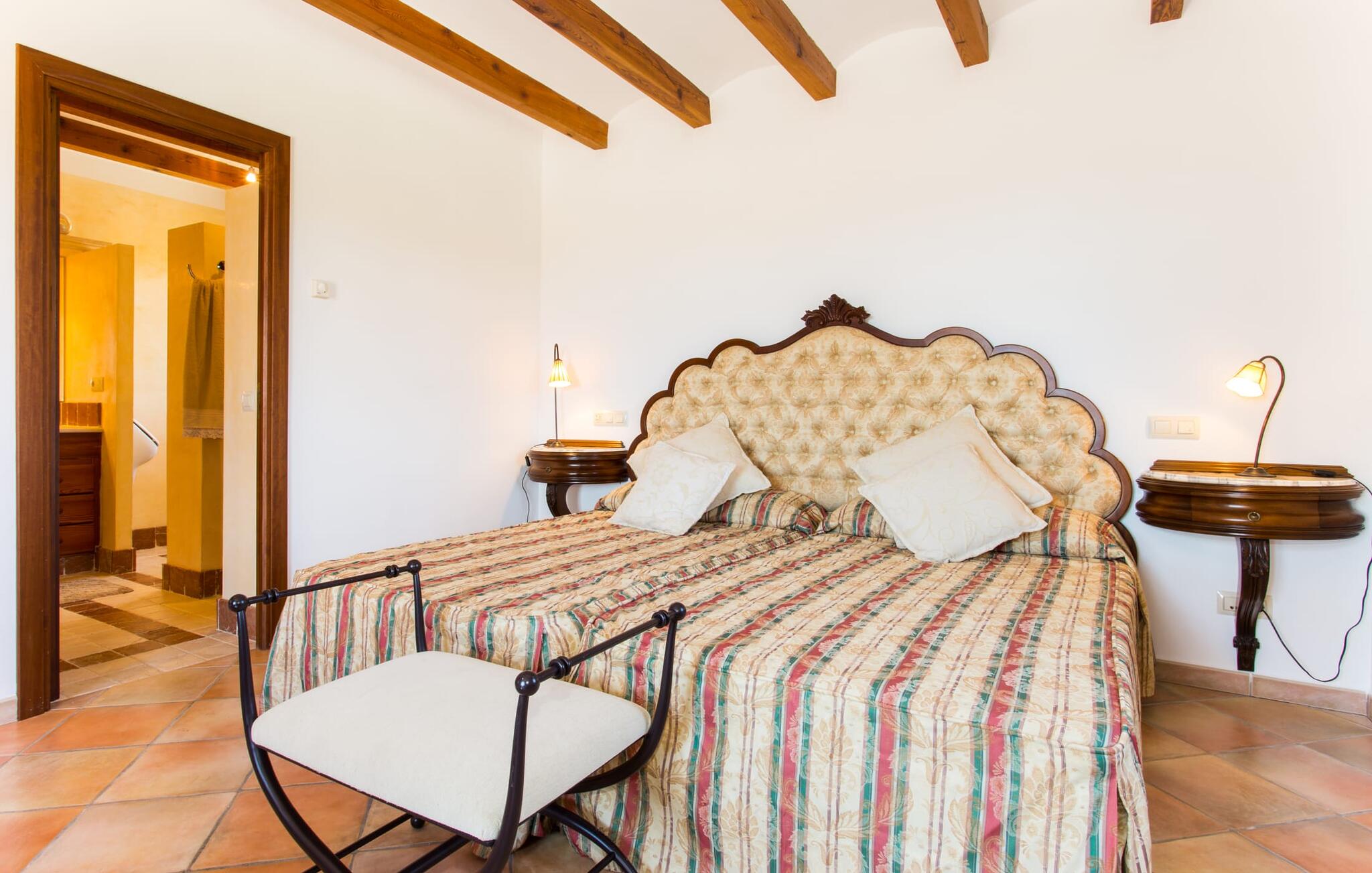 Binnen komt de woonkamer direct uit op de tuin, met smaakvol meubilair en een open haard voor gezellige avonden. De Mallorcaanse houten balken en rustieke tegels creëren een warme, uitnodigende sfeer. De moderne keuken is goed uitgerust en de eettafel staat op een steenworp afstand. Drie slaapkamers, waaronder een op de benedenverdieping met een eigen badkamer, bieden comfort en moderne badkamers. De slaapkamers op de bovenverdieping hebben toegang tot het dakterras met prachtig uitzicht.