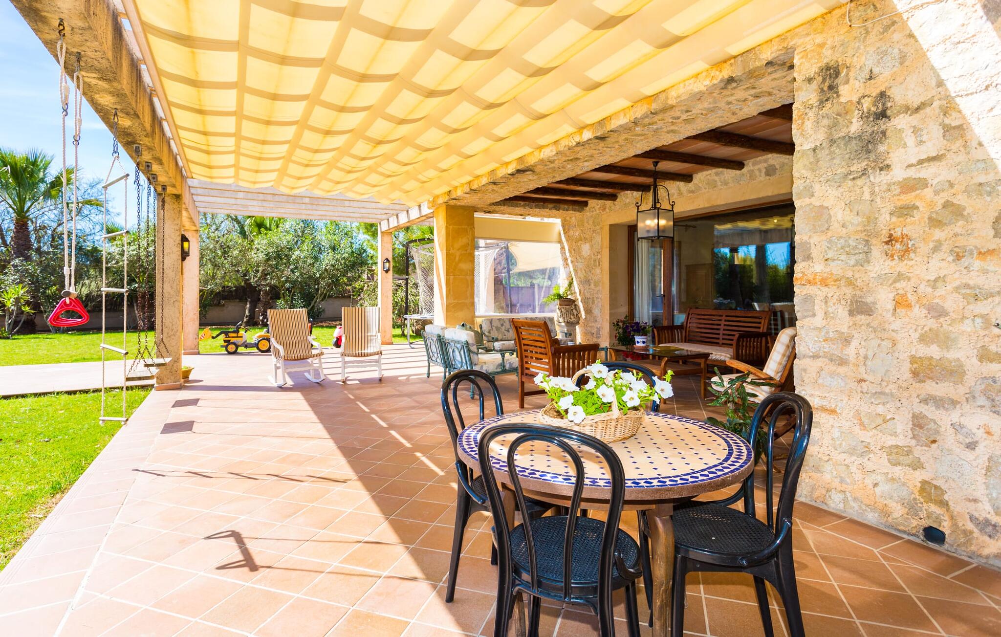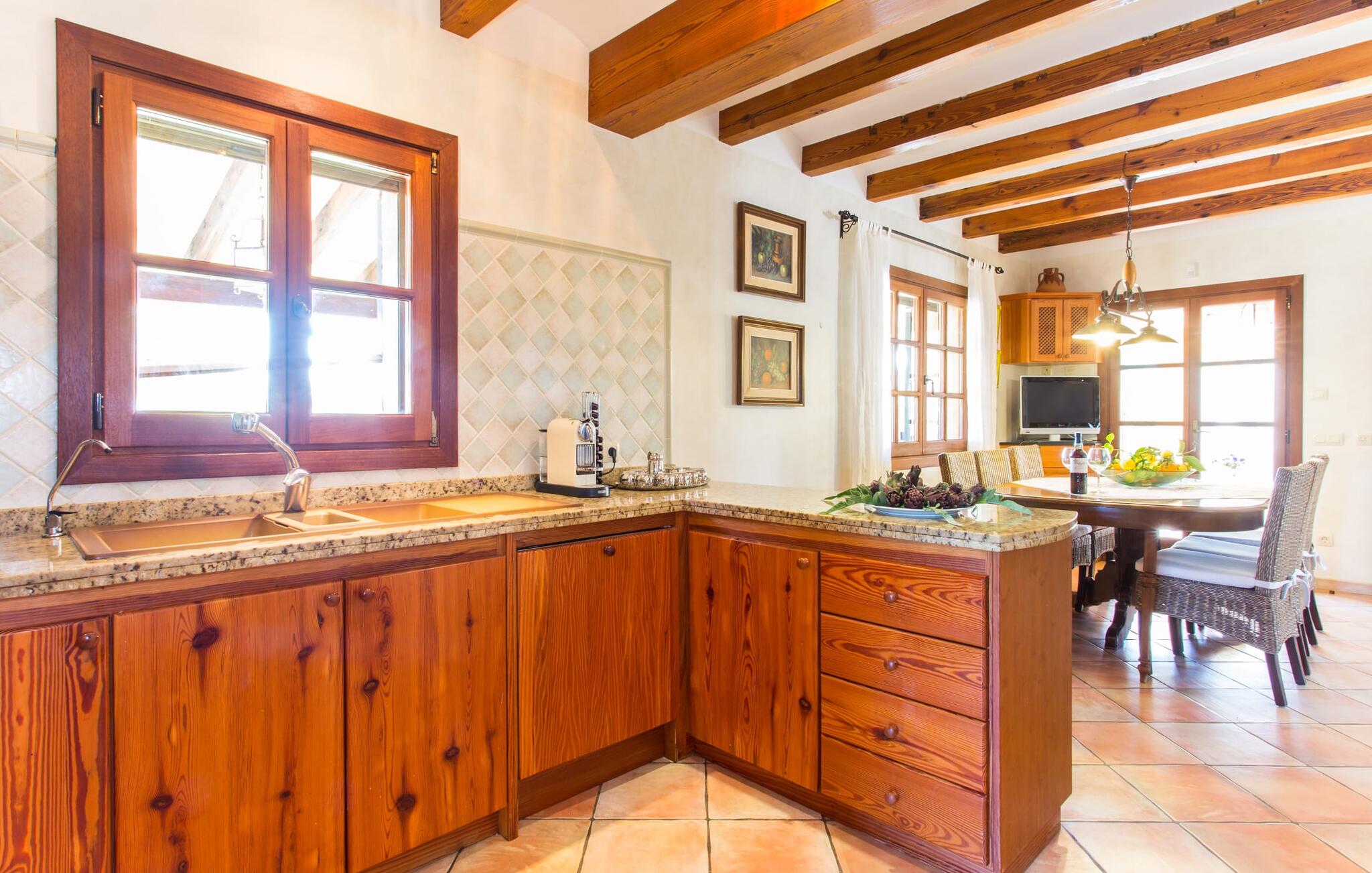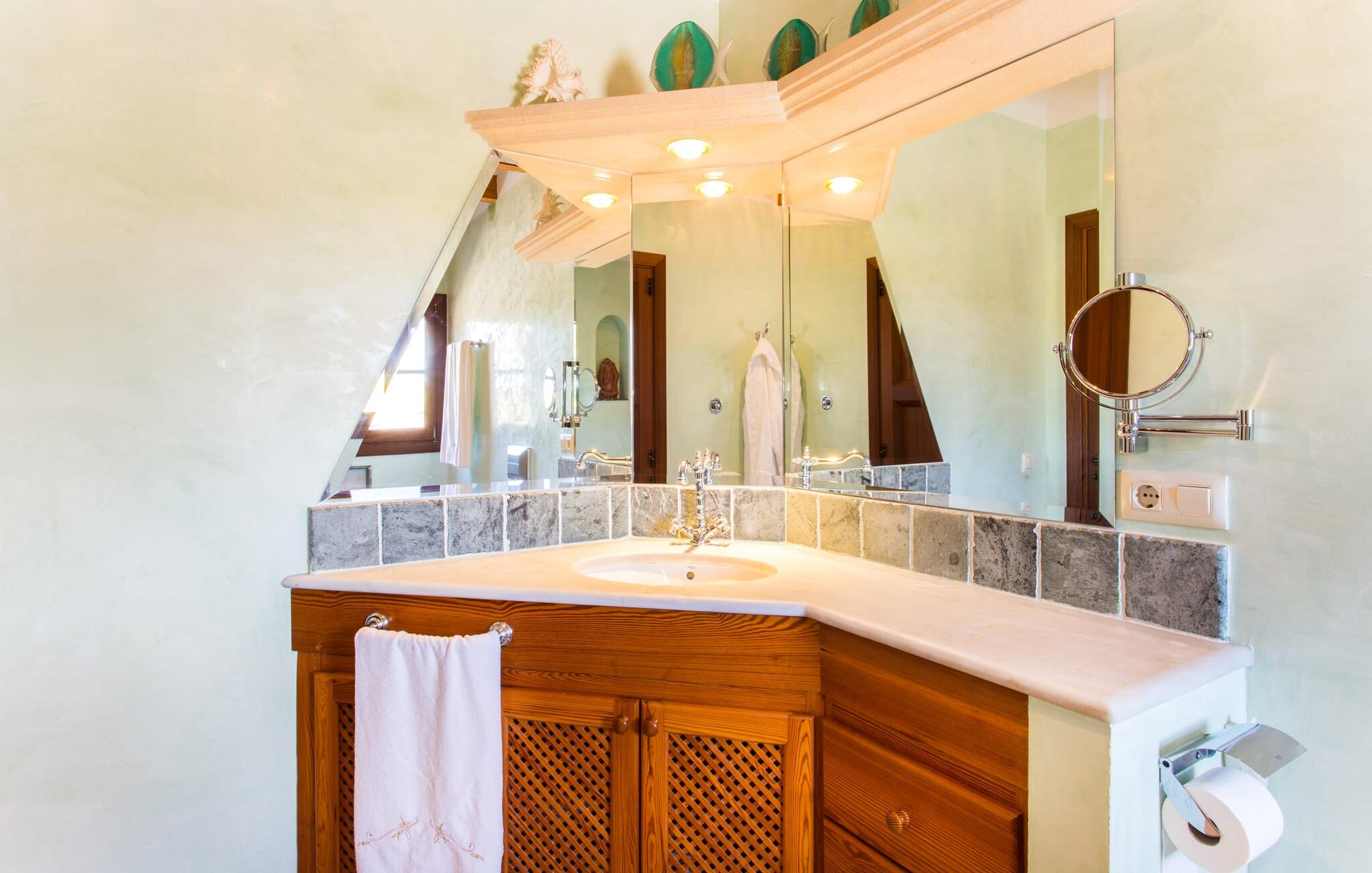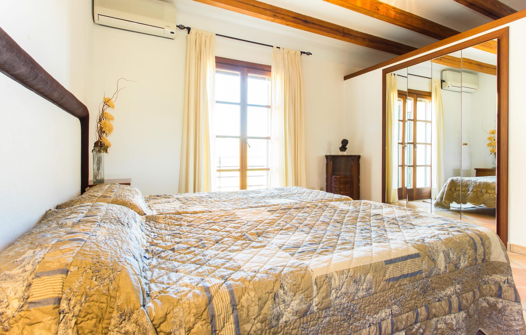 Binnen komt de woonkamer direct uit op de tuin, met smaakvol meubilair en een open haard voor gezellige avonden. De Mallorcaanse houten balken en rustieke tegels creëren een warme, uitnodigende sfeer. De moderne keuken is goed uitgerust en de eettafel staat op een steenworp afstand. Drie slaapkamers, waaronder een op de benedenverdieping met een eigen badkamer, bieden comfort en moderne badkamers. De slaapkamers op de bovenverdieping hebben toegang tot het dakterras met prachtig uitzicht.