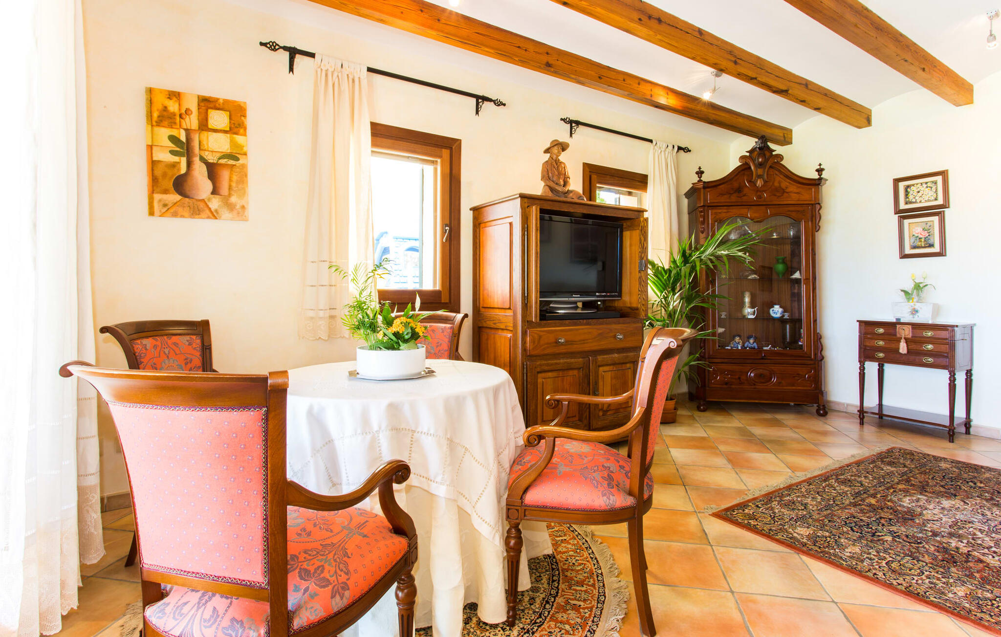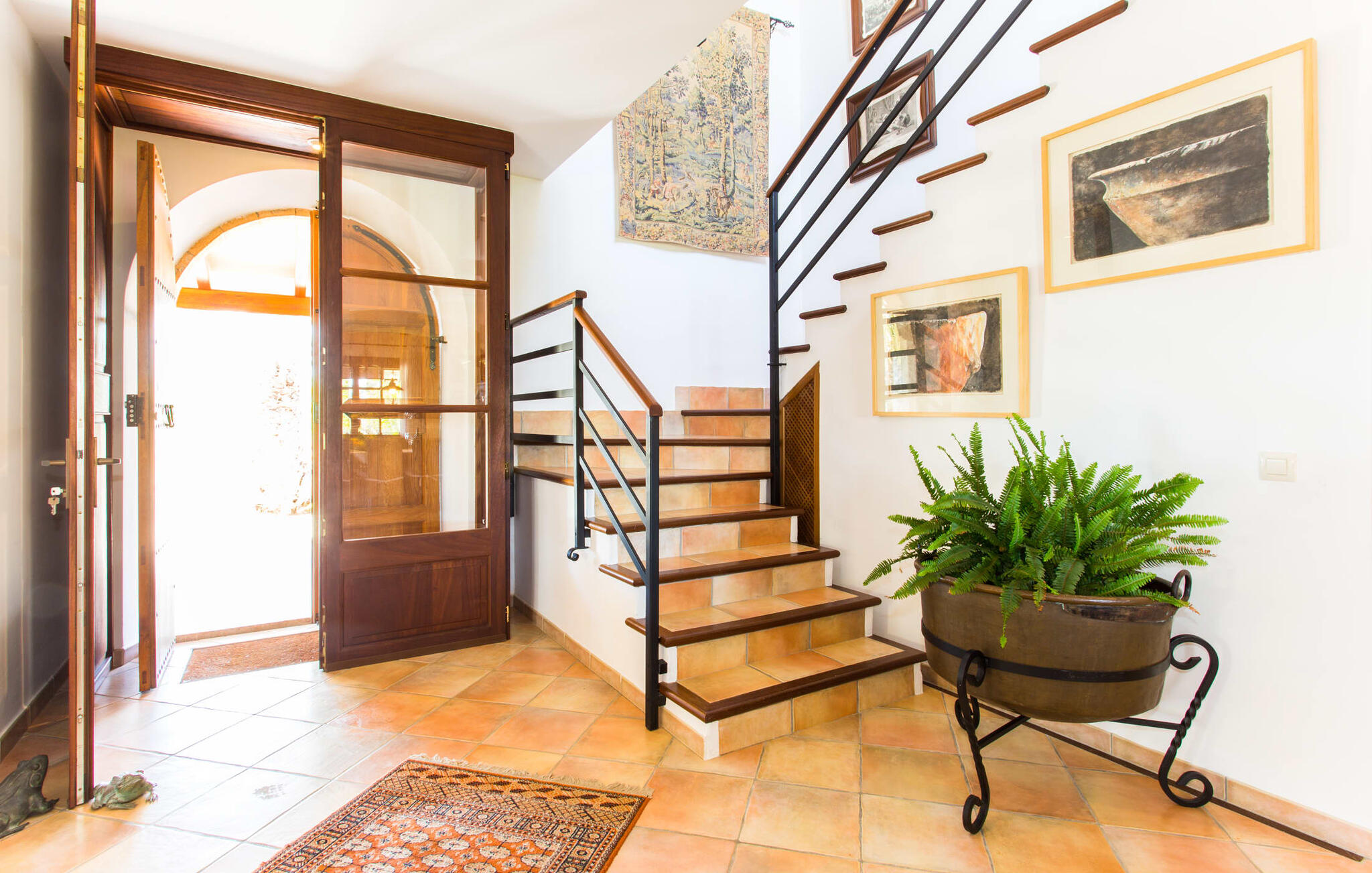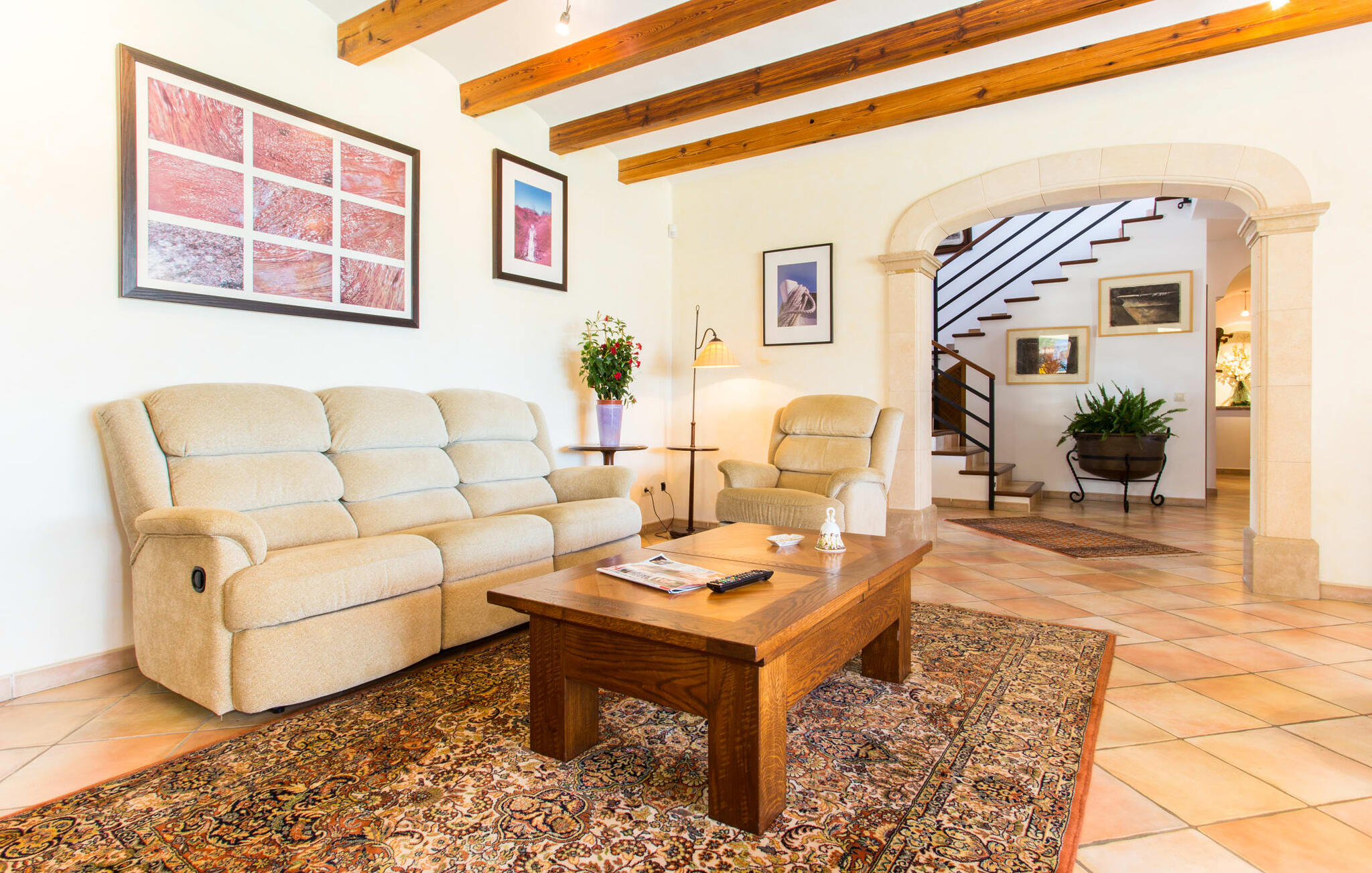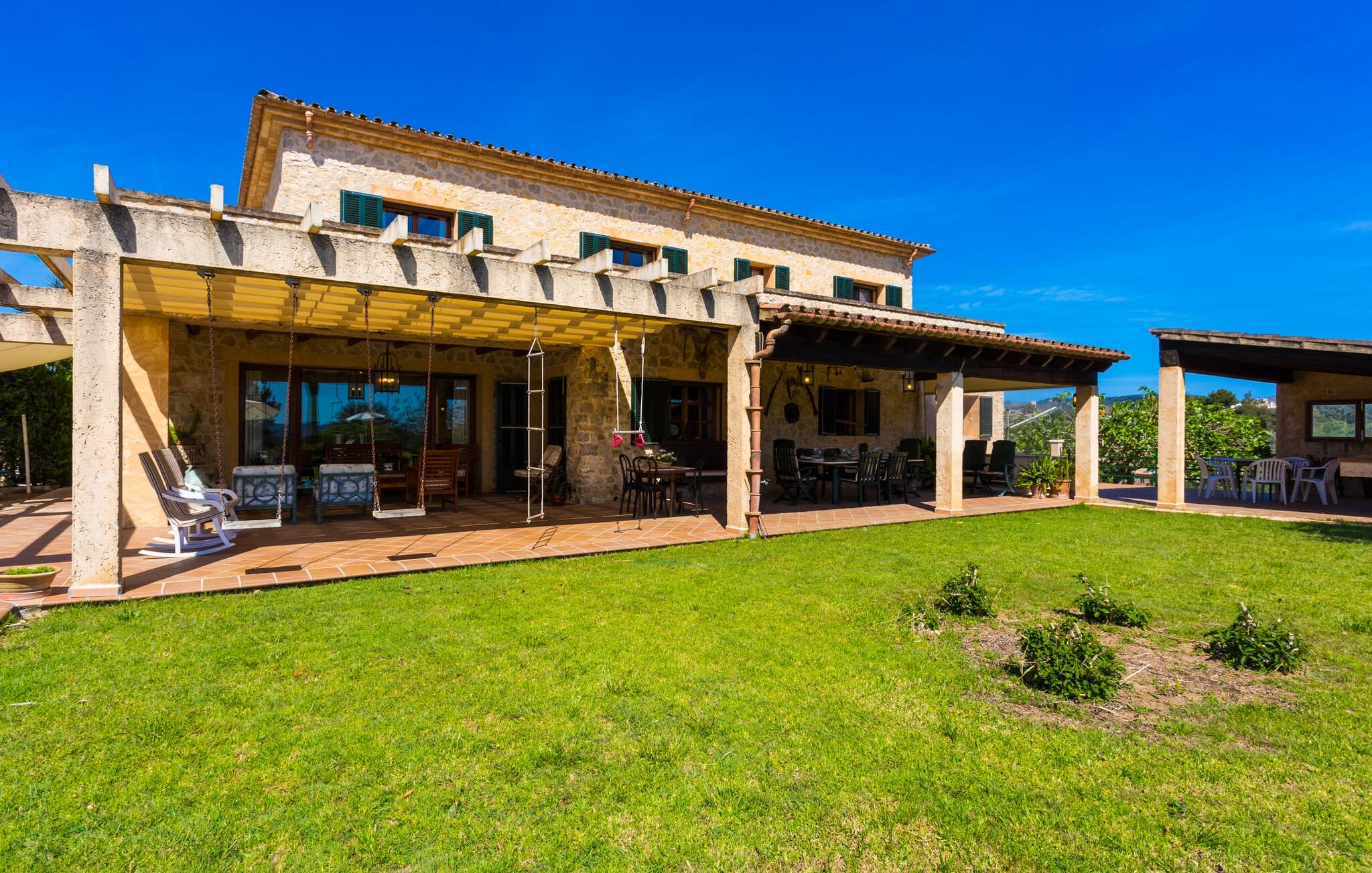 Binnen komt de woonkamer direct uit op de tuin, met smaakvol meubilair en een open haard voor gezellige avonden. De Mallorcaanse houten balken en rustieke tegels creëren een warme, uitnodigende sfeer. De moderne keuken is goed uitgerust en de eettafel staat op een steenworp afstand. Drie slaapkamers, waaronder een op de benedenverdieping met een eigen badkamer, bieden comfort en moderne badkamers. De slaapkamers op de bovenverdieping hebben toegang tot het dakterras met prachtig uitzicht.