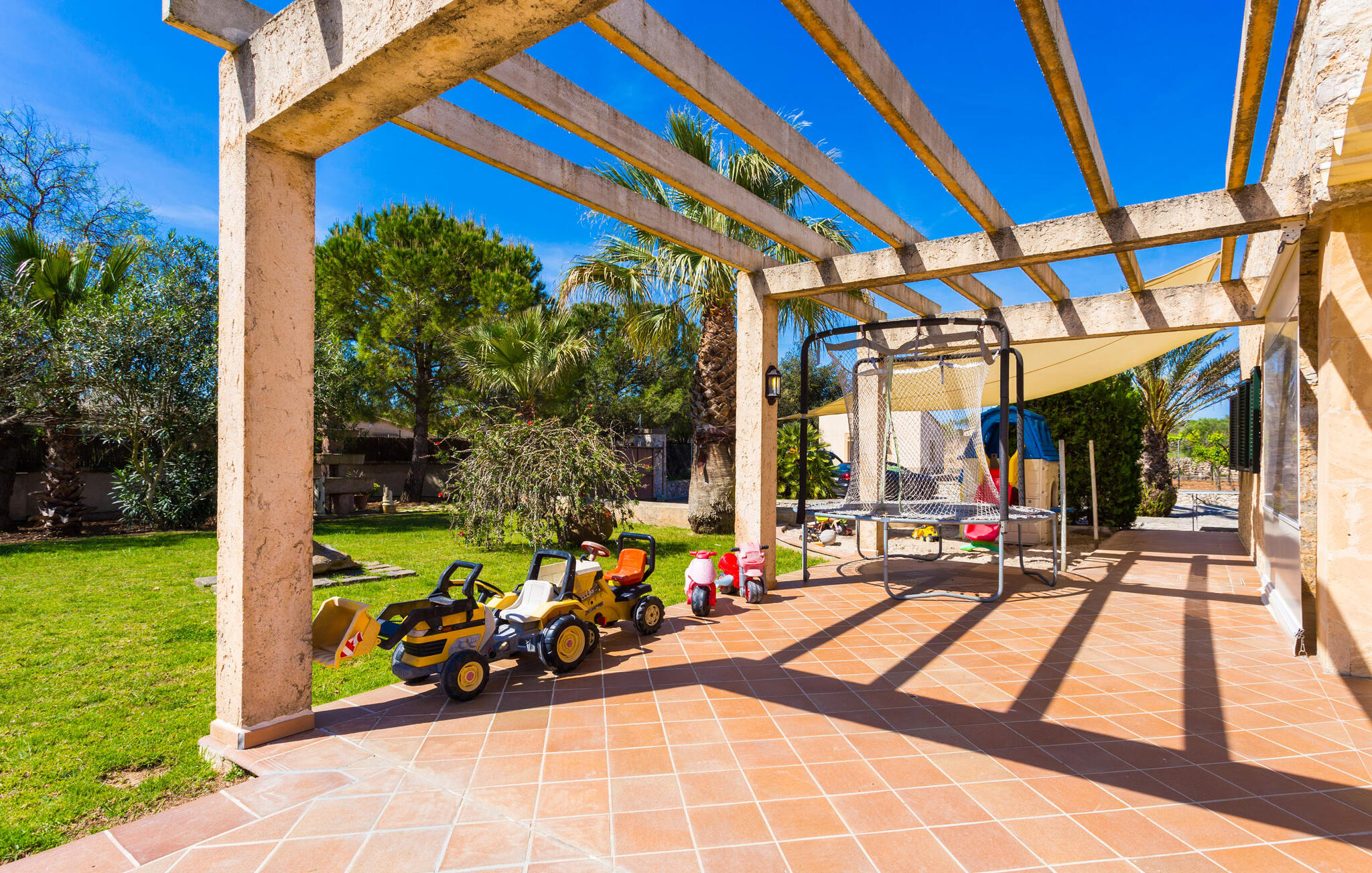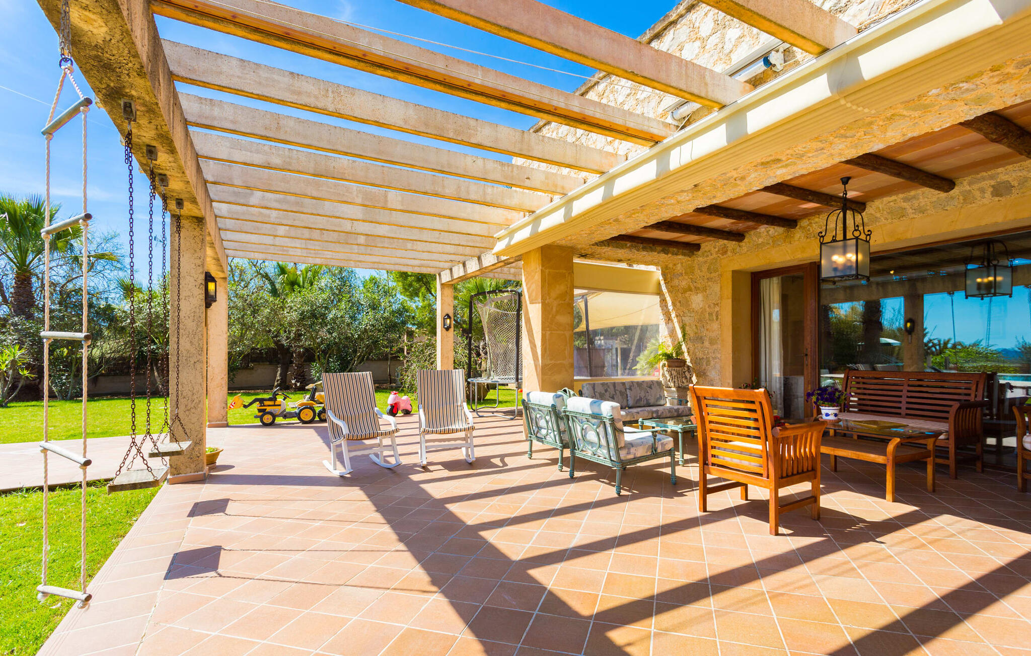 De goed onderhouden tuin heeft een groot grasveld dat leidt naar het elegante, ronde zwembad. Omringd door een groot zonneterras met ligstoelen biedt het een perfecte plek om te ontspannen, te zwemmen of de kinderen te zien spetteren. Geniet van het adembenemende uitzicht op het zacht glooiende landschap vanaf het zwembad en dompel jezelf onder in de vredige landelijke sfeer. Het ruime terras, dat zich uitstrekt over twee zijden van de villa, heeft twee bankstellen, twee eettafels en veel ruimte voor buitenplezier, met speelgoed voor de kinderen, een trampoline en een tafeltennistafel. Om buiten te koken is er een schaduwrijke barbecueplaats om lokale producten te grillen. Voor momenten van ontspanning zijn er parasols en een met glas overdekt gedeelte met uitschuifbare parasols.