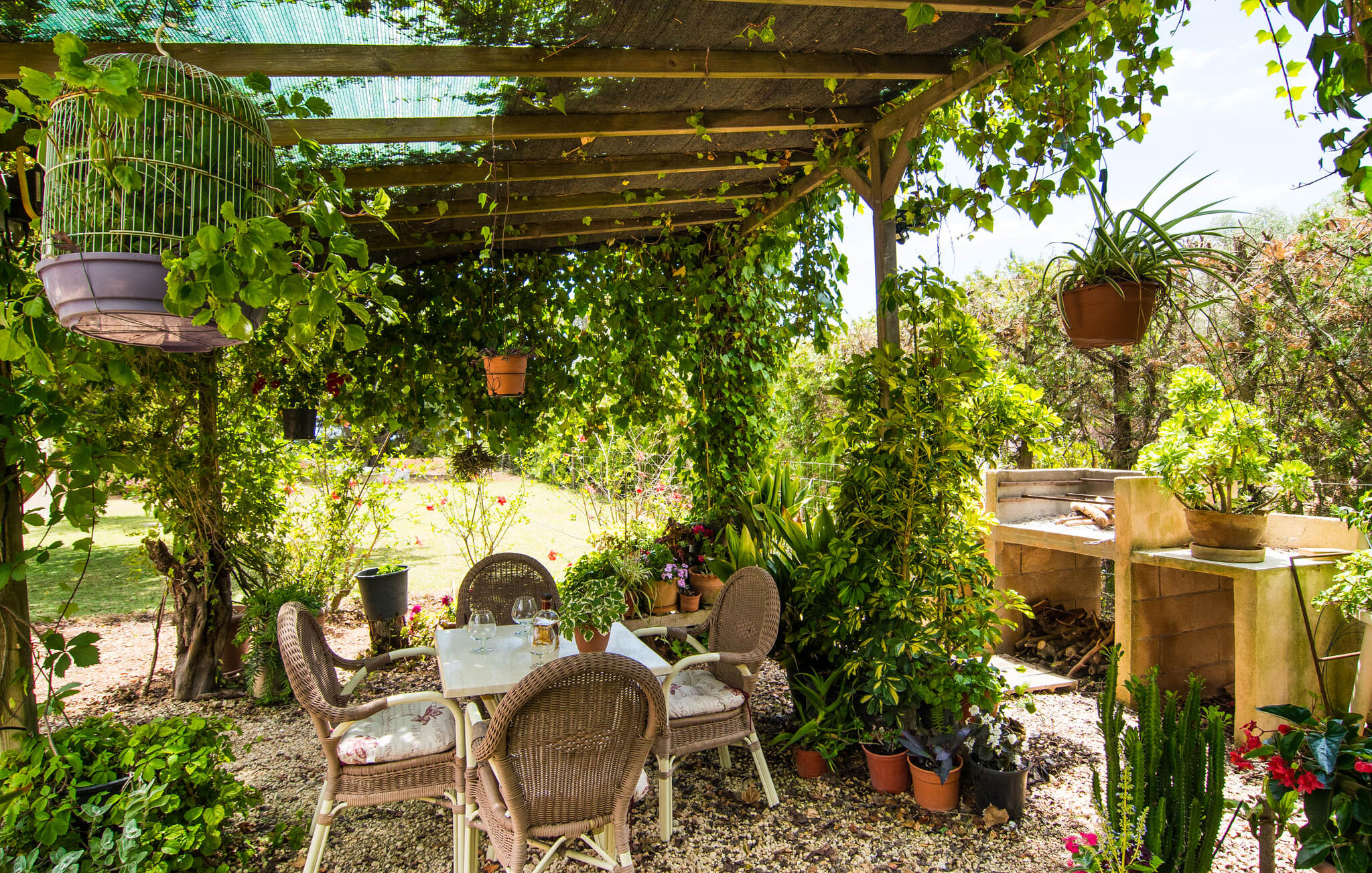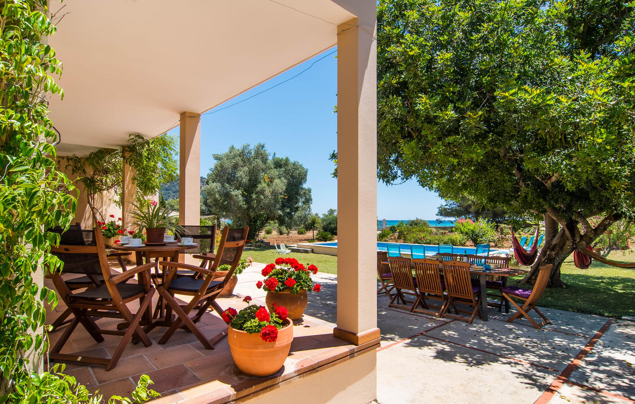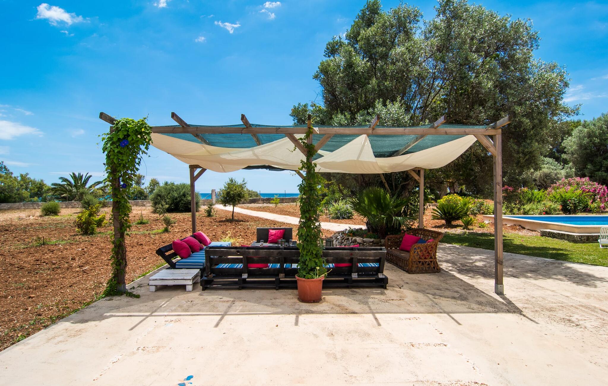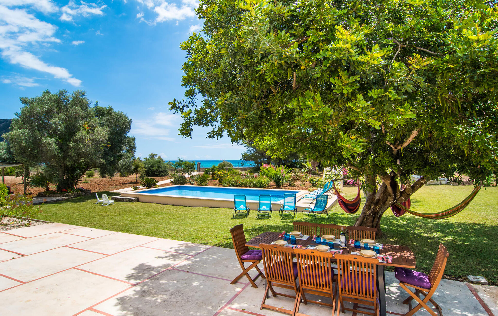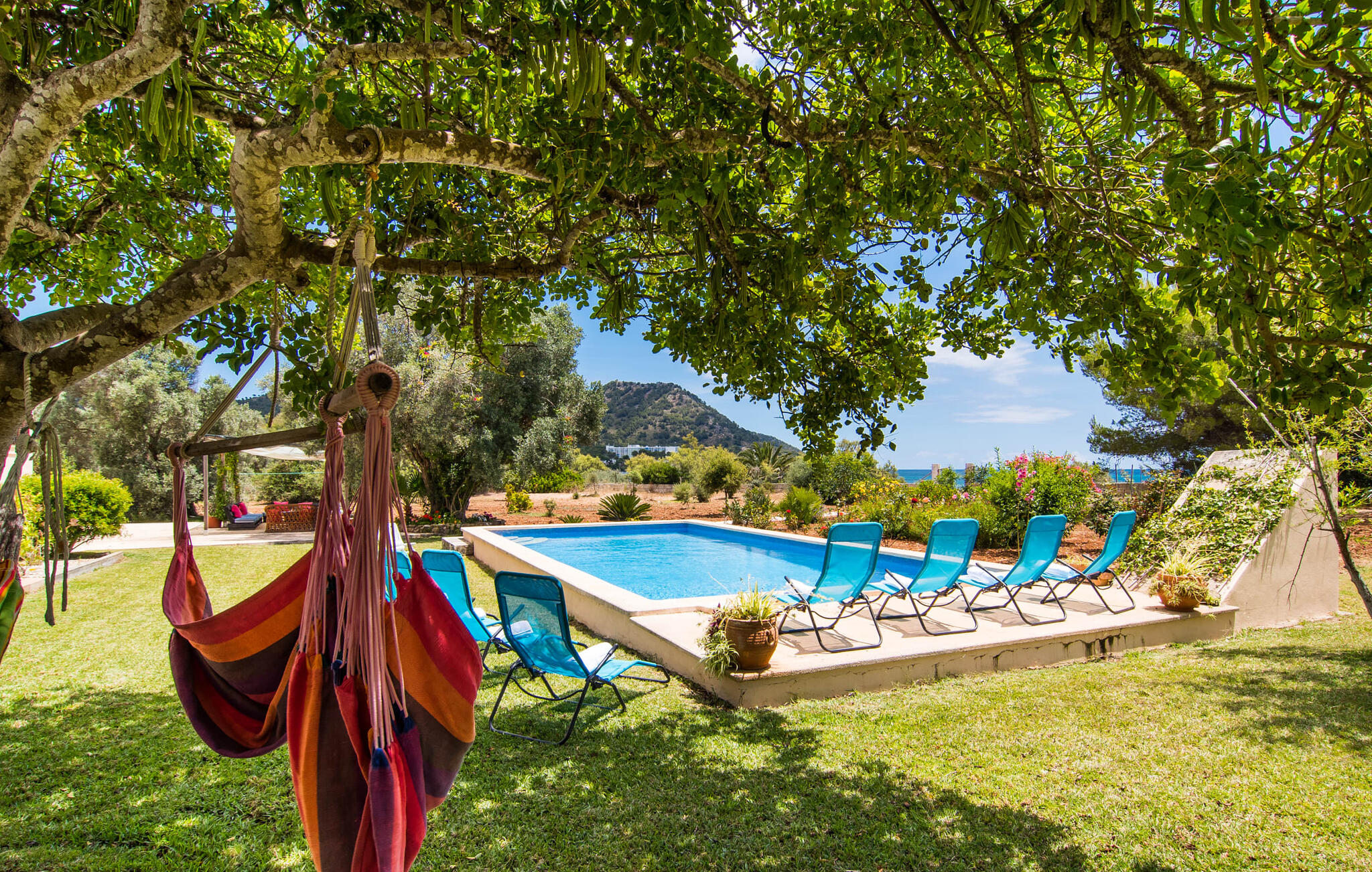 Het tuinzwembad versierd met turkoois gekleurde ligstoelen maakt de buitenervaring compleet, terwijl een schommelstoel en hangmat extra ontspanningsmogelijkheden bieden. Het ruime terras heeft verschillende zon- en schaduwplekken, ideaal om te dineren of gewoon te genieten van het uitzicht op zee. Een groene gazebo is beschikbaar voor wie toezicht wil houden op barbecueactiviteiten.