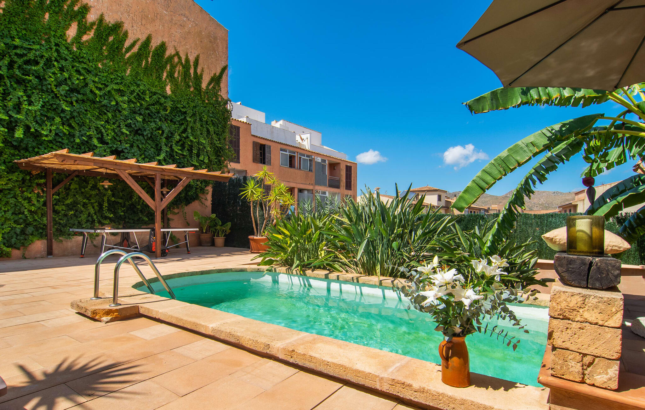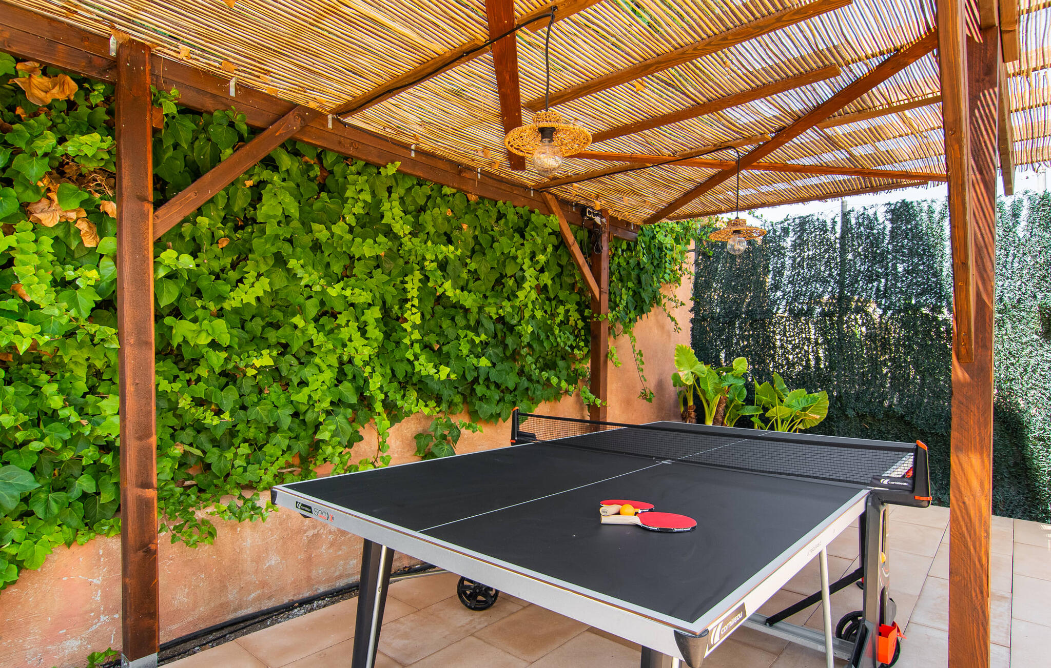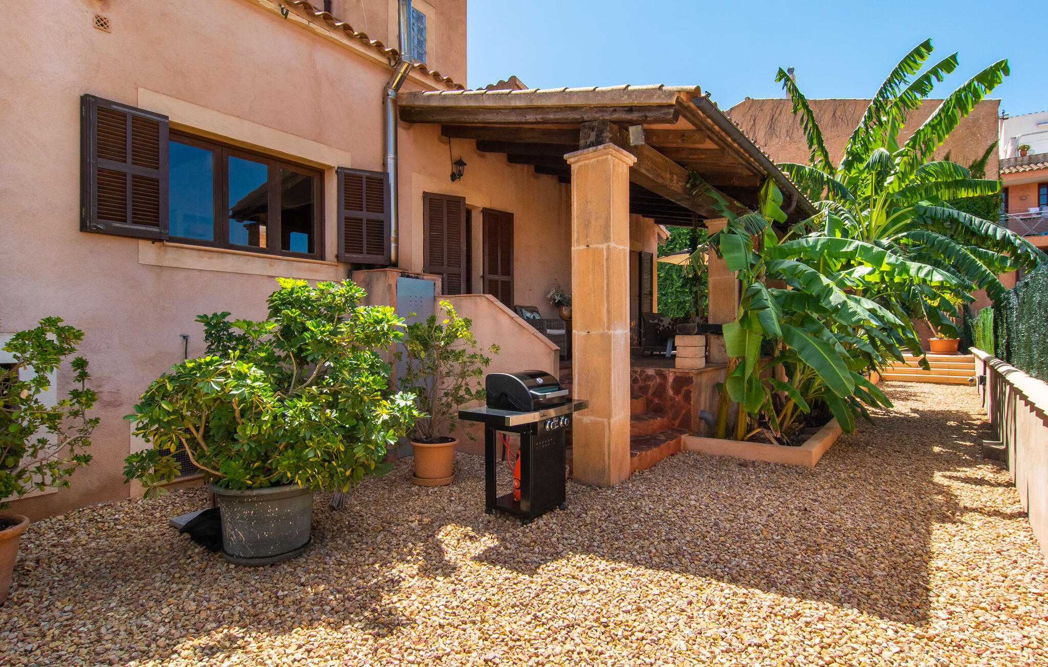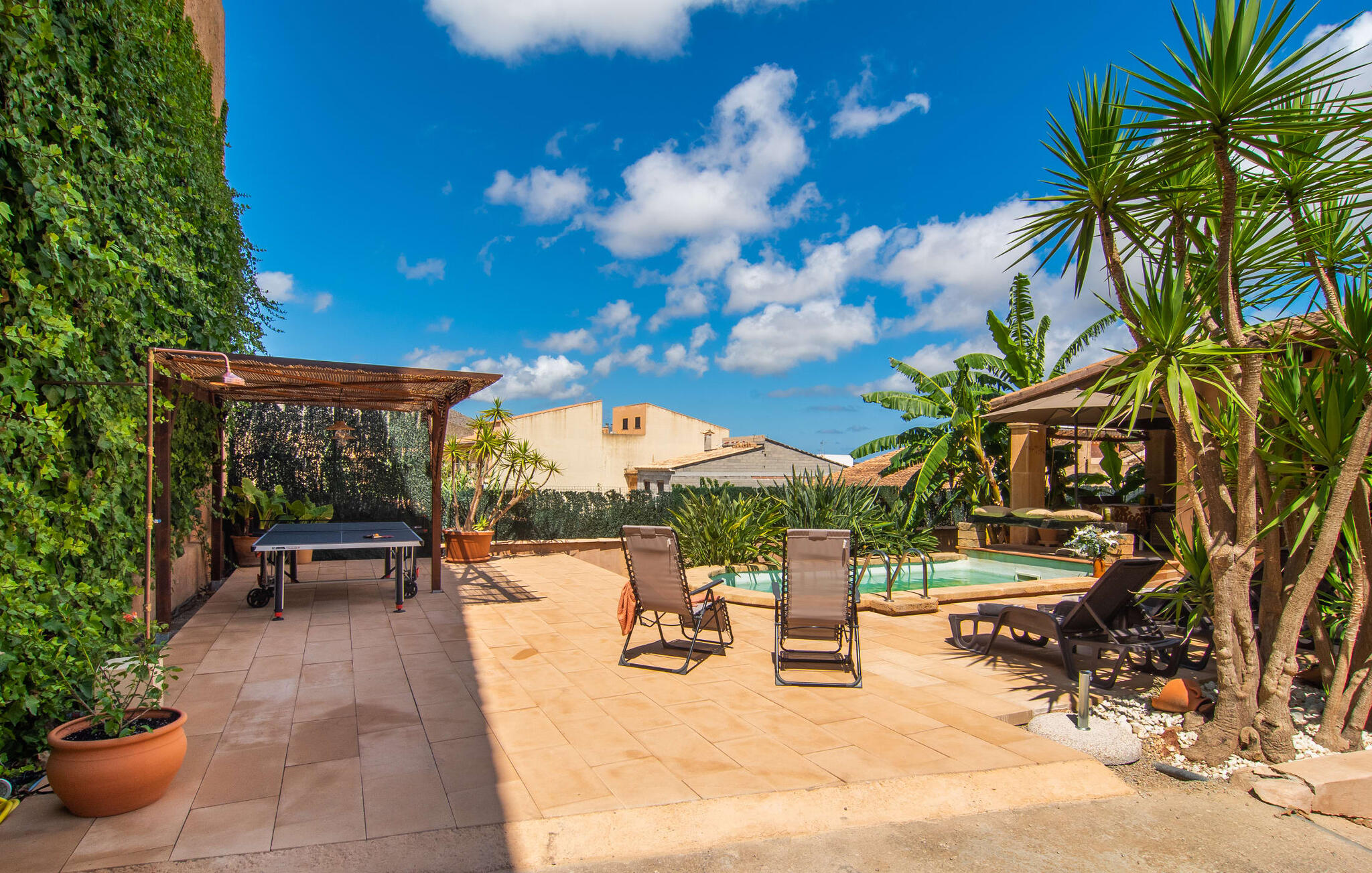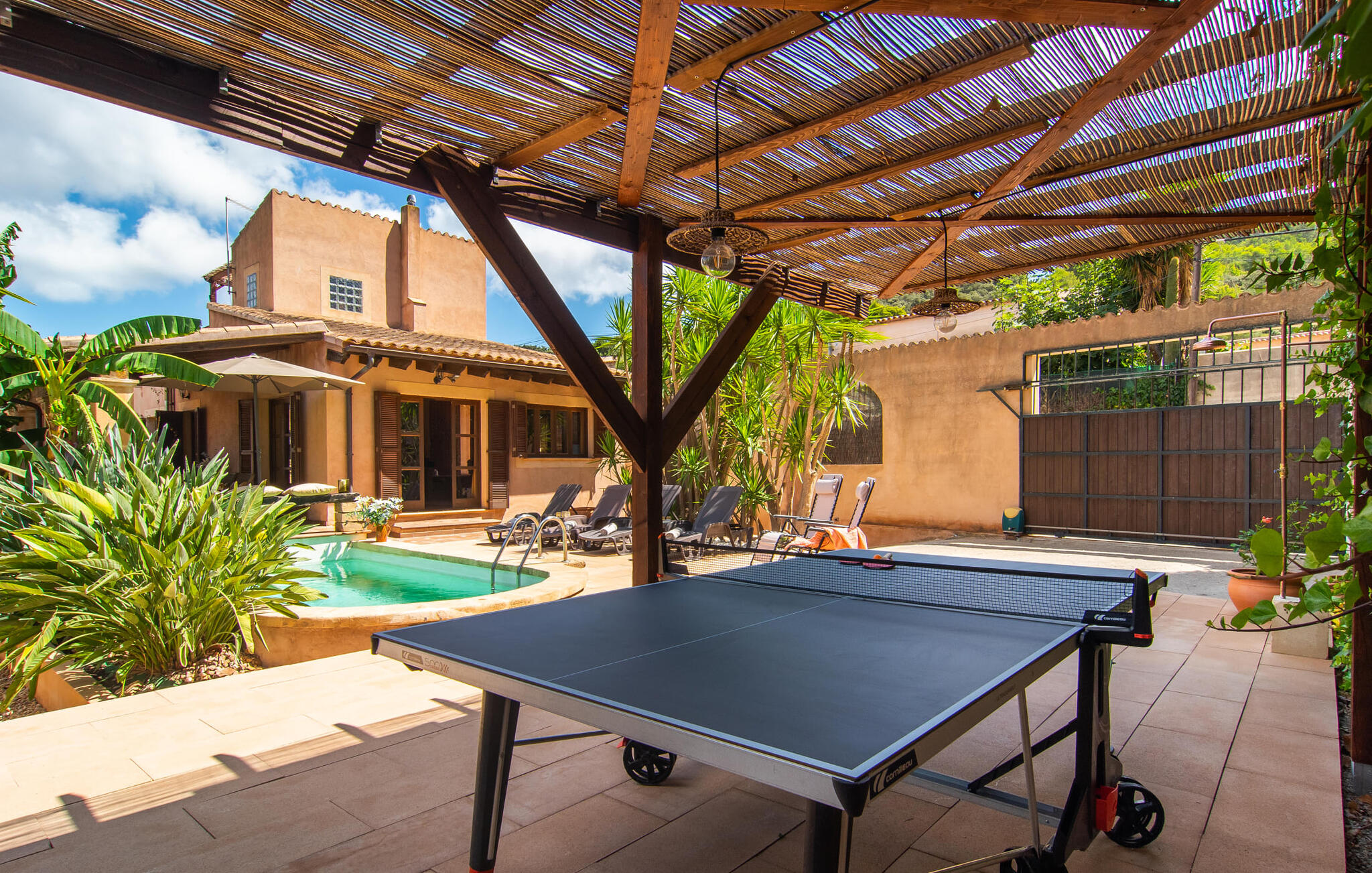 De dingen die je in patio`s kunt vinden! De muur van het buurhuis is begroeid met klimplanten, waardoor je tuin van alle kanten beschut aanvoelt als een juweeltje als je op de schilderachtige oude houten balk boven het knusse zwembad zit. Degenen die hun kruipvaardigheden op vakantie willen perfectioneren zijn misschien beter af op het dichtstbijzijnde strand, maar degenen die gewoon het gevoel van ontspanning waarderen dat een zwembad geeft zullen vele gelukzalige uren doorbrengen op deze binnenplaats geplaveid met inheems grind en tegels in de traditioneel mooie Mallorcaanse kleur. Als je actief wilt worden, komt de tafeltennistafel in de schaduw van een pergola goed van pas. Je hebt de keuze waar je wilt genieten van de eilandzon: direct bij het zwembad of naast het huis. Met de BBQ kun je een culinair hoogtepunt creëren, zodat niet alleen je huid en ziel, maar ook je smaakpapillen verwend worden op vakantie. Een overdekt terras nodigt je uit om lekker te luieren in de schaduw. Als de avond valt, gaat de buitenverlichting als bij toverslag aan en krijgt de tuin meteen een andere vorm. Maak van de gelegenheid gebruik om het te ervaren terwijl je je vermaakt met een spelletje schaak of een redelijk uitdagende puzzel.