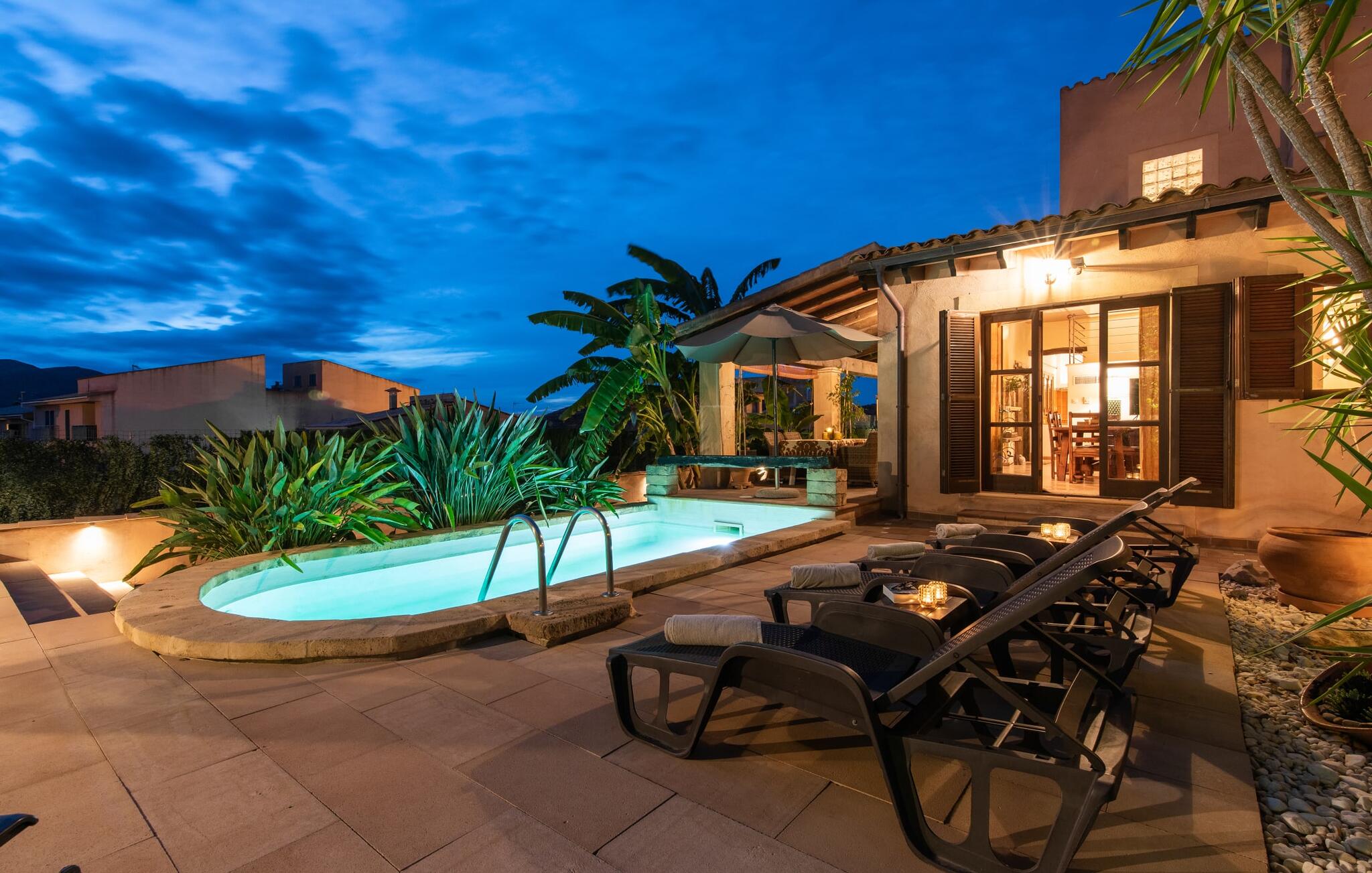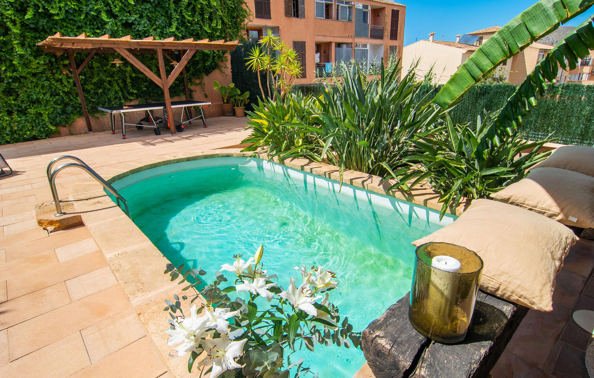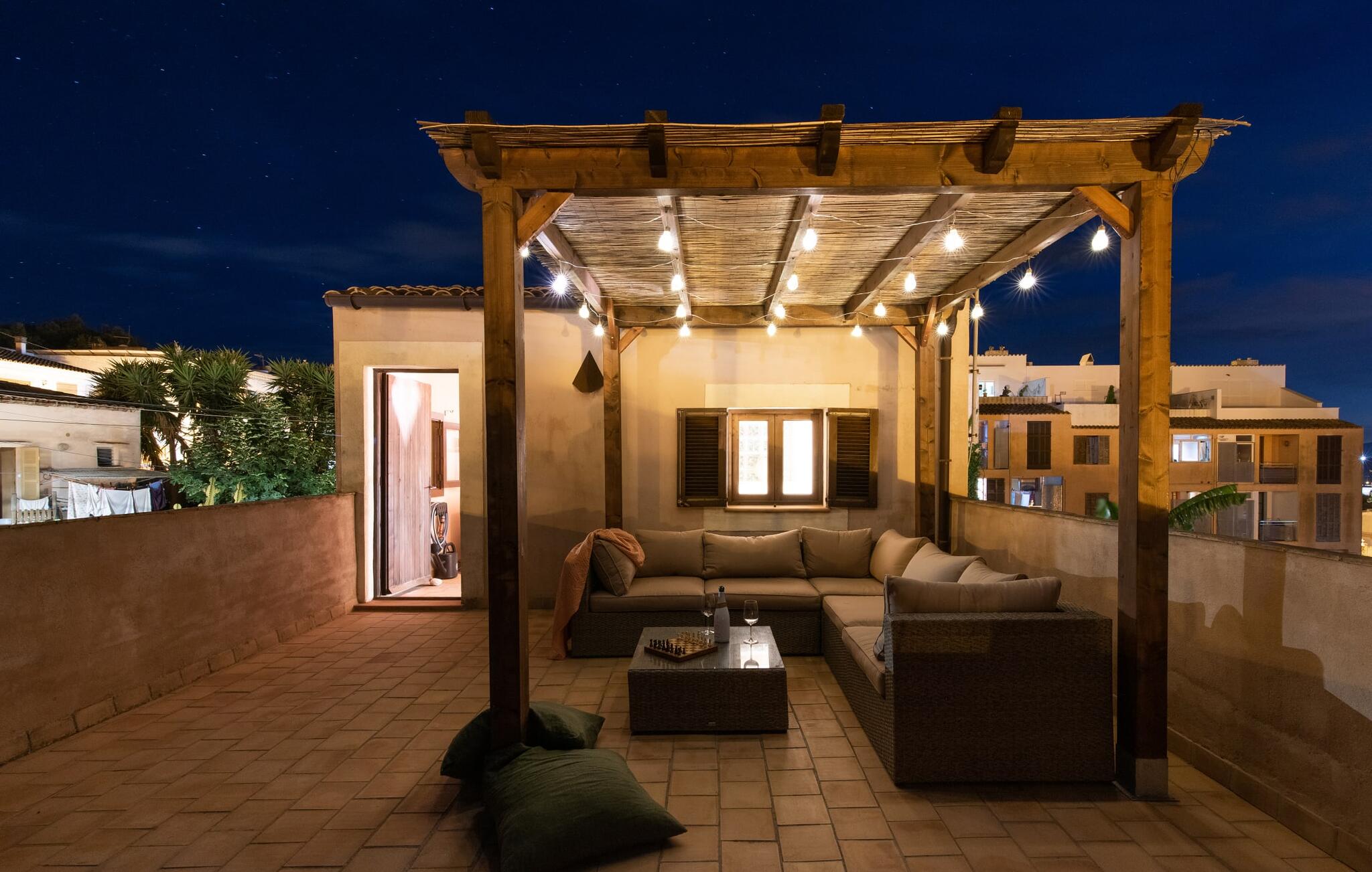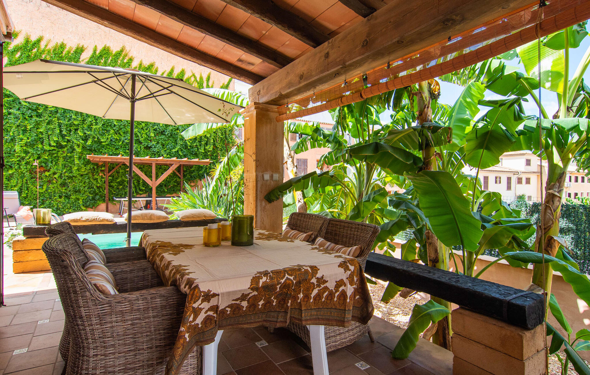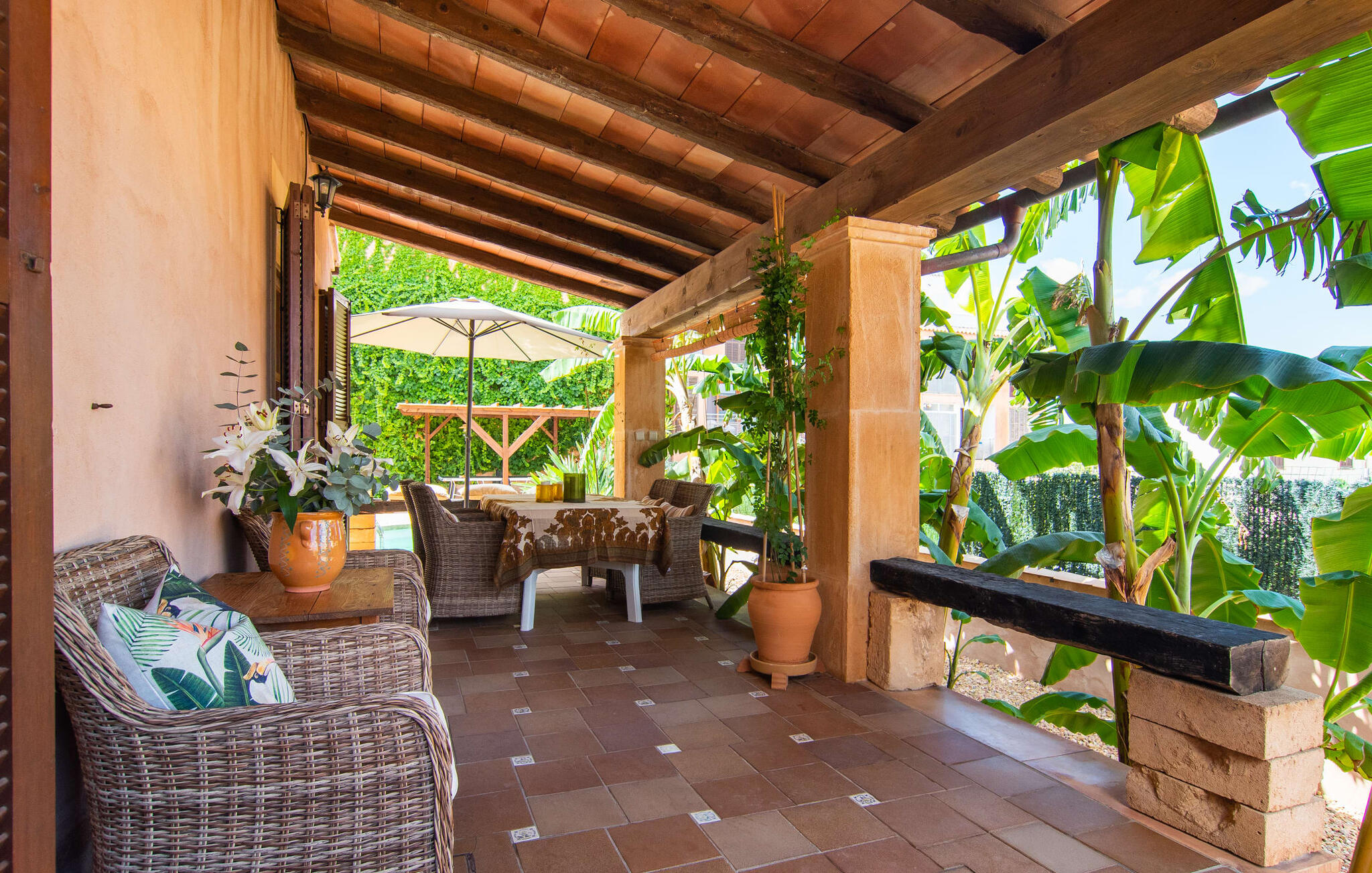 De dingen die je in patio`s kunt vinden! De muur van het buurhuis is begroeid met klimplanten, waardoor je tuin van alle kanten beschut aanvoelt als een juweeltje als je op de schilderachtige oude houten balk boven het knusse zwembad zit. Degenen die hun kruipvaardigheden op vakantie willen perfectioneren zijn misschien beter af op het dichtstbijzijnde strand, maar degenen die gewoon het gevoel van ontspanning waarderen dat een zwembad geeft zullen vele gelukzalige uren doorbrengen op deze binnenplaats geplaveid met inheems grind en tegels in de traditioneel mooie Mallorcaanse kleur. Als je actief wilt worden, komt de tafeltennistafel in de schaduw van een pergola goed van pas. Je hebt de keuze waar je wilt genieten van de eilandzon: direct bij het zwembad of naast het huis. Met de BBQ kun je een culinair hoogtepunt creëren, zodat niet alleen je huid en ziel, maar ook je smaakpapillen verwend worden op vakantie. Een overdekt terras nodigt je uit om lekker te luieren in de schaduw. Als de avond valt, gaat de buitenverlichting als bij toverslag aan en krijgt de tuin meteen een andere vorm. Maak van de gelegenheid gebruik om het te ervaren terwijl je je vermaakt met een spelletje schaak of een redelijk uitdagende puzzel.