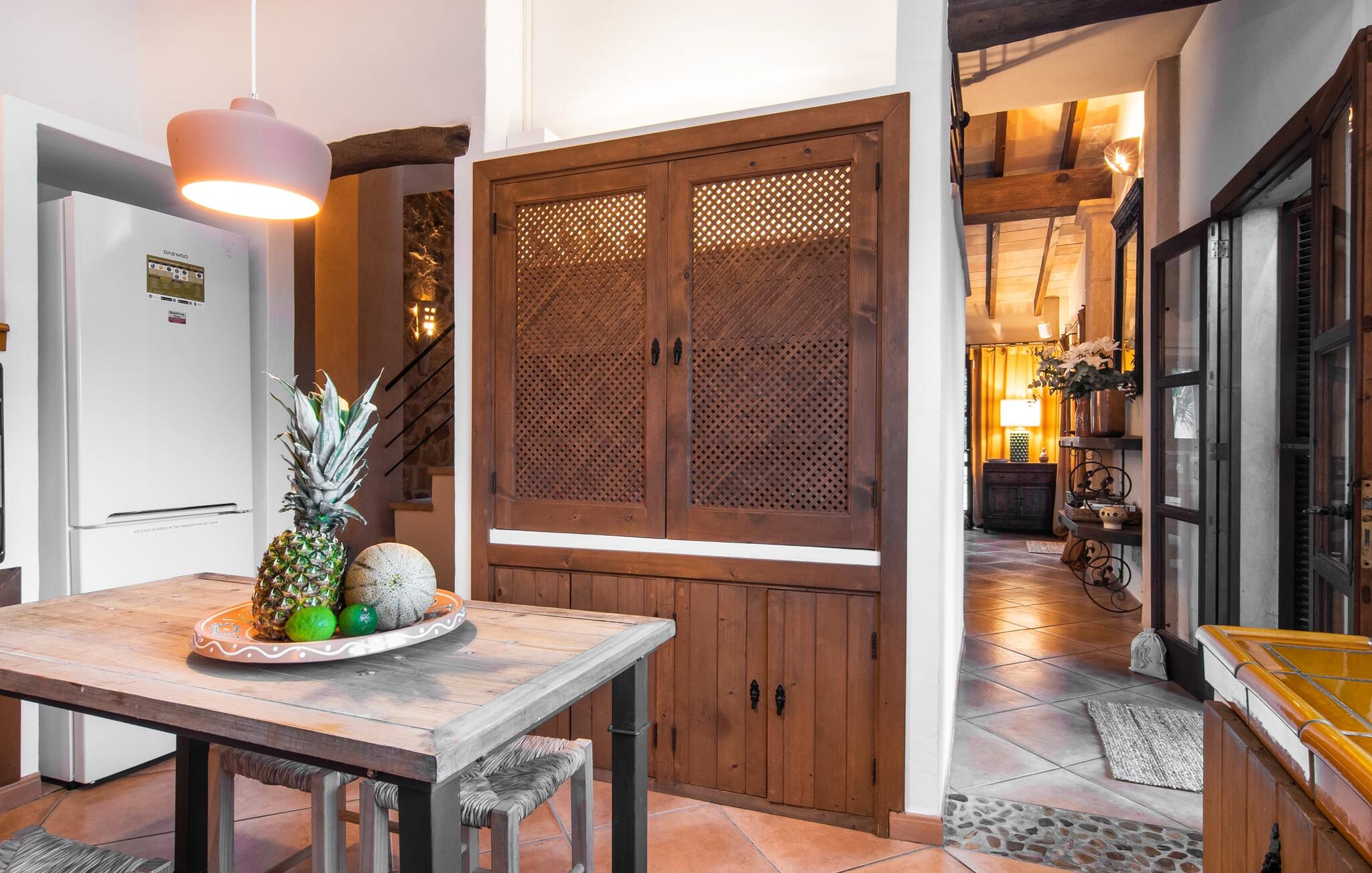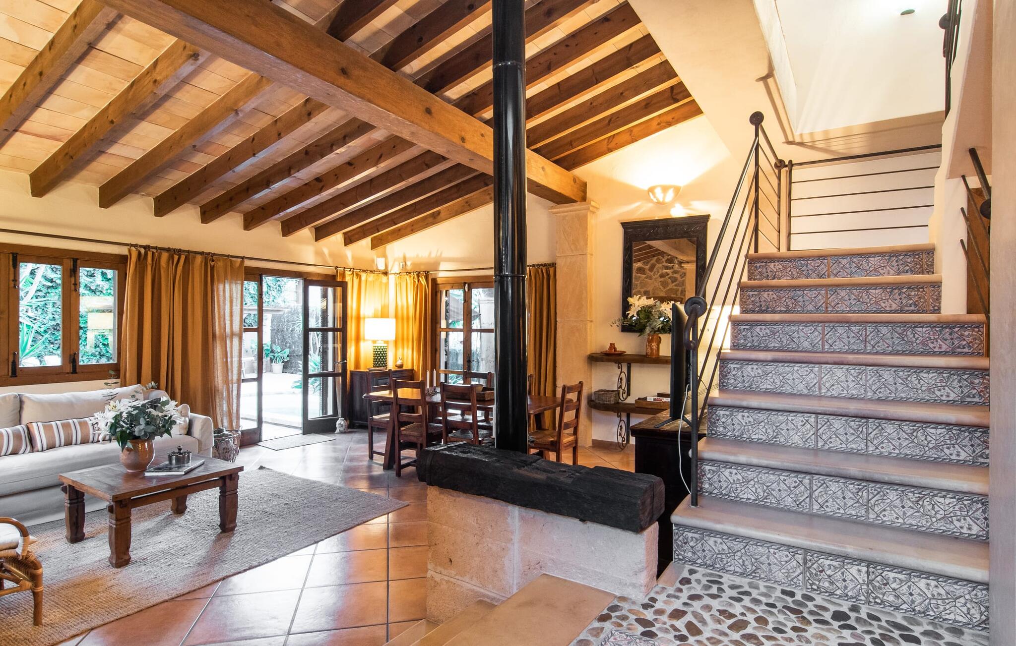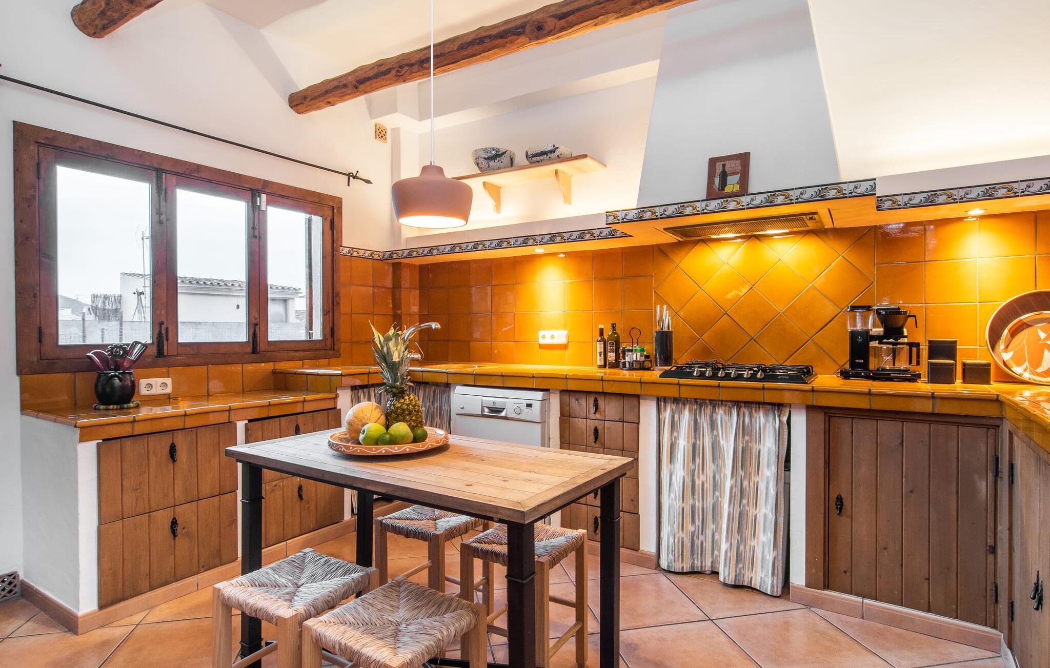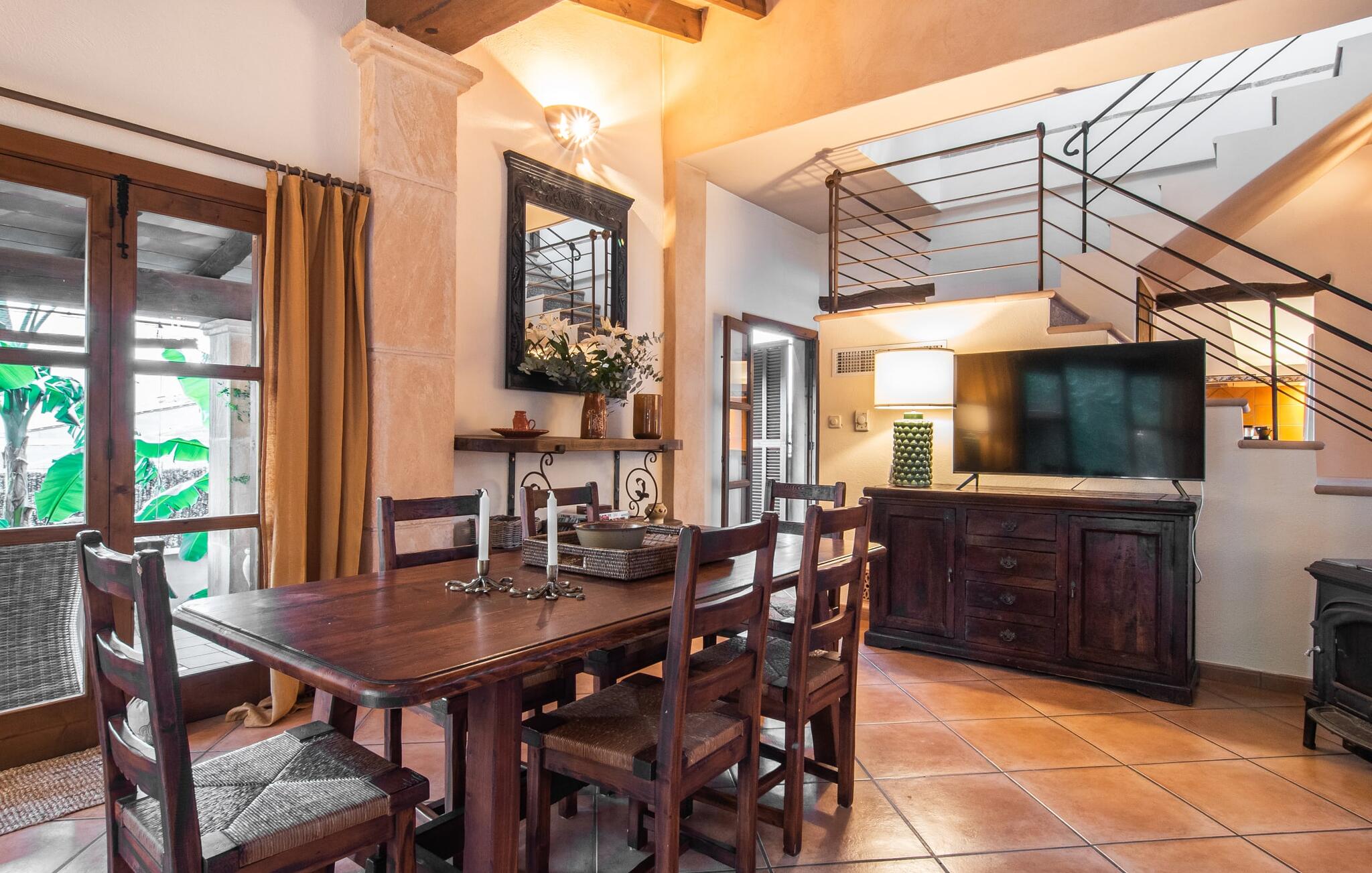 Met veel aandacht voor detail is de eigenaar er ook in geslaagd om een unieke uitstraling in het interieur te creëren. Kleine, liefdevol gerangschikte details benadrukken de speciale kenmerken van de eetkamer, die een eettafel heeft en technisch gezien deel uitmaakt van de buitenruimte als de patiodeur helemaal open staat, waardoor de eilandlucht naar binnen stroomt. De elegante donkere houttinten van de antieke meubels in combinatie met de terughoudende selectie van decoratieve items creëren een gezellige sfeer, die wordt afgerond door het zachte geknetter van de open haard. Een van de muren van de woonkamer is voorzien van typische Mallorcaanse architectuur met natuursteen en houten balken, die ook terug te vinden zijn op het plafond. De keuken bevindt zich ook op de begane grond en is volledig uitgerust met kleurrijke gele tegels. Er staat een houten tafel in het midden van de keuken, die voldoende ruimte biedt voor het bereiden van grote maaltijden. Toegang tot de twee slaapkamers en beide badkamers is via de decoratieve hal met stenen mozaïekvloeren. Een van de slaapkamers heeft een tweepersoonsbed, de andere heeft twee eenpersoonsbedden. Een van de badkamers heeft ook een bad en biedt daarom de mogelijkheid voor een gezellig bad bij kaarslicht. Een trap leidt vanuit de woonkamer naar een wasruimte en een idyllisch dakterras, dat gedeeltelijk overdekt is door een pergola die automatisch verlicht wordt bij schemering. Een lounge groep nodigt je uit om te genieten, maar deze keer met een bonus uitzicht over de zee van rode daken en het kasteel.