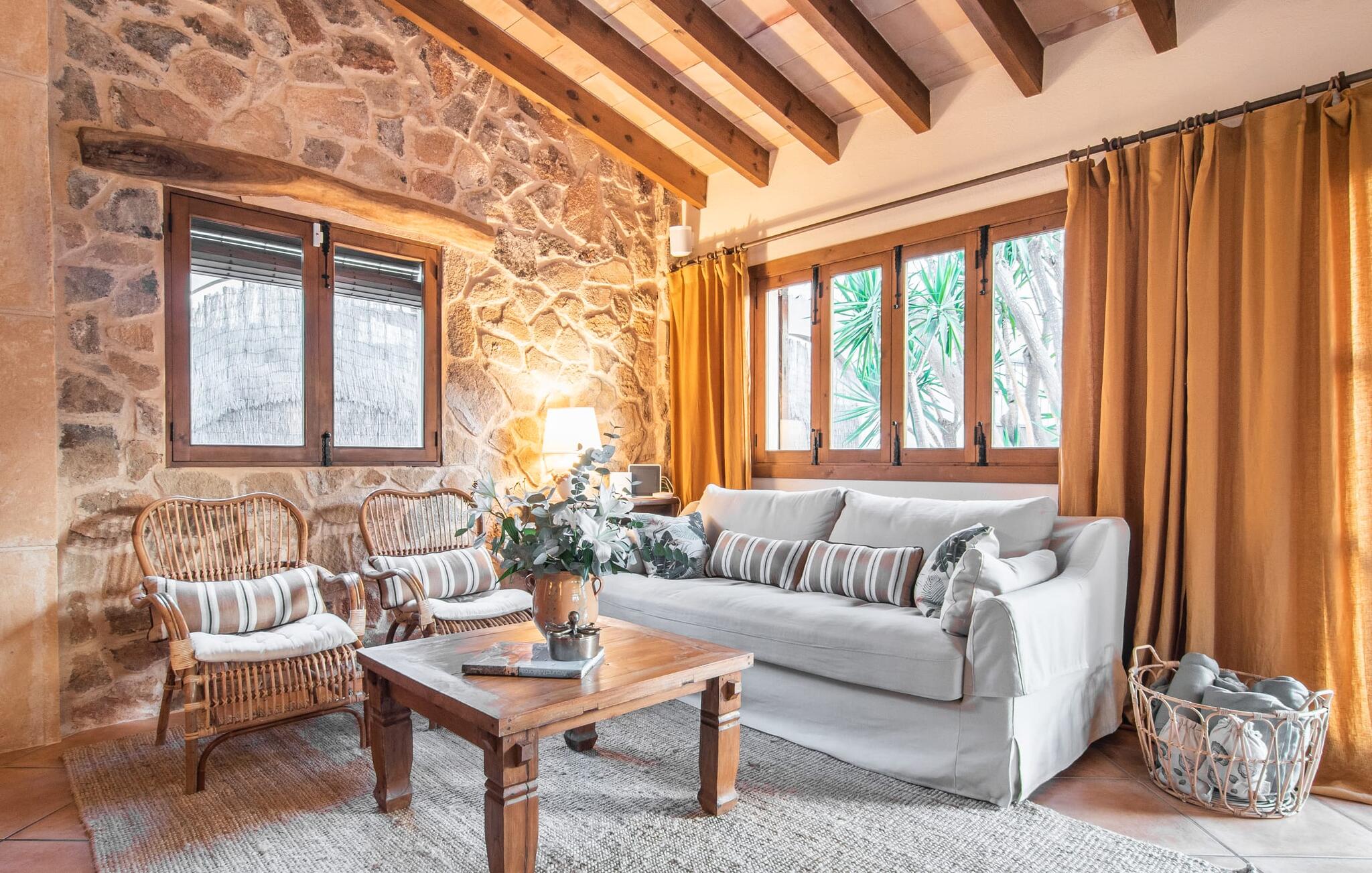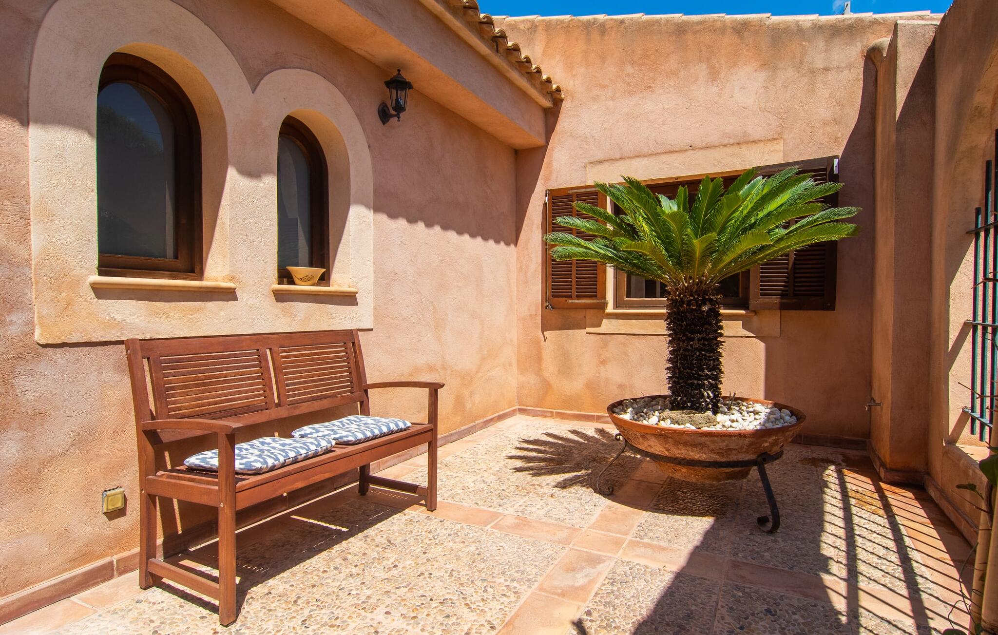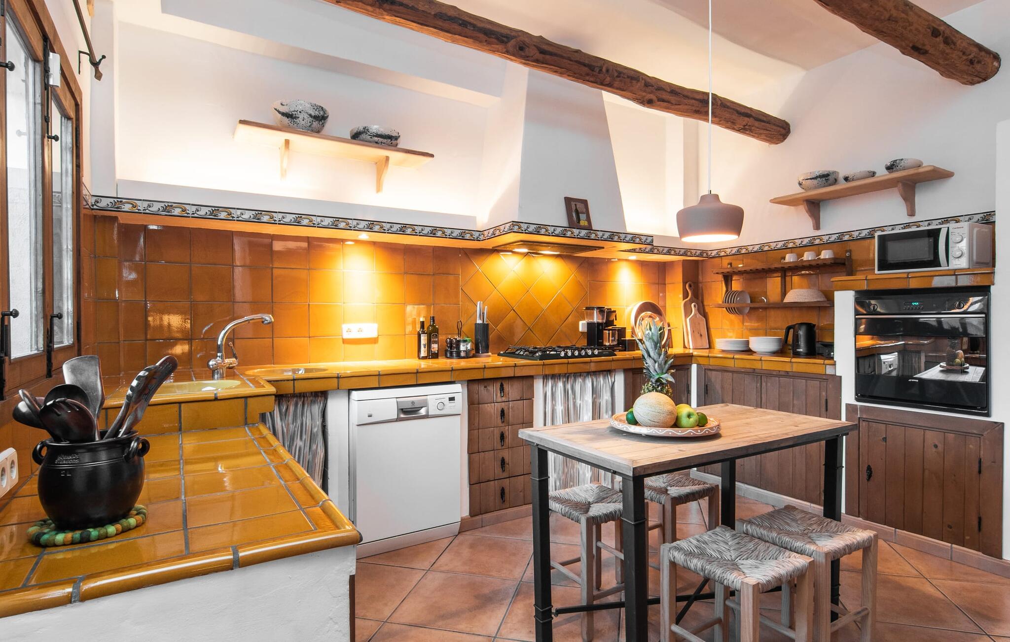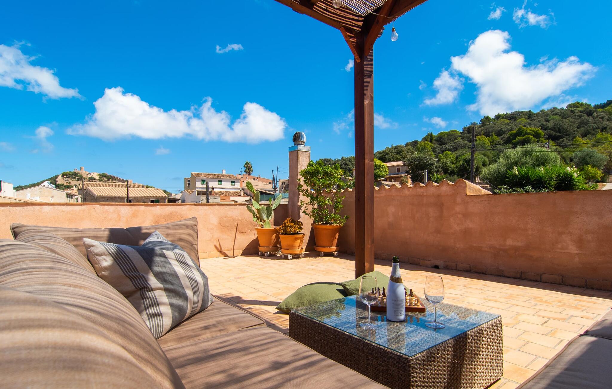 Met veel aandacht voor detail is de eigenaar er ook in geslaagd om een unieke uitstraling in het interieur te creëren. Kleine, liefdevol gerangschikte details benadrukken de speciale kenmerken van de eetkamer, die een eettafel heeft en technisch gezien deel uitmaakt van de buitenruimte als de patiodeur helemaal open staat, waardoor de eilandlucht naar binnen stroomt. De elegante donkere houttinten van de antieke meubels in combinatie met de terughoudende selectie van decoratieve items creëren een gezellige sfeer, die wordt afgerond door het zachte geknetter van de open haard. Een van de muren van de woonkamer is voorzien van typische Mallorcaanse architectuur met natuursteen en houten balken, die ook terug te vinden zijn op het plafond. De keuken bevindt zich ook op de begane grond en is volledig uitgerust met kleurrijke gele tegels. Er staat een houten tafel in het midden van de keuken, die voldoende ruimte biedt voor het bereiden van grote maaltijden. Toegang tot de twee slaapkamers en beide badkamers is via de decoratieve hal met stenen mozaïekvloeren. Een van de slaapkamers heeft een tweepersoonsbed, de andere heeft twee eenpersoonsbedden. Een van de badkamers heeft ook een bad en biedt daarom de mogelijkheid voor een gezellig bad bij kaarslicht. Een trap leidt vanuit de woonkamer naar een wasruimte en een idyllisch dakterras, dat gedeeltelijk overdekt is door een pergola die automatisch verlicht wordt bij schemering. Een lounge groep nodigt je uit om te genieten, maar deze keer met een bonus uitzicht over de zee van rode daken en het kasteel.