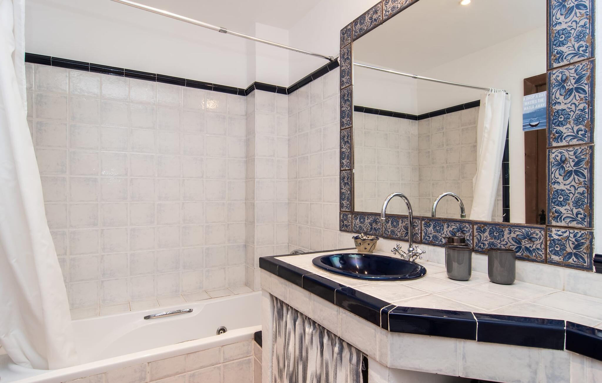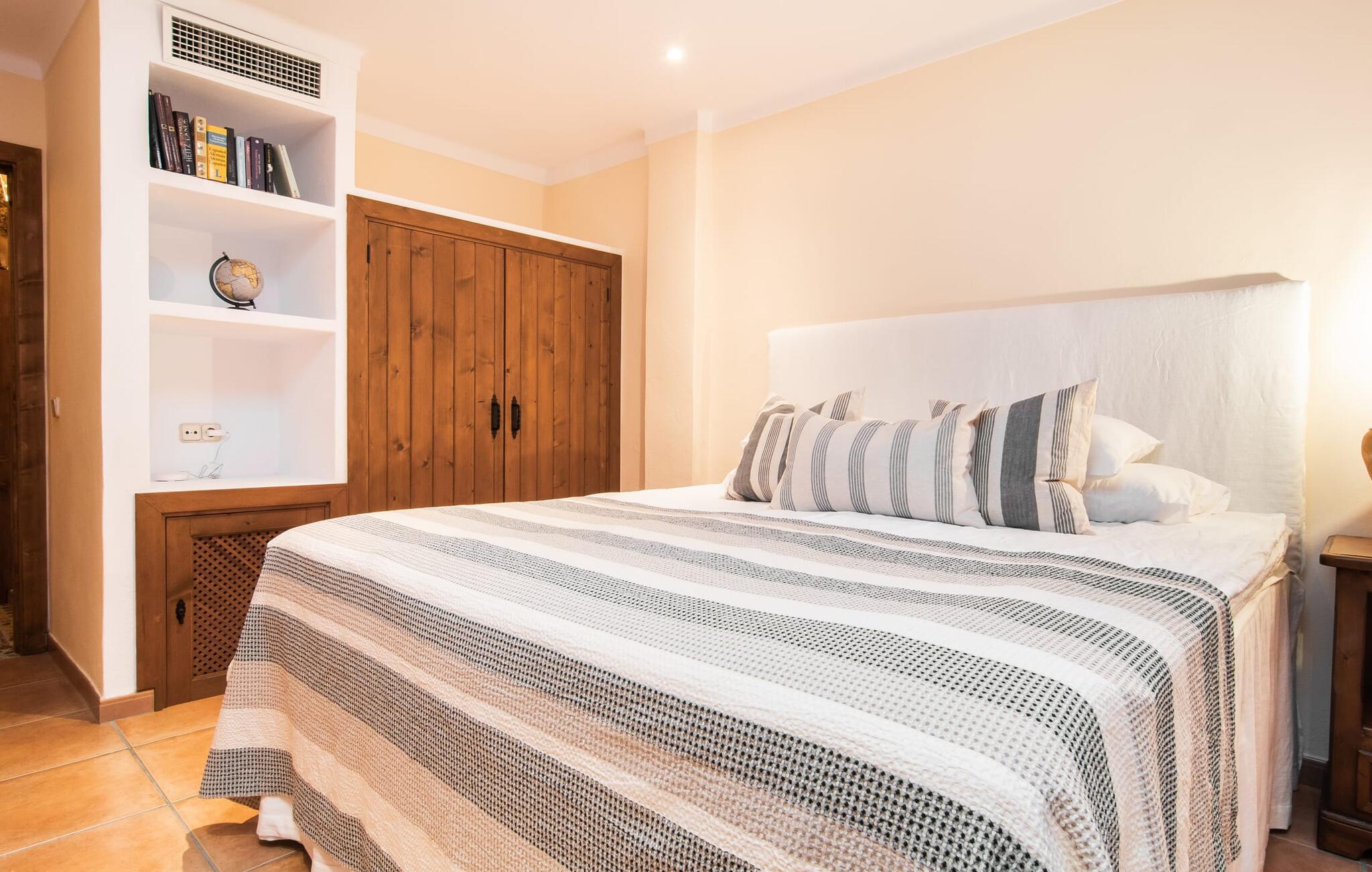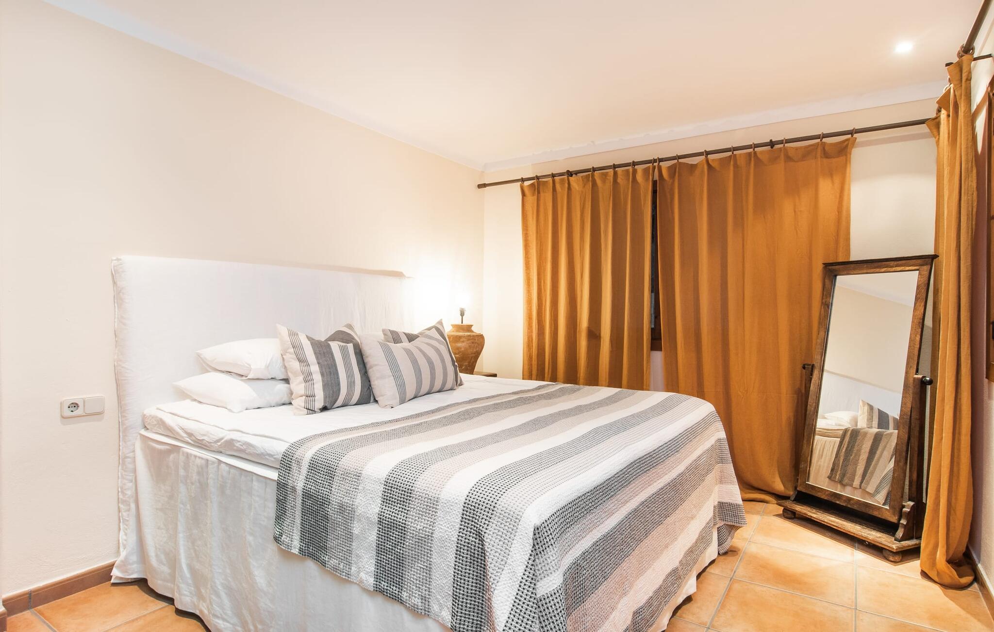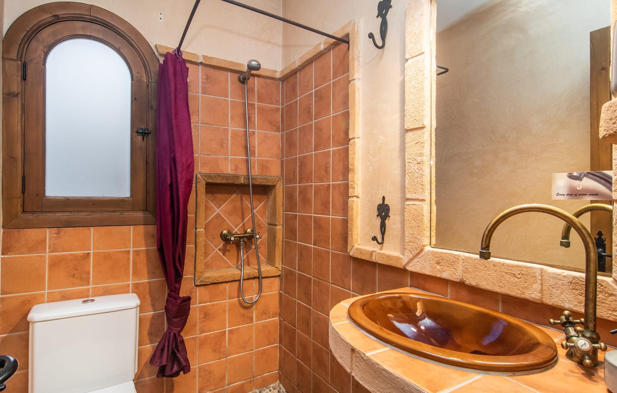 Met veel aandacht voor detail is de eigenaar er ook in geslaagd om een unieke uitstraling in het interieur te creëren. Kleine, liefdevol gerangschikte details benadrukken de speciale kenmerken van de eetkamer, die een eettafel heeft en technisch gezien deel uitmaakt van de buitenruimte als de patiodeur helemaal open staat, waardoor de eilandlucht naar binnen stroomt. De elegante donkere houttinten van de antieke meubels in combinatie met de terughoudende selectie van decoratieve items creëren een gezellige sfeer, die wordt afgerond door het zachte geknetter van de open haard. Een van de muren van de woonkamer is voorzien van typische Mallorcaanse architectuur met natuursteen en houten balken, die ook terug te vinden zijn op het plafond. De keuken bevindt zich ook op de begane grond en is volledig uitgerust met kleurrijke gele tegels. Er staat een houten tafel in het midden van de keuken, die voldoende ruimte biedt voor het bereiden van grote maaltijden. Toegang tot de twee slaapkamers en beide badkamers is via de decoratieve hal met stenen mozaïekvloeren. Een van de slaapkamers heeft een tweepersoonsbed, de andere heeft twee eenpersoonsbedden. Een van de badkamers heeft ook een bad en biedt daarom de mogelijkheid voor een gezellig bad bij kaarslicht. Een trap leidt vanuit de woonkamer naar een wasruimte en een idyllisch dakterras, dat gedeeltelijk overdekt is door een pergola die automatisch verlicht wordt bij schemering. Een lounge groep nodigt je uit om te genieten, maar deze keer met een bonus uitzicht over de zee van rode daken en het kasteel.