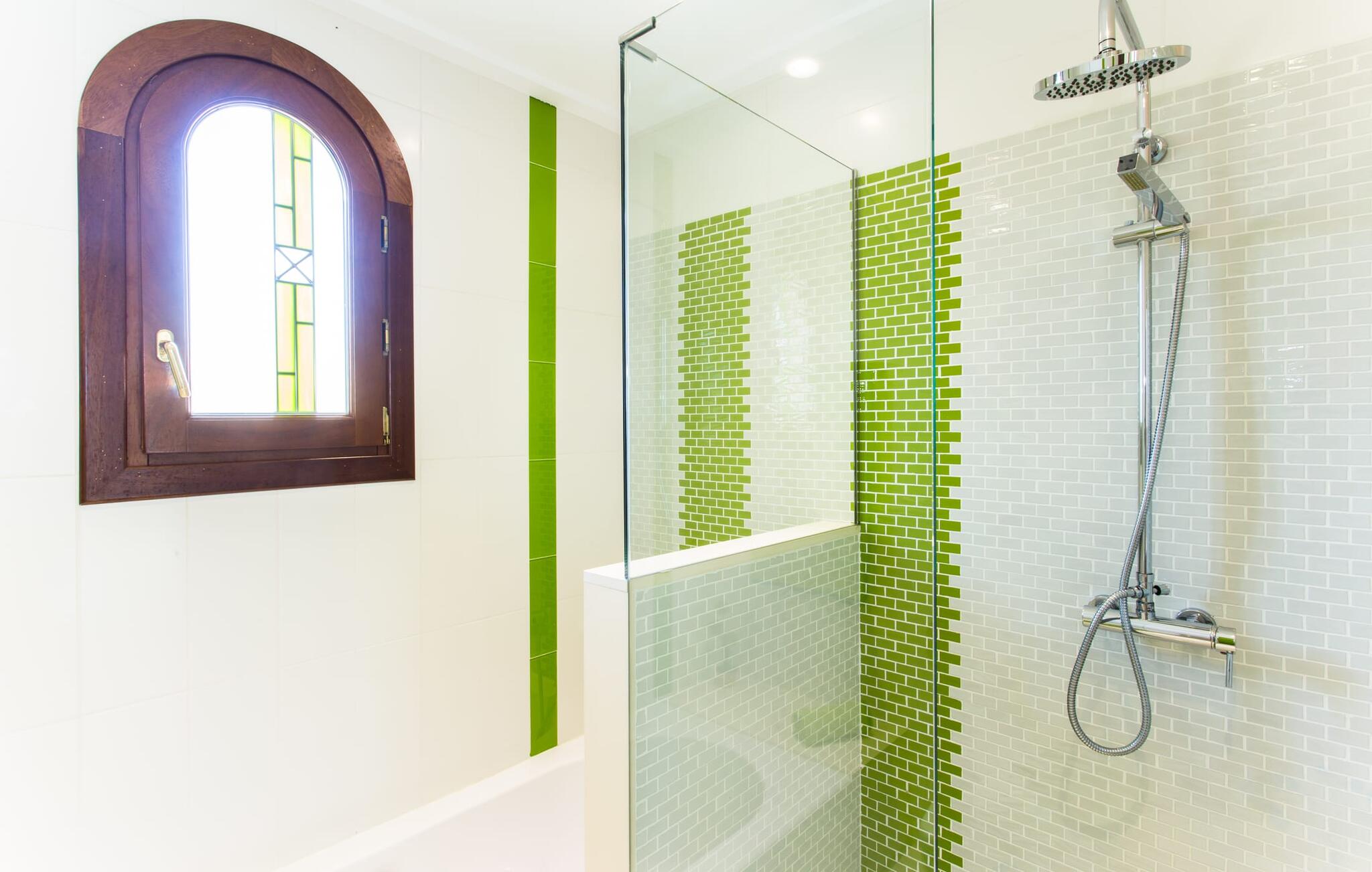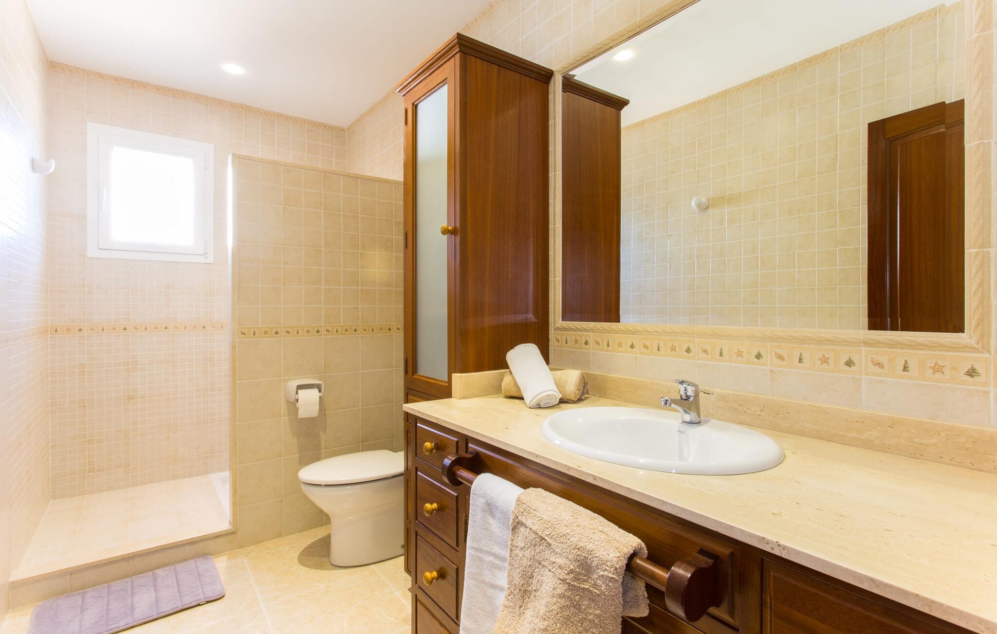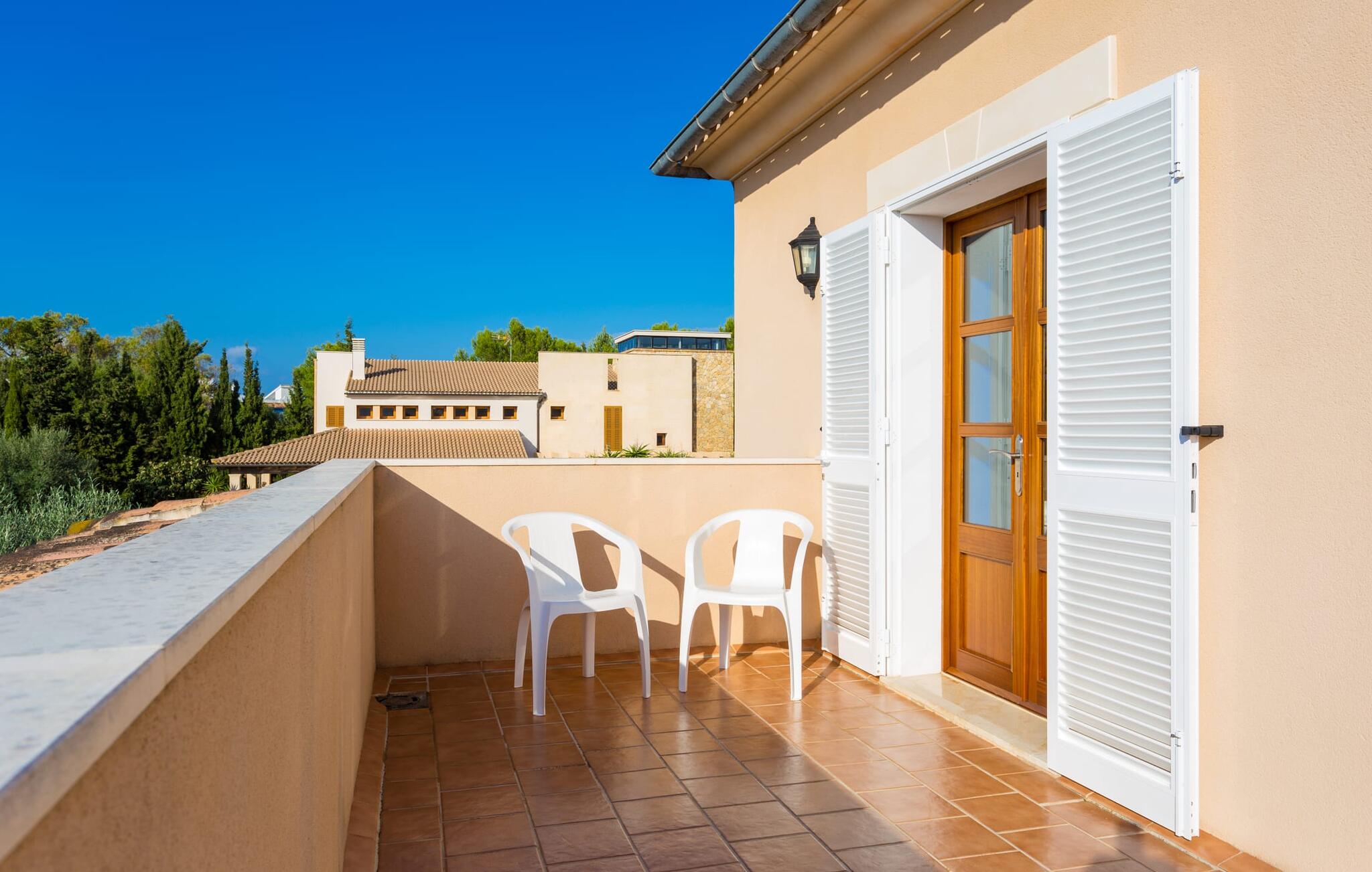 Dubbele openslaande deuren leiden vanaf het terras naar het woon- en eetgedeelte van de finca. De inrichting is in elk opzicht harmonieus: Een lichtgekleurde stenen vloer, witte muren, donkere massief houten deuren en hoogwaardige massief houten meubelen met een vleugje exclusiviteit, samen met zorgvuldig geselecteerde decoratieve items en hedendaagse kunst aan de muren, creëren dat bepaalde iets Een prachtig harmonieuze ruimte waar je je thuis kunt voelen. Een dubbele schuifdeur leidt van de woonkamer naar de gezellige, goed uitgeruste keuken. Met een wit hoogglans keukenblok met gasoven en kookplaten, een roestvrijstalen Amerikaanse koelkast/vriezer, vaatwasser, magnetron en nog veel meer, wordt zelf koken niet makkelijker! En met een deur die leidt naar de eethoek buiten, is al fresco dineren net zo handig als binnen blijven. Met twee tweepersoonskamers en een driepersoonskamer is de villa geschikt voor maximaal zeven personen. De driepersoonskamer is vooral geschikt voor ouders van een kind dat al volwassen genoeg is om een eigen bed nodig te hebben. Naast de slaapkamer op de begane grond is een badkamer in beige tinten met een moderne inloopdouche. De tweede badkamer is bereikbaar via de gang van de twee slaapkamers op de bovenverdieping. Dit is een stijlvolle witte kamer met bamboegroene accenten en een comfortabel bad. Ook op de bovenverdieping is een romantisch balkon met een zithoek waar je kunt zitten en naar de nachtelijke hemel kunt kijken en luisteren naar het geluid van de zee.